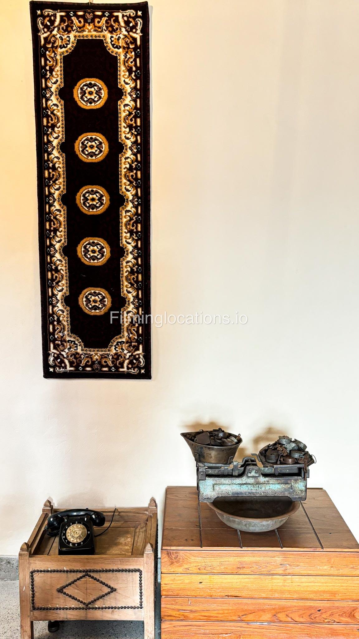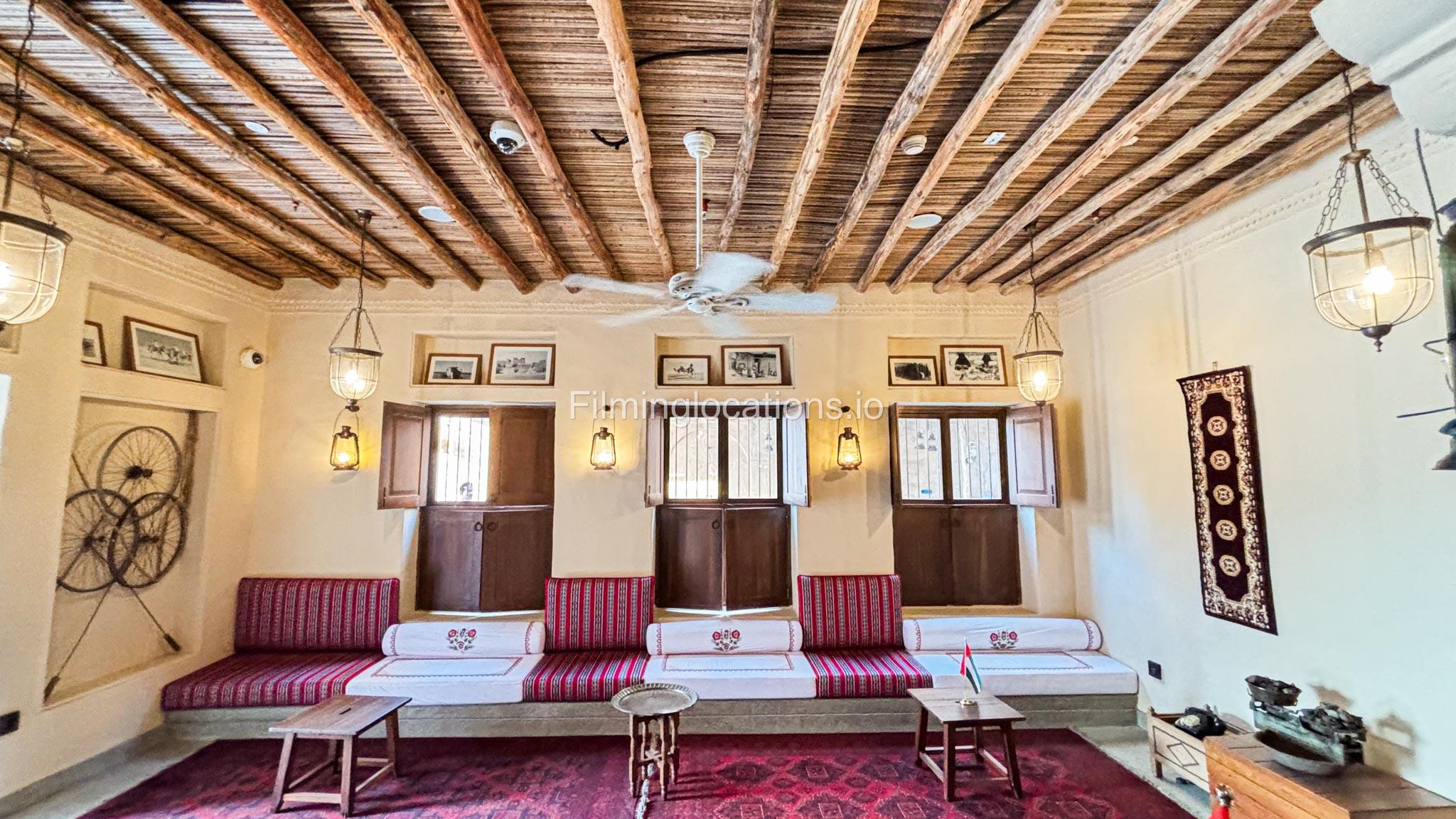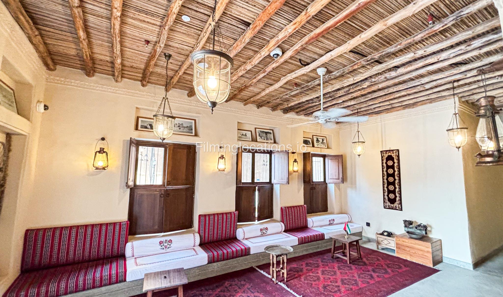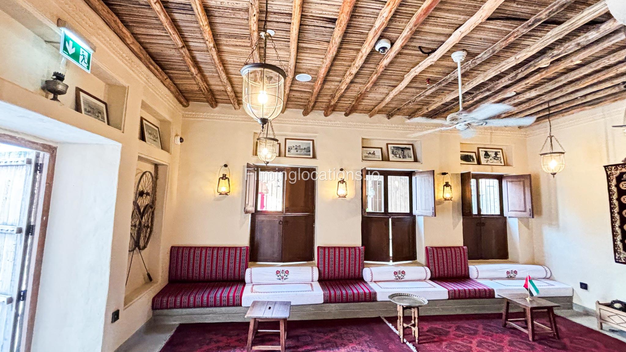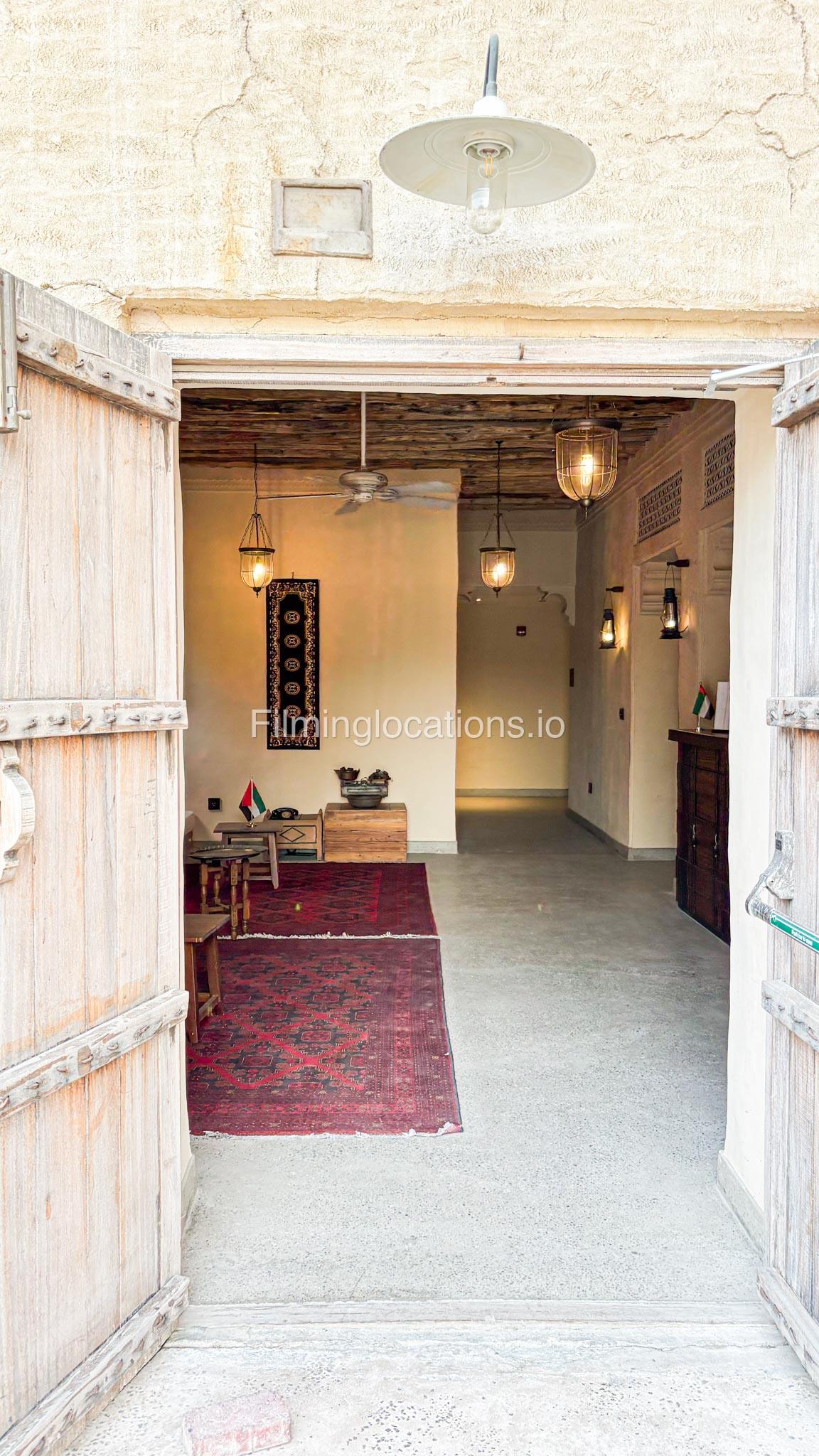A stylish hotel reception with traditional Arabic design, featuring two wooden front desks, comfortable seating along the walls, and rich red carpets. Wooden shutter blinds filter natural light, creating a warm, inviting atmosphere. Perfect for filming with its elegant, cultural charm.