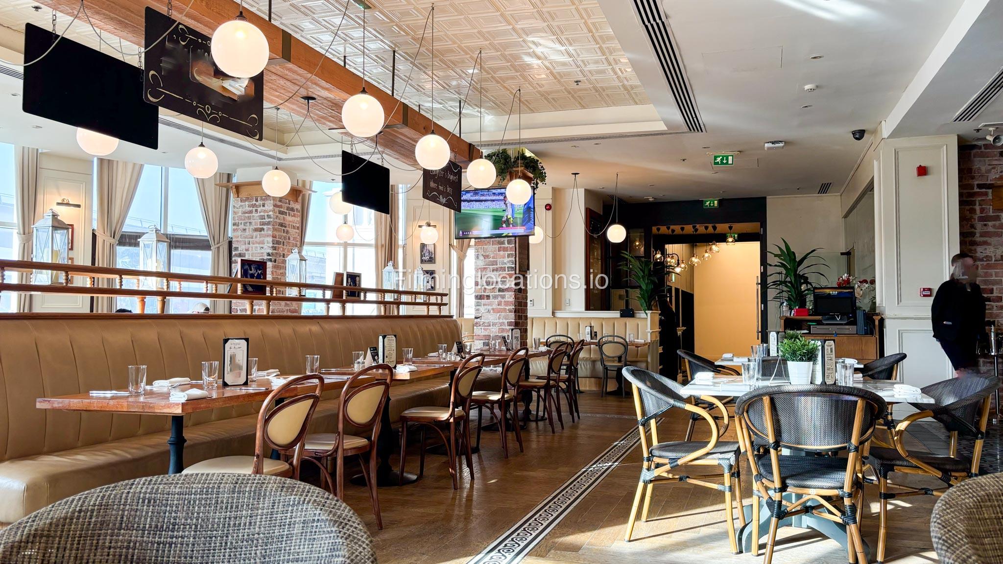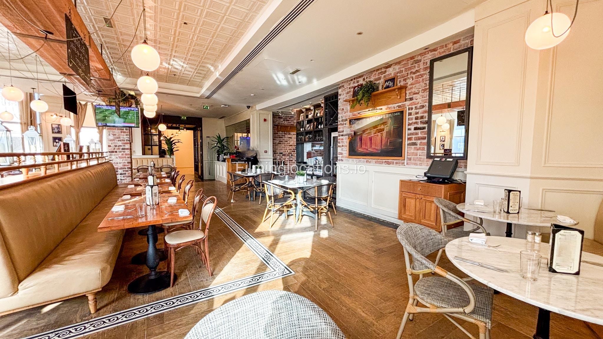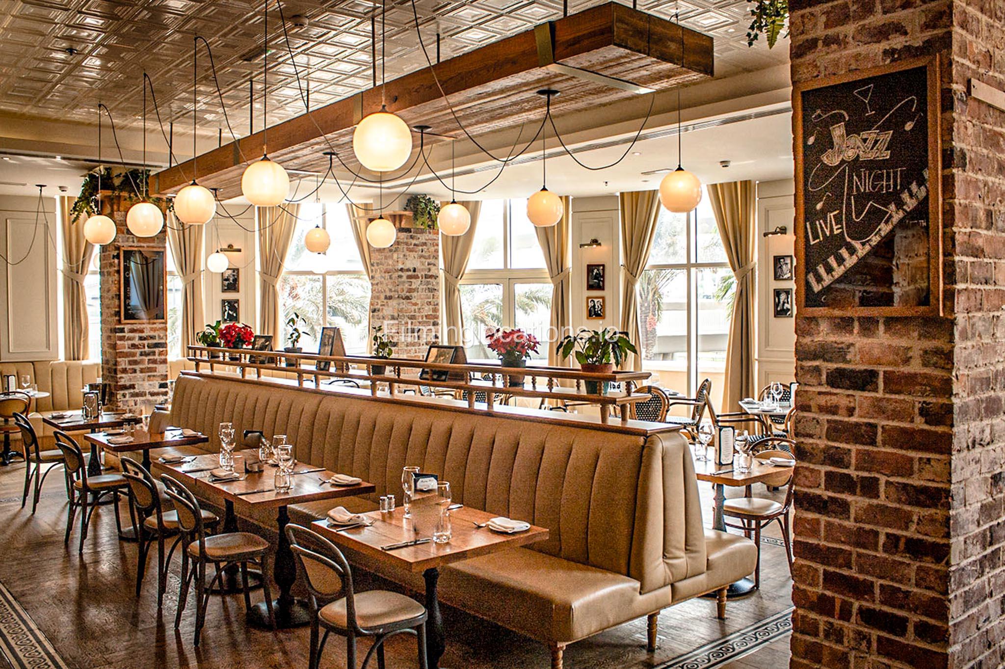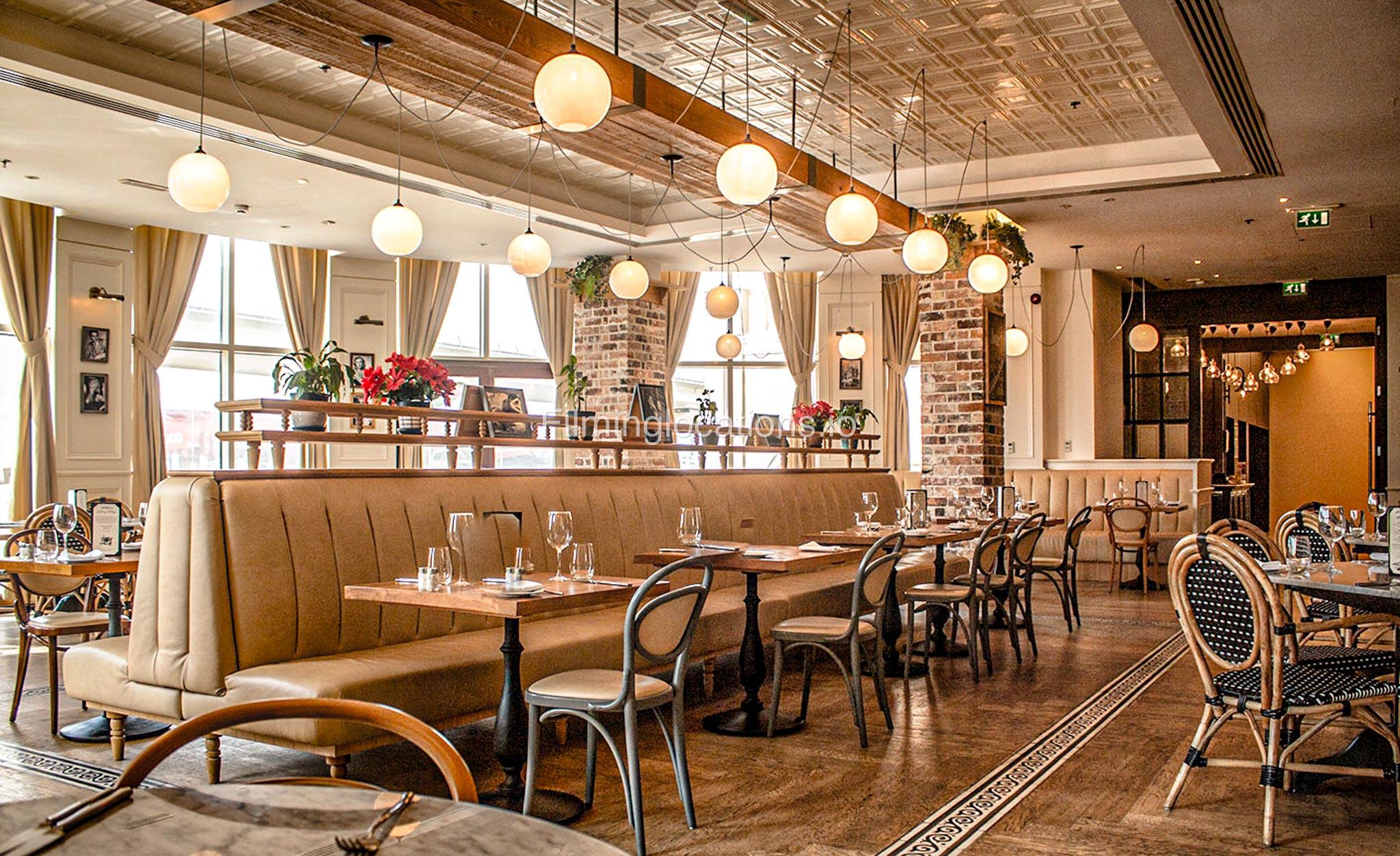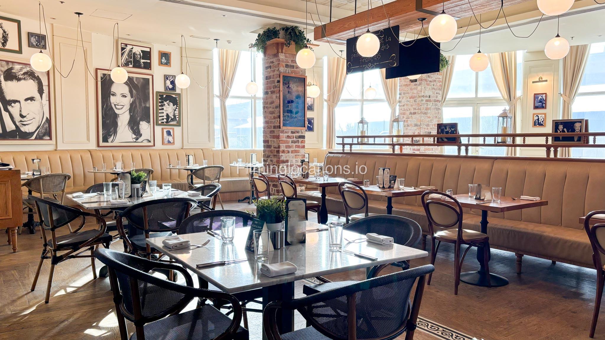 This modern French restaurant features white and grey sofas, wooden tables, and exposed brick-look walls, creating a chic and sophisticated ambiance. Ideal for film shoots, commercials, and photo sessions.