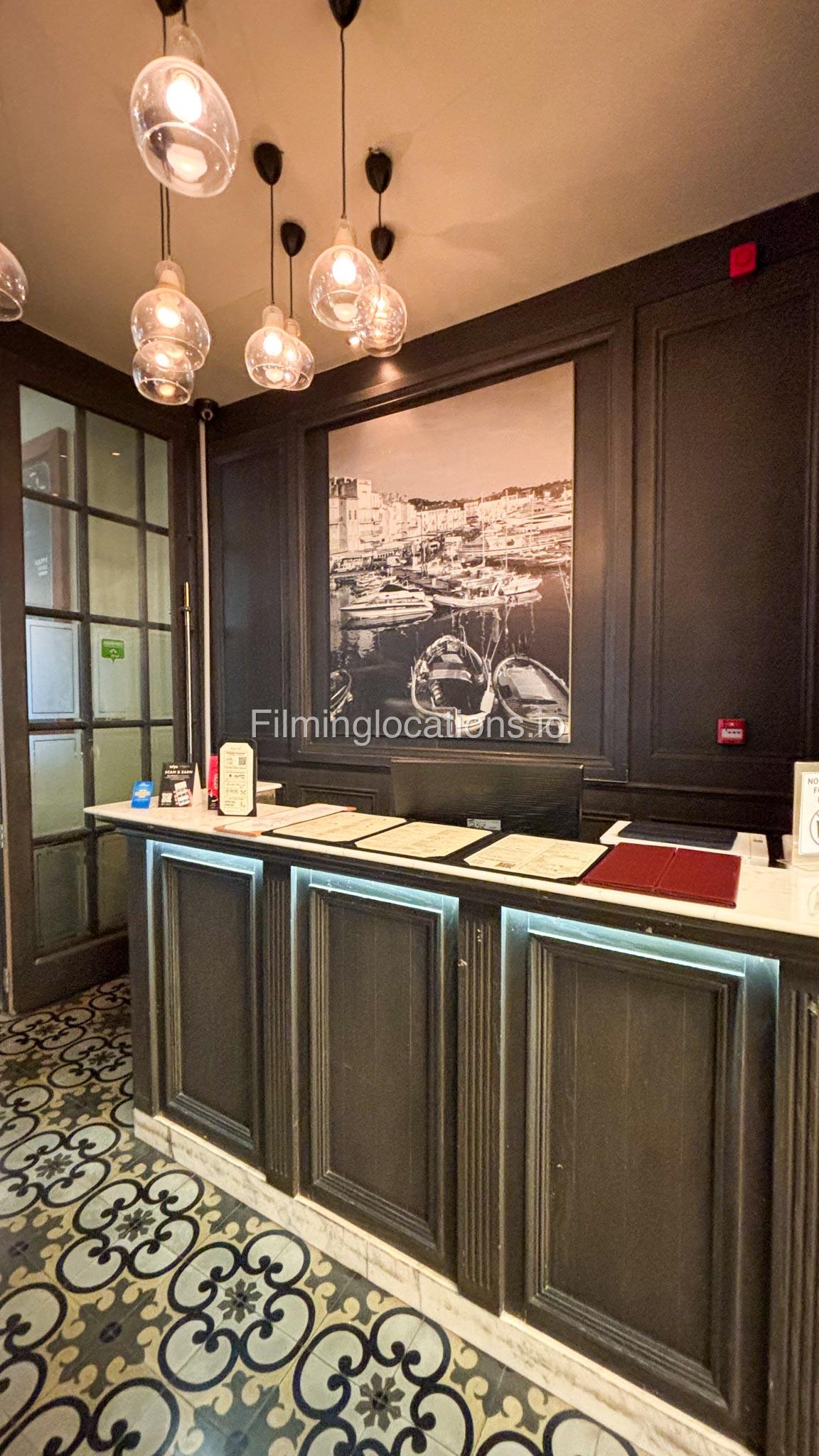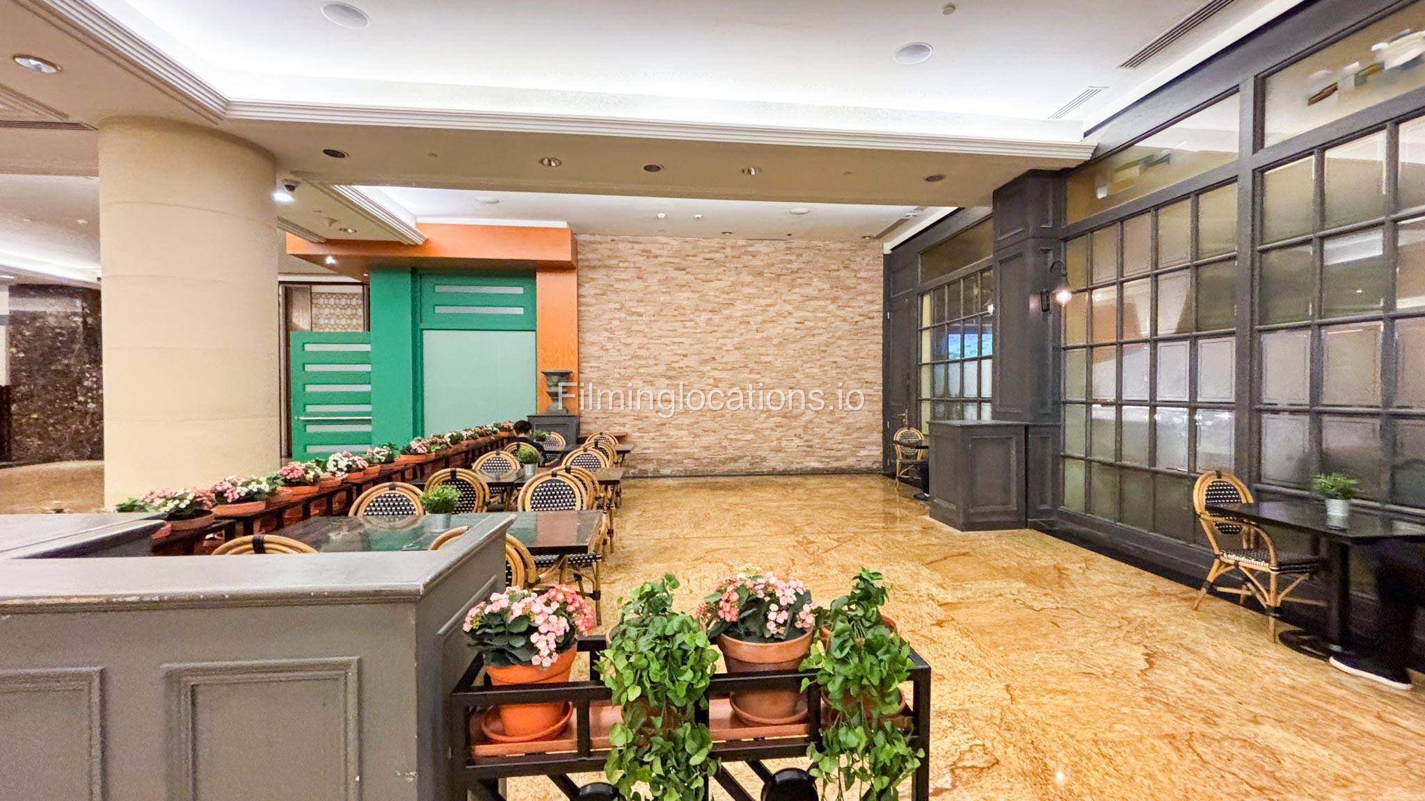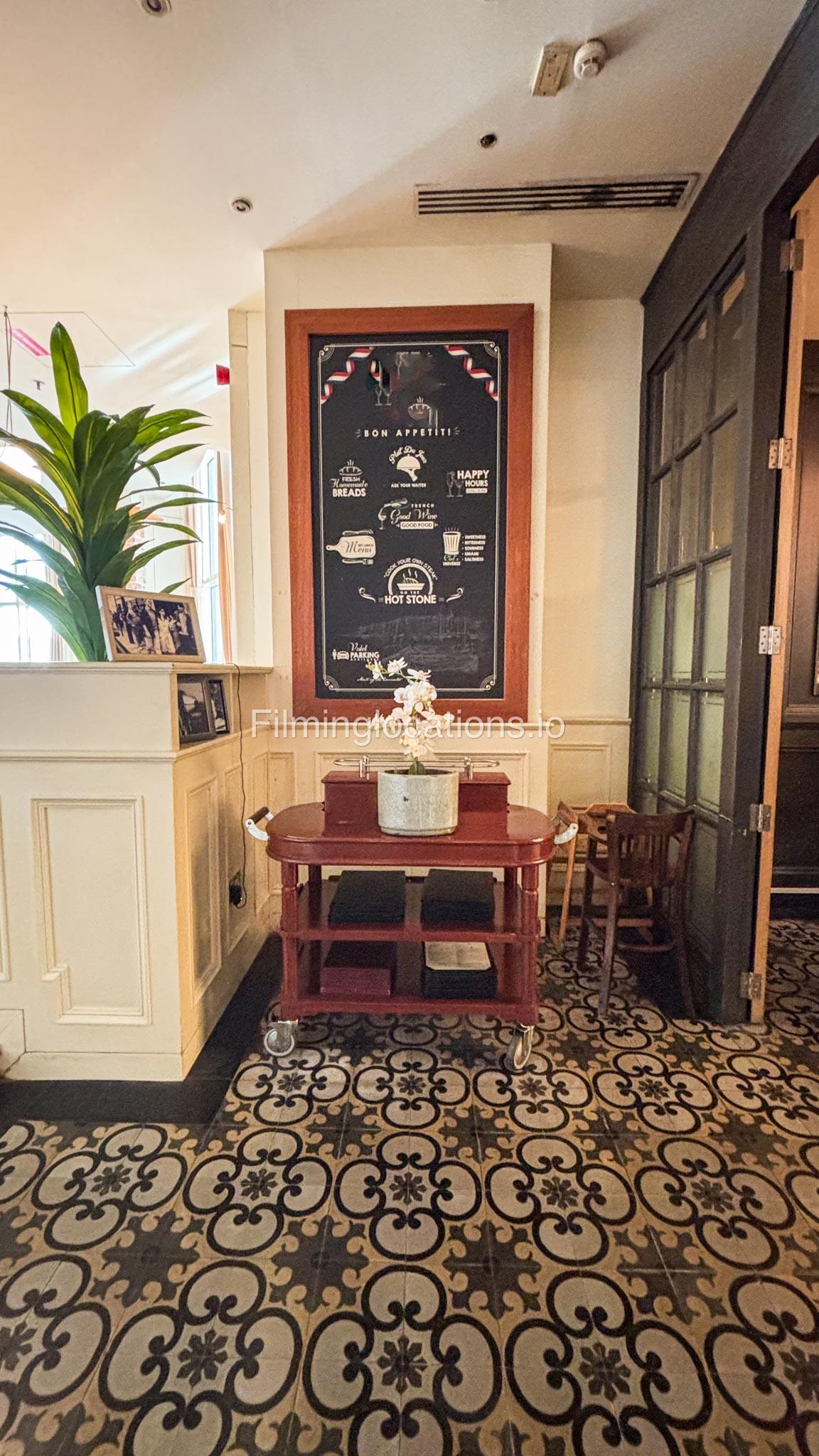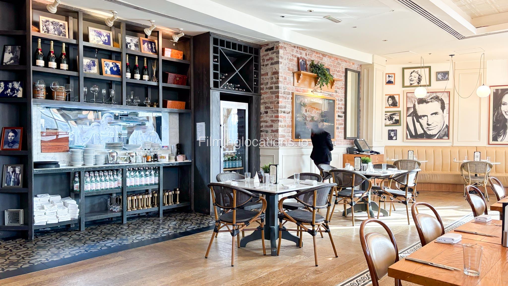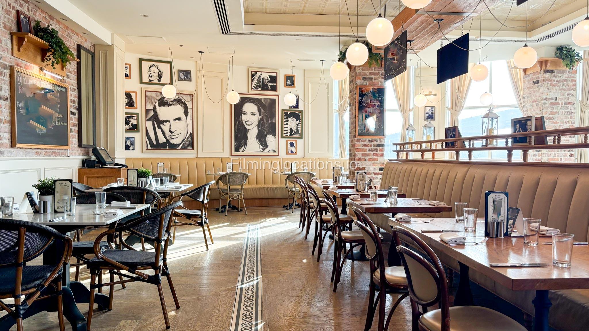 This modern French restaurant features white and grey sofas, wooden tables, and exposed brick-look walls, creating a chic and sophisticated ambiance. Ideal for film shoots, commercials, and photo sessions.