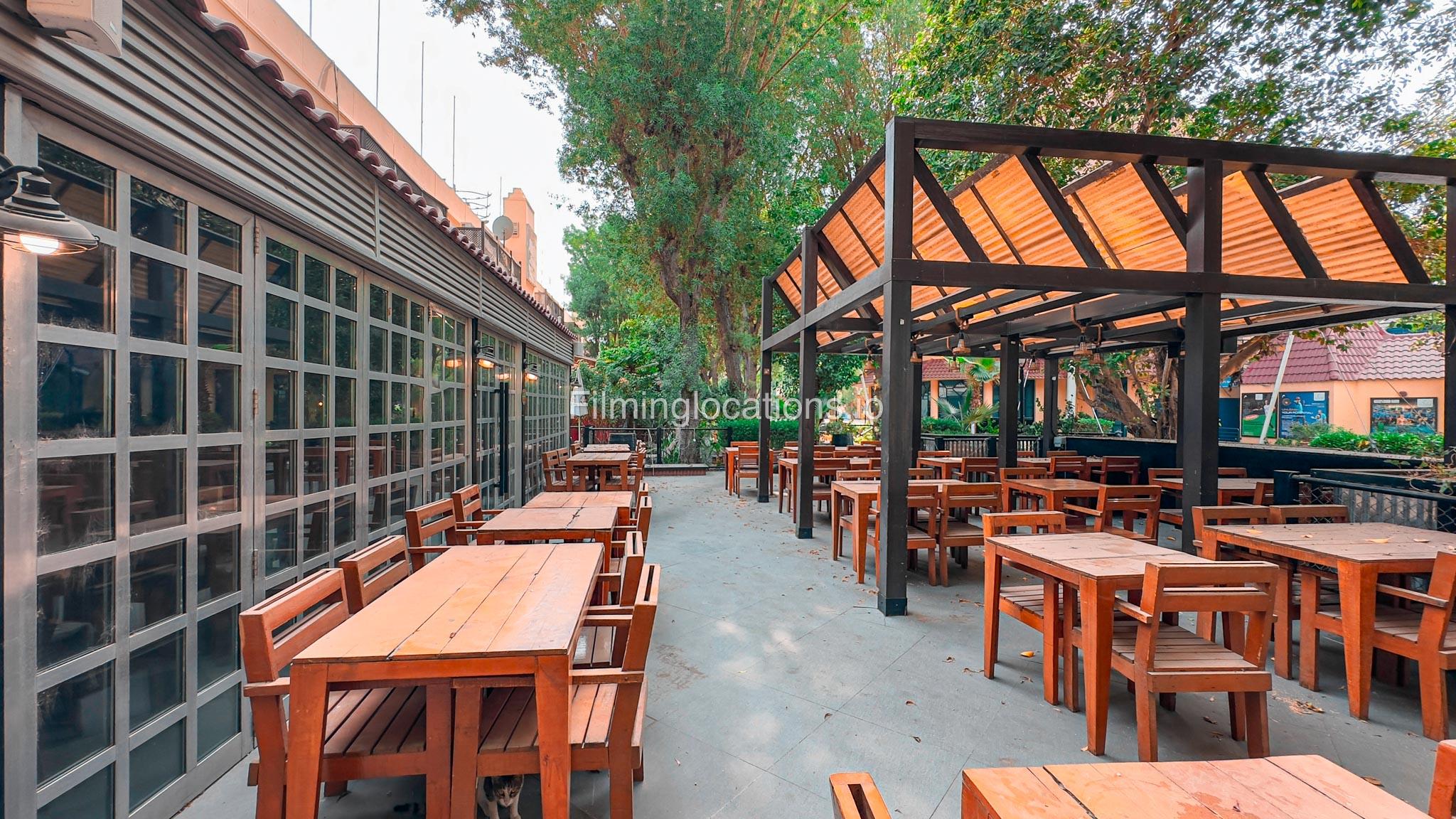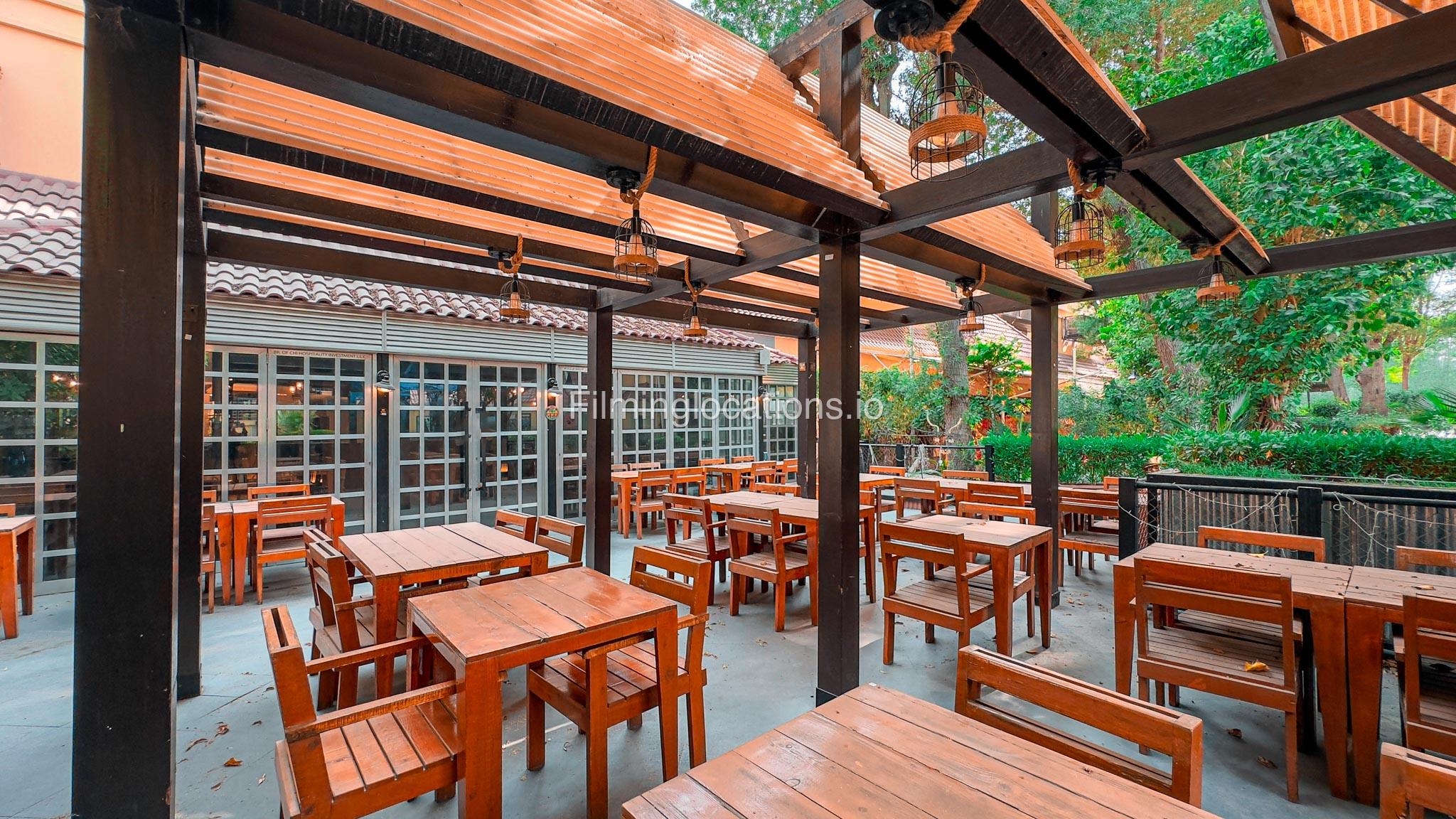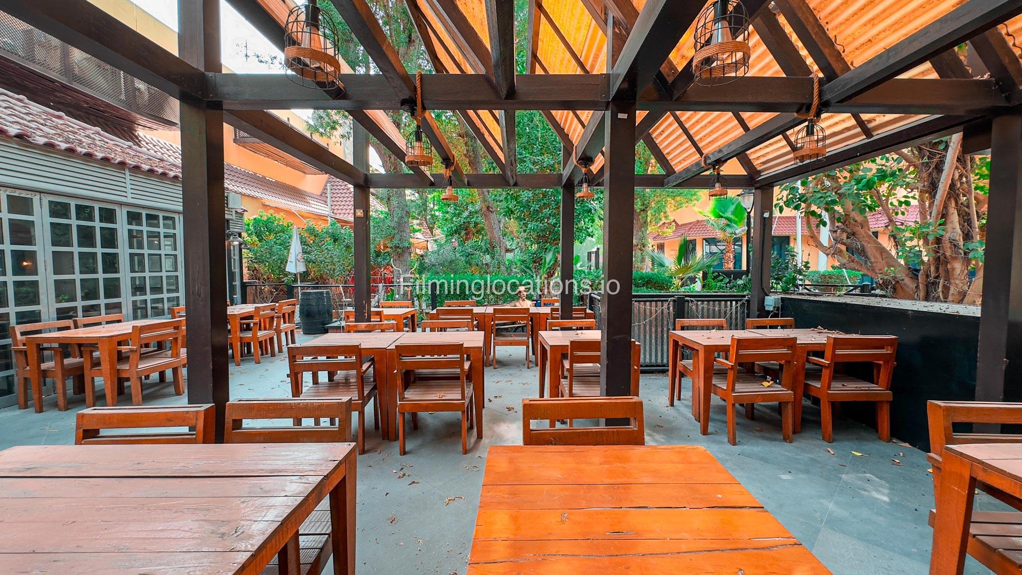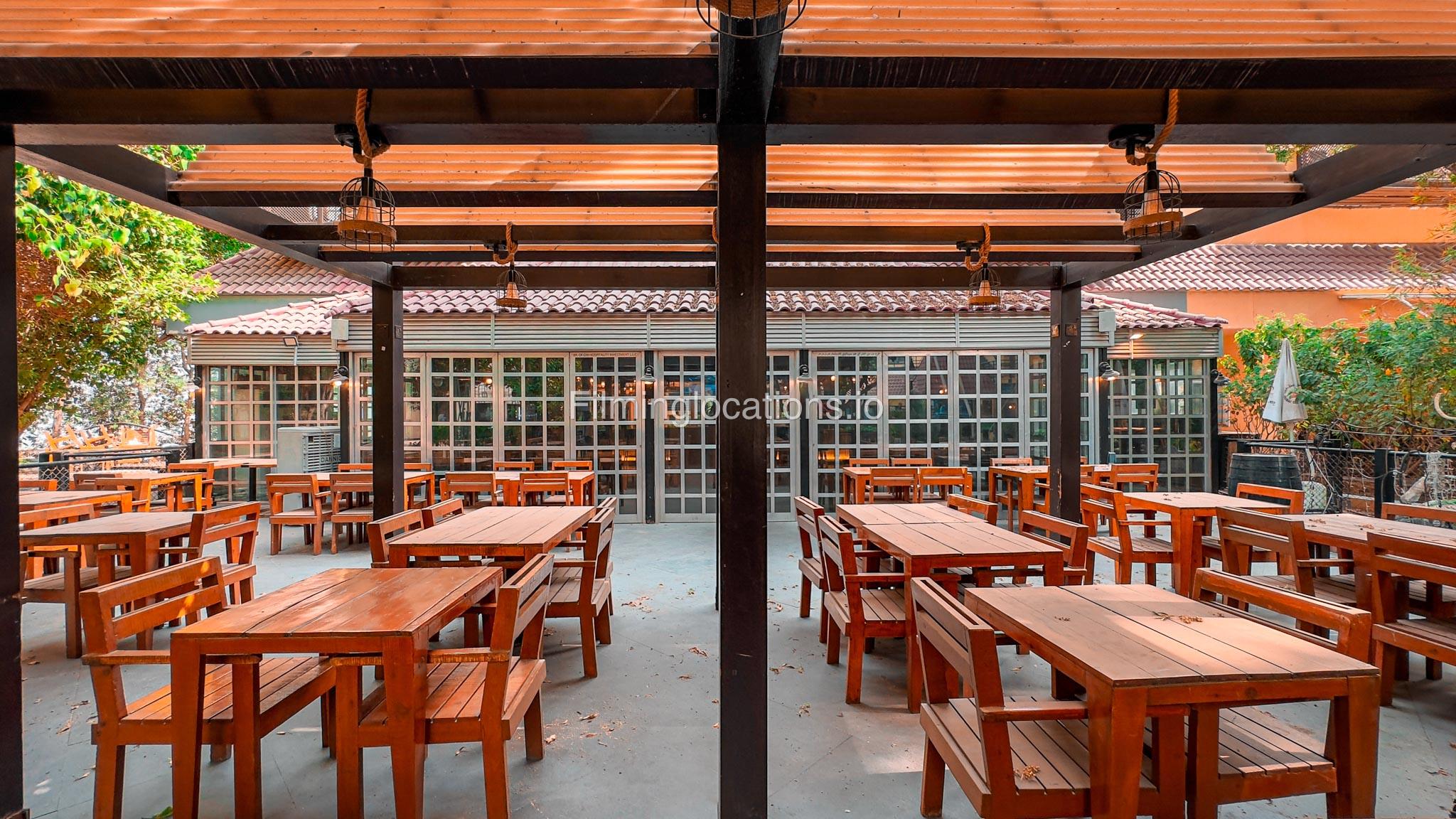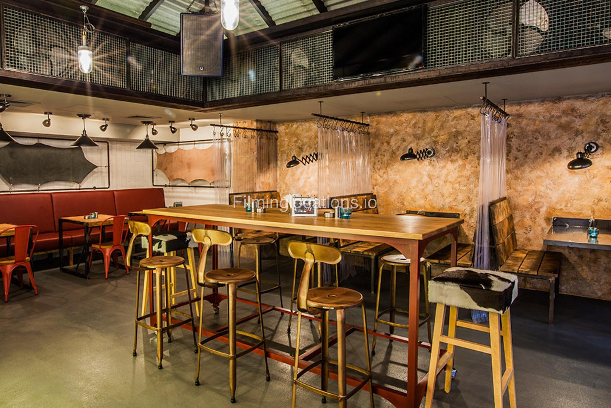 Our venue has wooden tables and seating, both booth-style and open tables, with a large space, high ceilings and an open window wall. Its also complemented by an inviting outdoor area. Perfect for film shoots, commercials, or photo sessions.