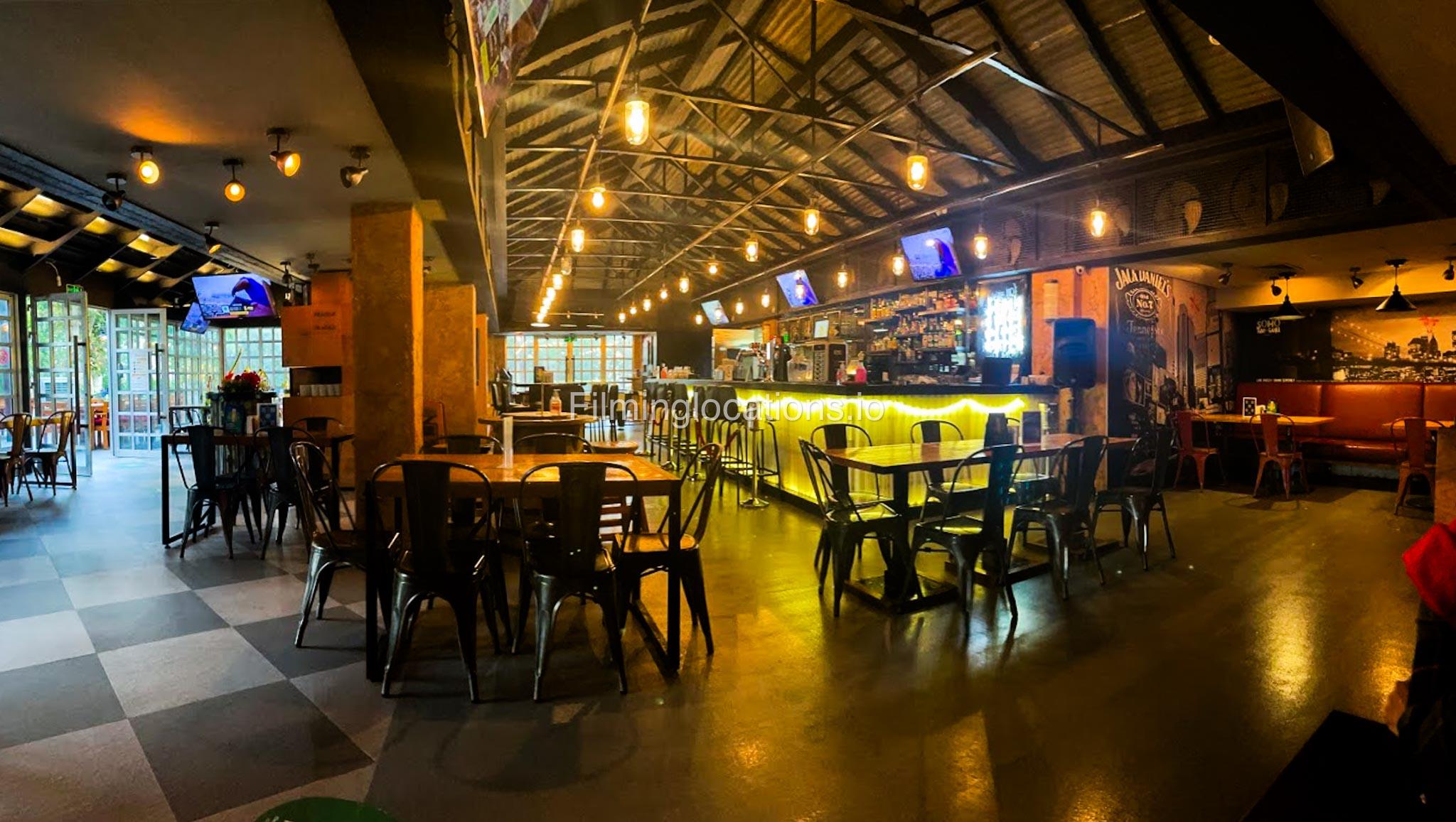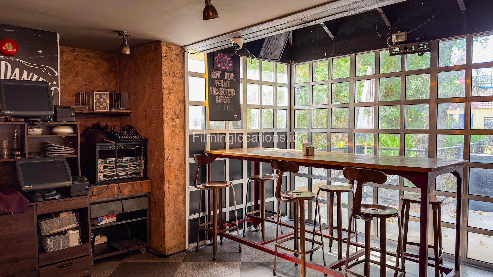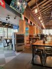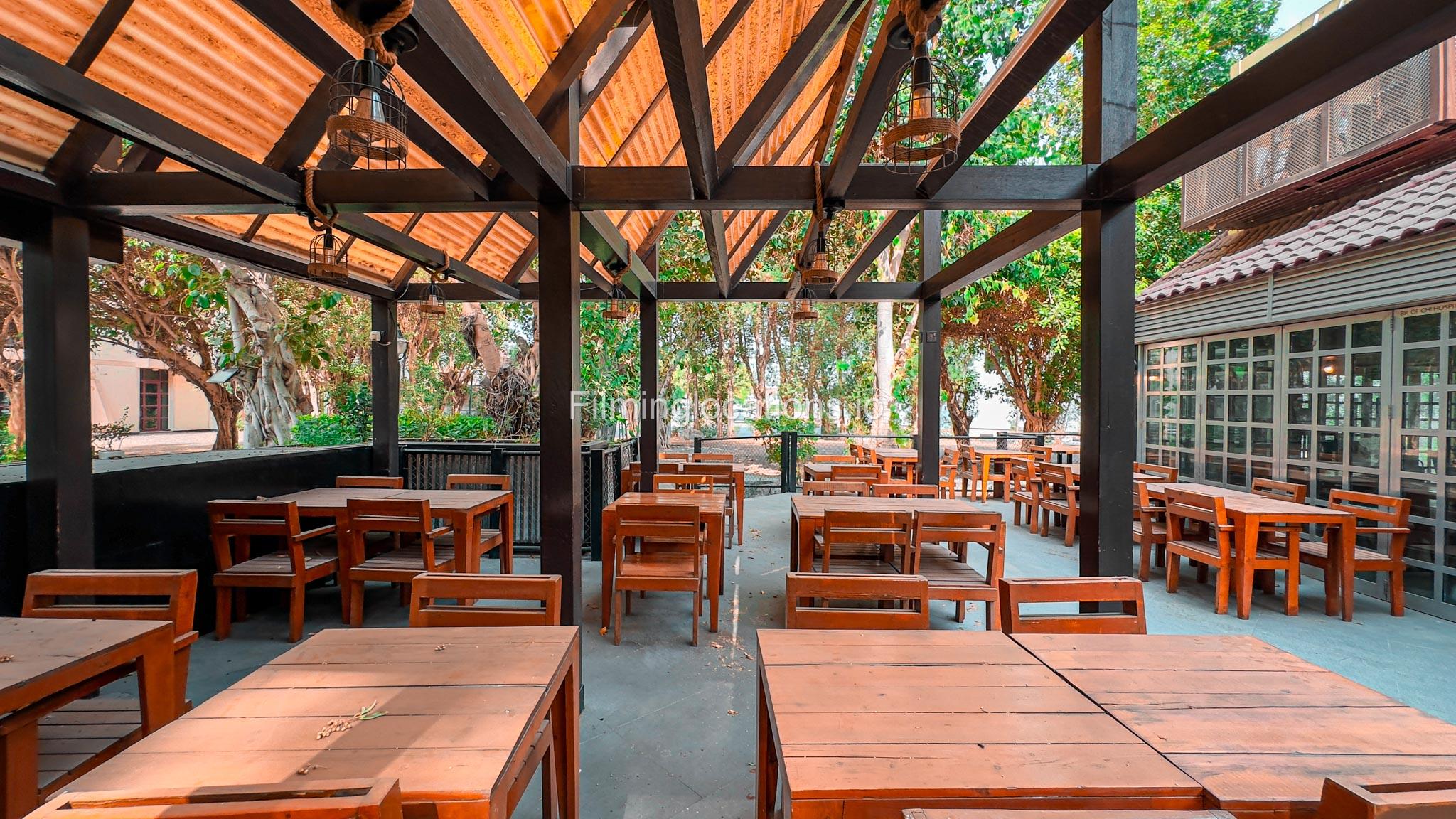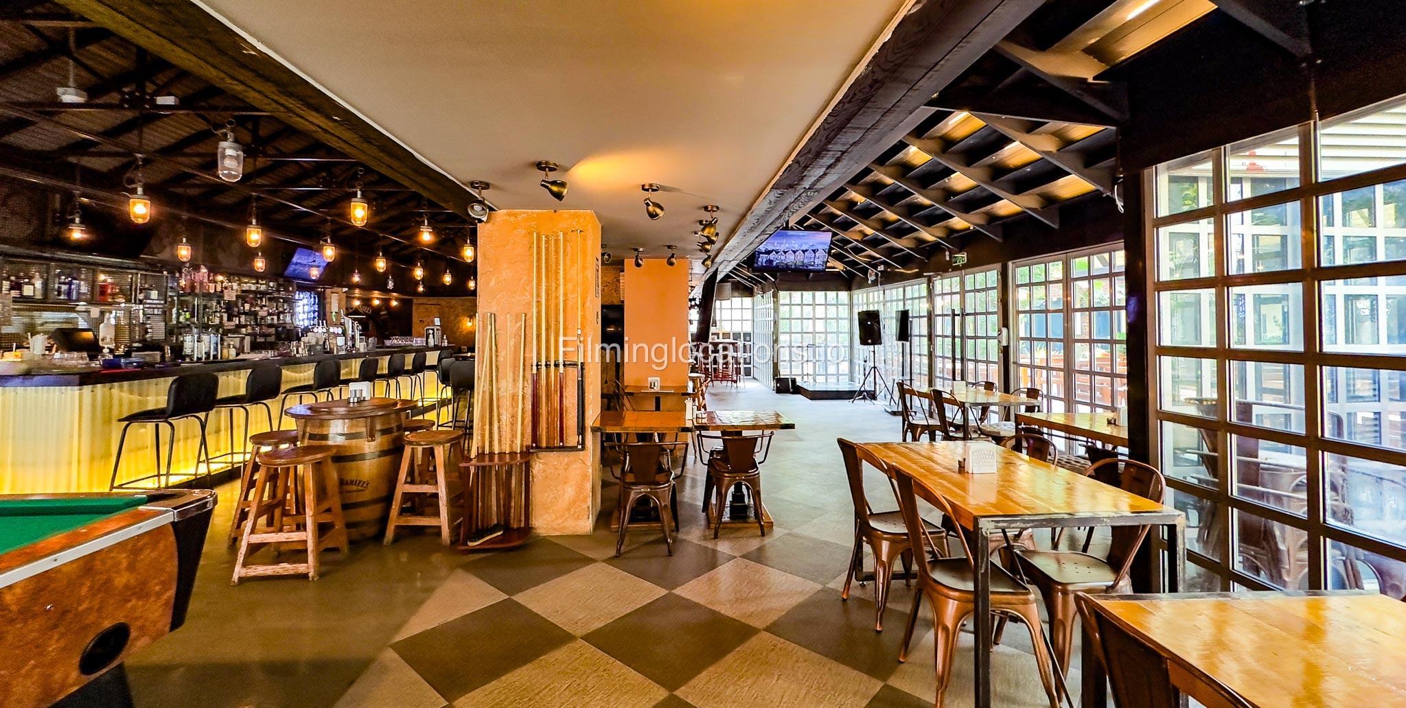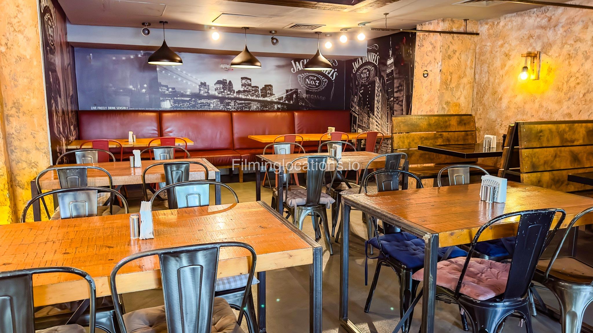 Our venue has wooden tables and seating, both booth-style and open tables, with a large space, high ceilings and an open window wall. Its also complemented by an inviting outdoor area. Perfect for film shoots, commercials, or photo sessions.