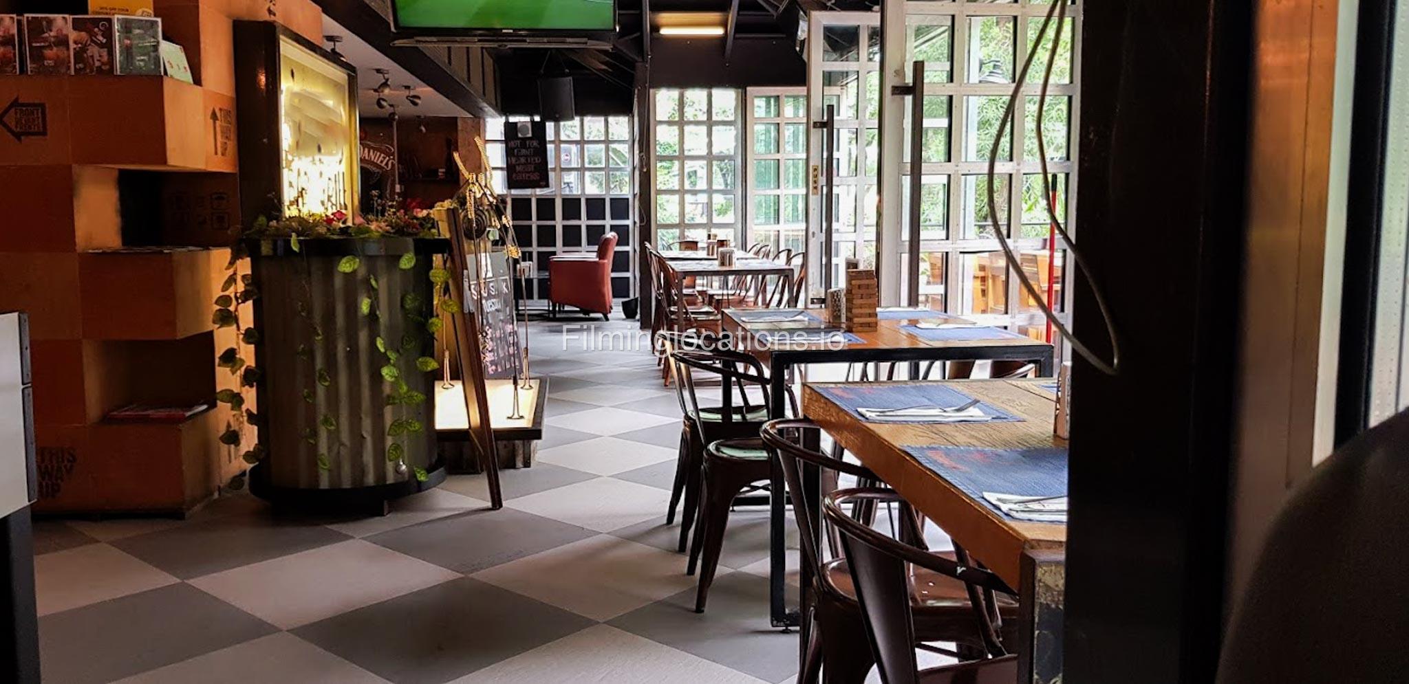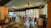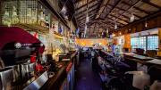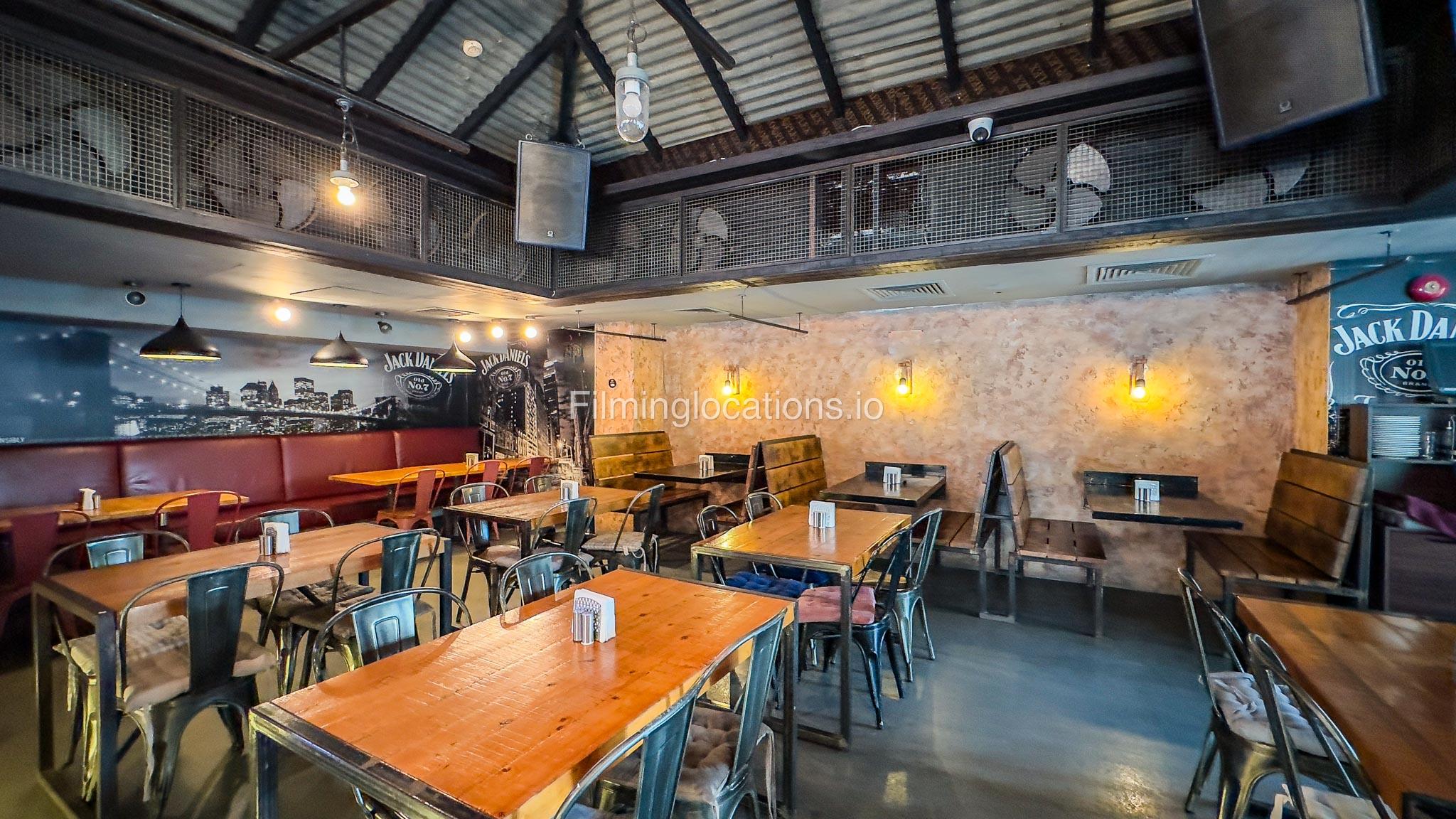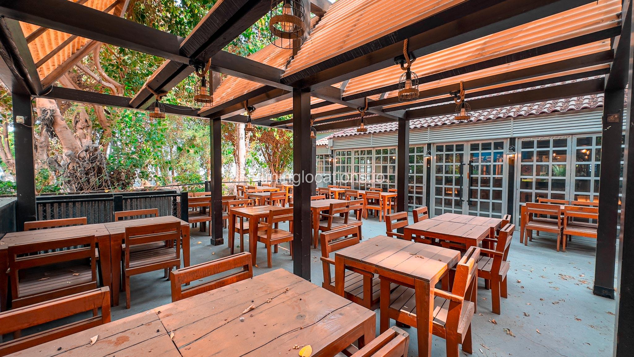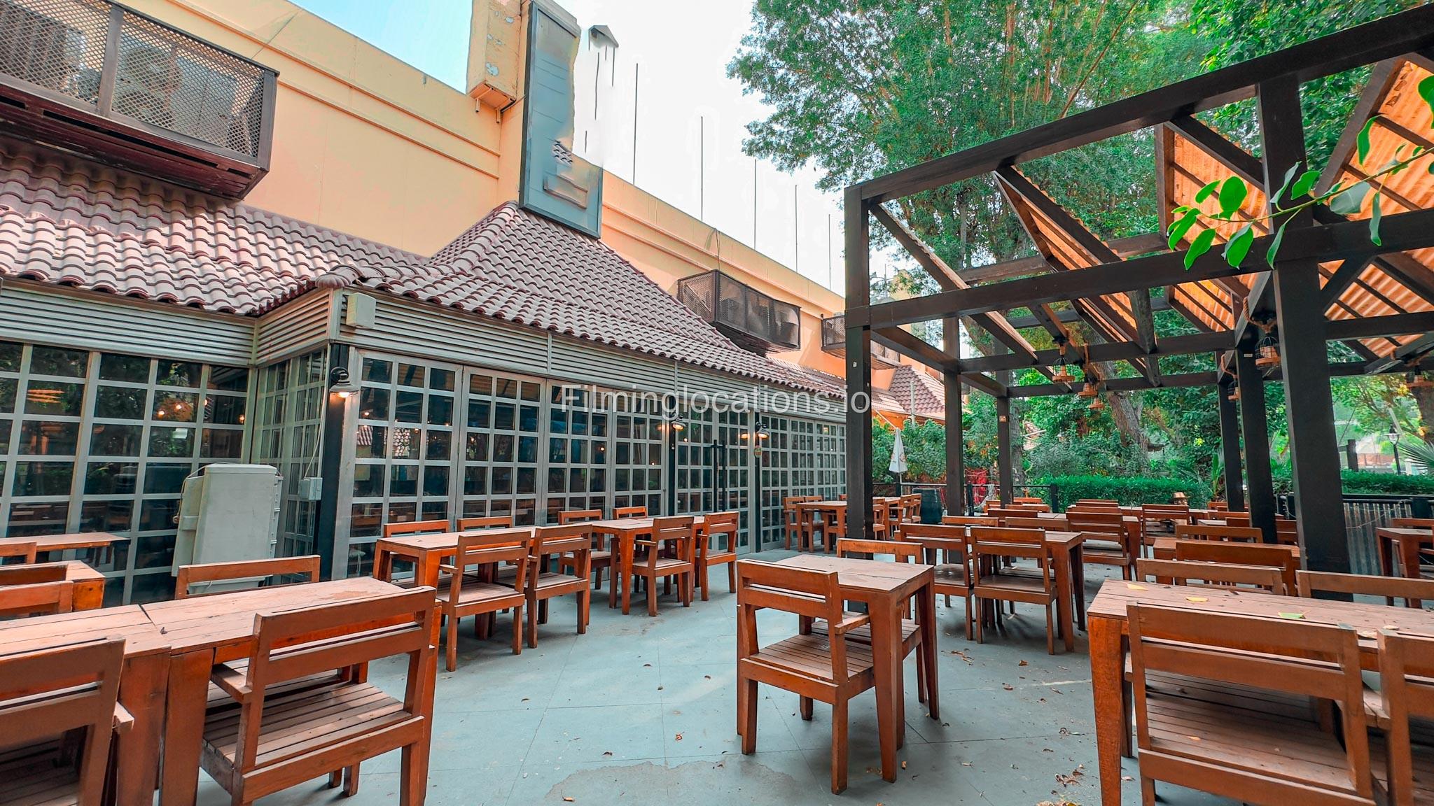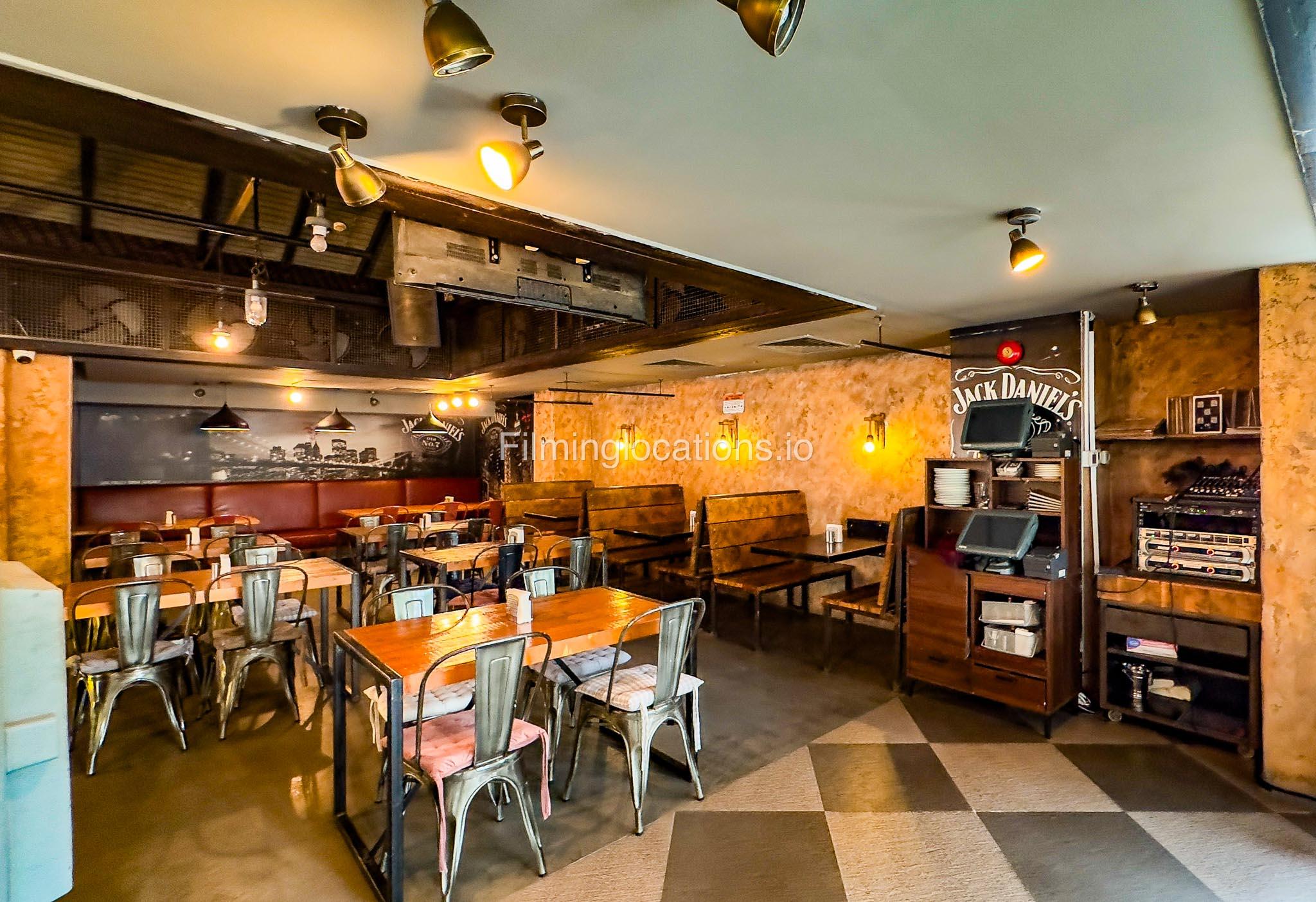 Our venue has wooden tables and seating, both booth-style and open tables, with a large space, high ceilings and an open window wall. Its also complemented by an inviting outdoor area. Perfect for film shoots, commercials, or photo sessions.