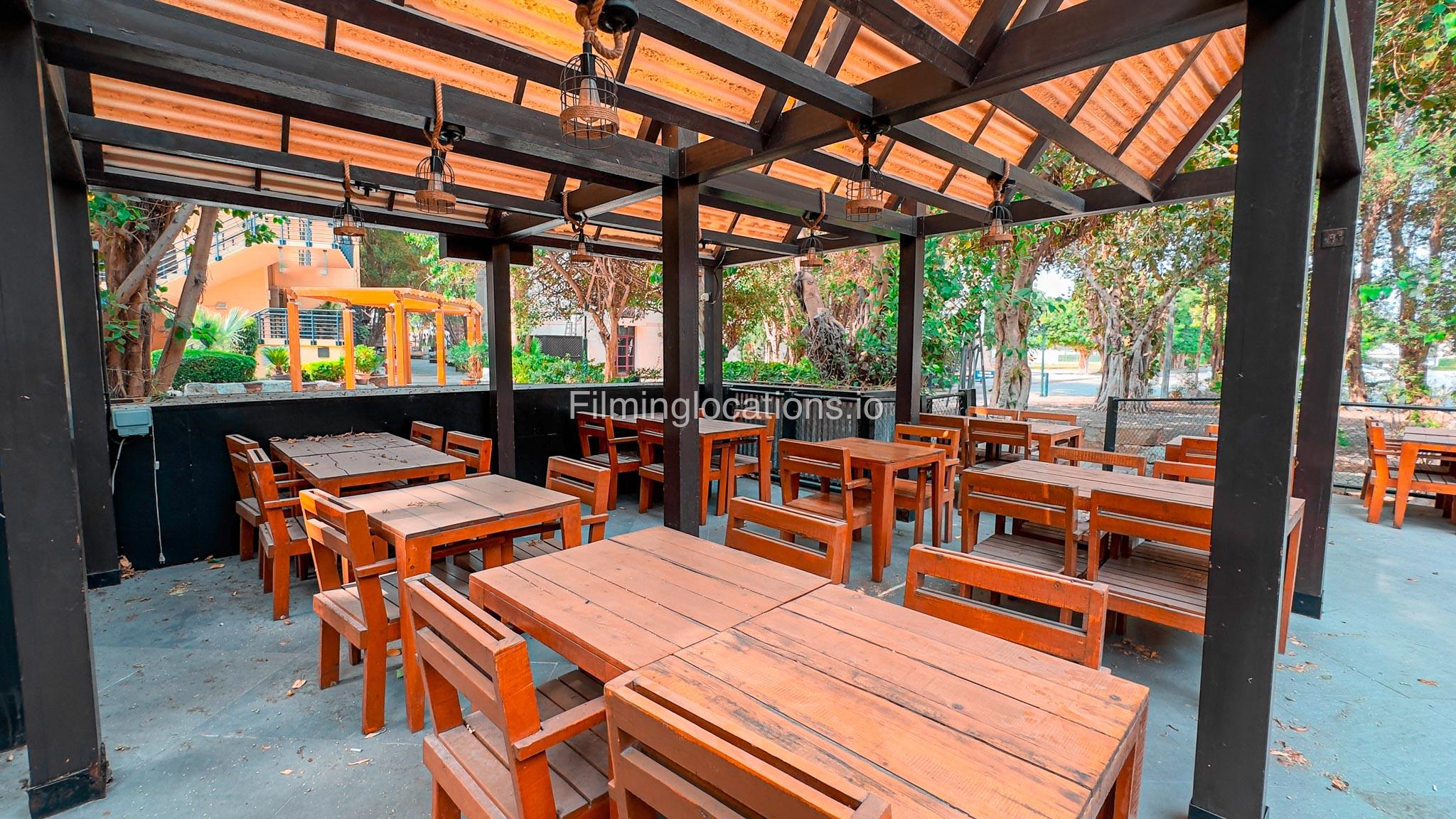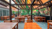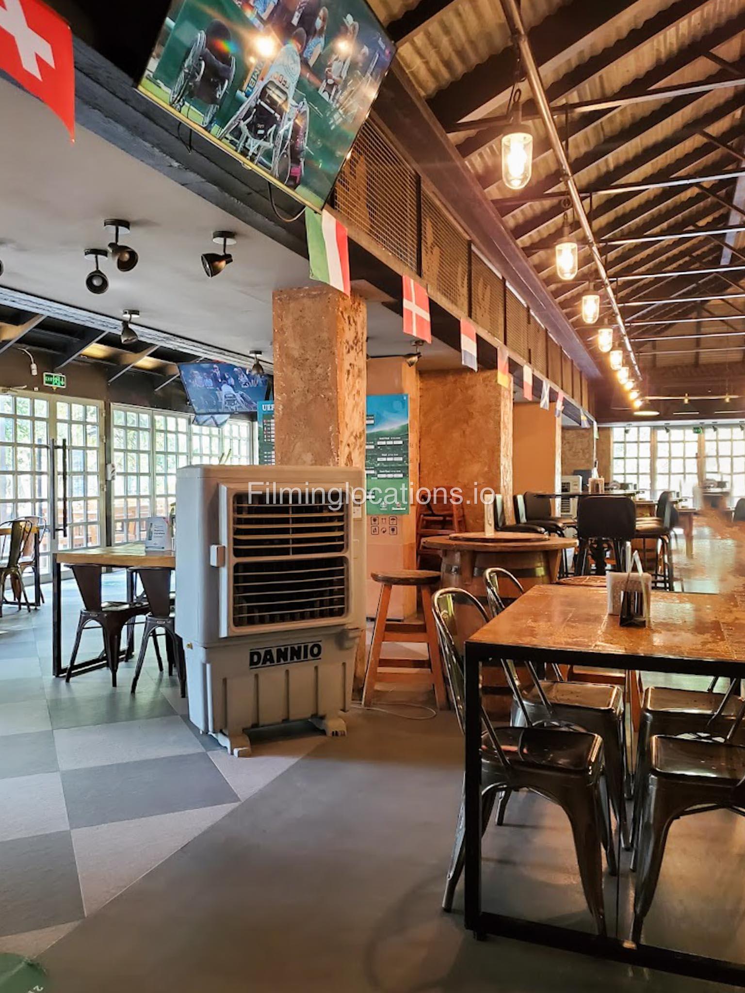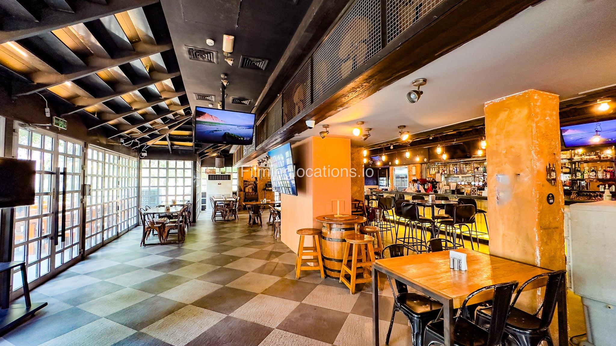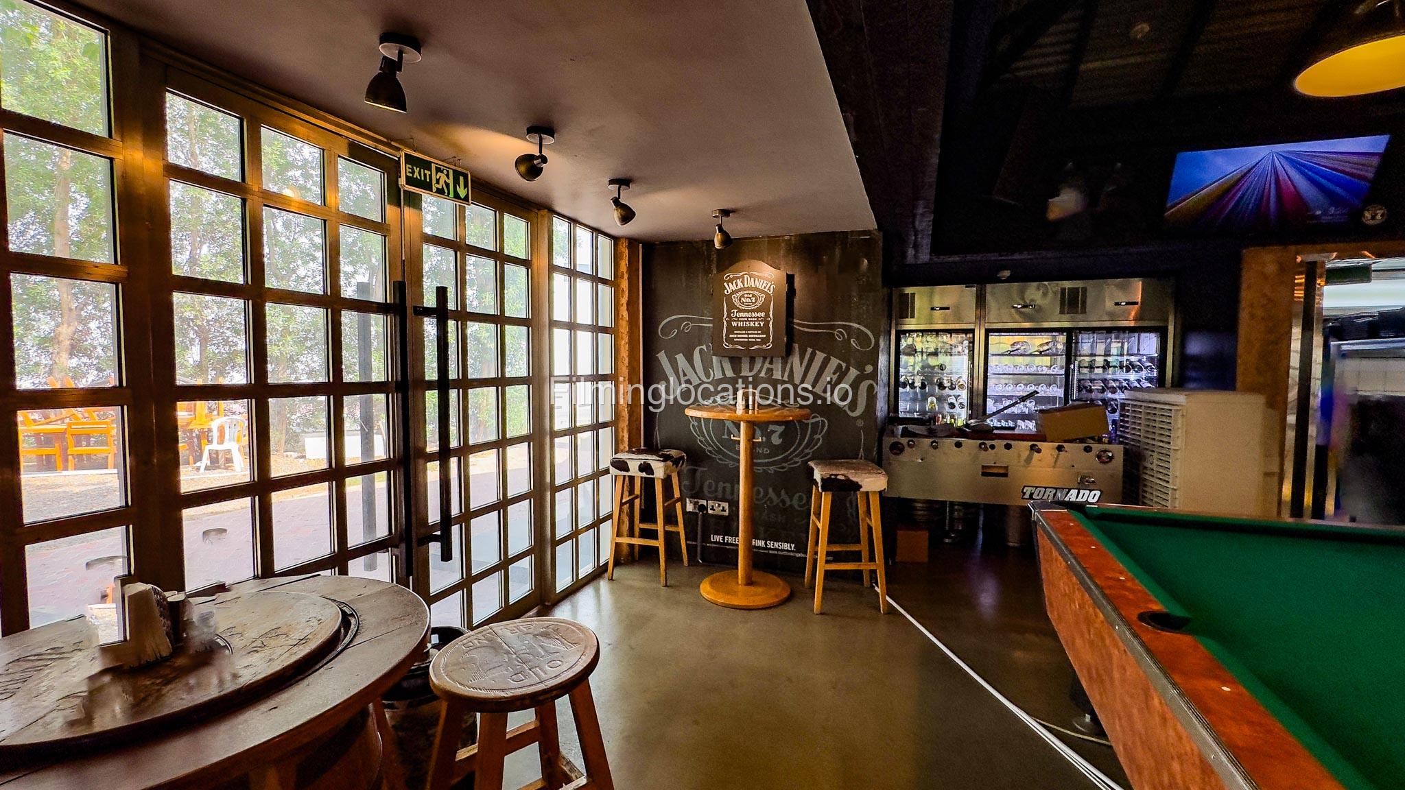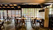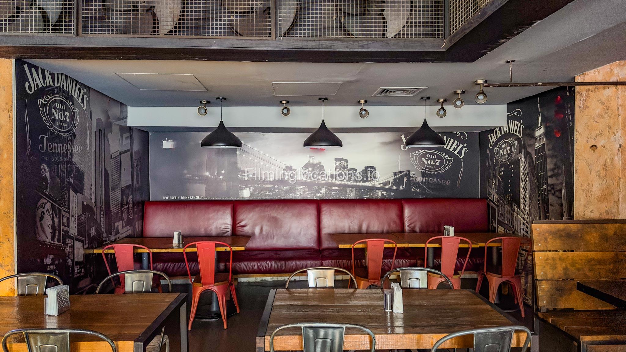 Our venue has wooden tables and seating, both booth-style and open tables, with a large space, high ceilings and an open window wall. Its also complemented by an inviting outdoor area. Perfect for film shoots, commercials, or photo sessions.