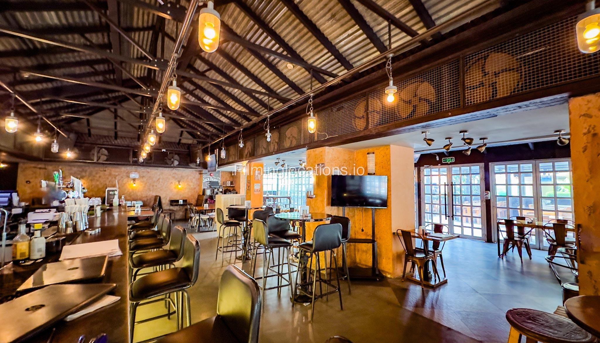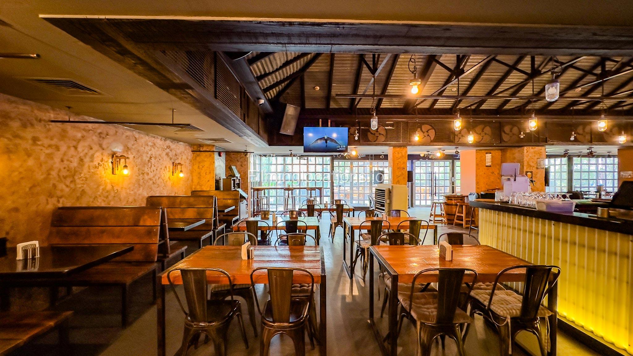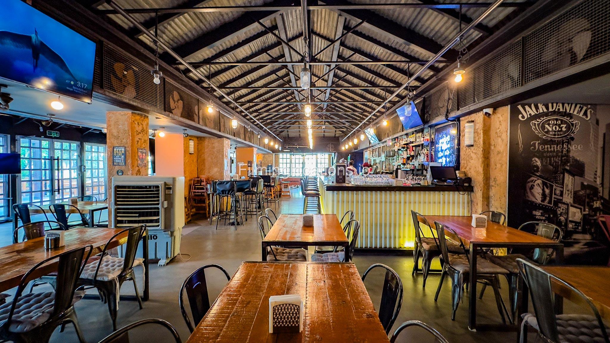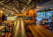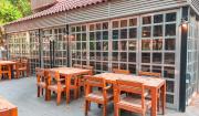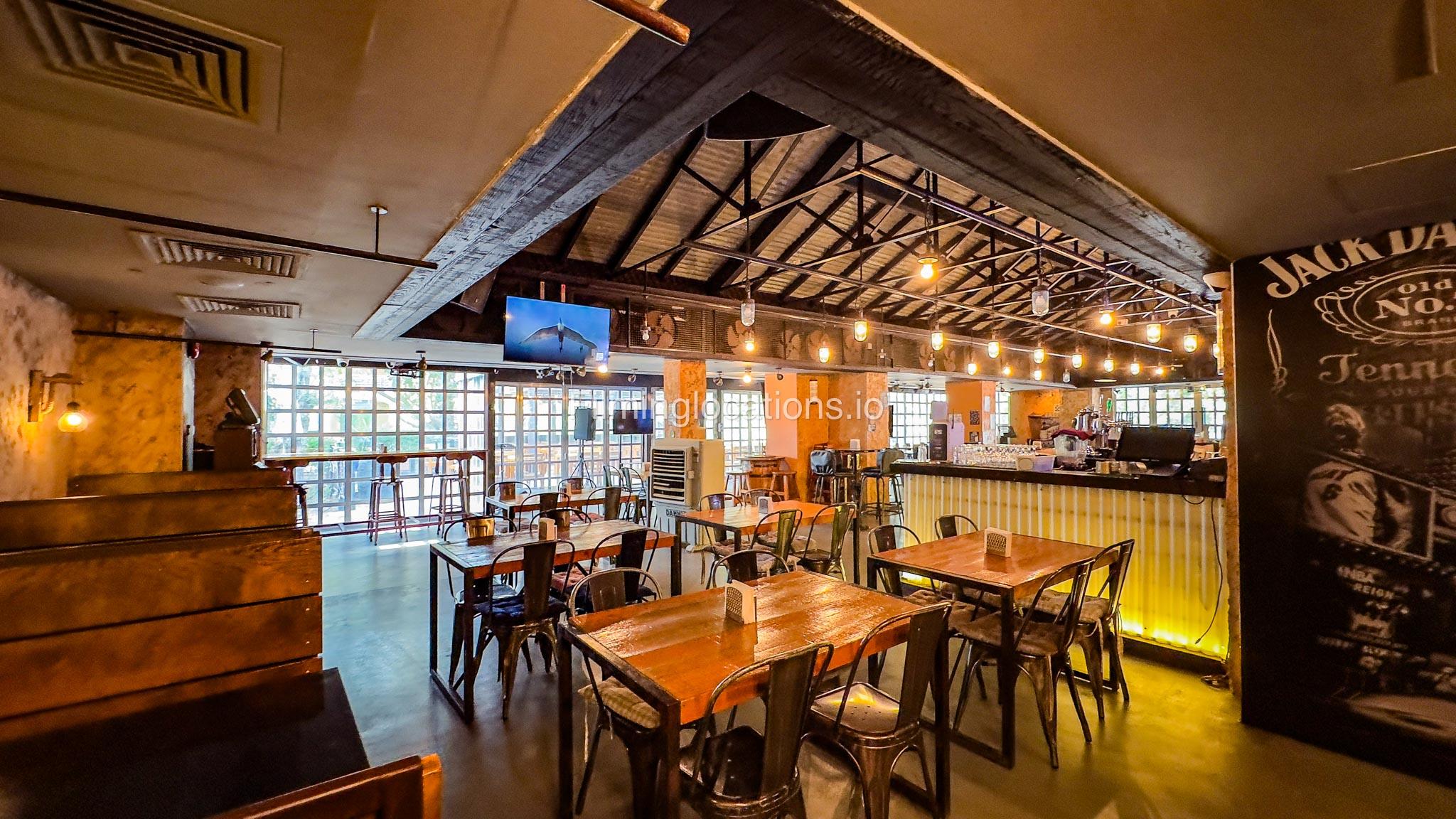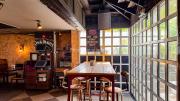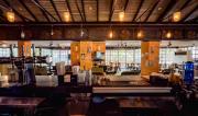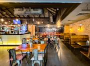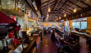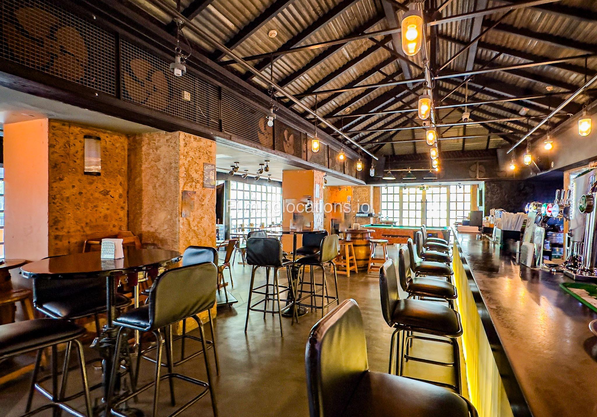 Our venue has wooden tables and seating, both booth-style and open tables, with a large space, high ceilings and an open window wall. Its also complemented by an inviting outdoor area. Perfect for film shoots, commercials, or photo sessions.