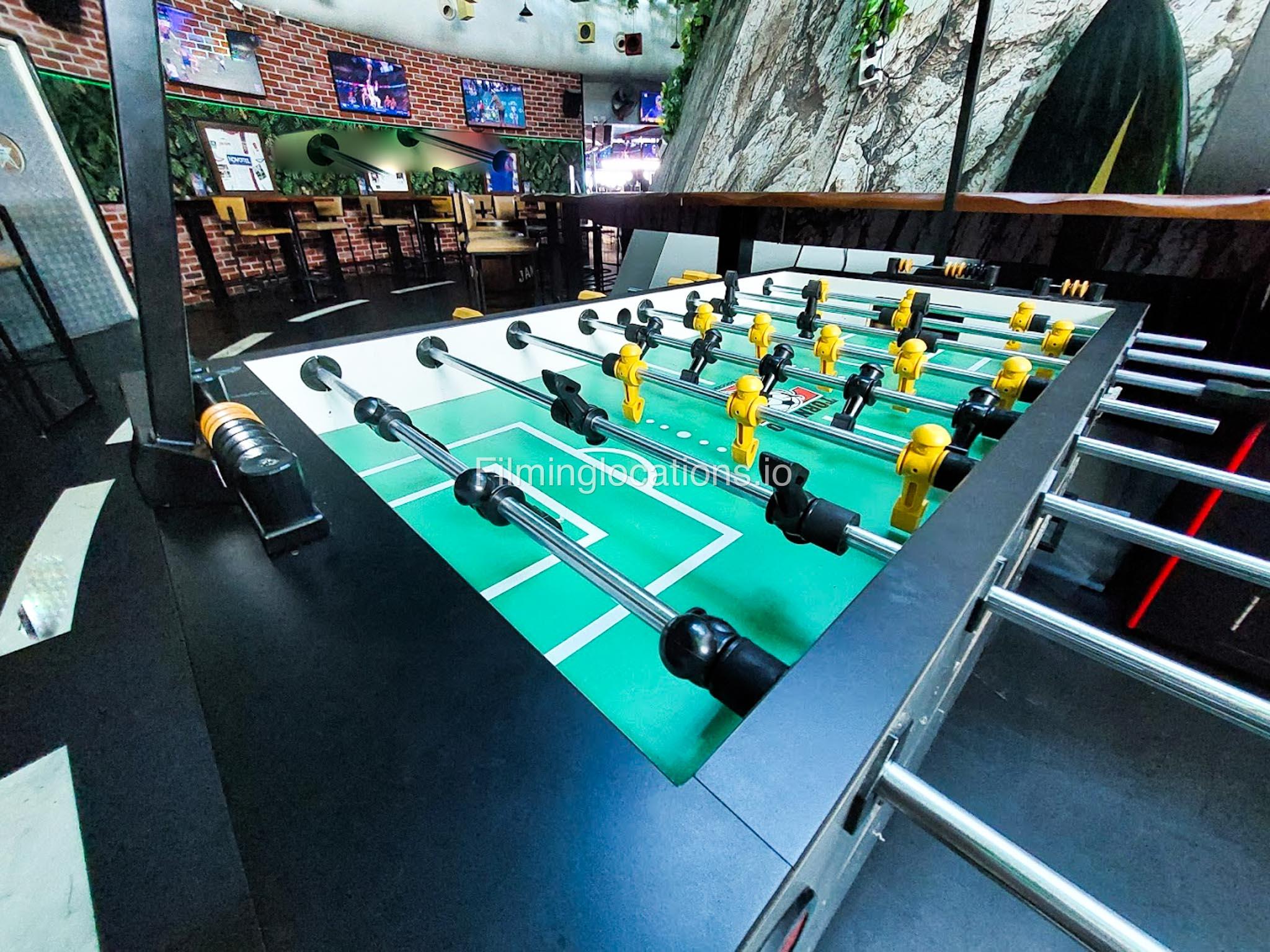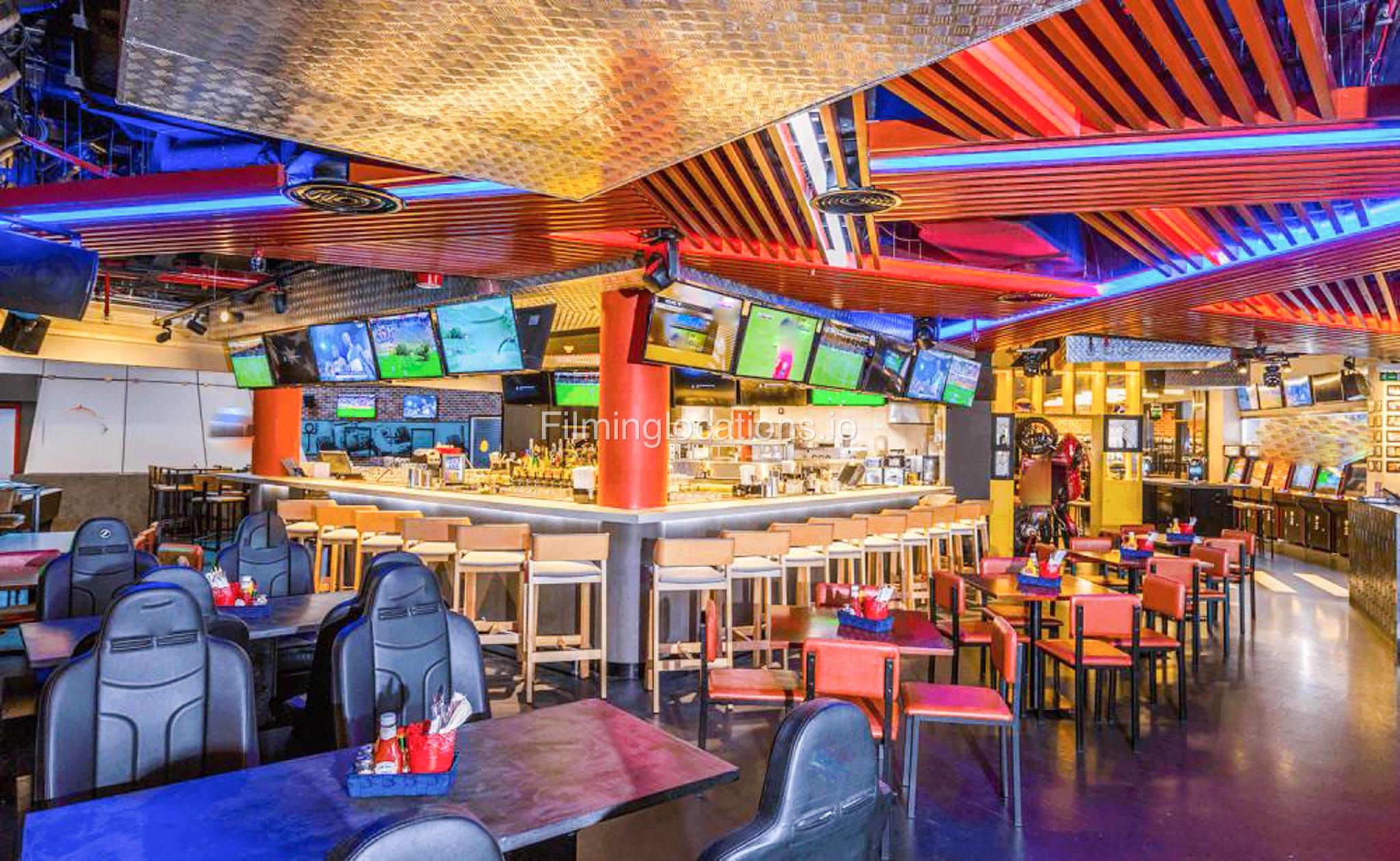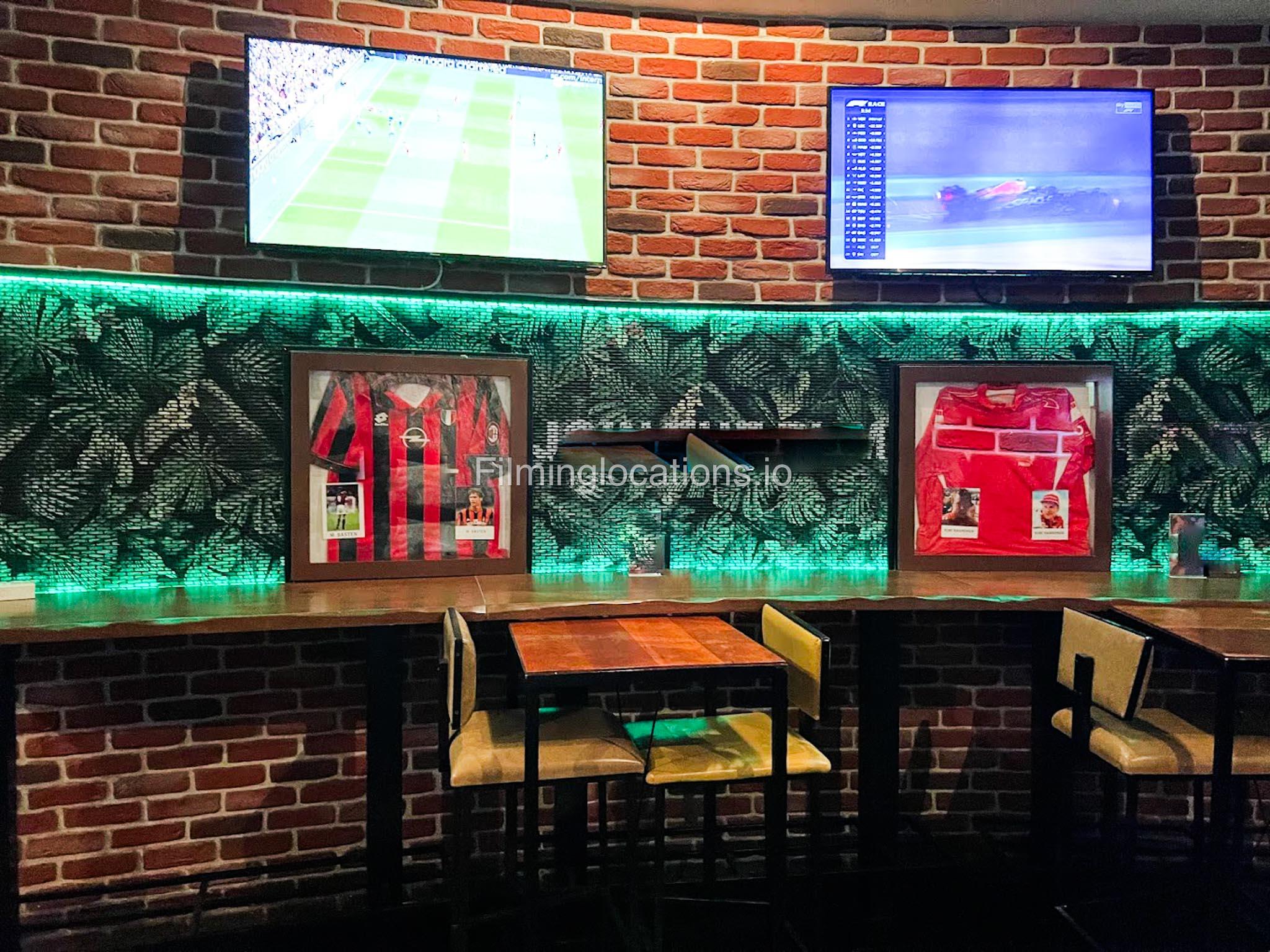 This American bar features rustic wooden tables and chairs with vibrant sporty decor. There are multiple TV screens throughout and both indoor and outdoor areas with lots of space.