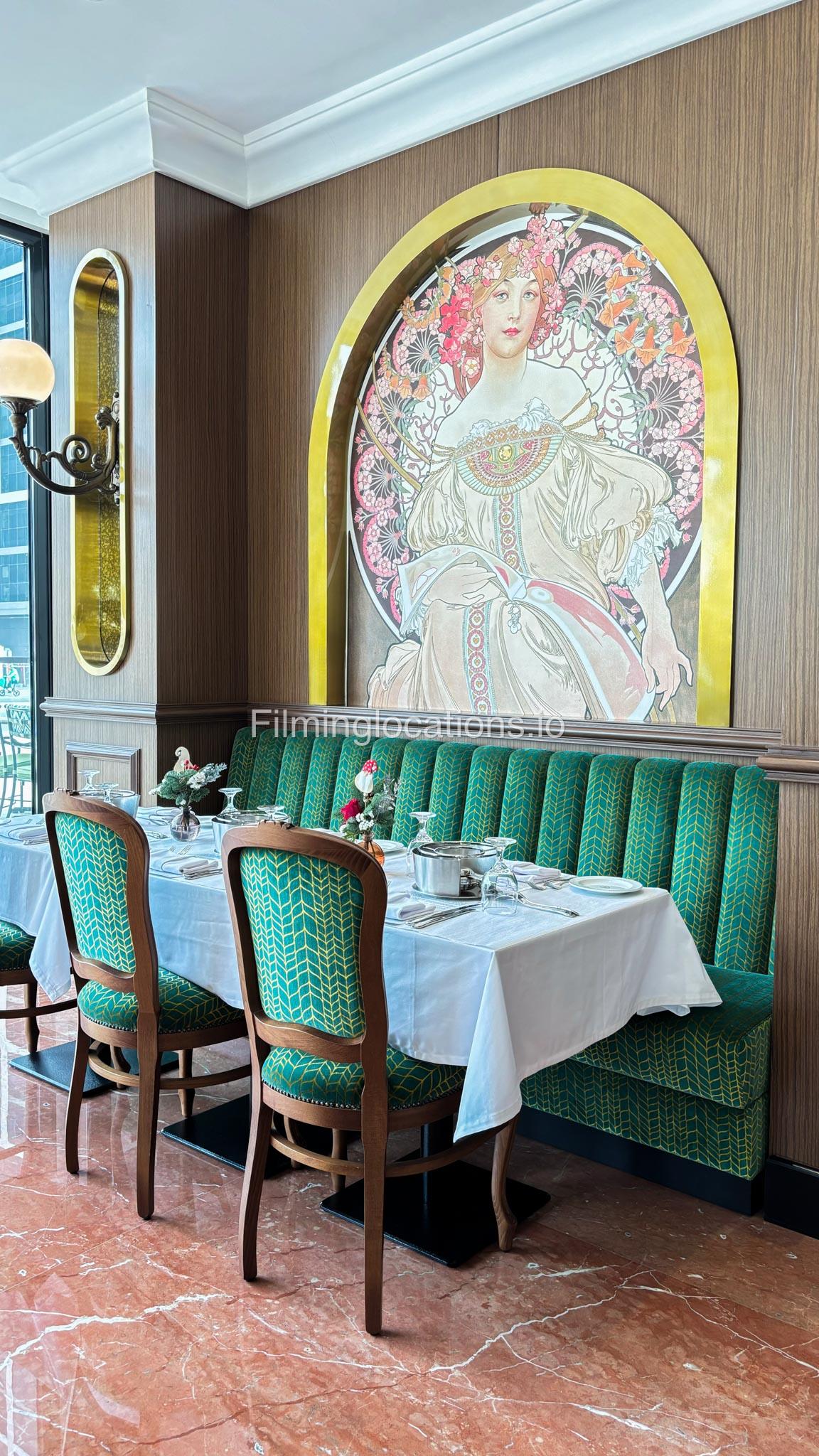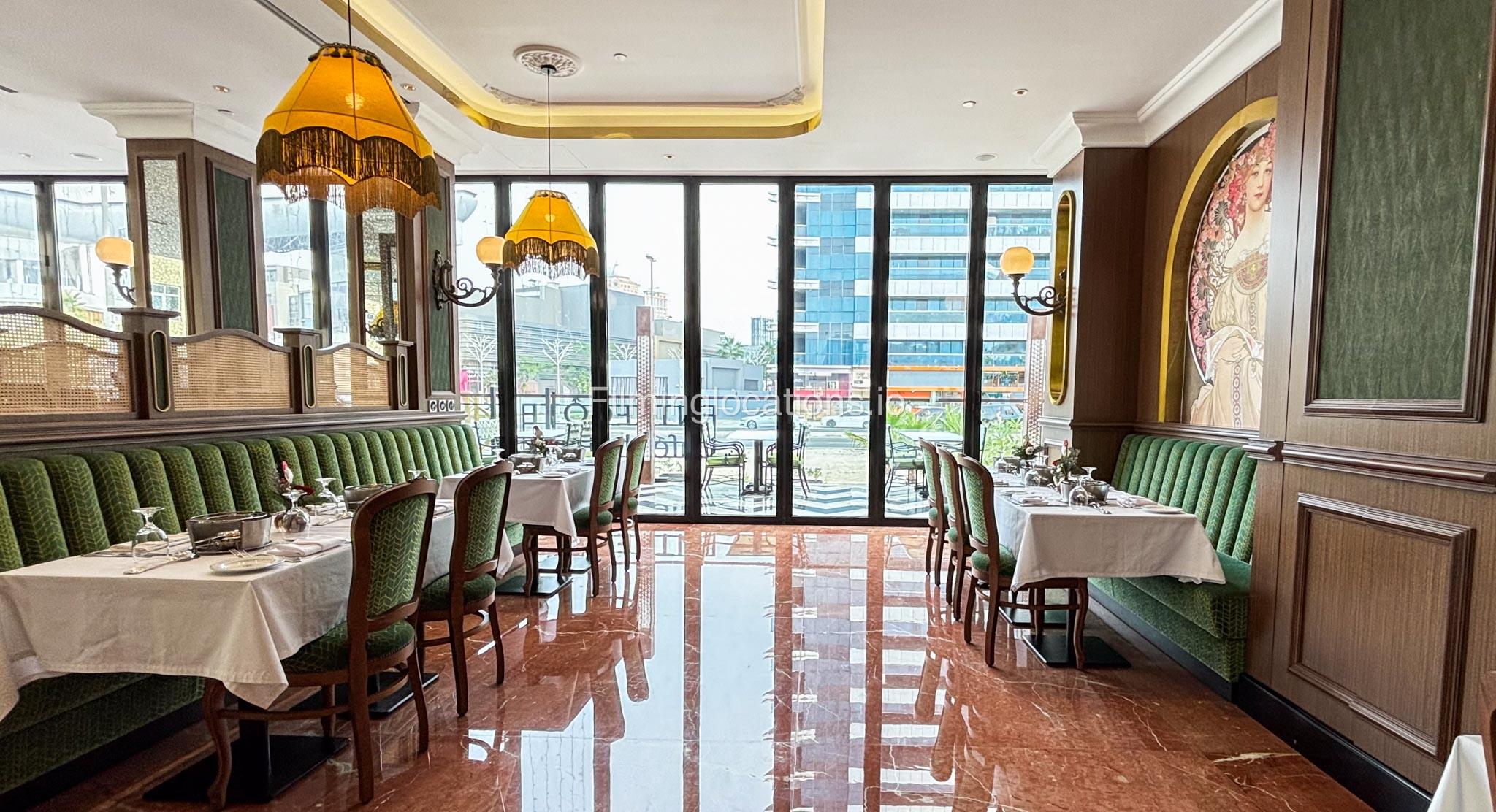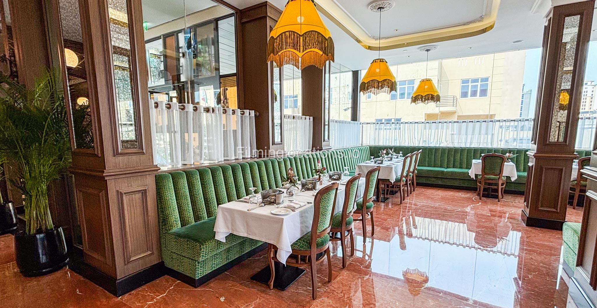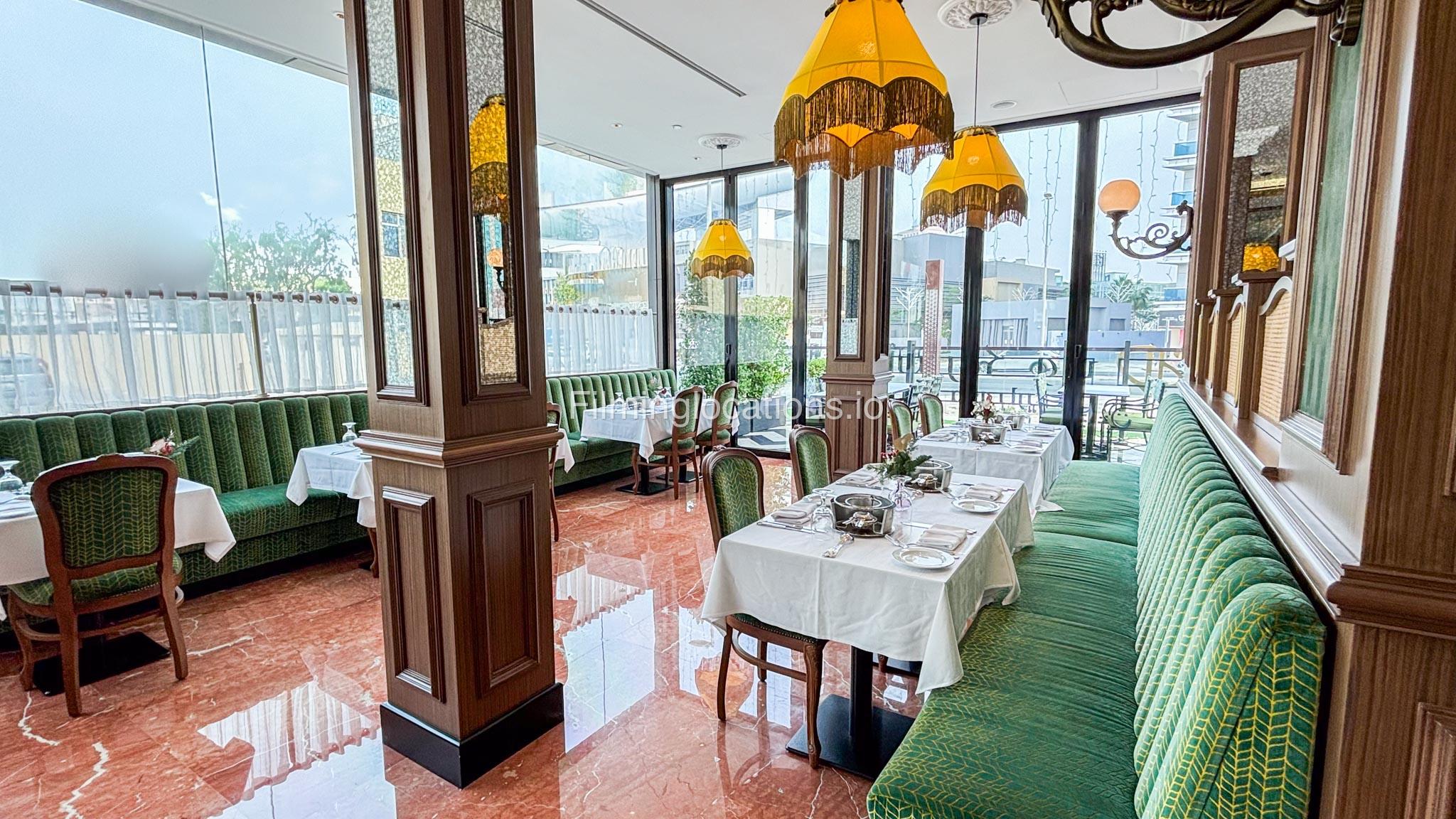 This French restaurant exudes a sophisticated charm with its wooden walls and tasteful furnishings. Inside there are green upholstered chairs and cozy sofa-seating. The restaurant also features an outdoor terrace with expansive window walls and views of the city.