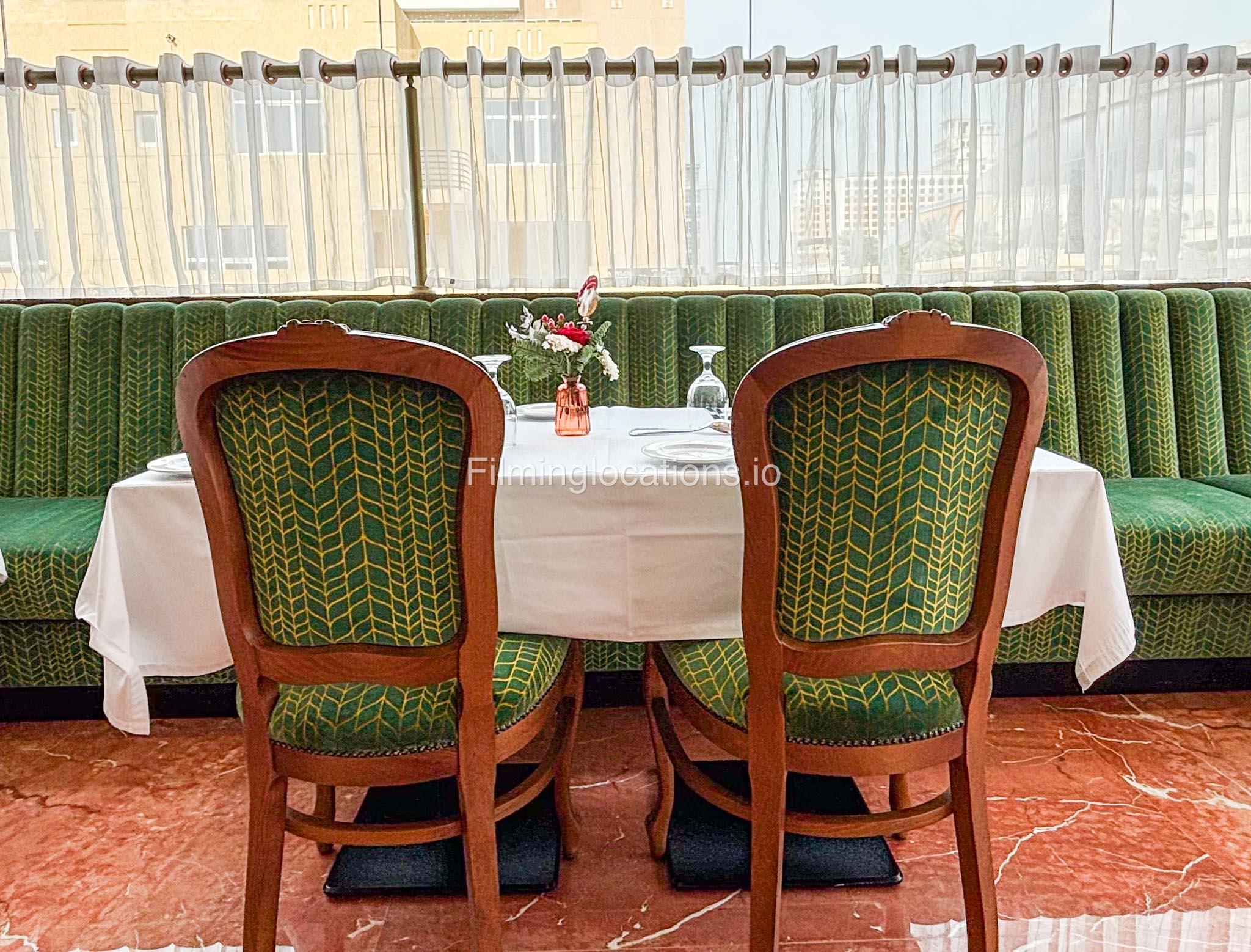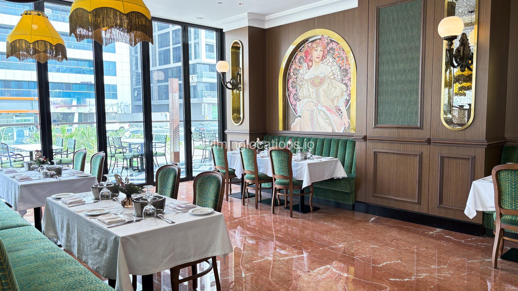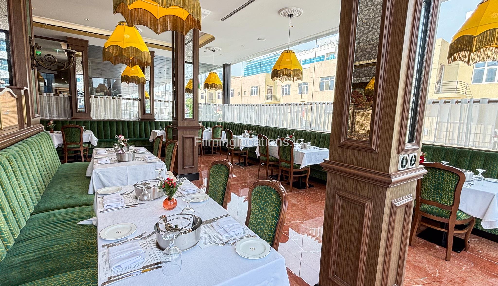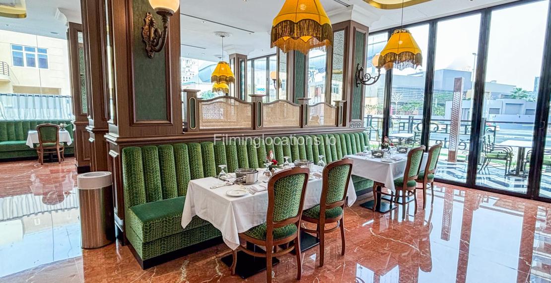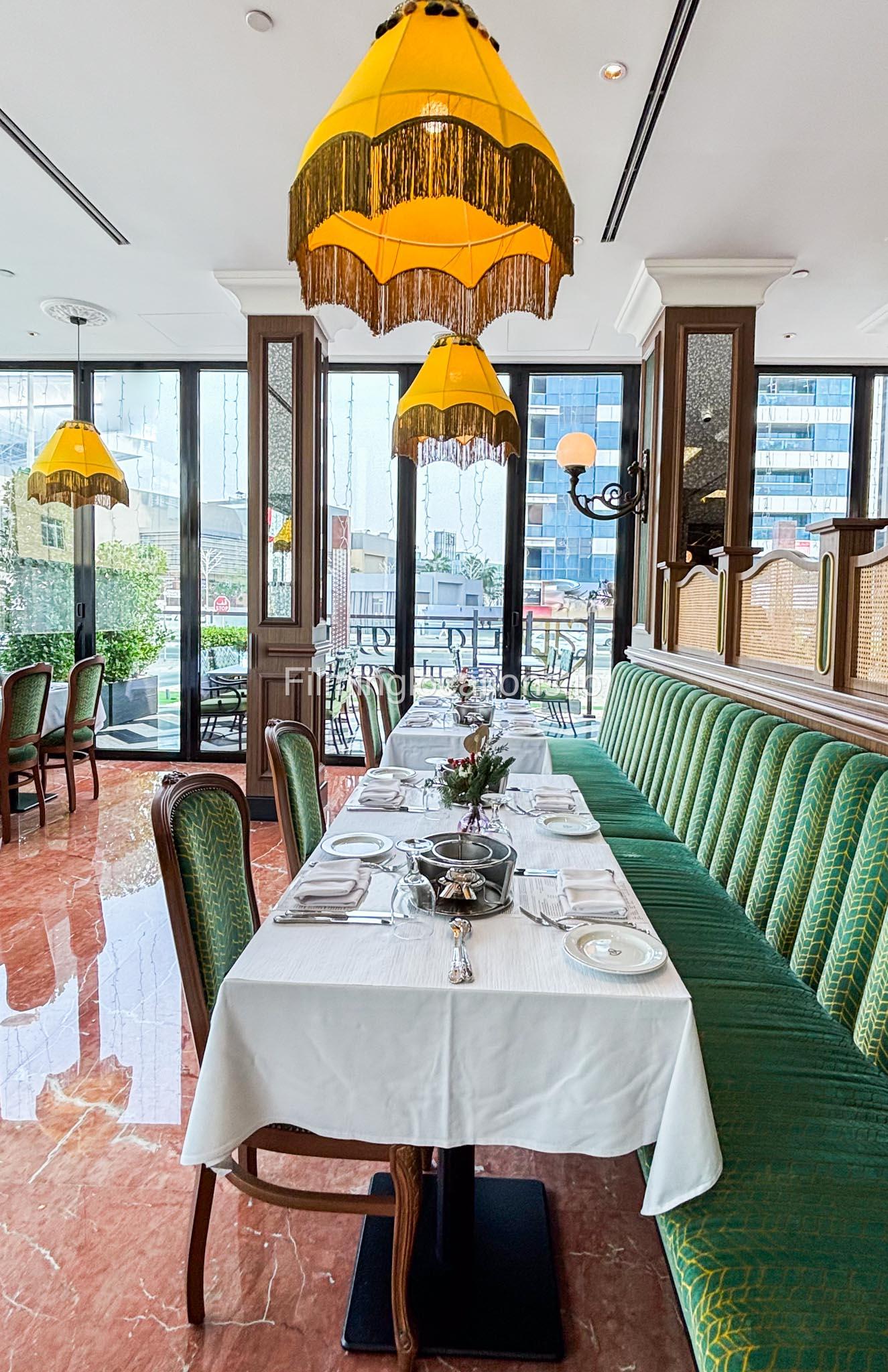 This French restaurant exudes a sophisticated charm with its wooden walls and tasteful furnishings. Inside there are green upholstered chairs and cozy sofa-seating. The restaurant also features an outdoor terrace with expansive window walls and views of the city.