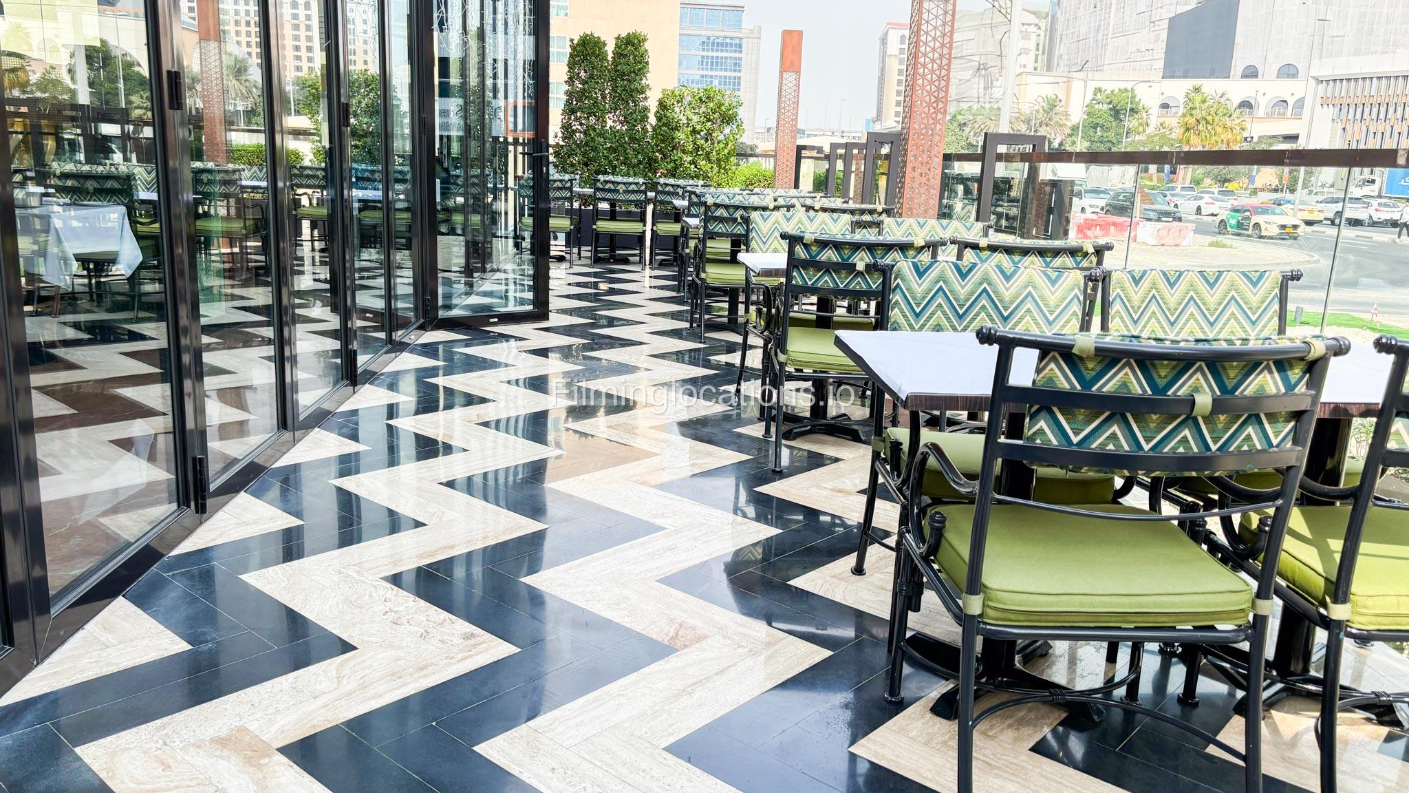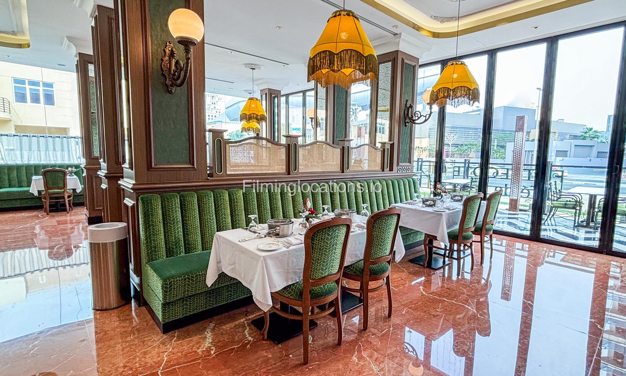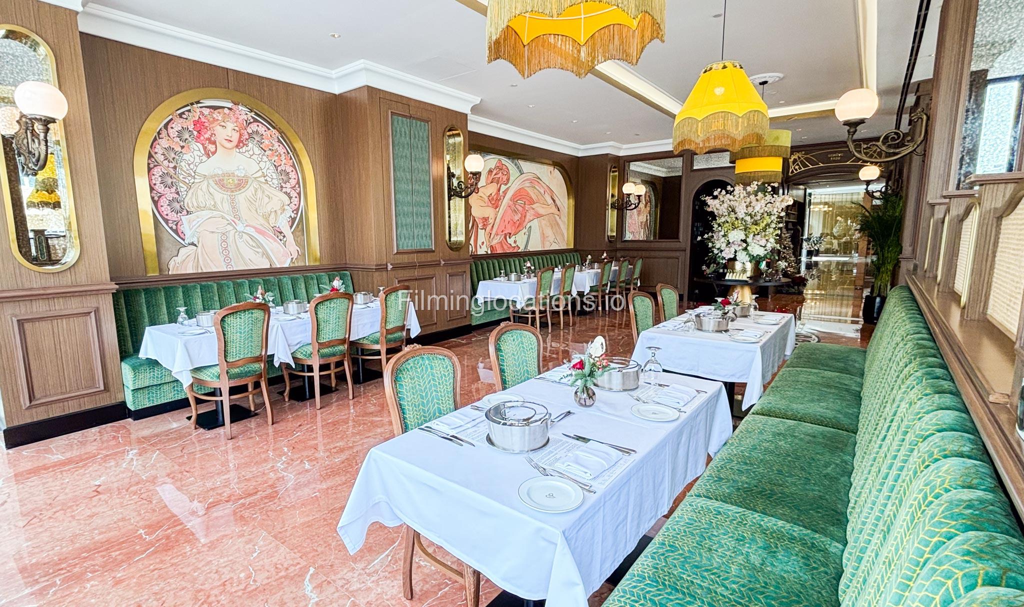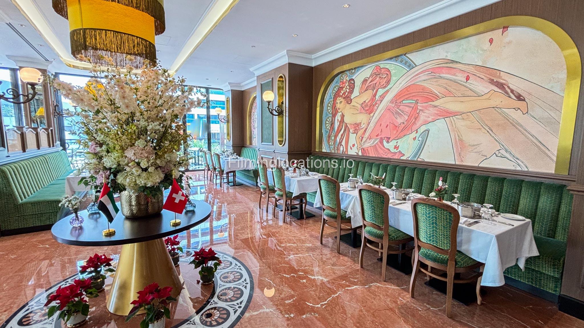 This French restaurant exudes a sophisticated charm with its wooden walls and tasteful furnishings. Inside there are green upholstered chairs and cozy sofa-seating. The restaurant also features an outdoor terrace with expansive window walls and views of the city.