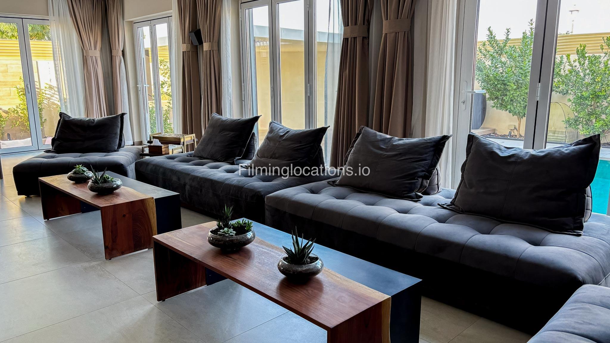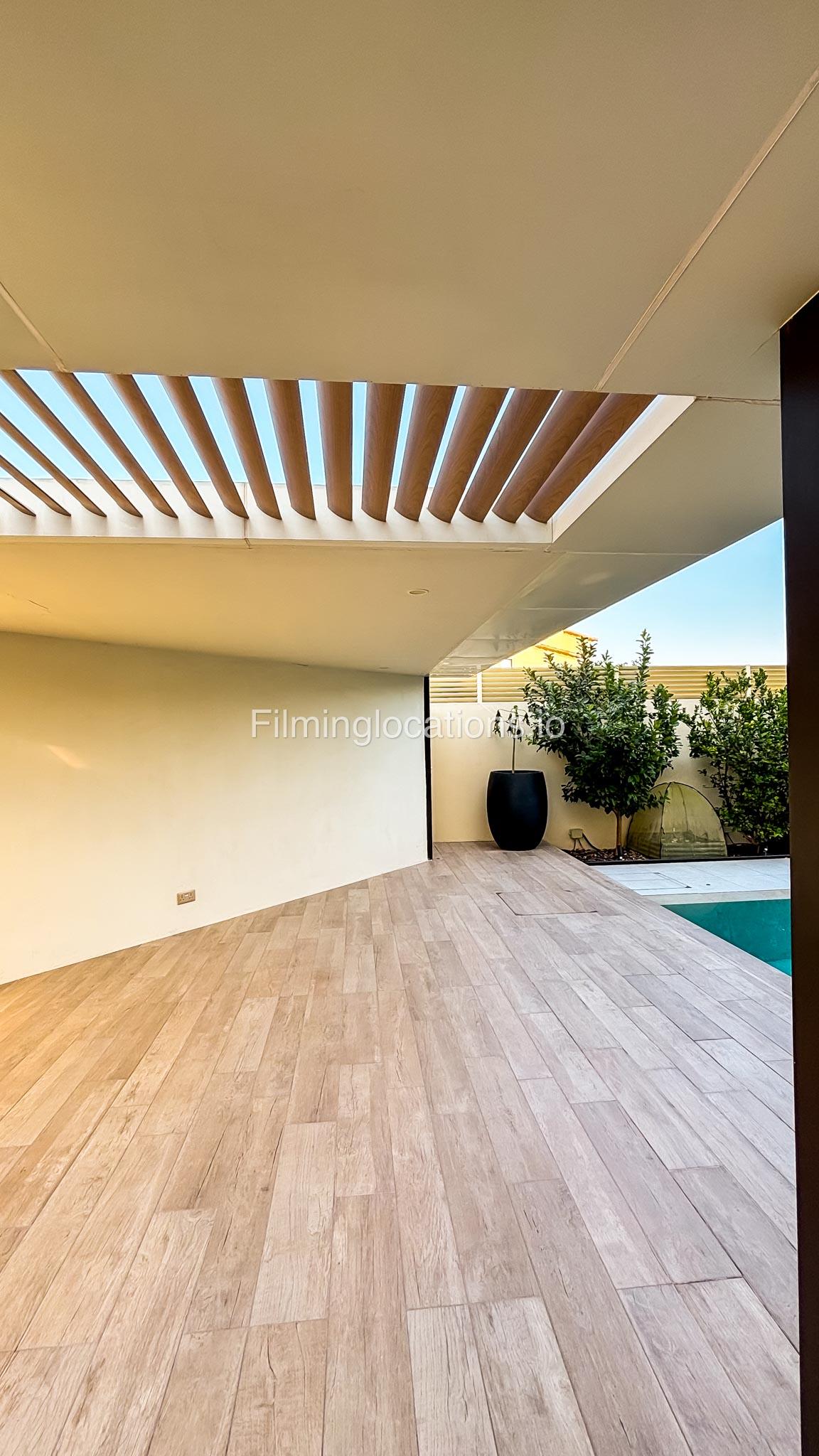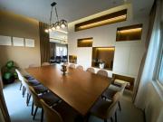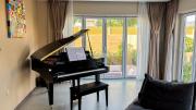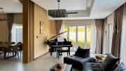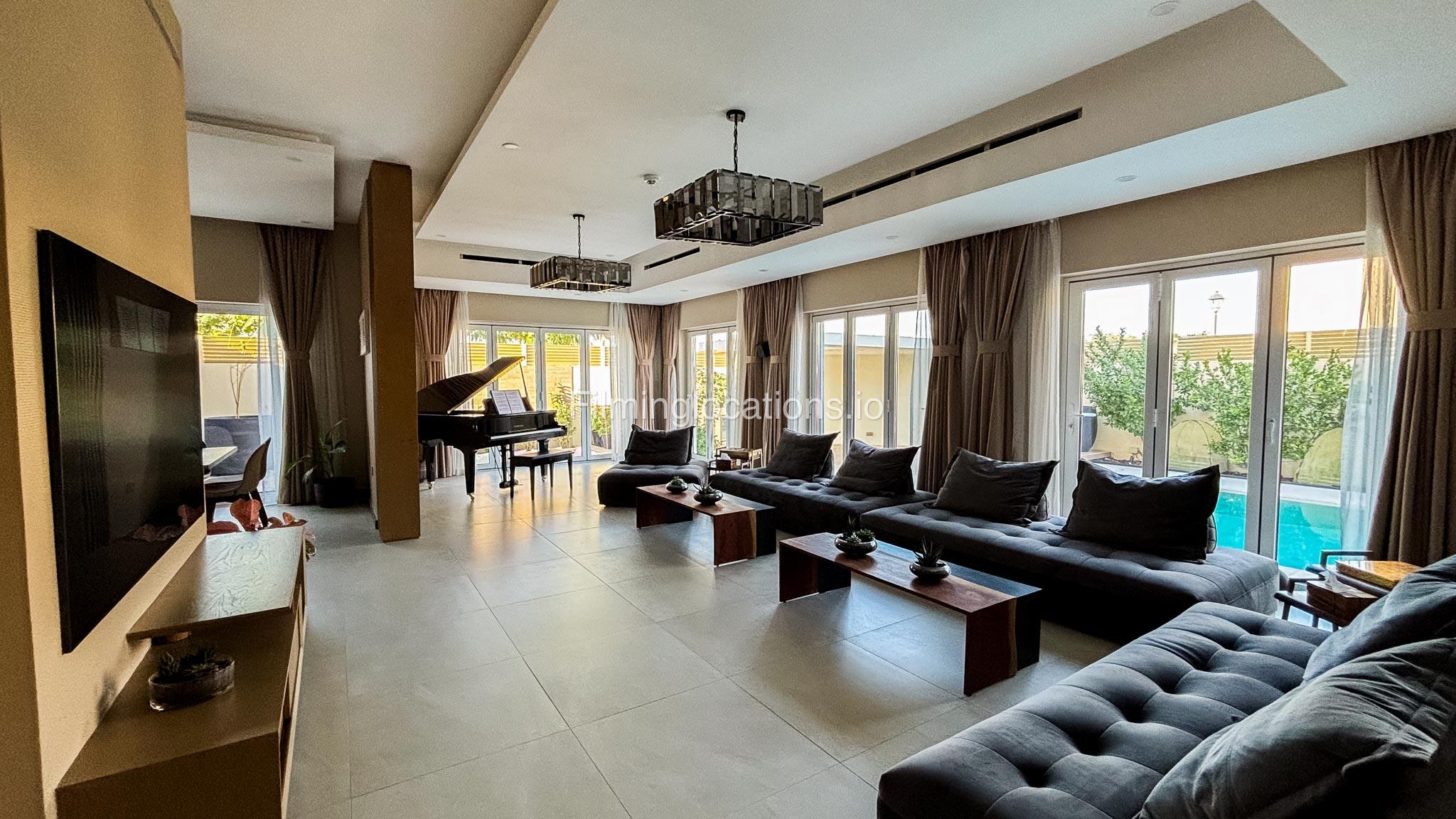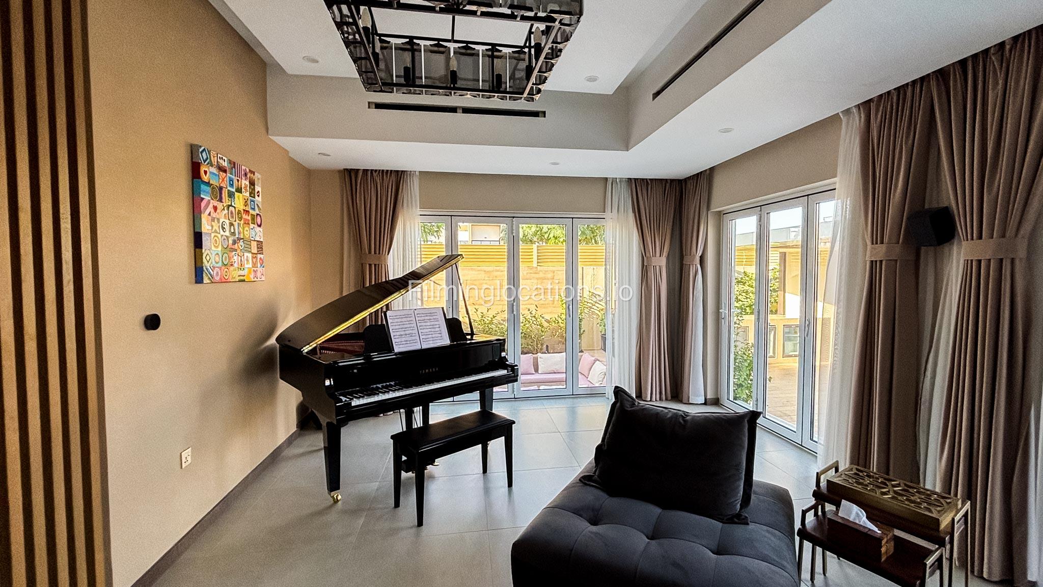 Our villa is a modern 5-bedroom property featuring high-end wooden furniture and a contemporary design. The ground floor offers a spacious living area with a baby grand piano, a dining space, a cozy bedroom, a kitchen, and a small laundry room. Bifold glass doors in the living room create a seamless indoor-outdoor flow.