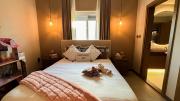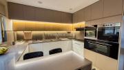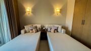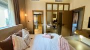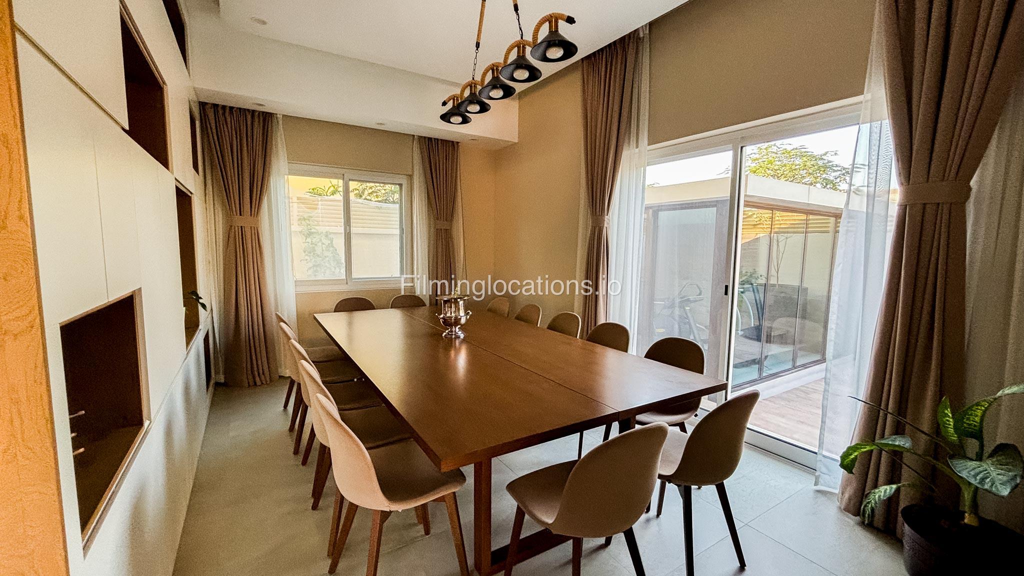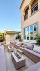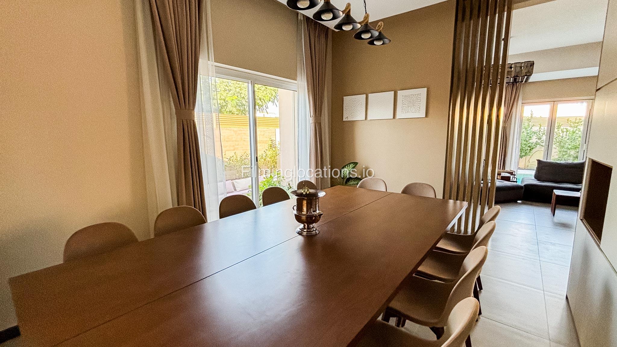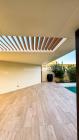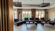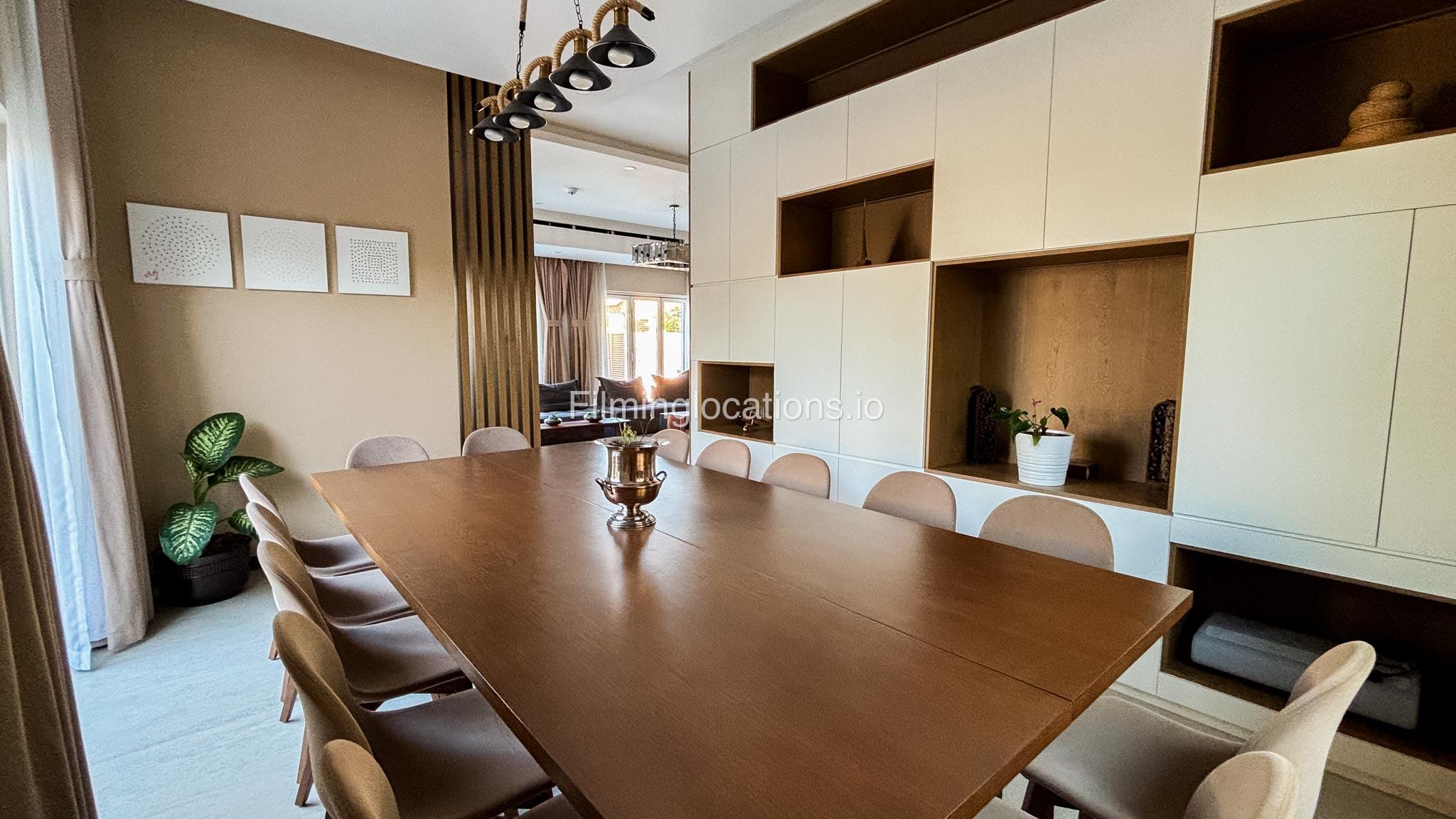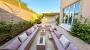 Our villa is a modern 5-bedroom property featuring high-end wooden furniture and a contemporary design. The ground floor offers a spacious living area with a baby grand piano, a dining space, a cozy bedroom, a kitchen, and a small laundry room. Bifold glass doors in the living room create a seamless indoor-outdoor flow.