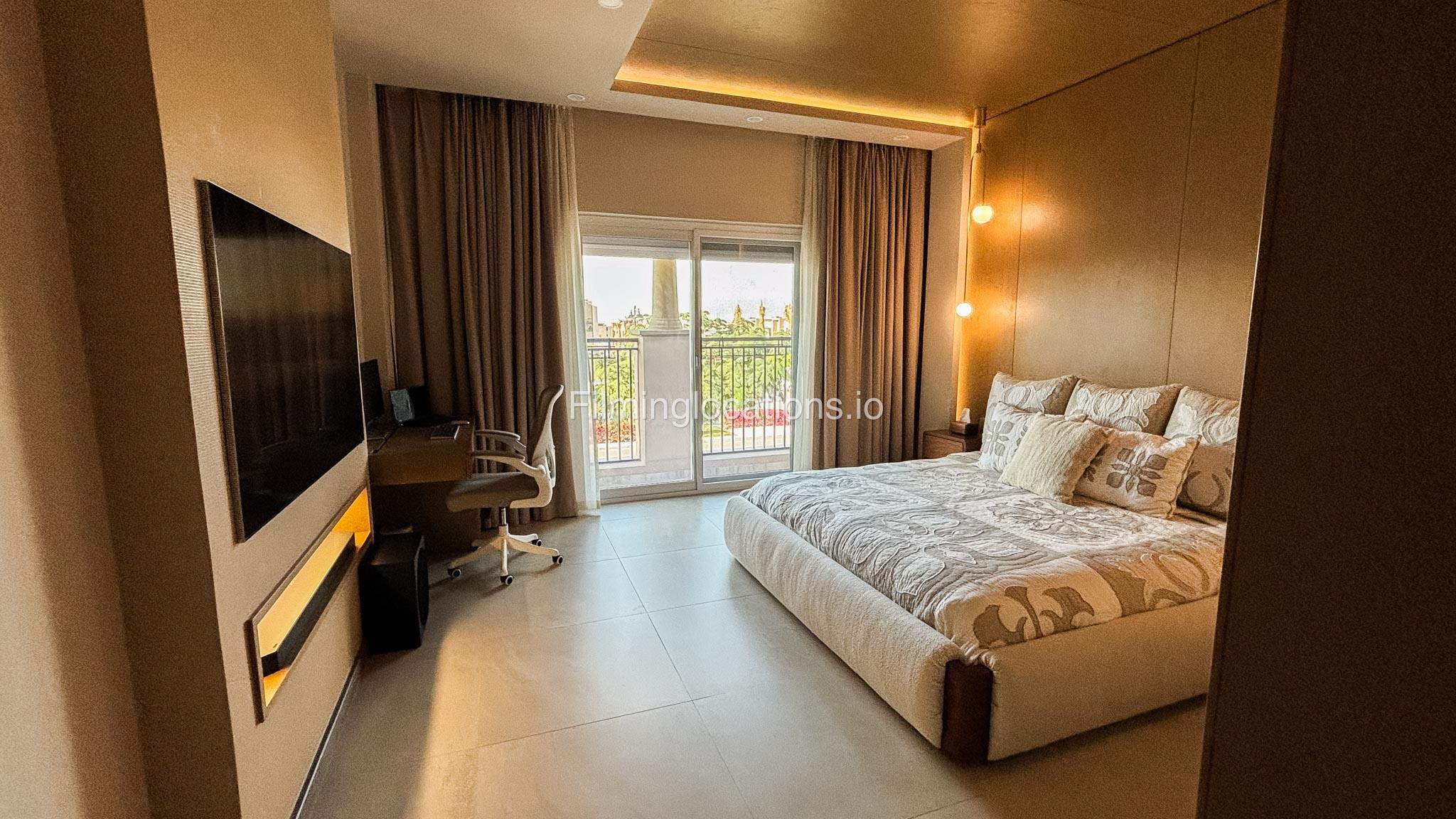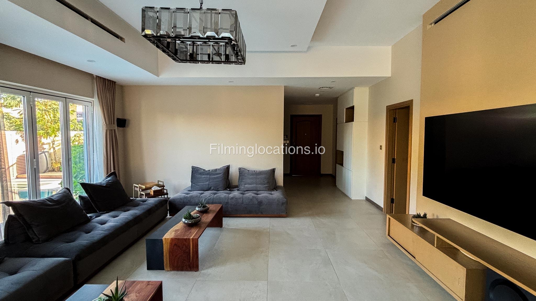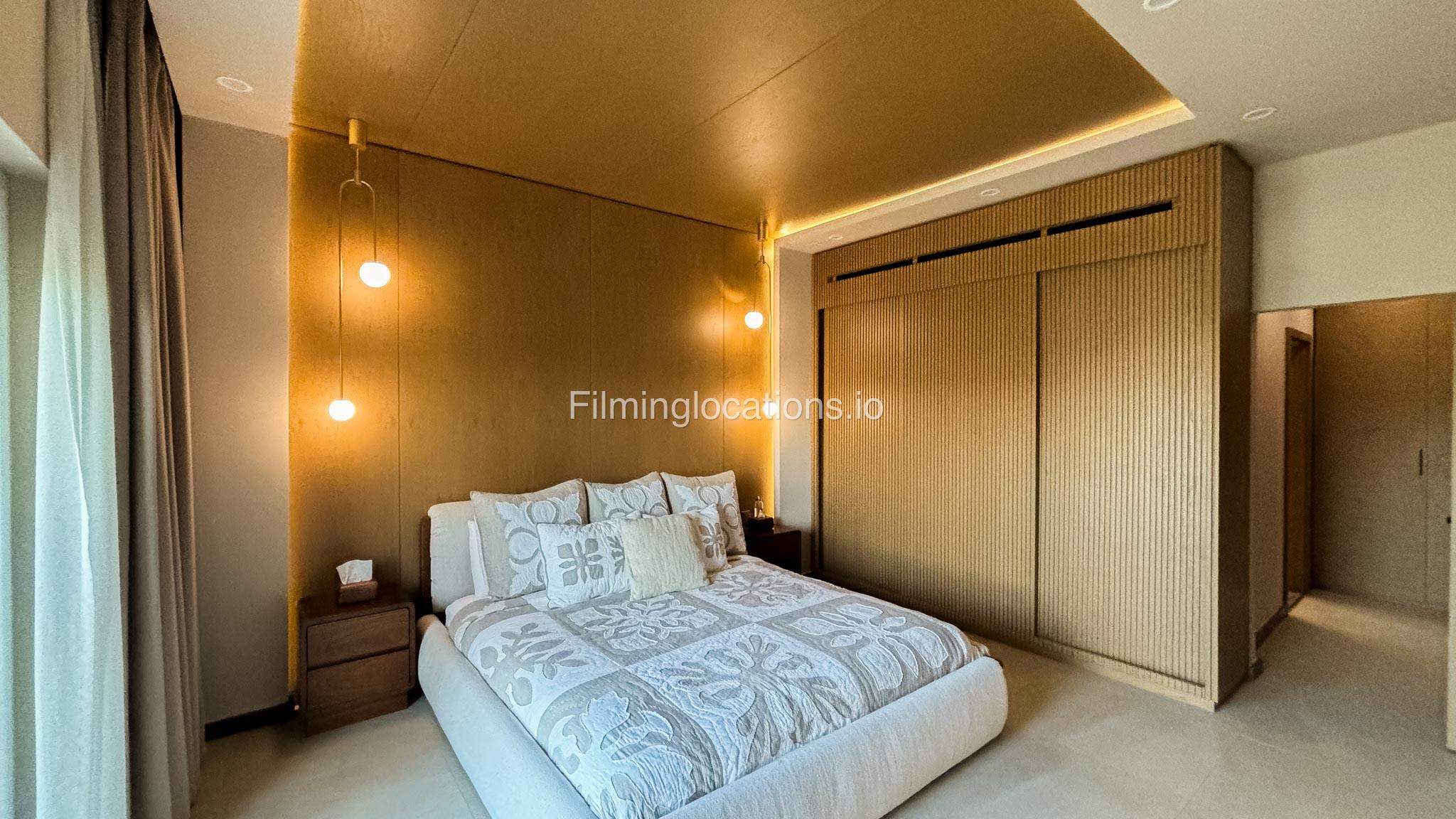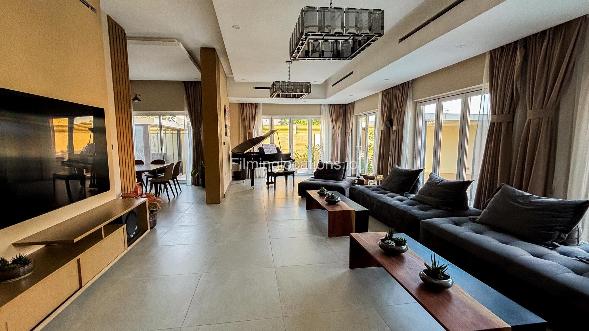 The upper floor houses 4 bedrooms, each enhanced with dimmable light features and elegant ceiling designs. Outdoor, the villa boasts a swimming pool, a sunken seating area with fire pits, and a gym surrounded by glass walls. This versatile space is perfect for filming and creative projects.