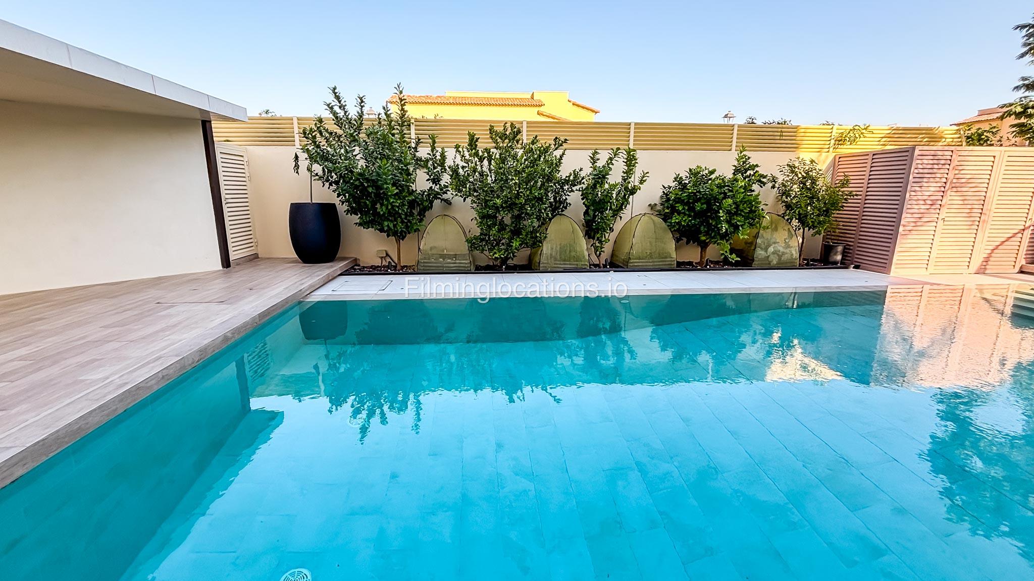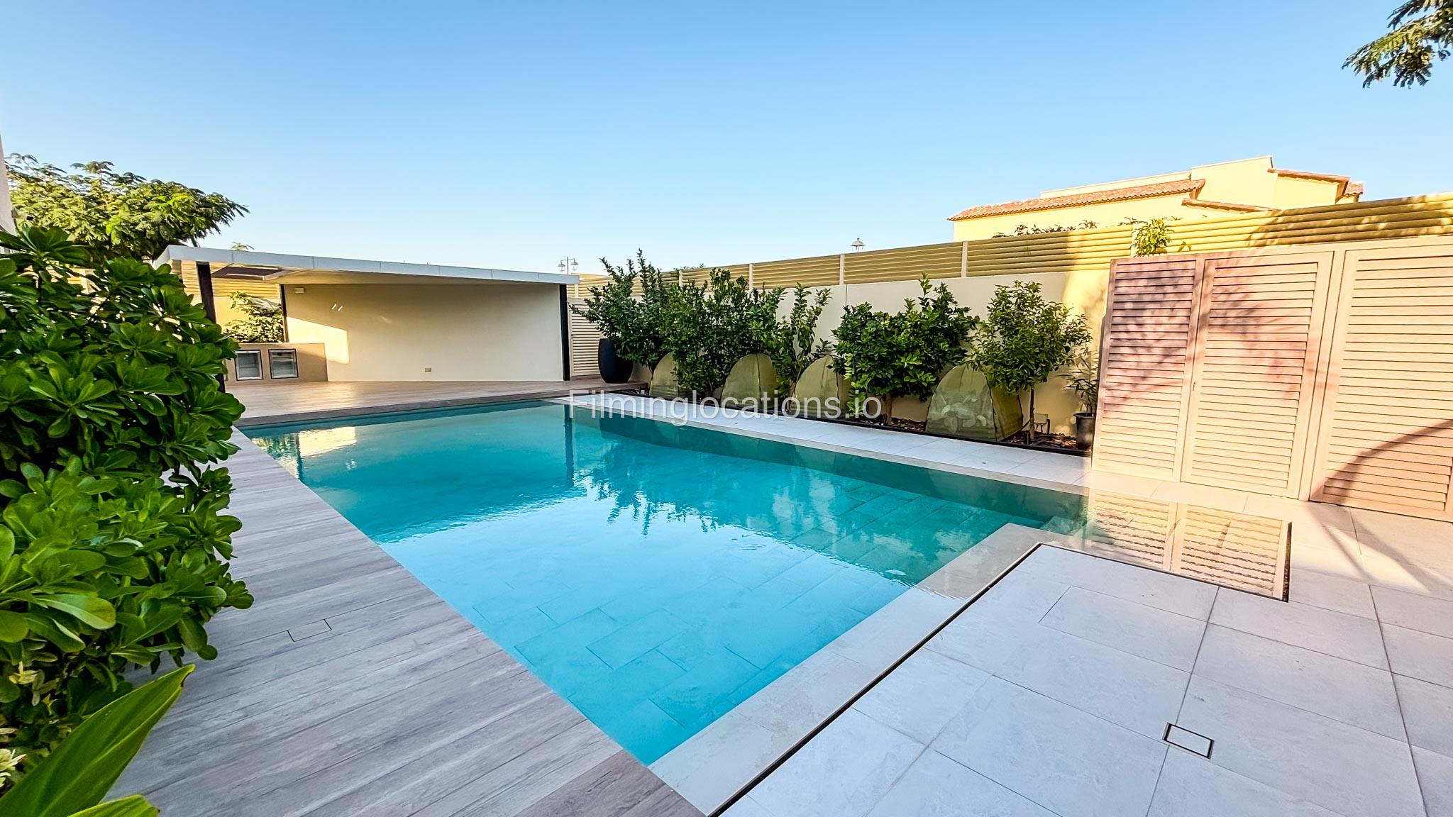 The sun rises on the right side of the house (the pool side). So the pool gets direct sunlight the first few hours of the day. From around 1 - 2 pm, the shade from the house covers it as the sun slowly moves to the left side.