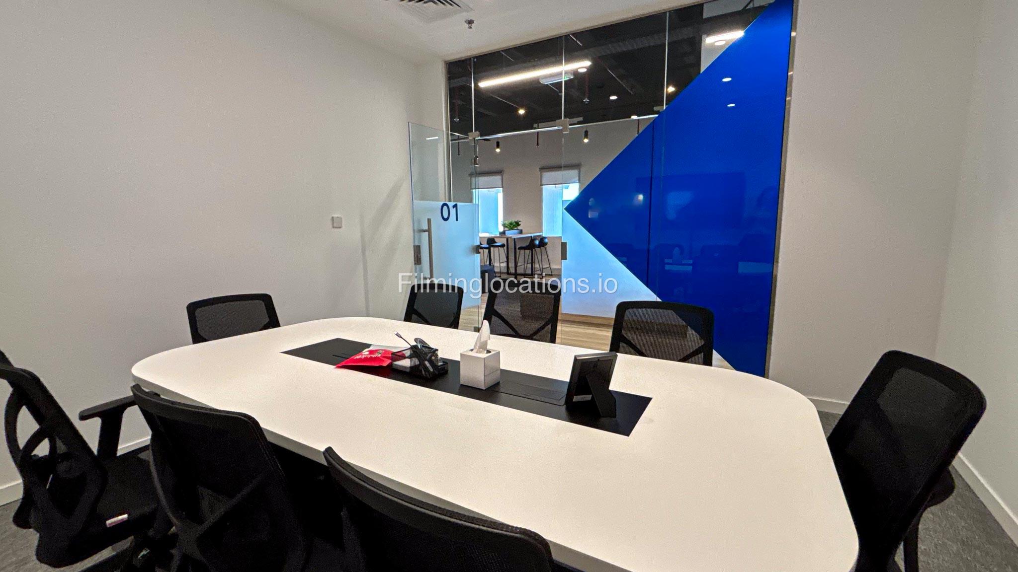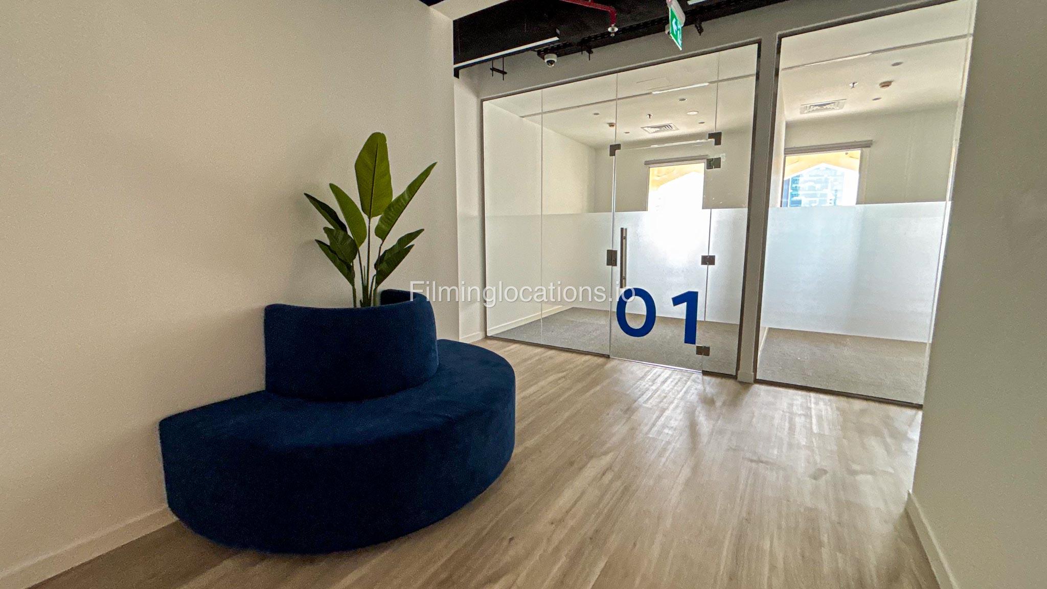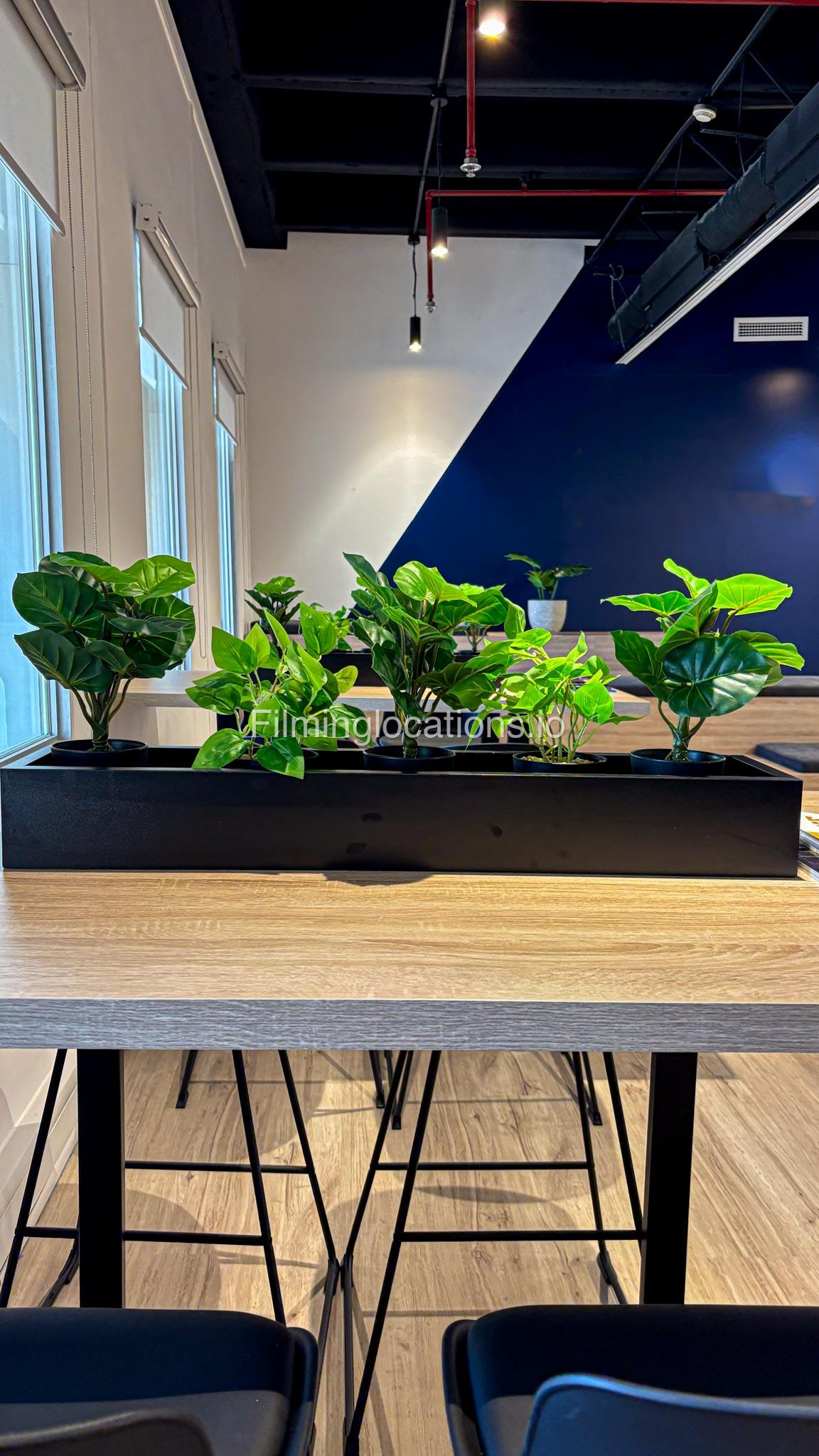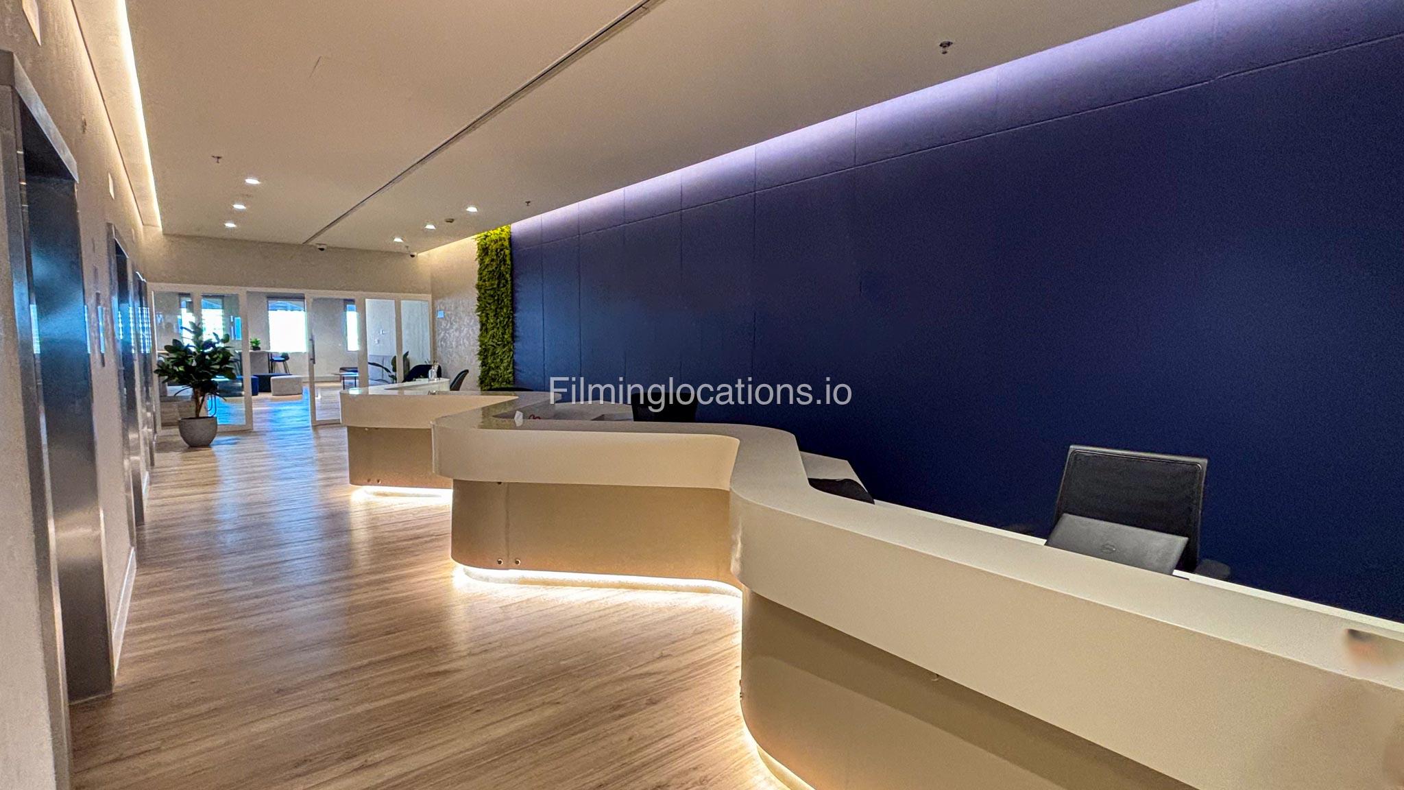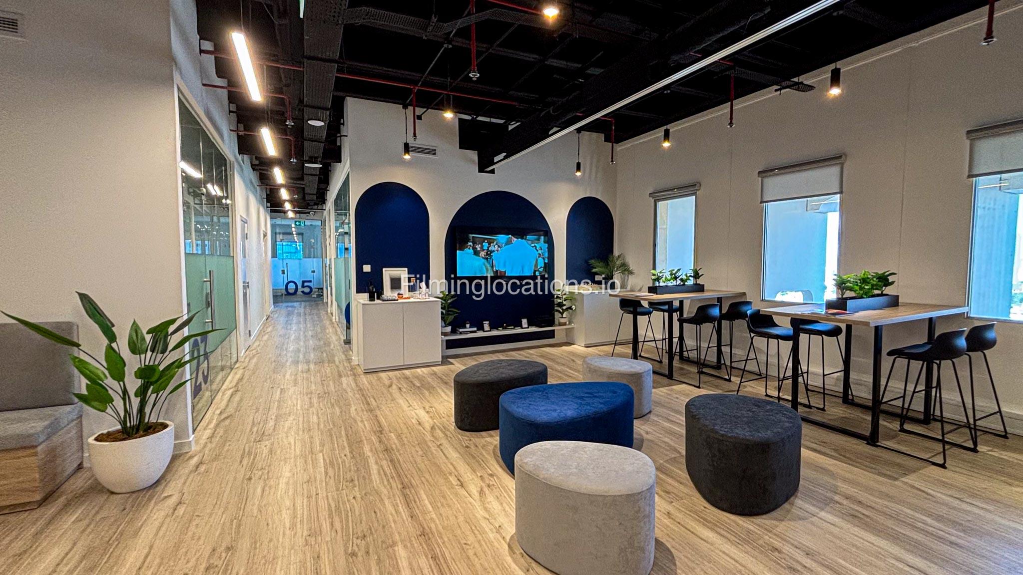 Our stylish co-working space offers a modern backdrop with a unique curved entrance and lush plant wall. Inside, the blue, grey, and white-themed workspace features plant-decorated tables, functional meeting rooms, an open-layout area, and a well-designed pantry. Additional highlights include an internal golf space, a skyline-view meeting room, and a flexible empty room. Perfect for commercials, interviews, and creative productions, this versatile location blends style and functionality for any shoot.