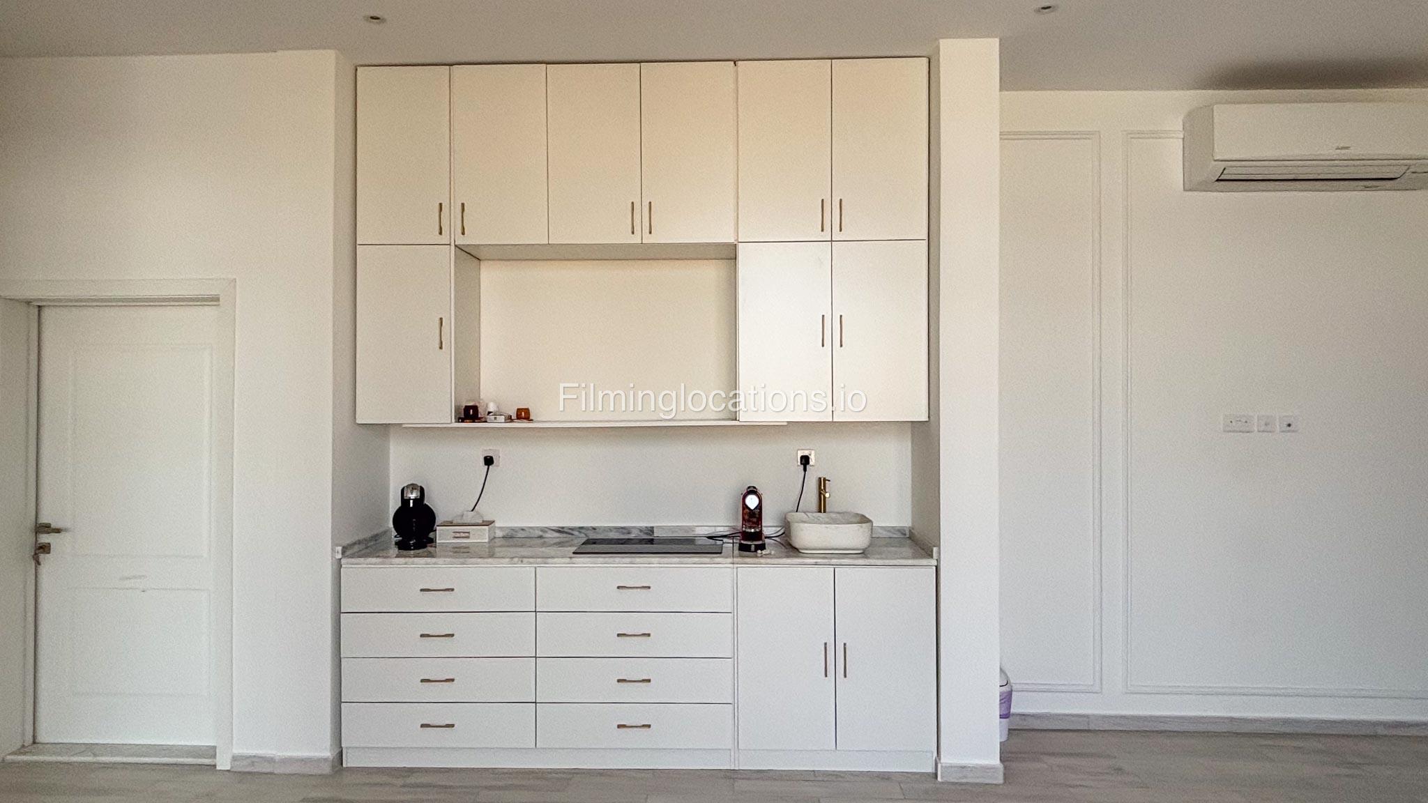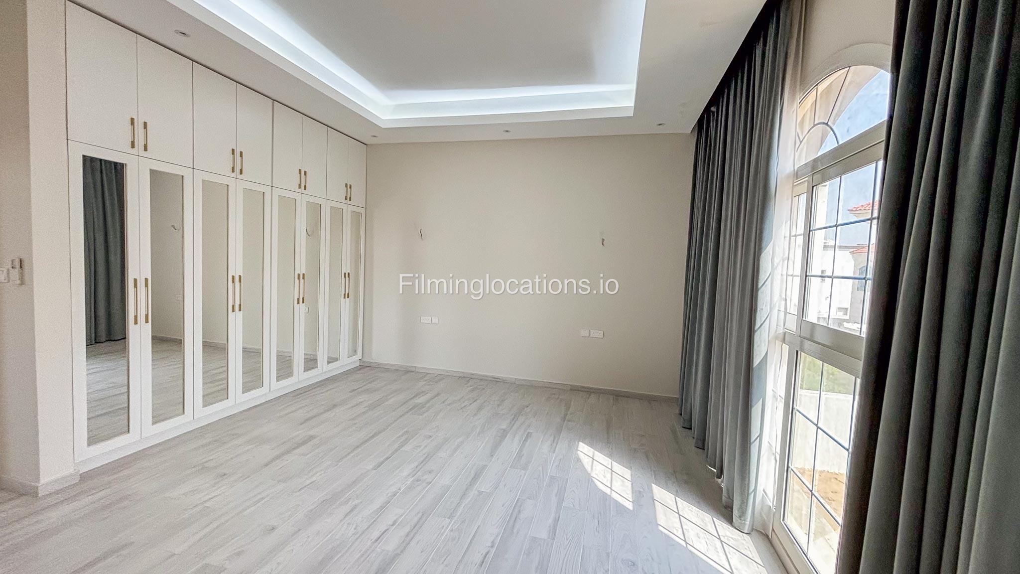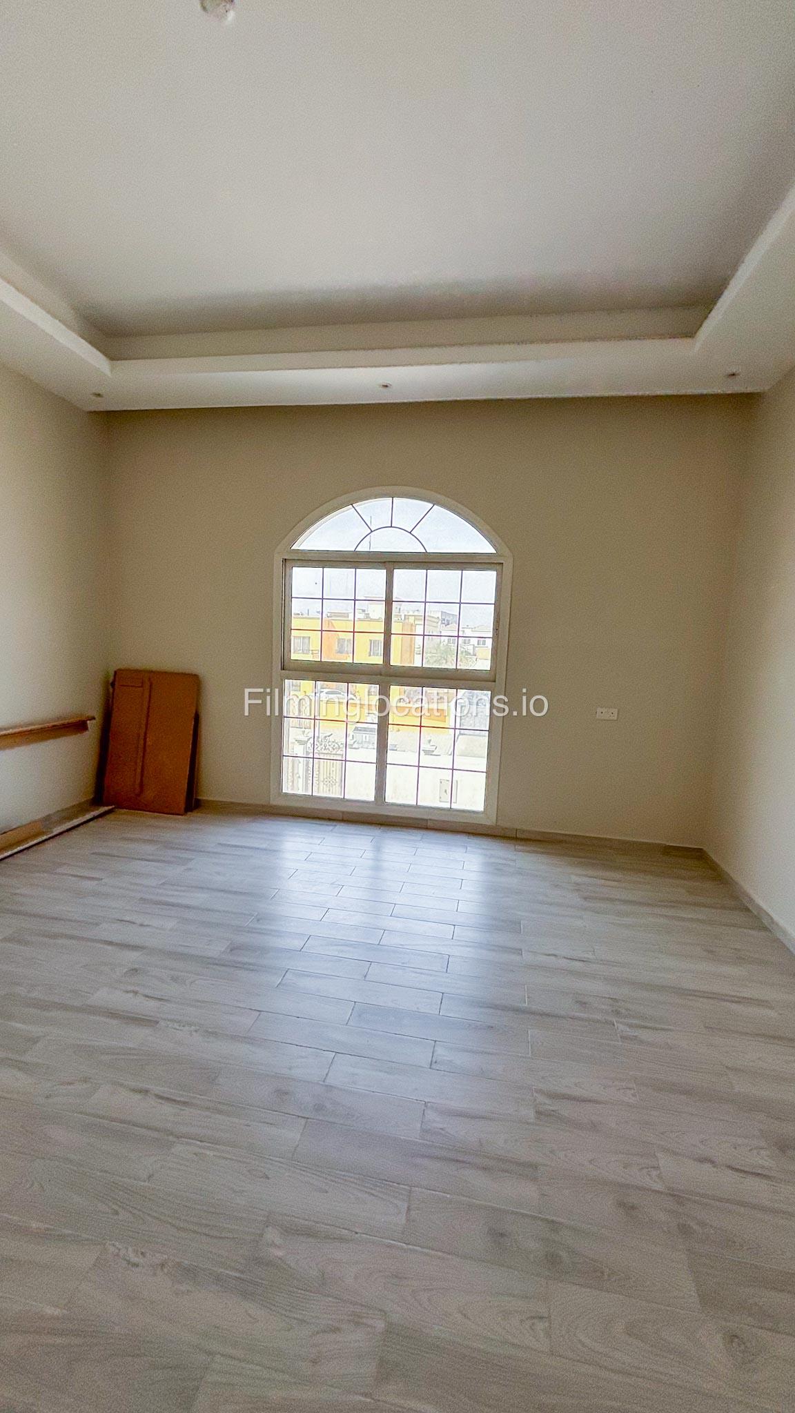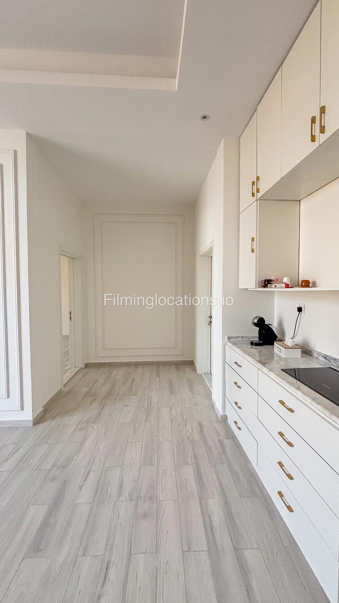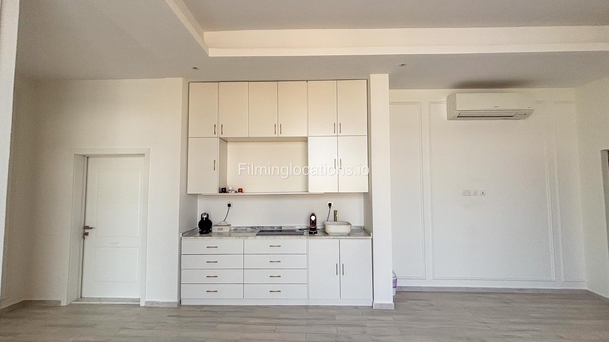 Our villa has 4 bedrooms—2 of them are empty on the 1st floor, offering flexibility for set design. This floor also features a small white open kitchen. The house is designed with French walls, adding a distinctive and elegant aesthetic.