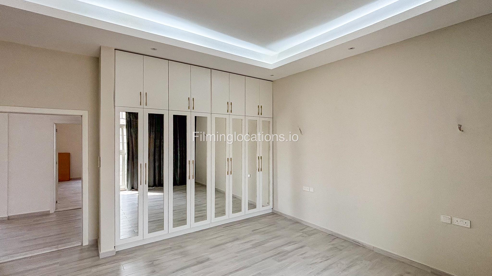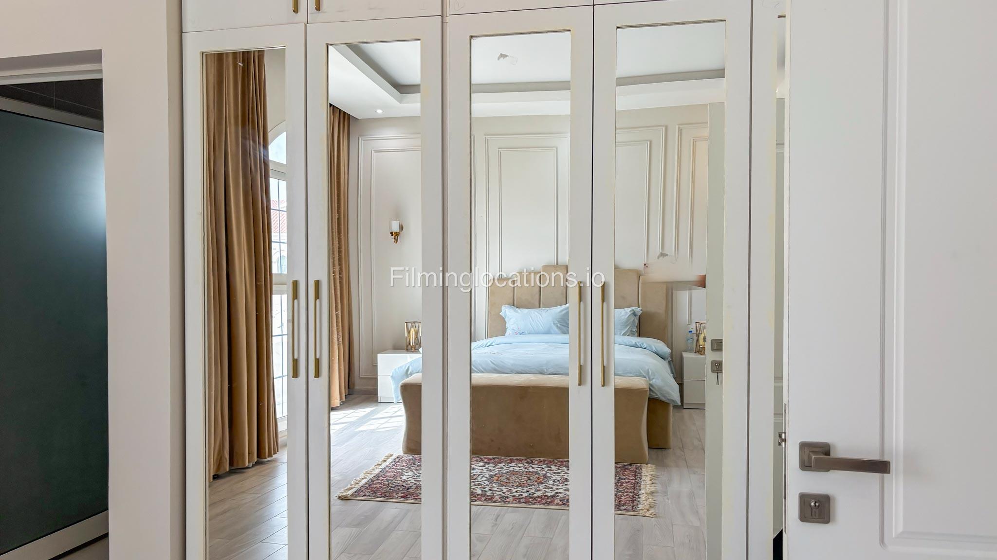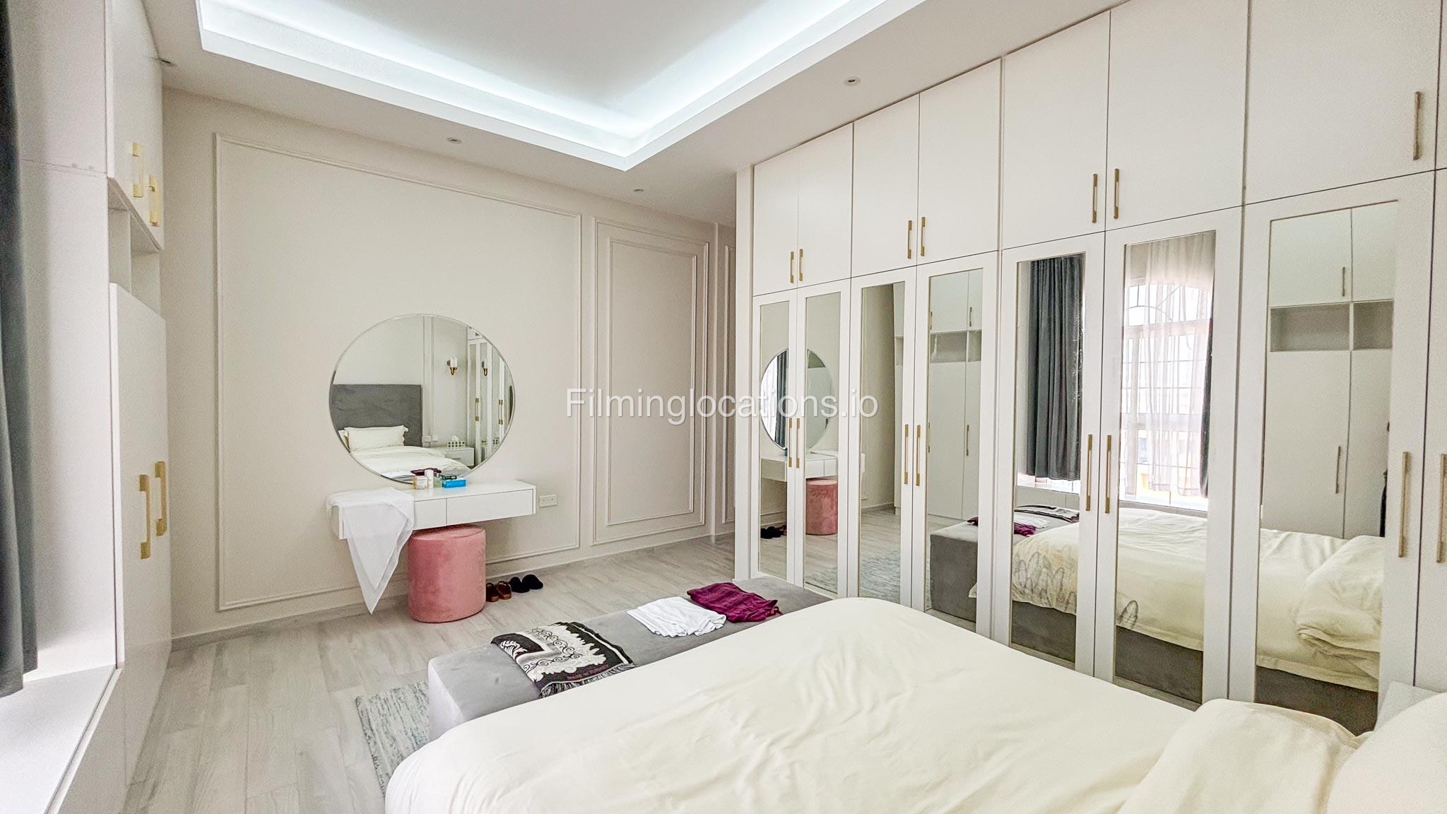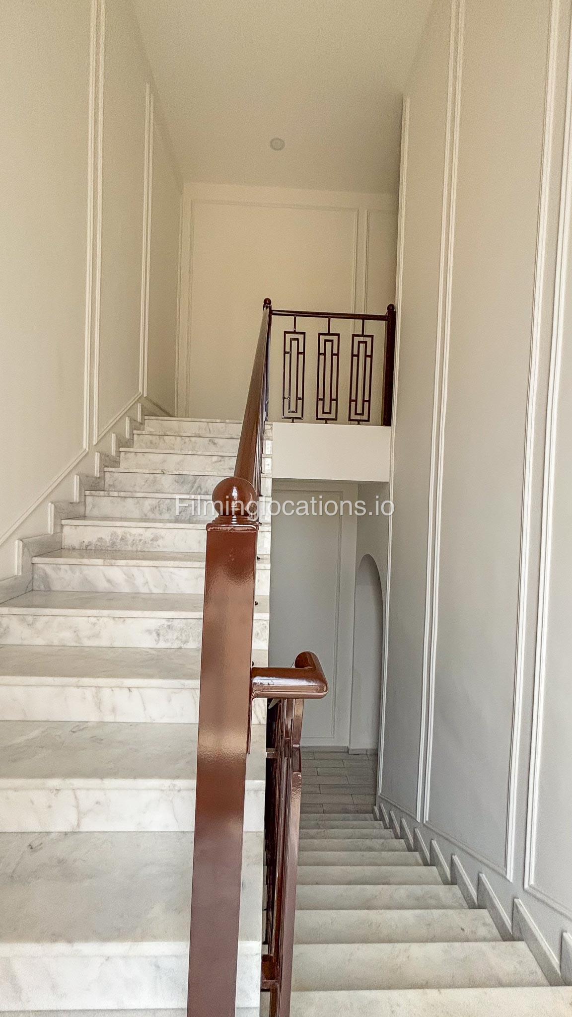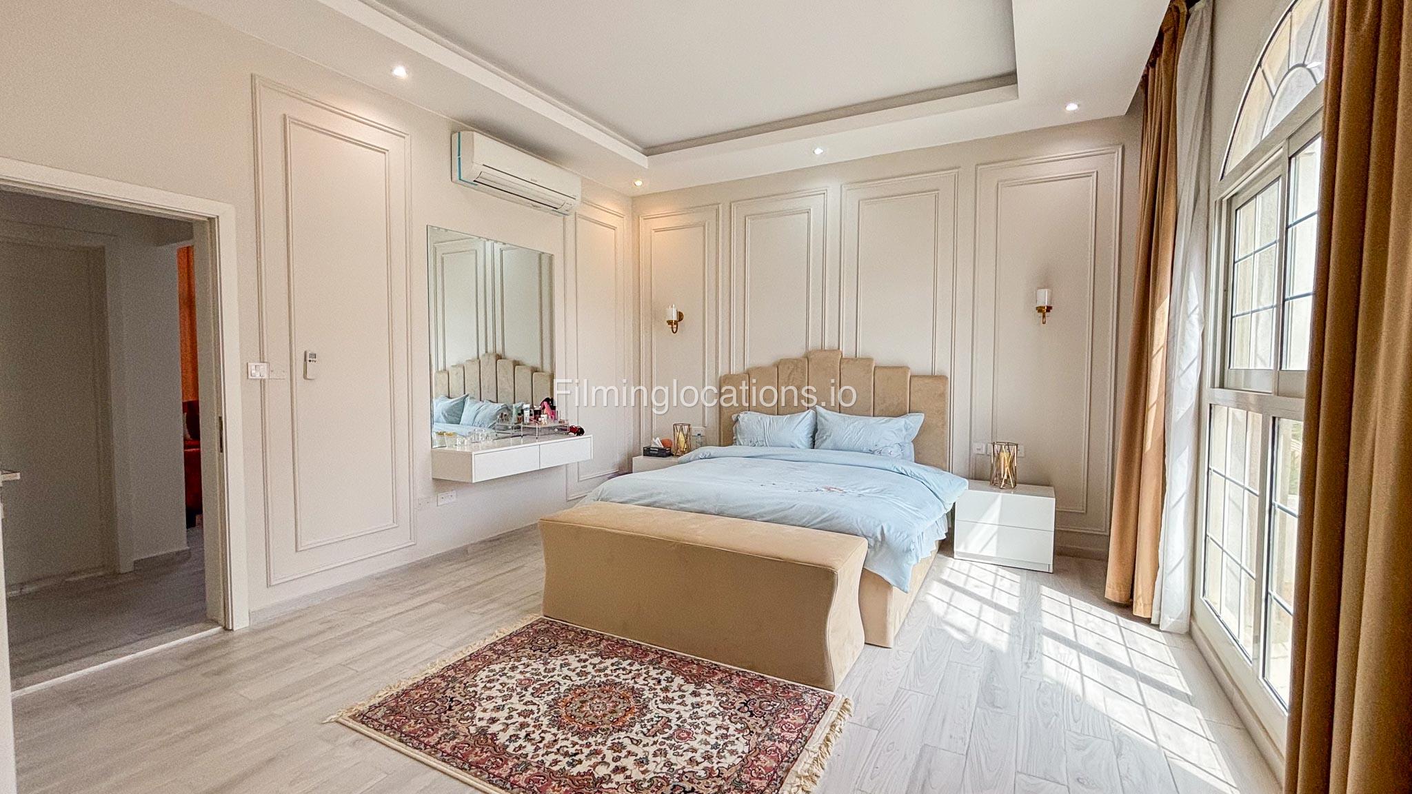 Our villa has 4 bedrooms—2 of them are empty on the 1st floor, offering flexibility for set design. This floor also features a small white open kitchen. The house is designed with French walls, adding a distinctive and elegant aesthetic.