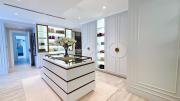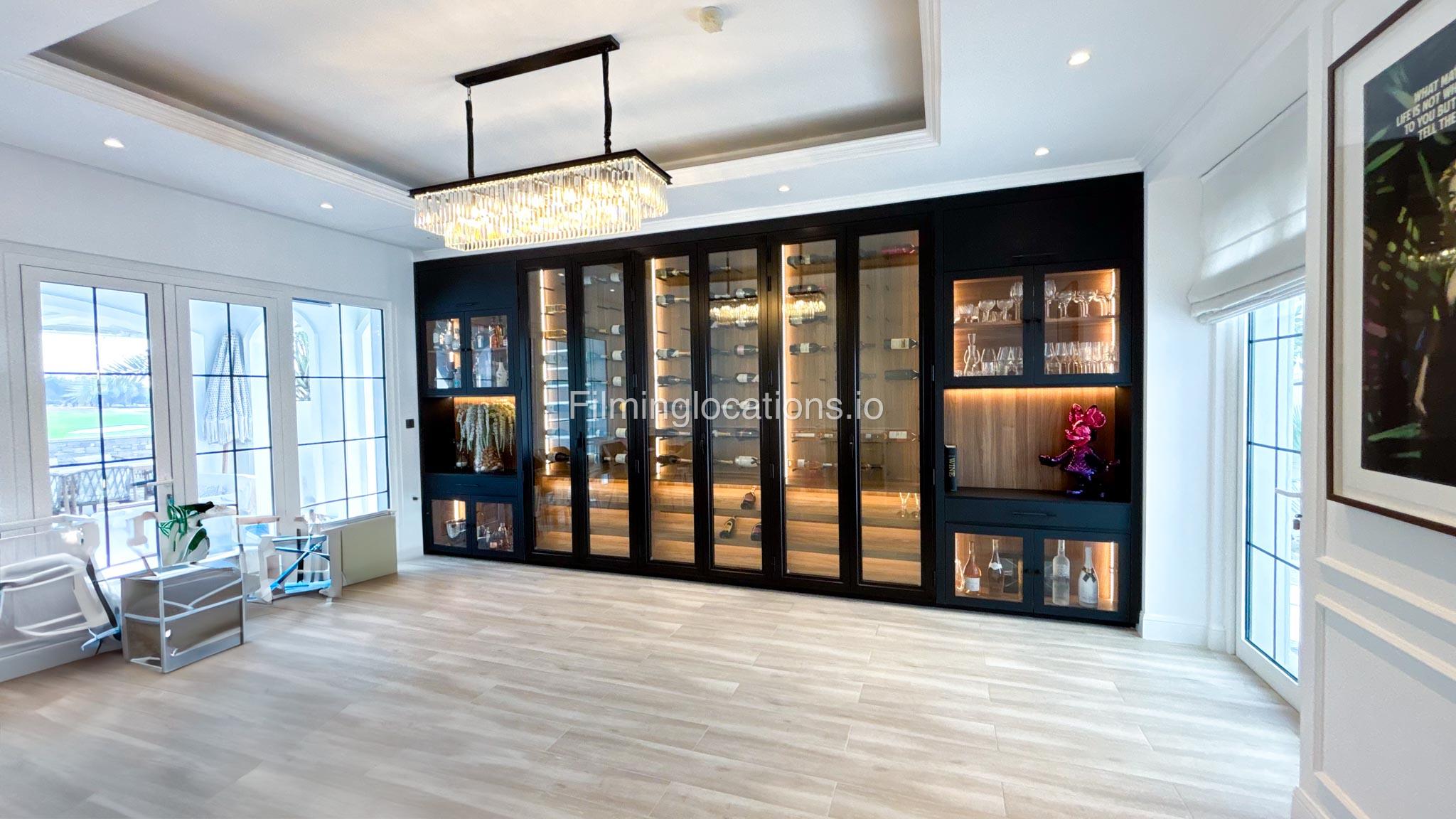 On the ground floor, there is a large open living area with a hidden TV, an open kitchen with a kitchen island, an office space, and a dining area featuring a glass wine display perfect for showcasing wine collections.