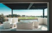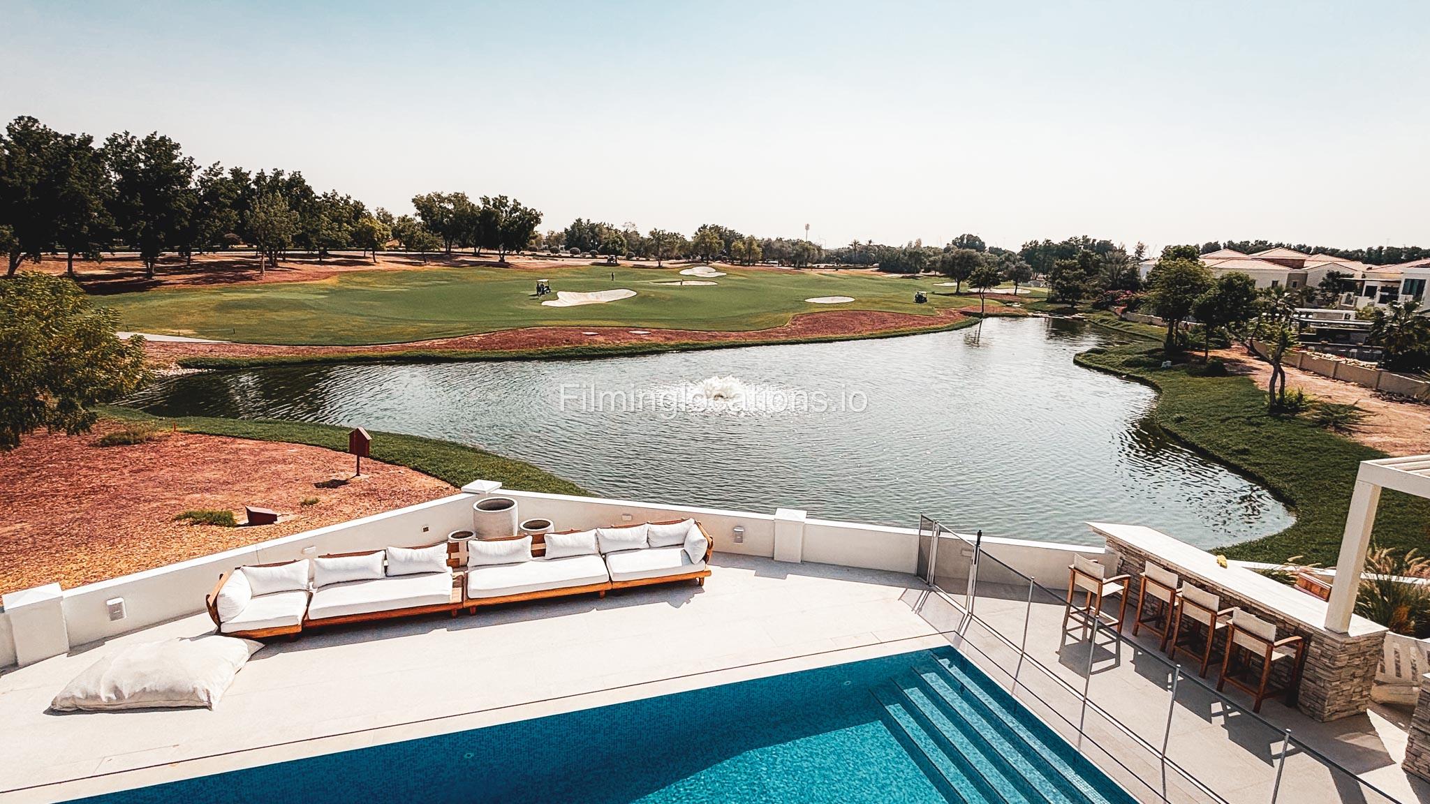 The outdoor area features a BBQ lounge, a stunning pool overlooking the golf course, and a guest house, which is ideal for crew accommodation or a basecamp setup.