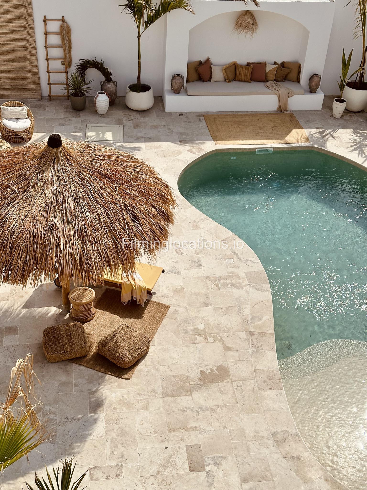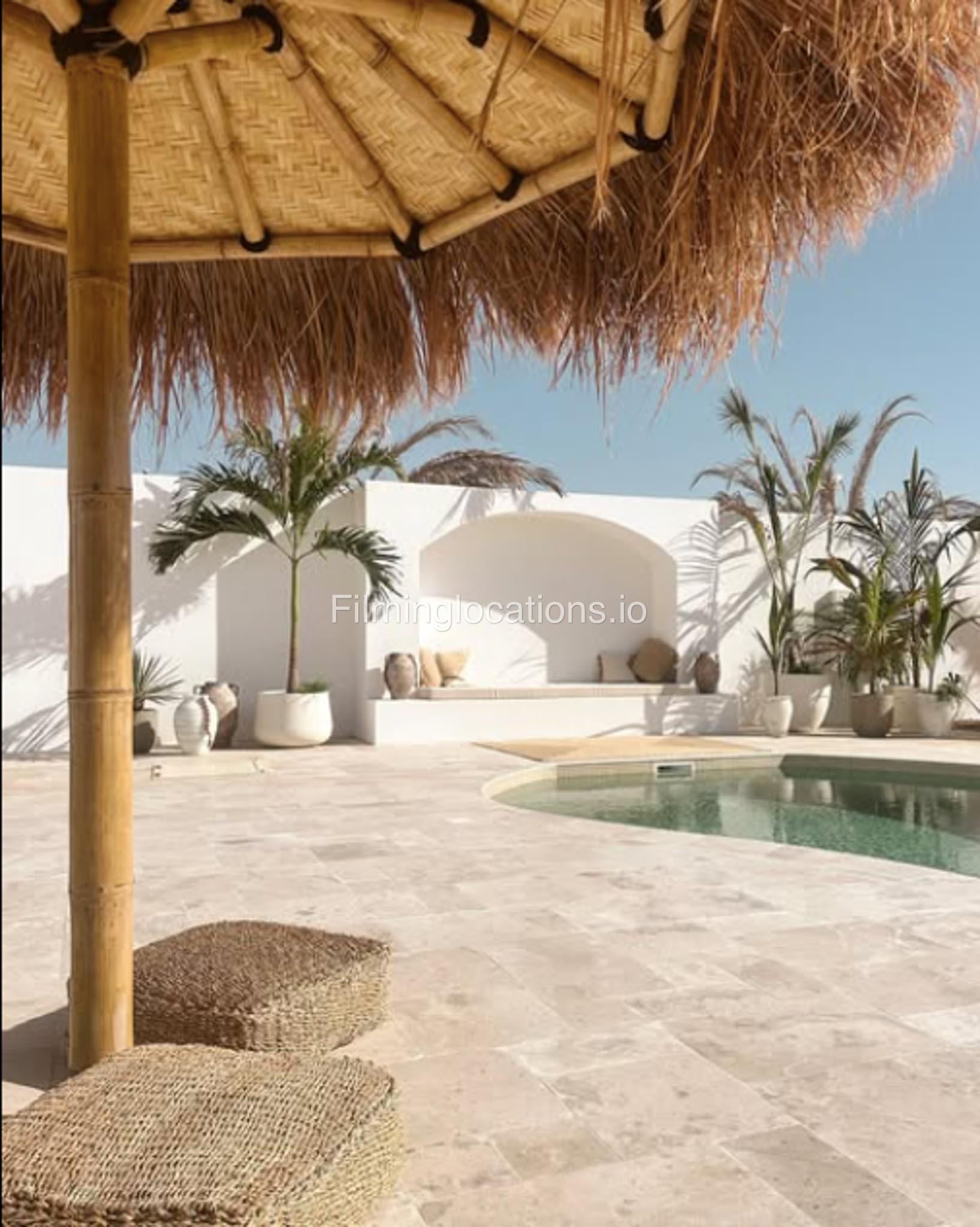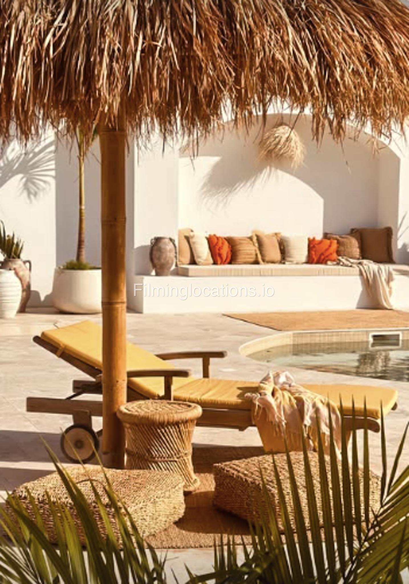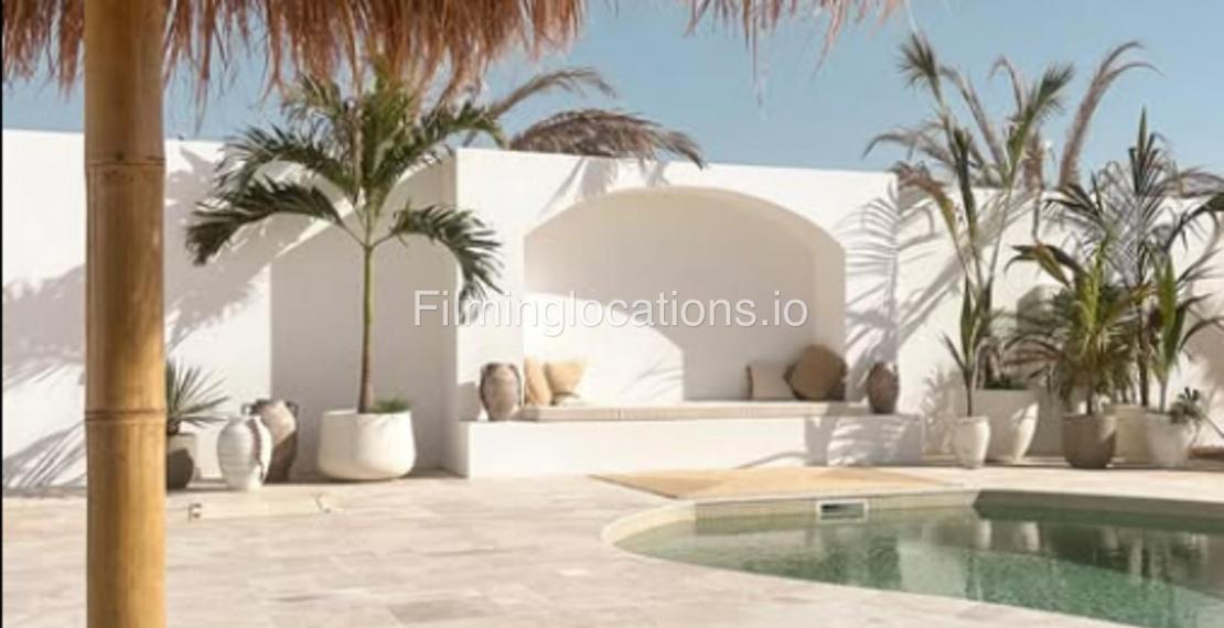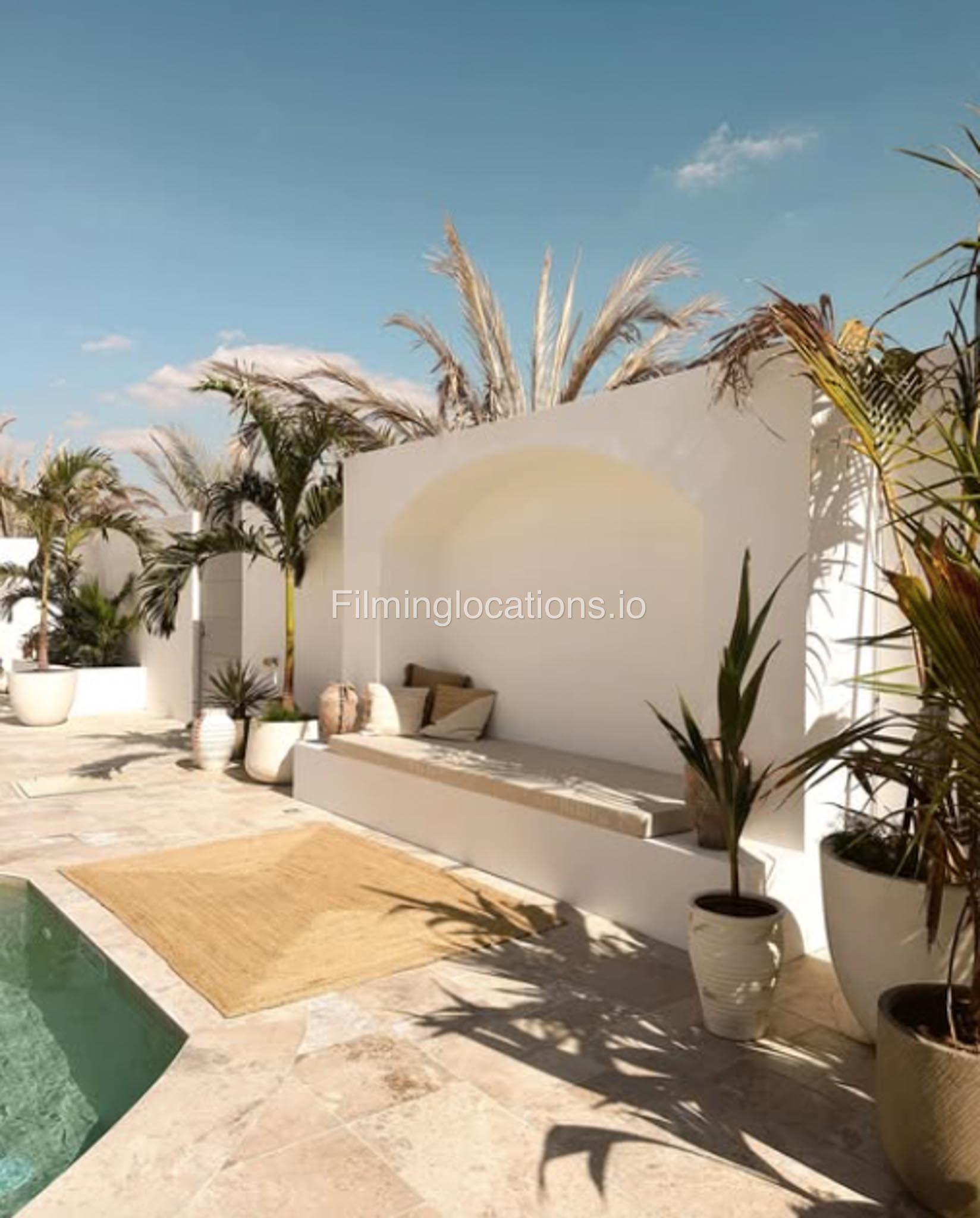 Our space features stunning white arched architecture, a vibrant turquoise pool, and Bohemian-style sun-beds, Bali-Inspired Lounge creating a dreamy outdoor setting. Multiple seating areas with colorful cushions and lush potted plants enhance the aesthetic, blending modern minimalism with a tropical touch. It also includes 1 room with a makeup table, a grand mirror, a private toilet with a sink, and 2 additional sinks outside, ensuring convenience for productions. This visually striking space is designed for seamless filming and breathtaking shots.