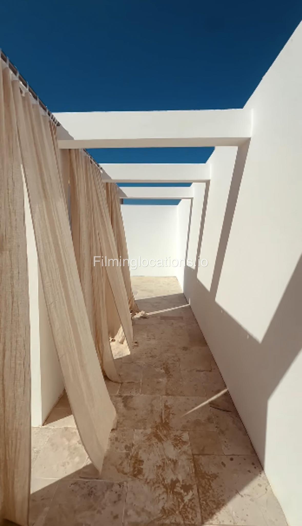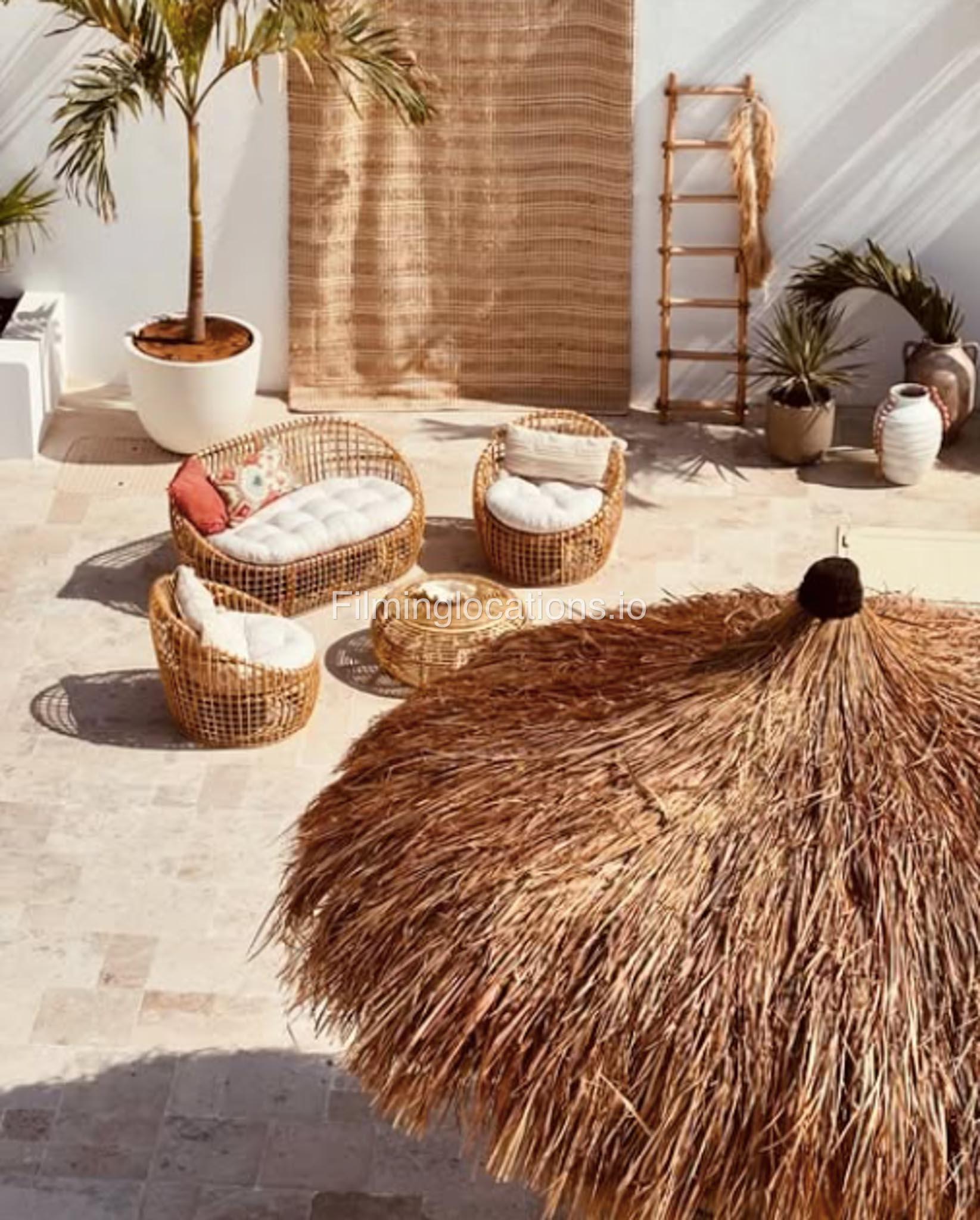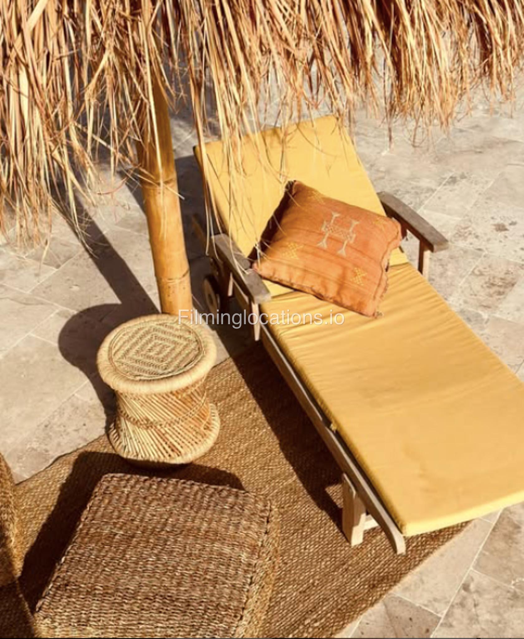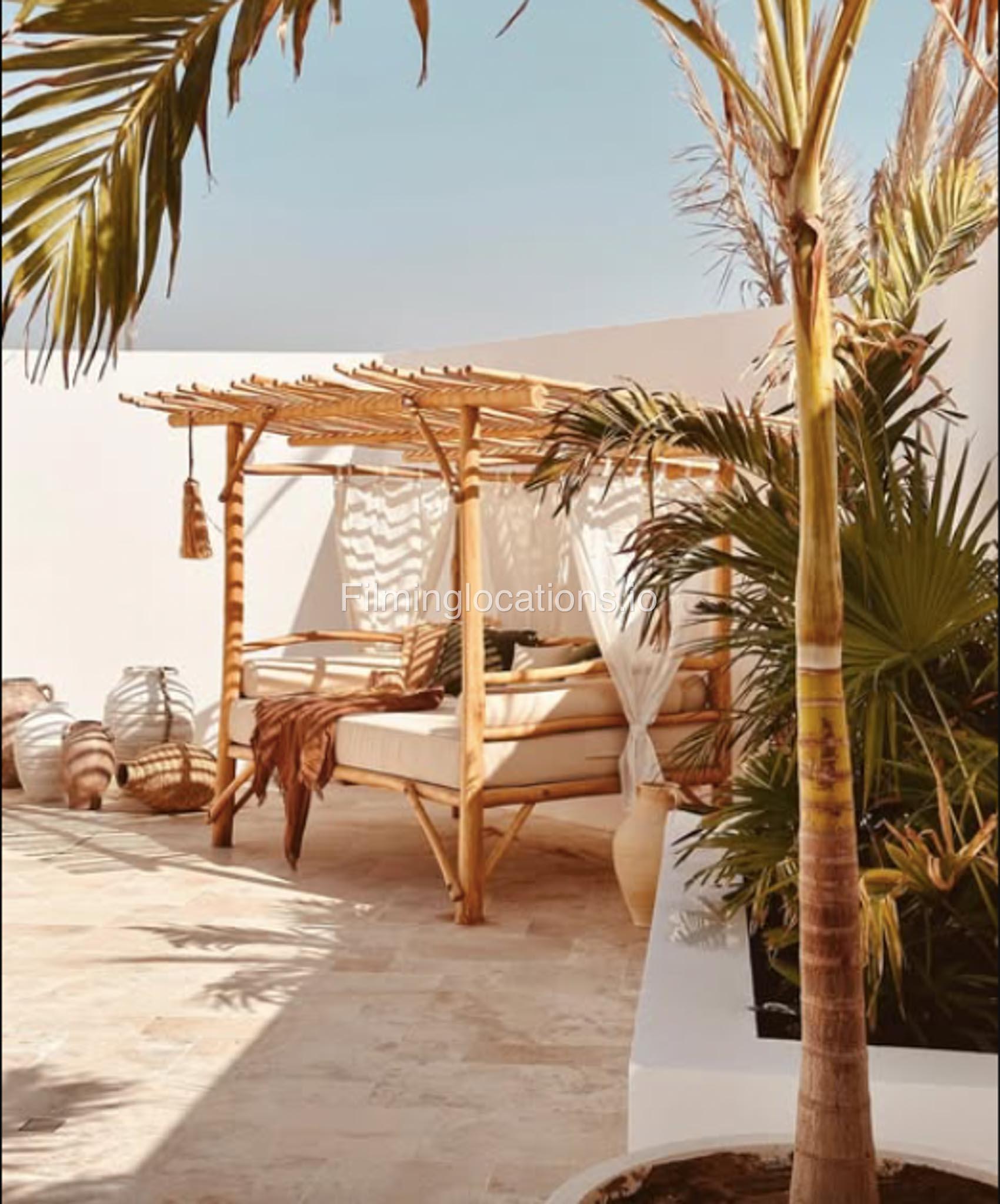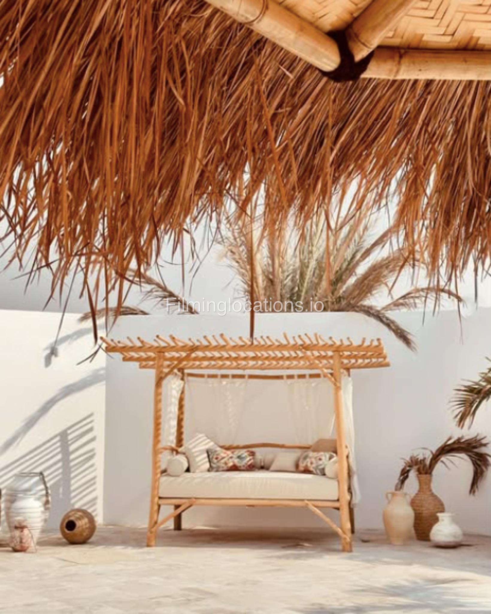 Our space features stunning white arched architecture, a vibrant turquoise pool, and Bohemian-style sun-beds, Bali-Inspired Lounge creating a dreamy outdoor setting. Multiple seating areas with colorful cushions and lush potted plants enhance the aesthetic, blending modern minimalism with a tropical touch. It also includes 1 room with a makeup table, a grand mirror, a private toilet with a sink, and 2 additional sinks outside, ensuring convenience for productions. This visually striking space is designed for seamless filming and breathtaking shots.