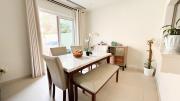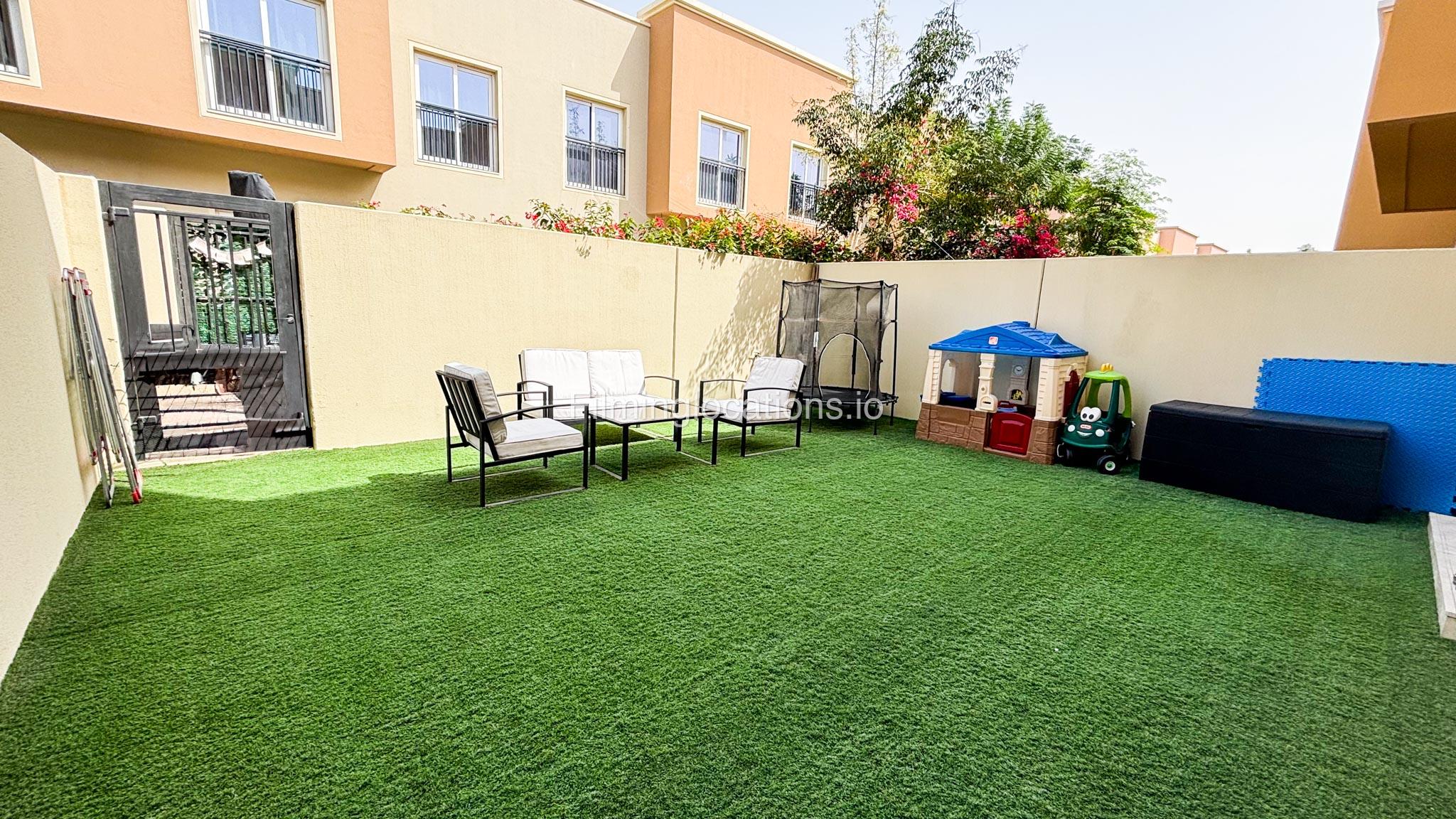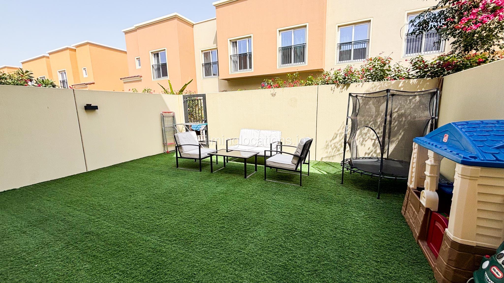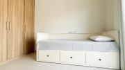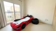 Our Villa features a beautiful garden with a cozy seating area and a small kids' playhouse in the corner with plenty of children's toys and accessories. Inside, you'll find a living room with a TV and seating area, an adjoining dining room, and a fully equipped half-open kitchen with a window opening towards the living room. The staircase leads to 3 bedrooms: a kids' room with a racecar-bed and window walls, a master bedroom with an attached bathroom, a window and a small walk-in closet. There are 2 bathrooms, 1 with a bathtub. Outside, there is a garage that offers 4 parking spots.