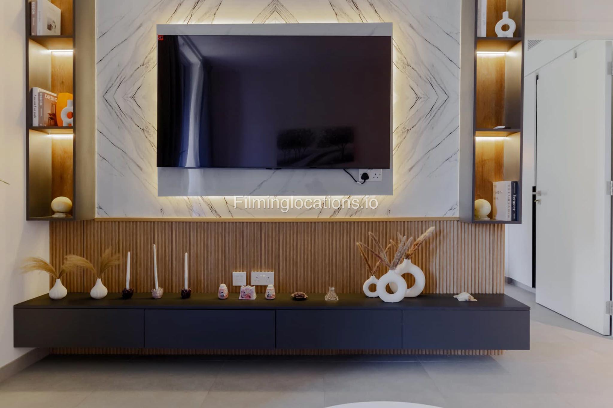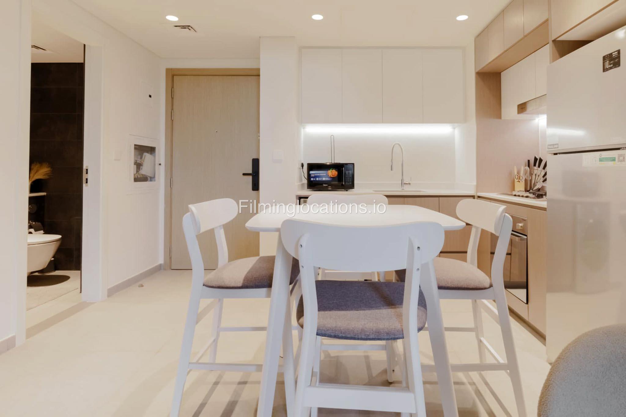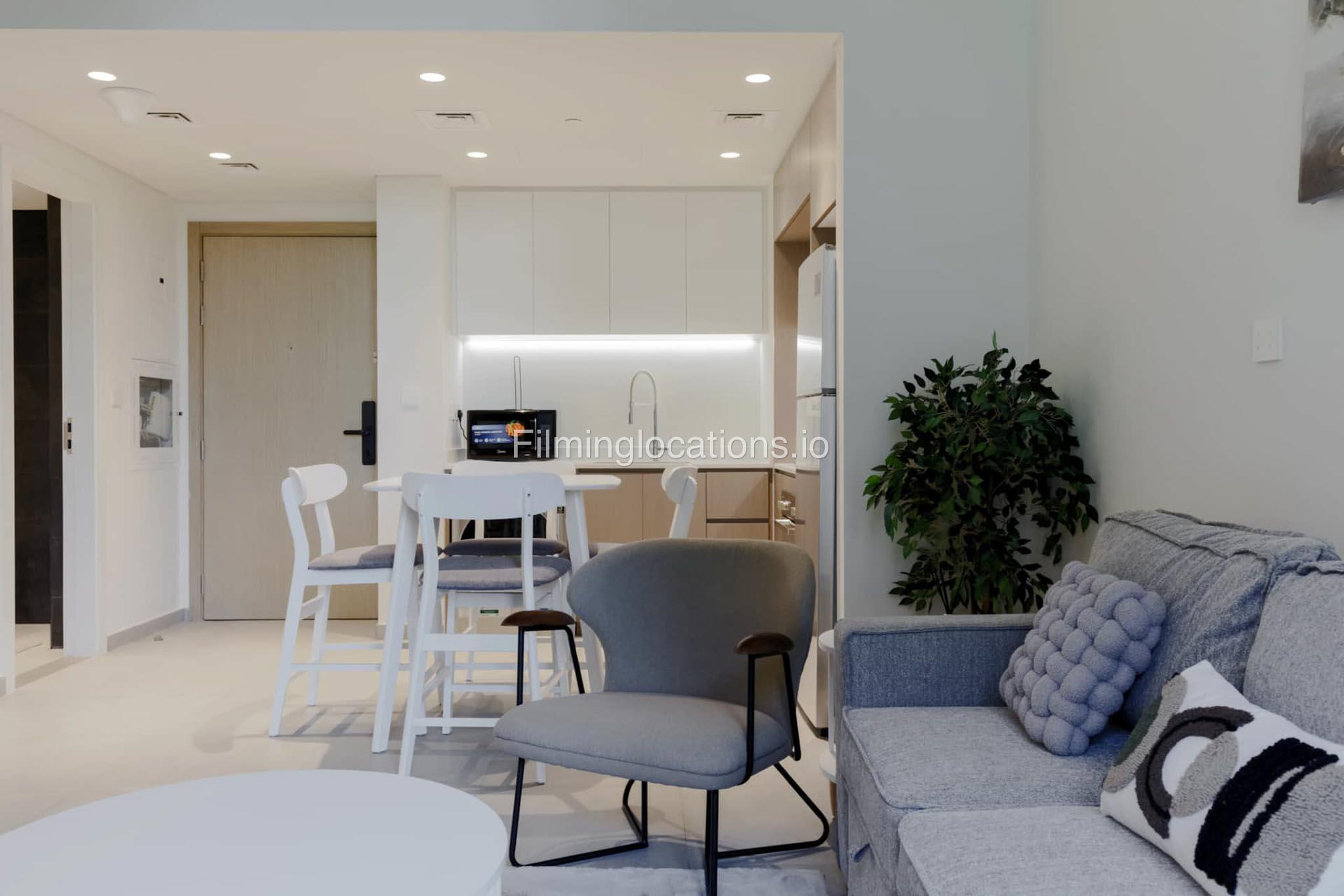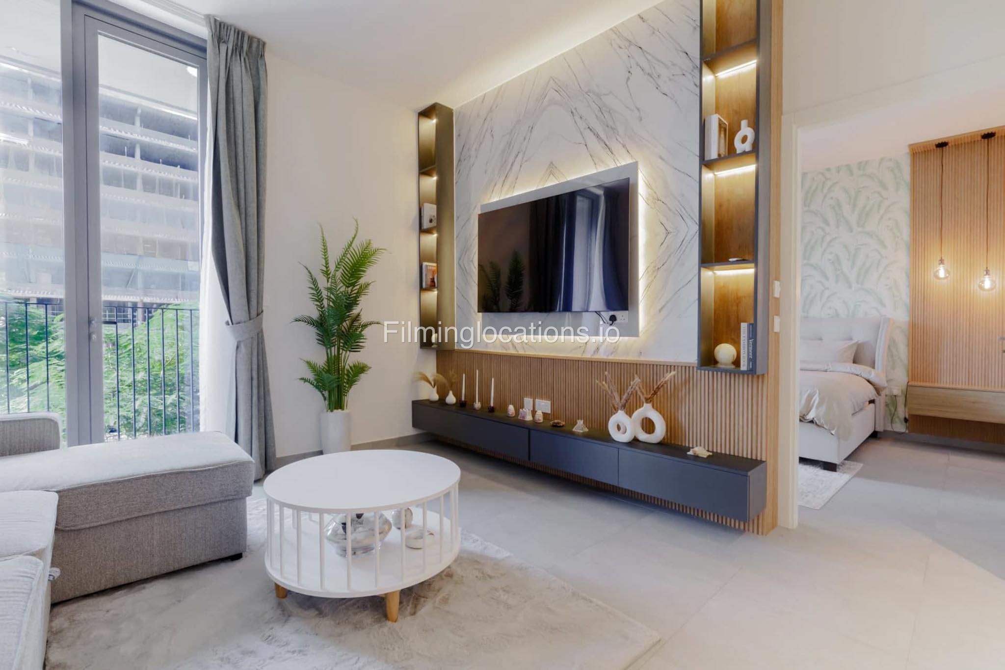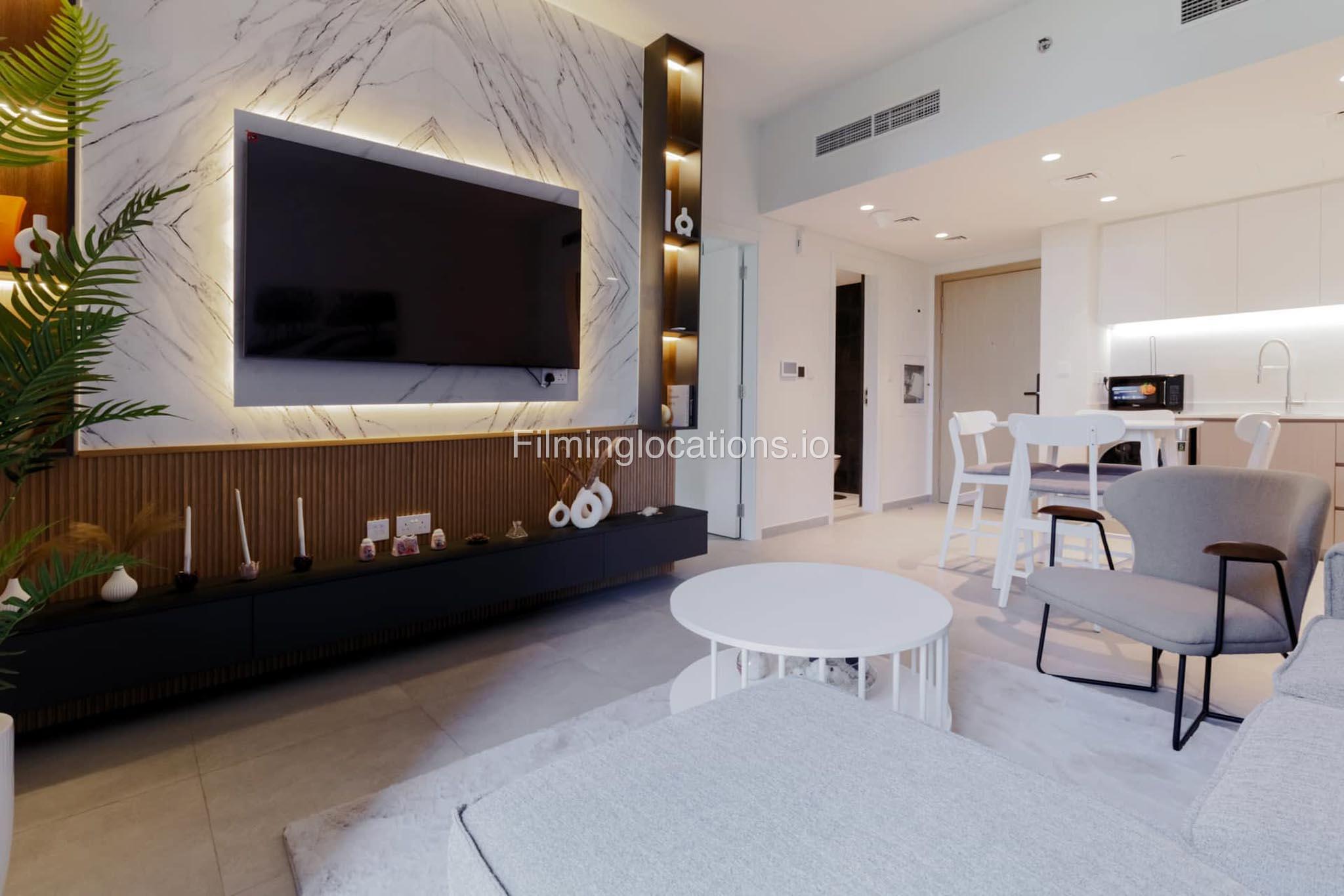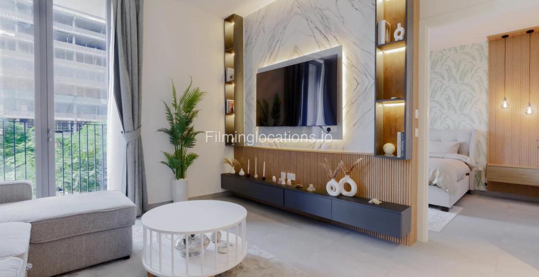 Our stunning luxury apartment offers a sleek living room with a stylish TV setup, elegant wooden interiors, and contemporary décor. The chic seating area seamlessly connects to an attached balcony, providing a bright and inviting atmosphere. A modern, fully equipped open kitchen complements the space. The apartment features a beautifully designed bedroom, 2 sophisticated bathrooms, and an additional private balcony, making it an ideal setting for filming with a touch of elegance and modern charm.