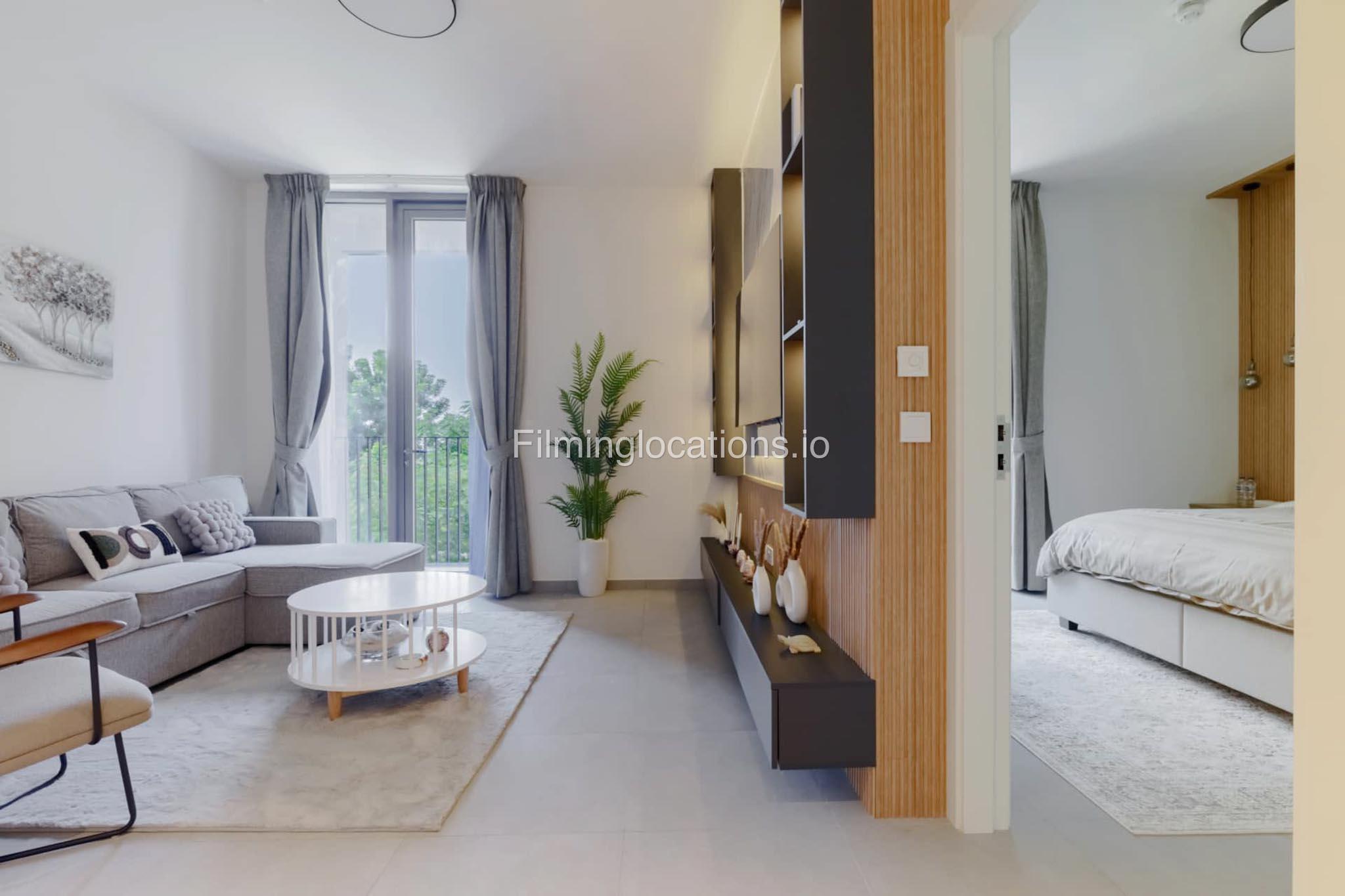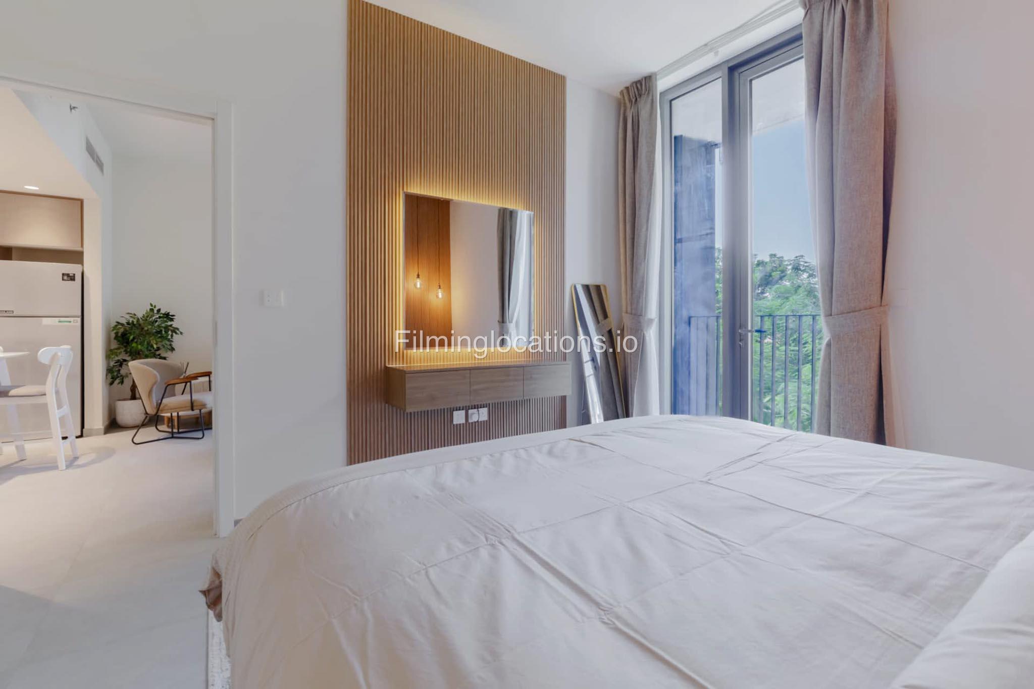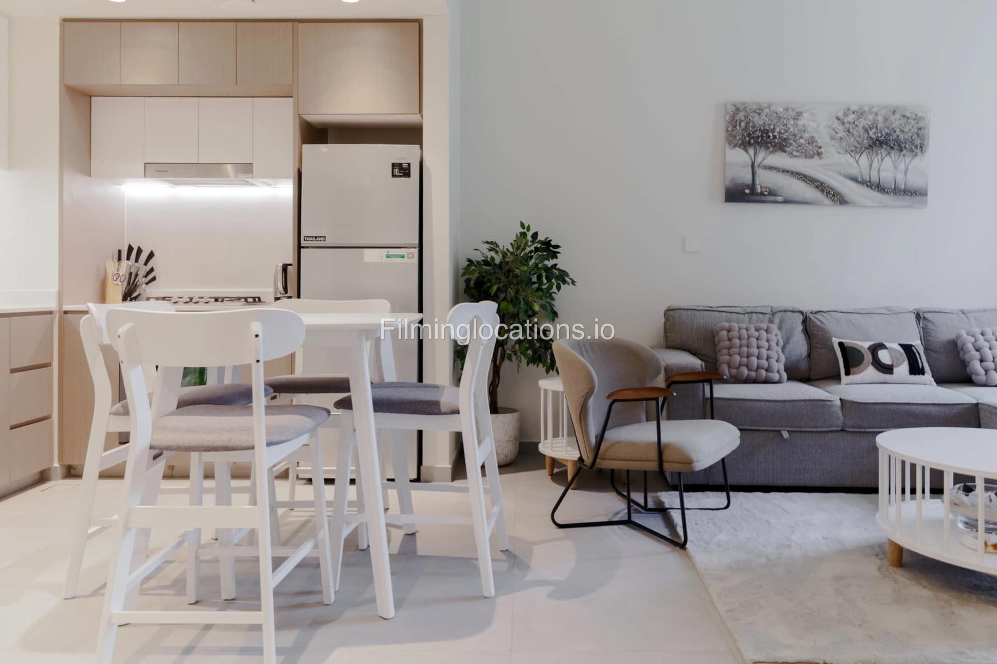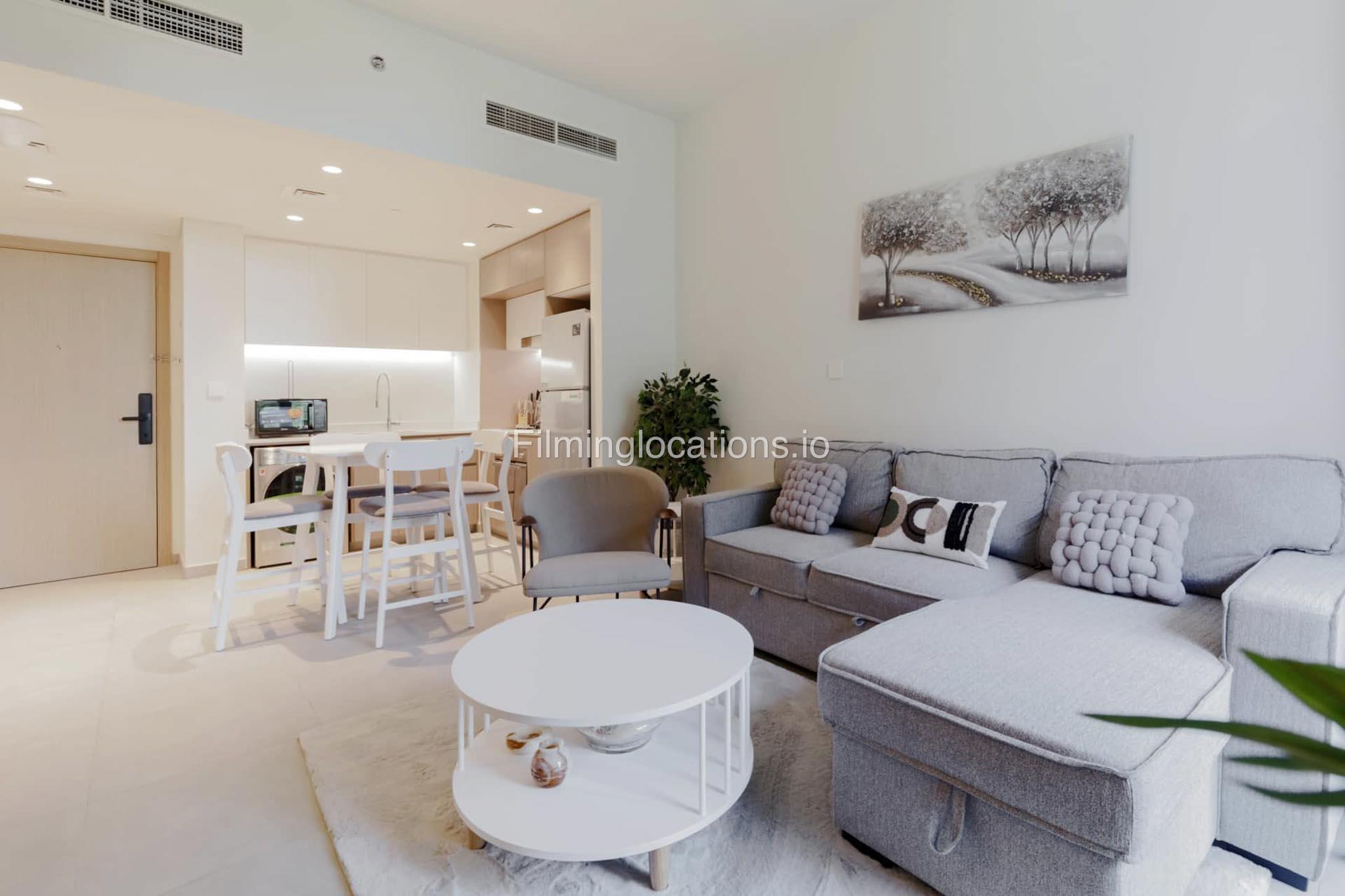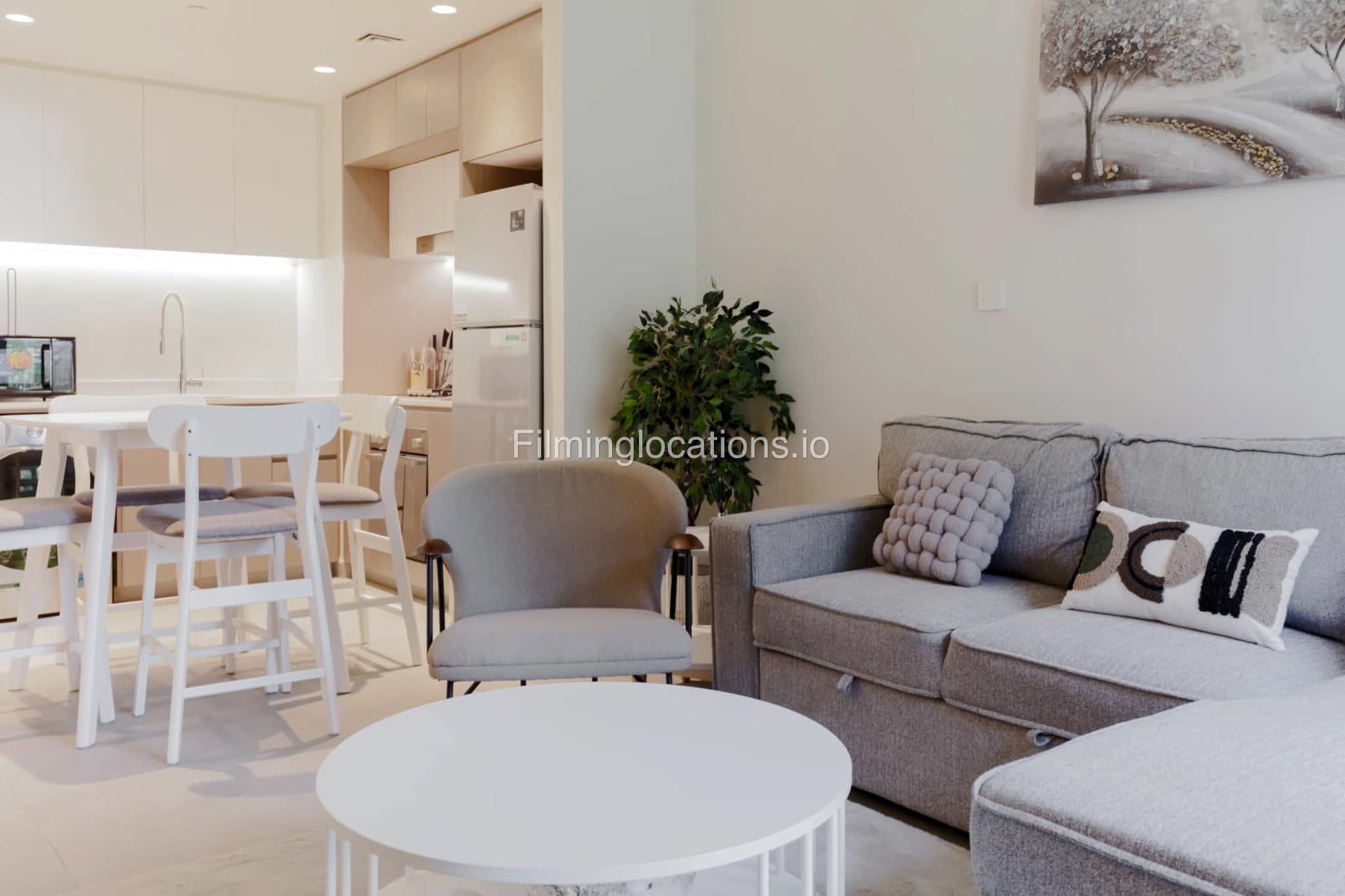 Our stunning luxury apartment offers a sleek living room with a stylish TV setup, elegant wooden interiors, and contemporary décor. The chic seating area seamlessly connects to an attached balcony, providing a bright and inviting atmosphere. A modern, fully equipped open kitchen complements the space. The apartment features a beautifully designed bedroom, 2 sophisticated bathrooms, and an additional private balcony, making it an ideal setting for filming with a touch of elegance and modern charm.
