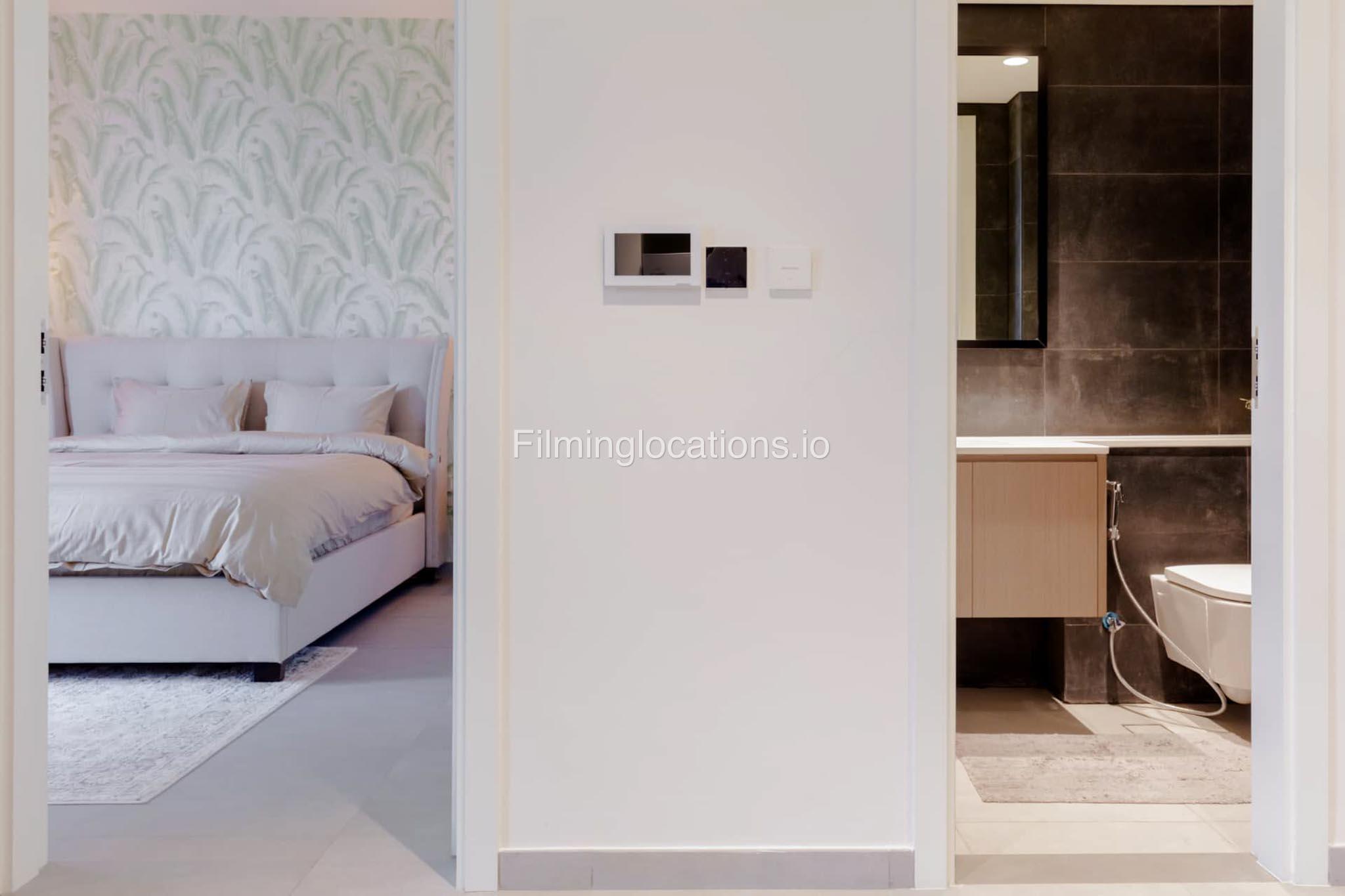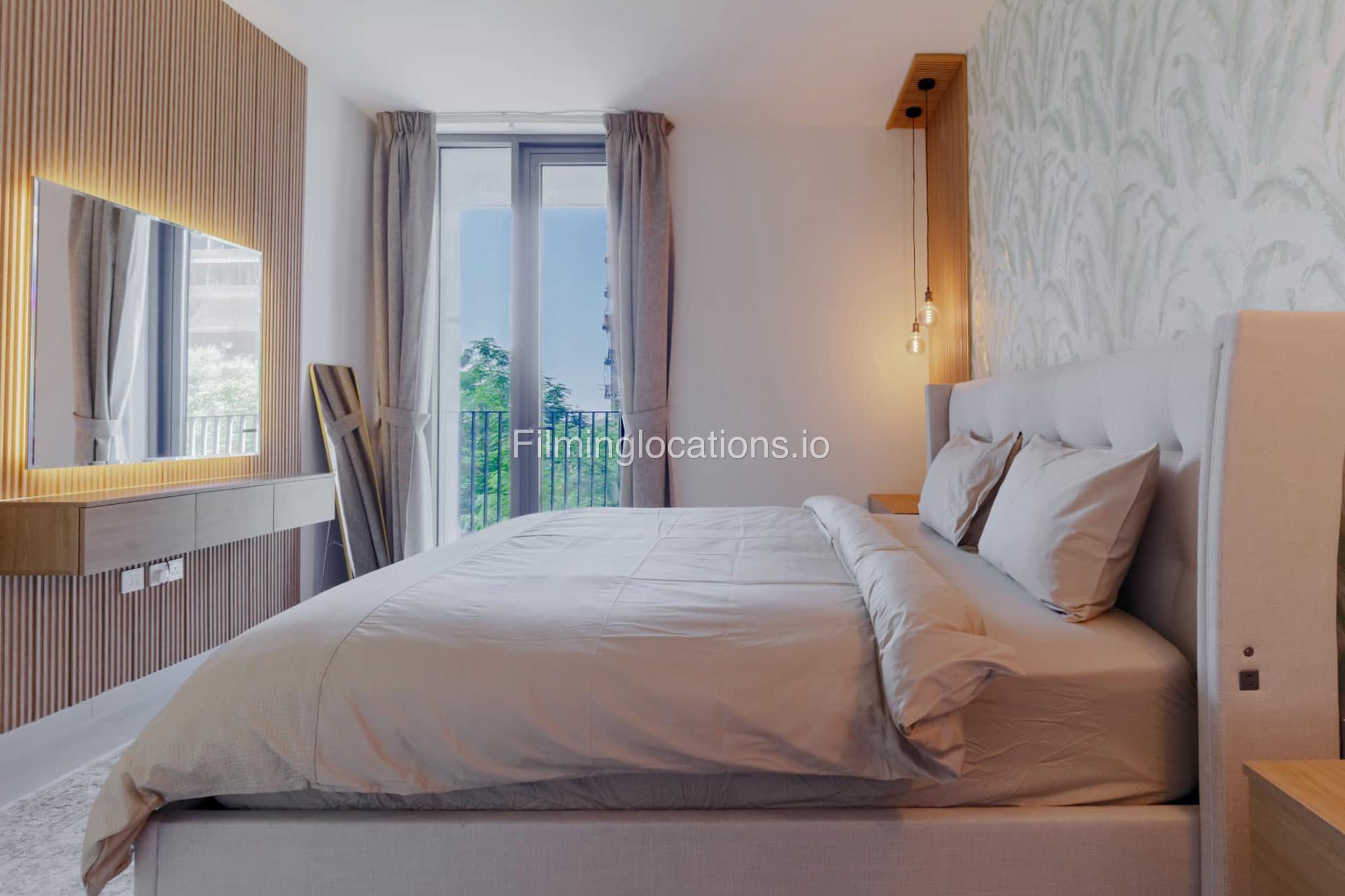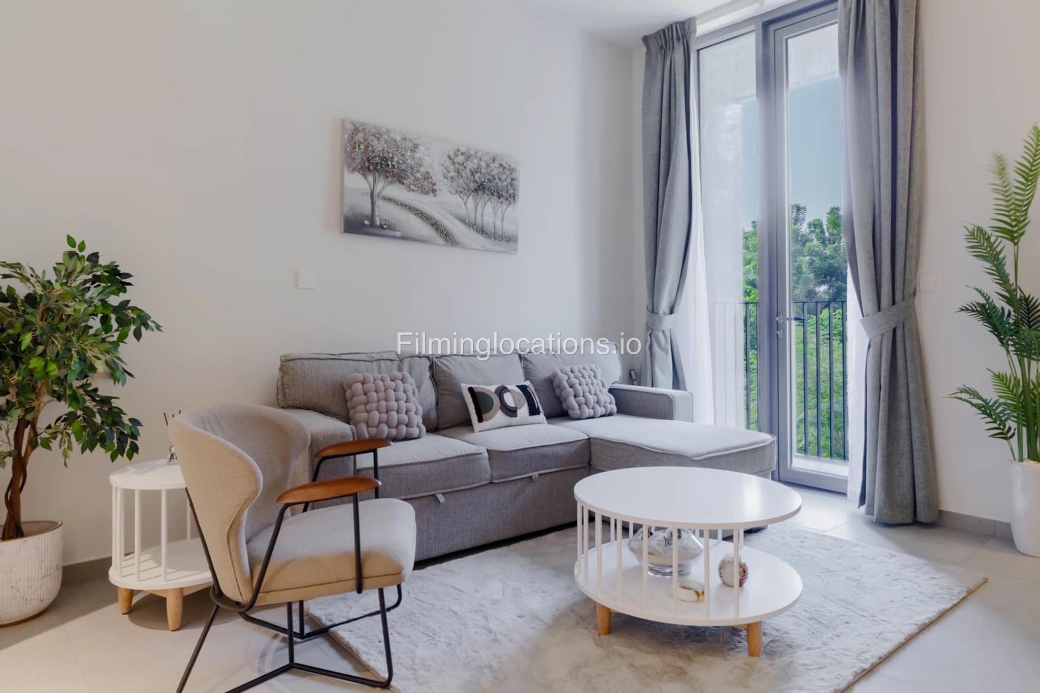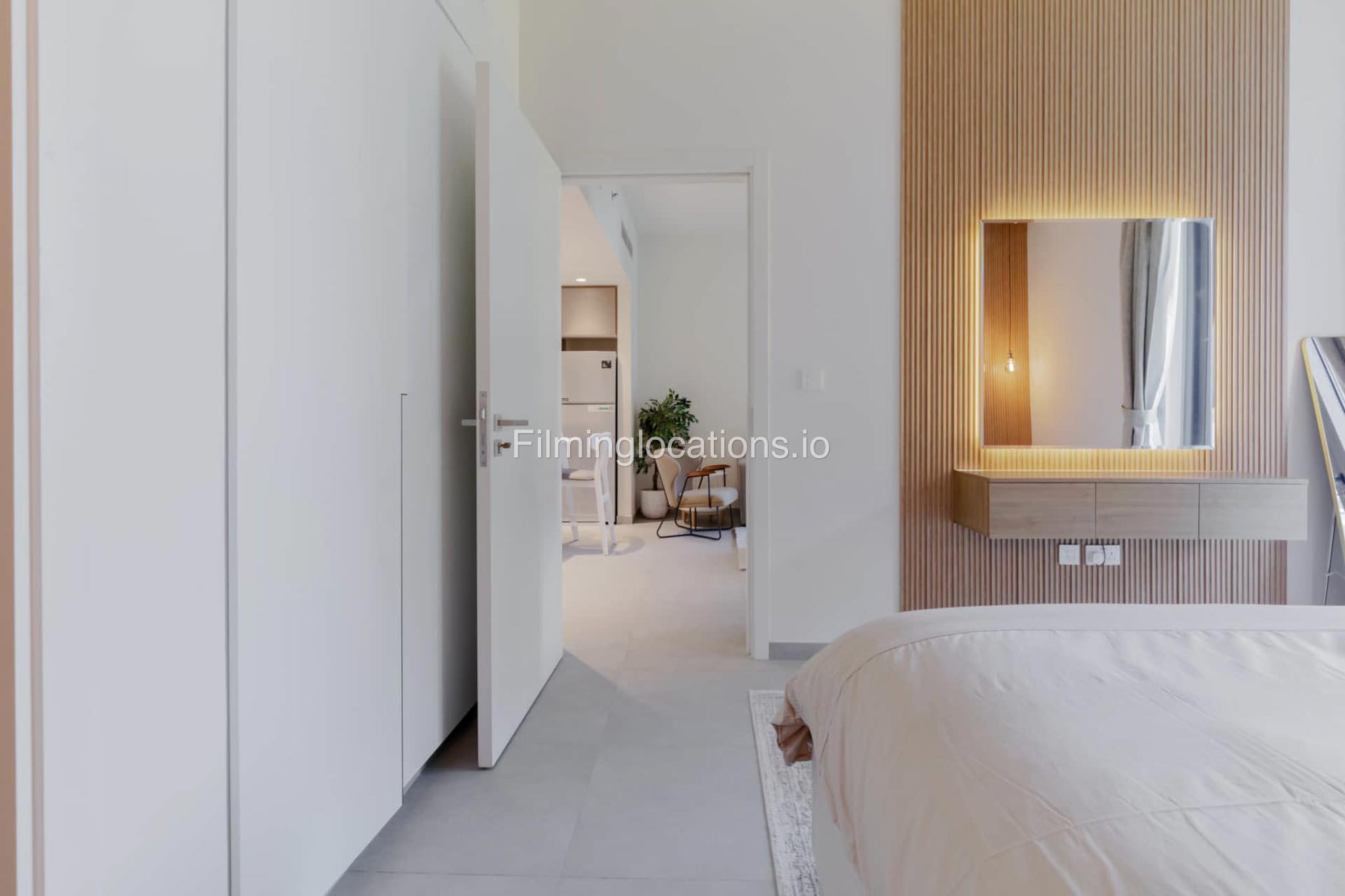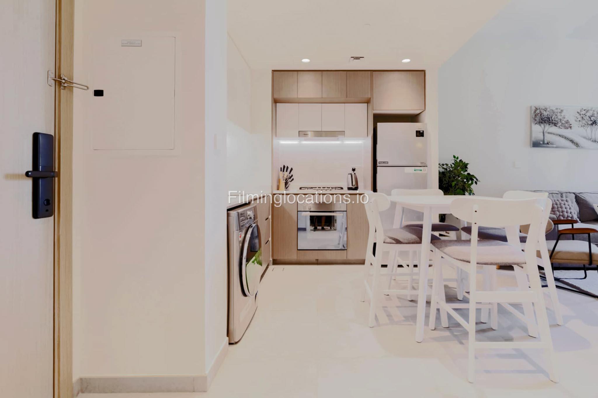 Our stunning luxury apartment offers a sleek living room with a stylish TV setup, elegant wooden interiors, and contemporary décor. The chic seating area seamlessly connects to an attached balcony, providing a bright and inviting atmosphere. A modern, fully equipped open kitchen complements the space. The apartment features a beautifully designed bedroom, 2 sophisticated bathrooms, and an additional private balcony, making it an ideal setting for filming with a touch of elegance and modern charm.