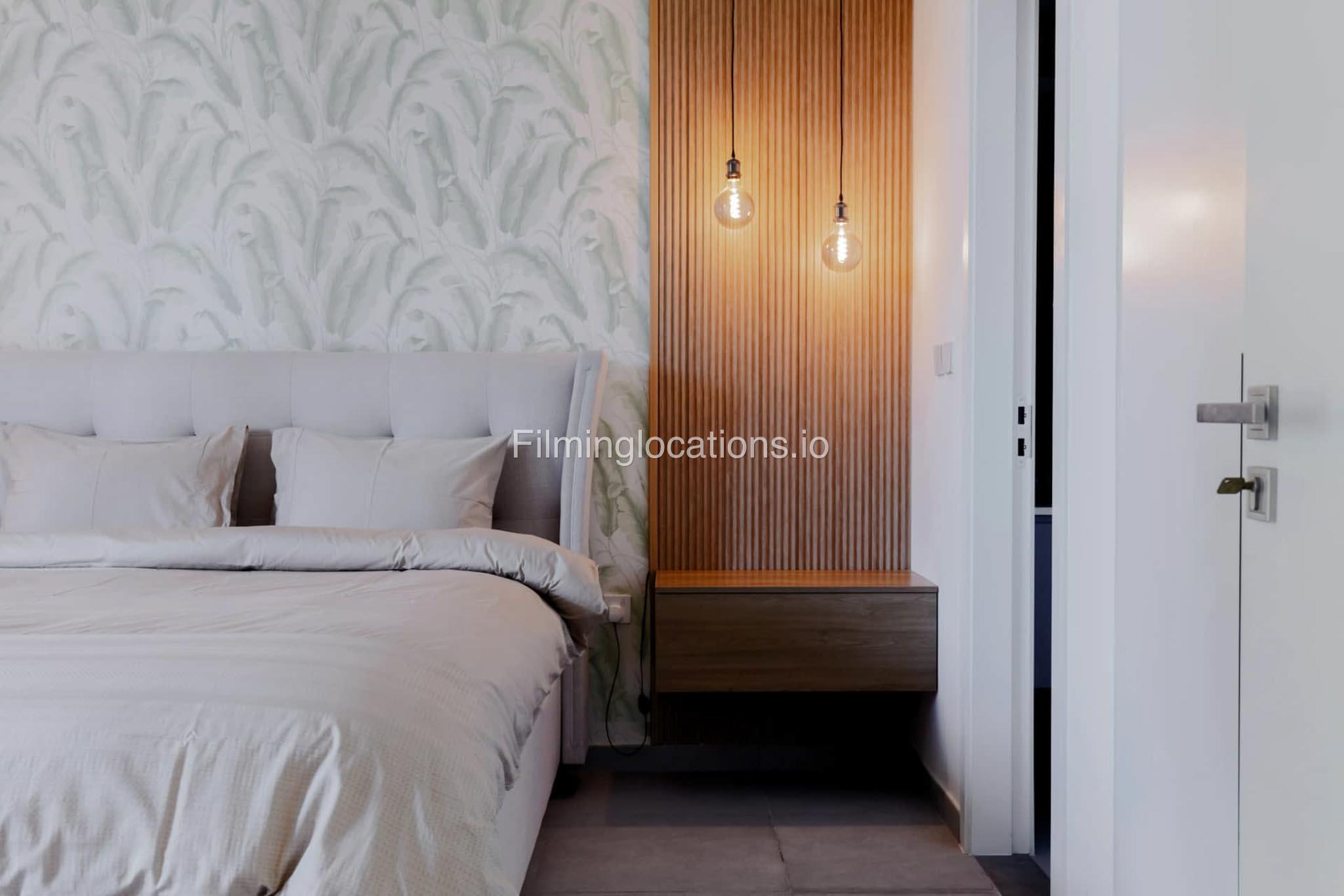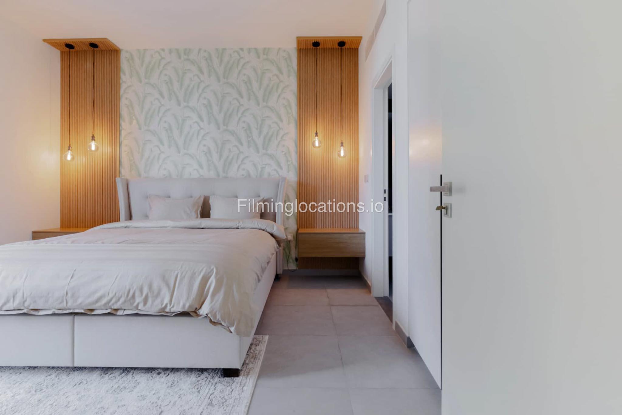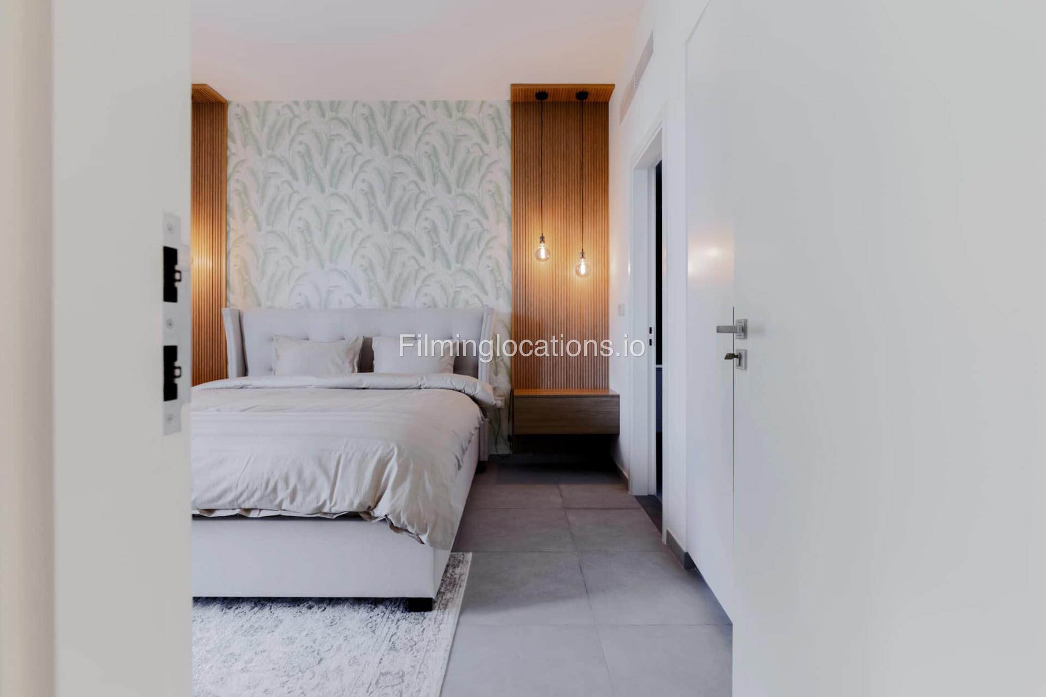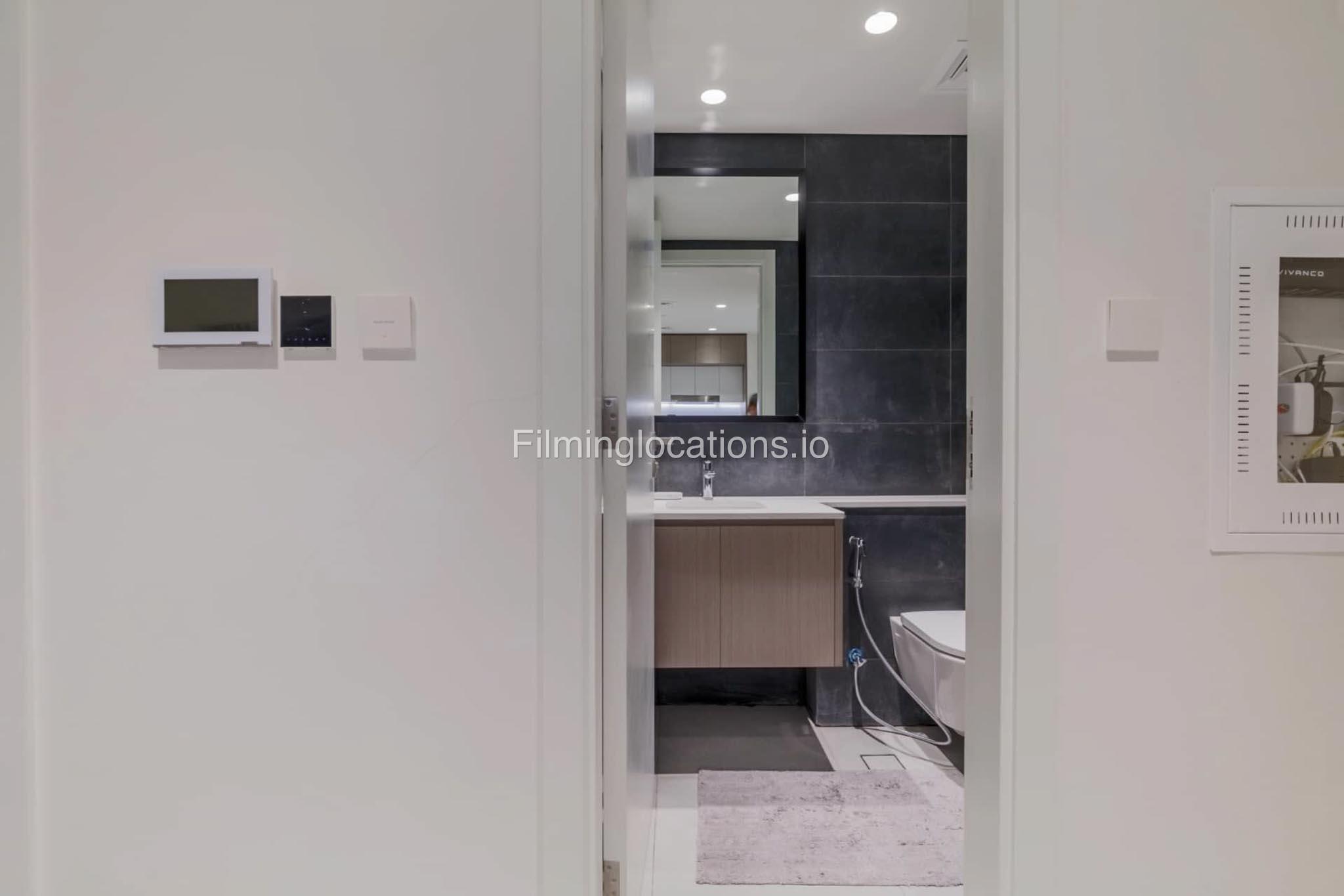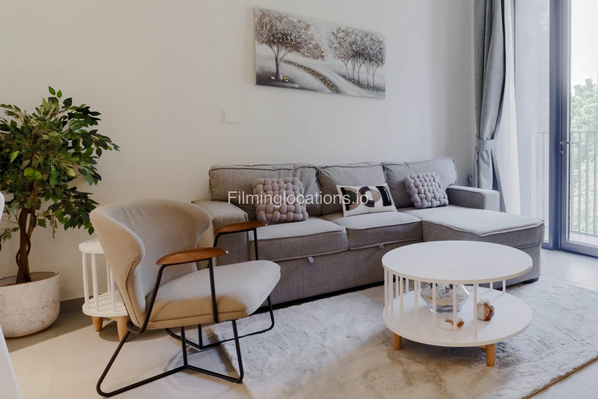 Our stunning luxury apartment offers a sleek living room with a stylish TV setup, elegant wooden interiors, and contemporary décor. The chic seating area seamlessly connects to an attached balcony, providing a bright and inviting atmosphere. A modern, fully equipped open kitchen complements the space. The apartment features a beautifully designed bedroom, 2 sophisticated bathrooms, and an additional private balcony, making it an ideal setting for filming with a touch of elegance and modern charm.