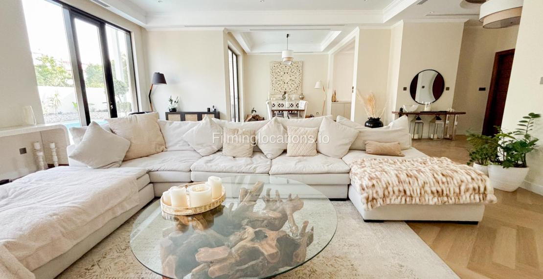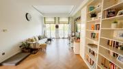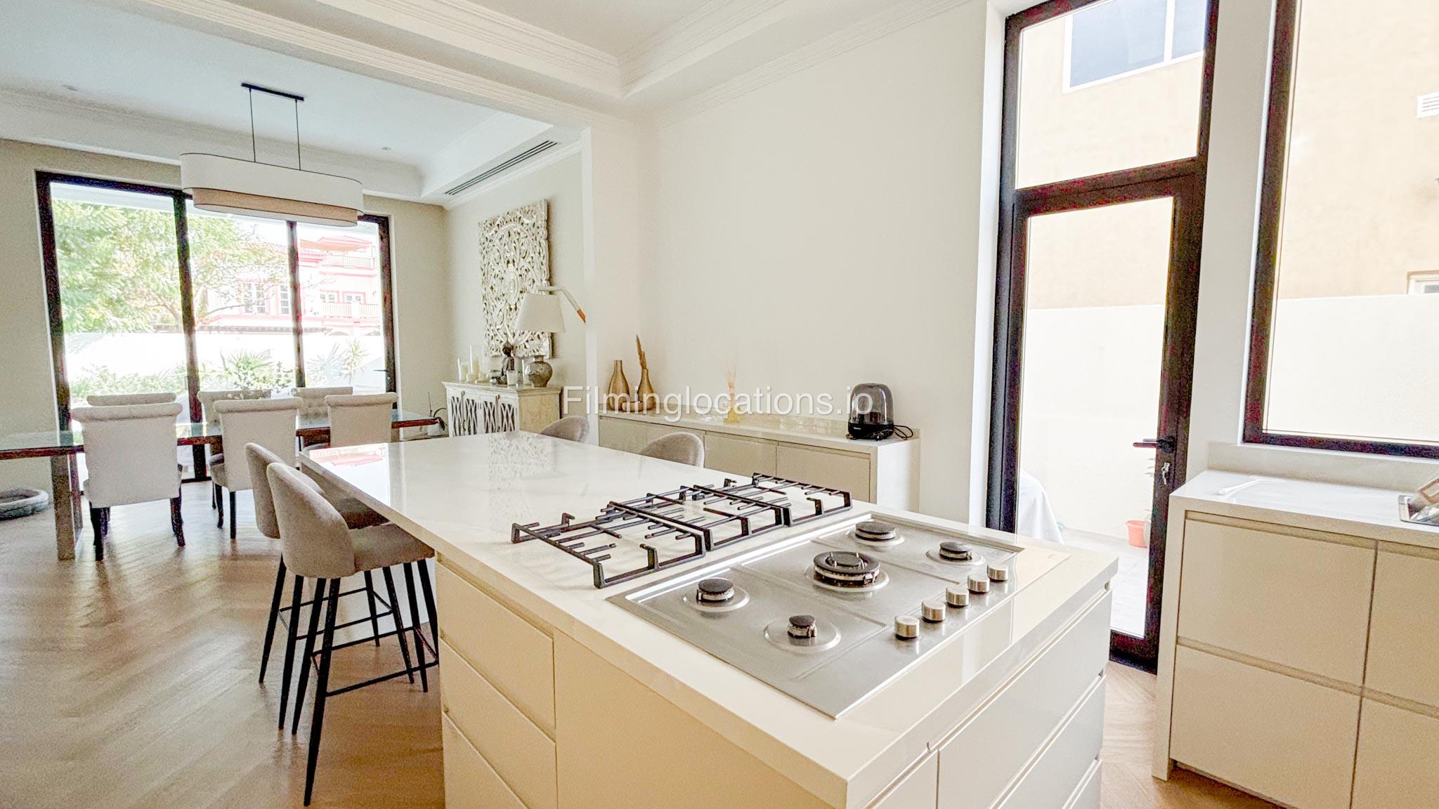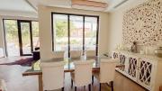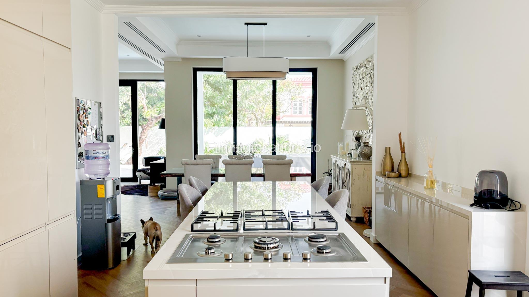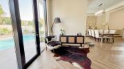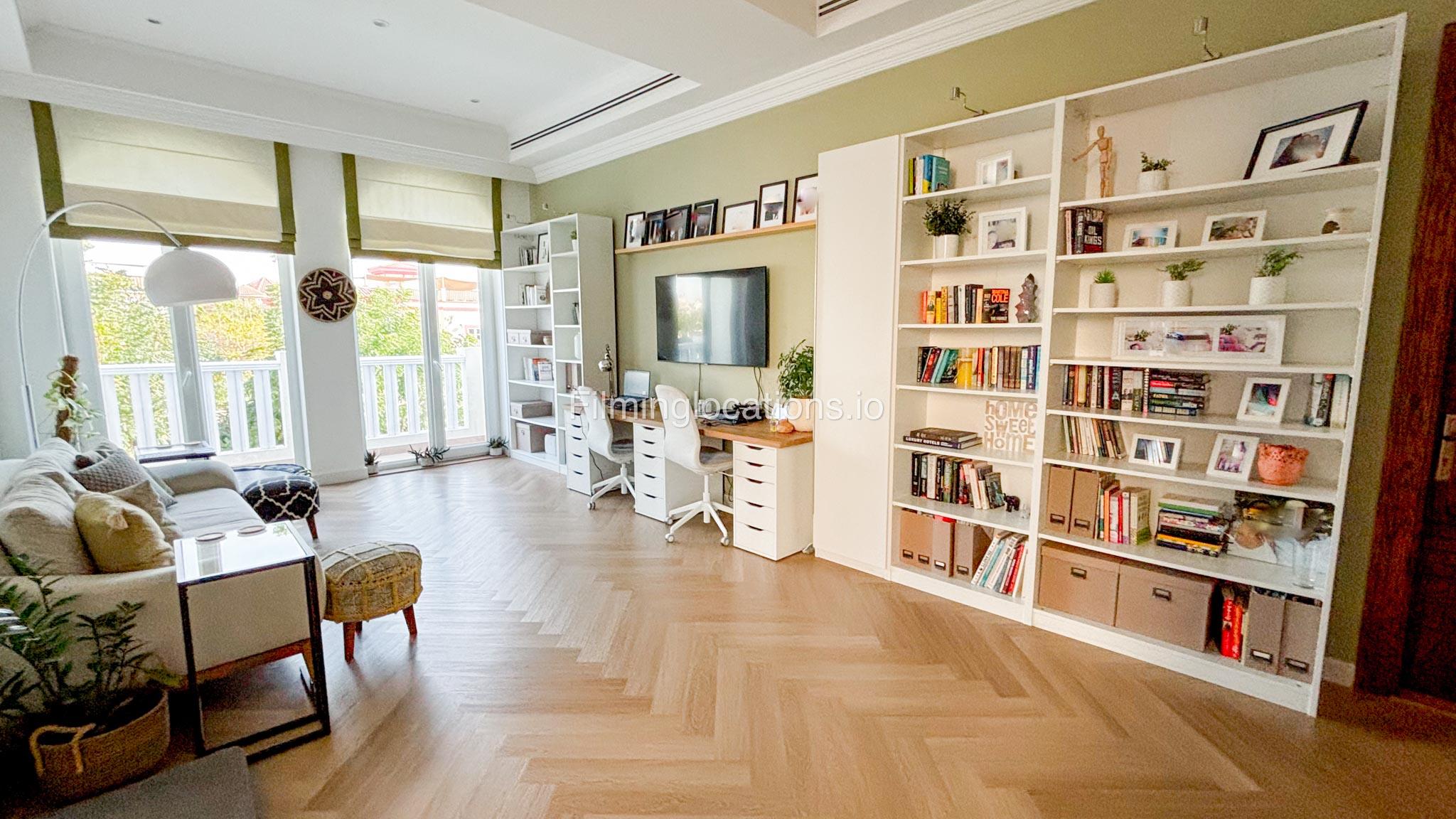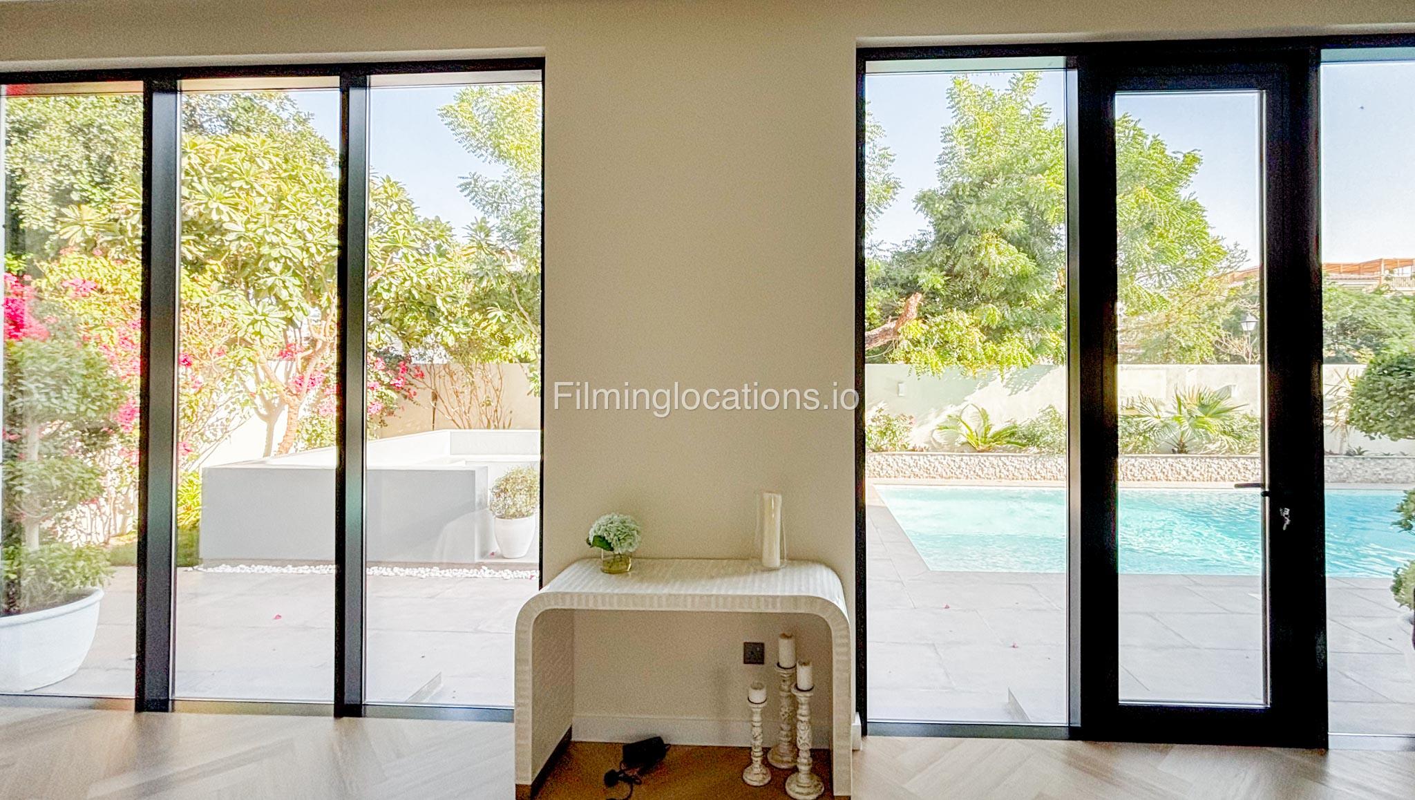 Our Villa features a contemporary design with a spacious living area, a cozy sofa, and a TV, all offering stunning pool views through window walls. There is an open dining area and kitchen with a unique island, stylish light fixtures, and wall decor add to the modern charm. The kitchen island also includes a small seating space.On the ground floor, there is a bedroom with a wardrobe and large windows. Upstairs, a study area with comfortable seating, a bookshelf, a TV, and a small balcony with window walls complete the space. Outside, there is a large seating area surrounded by a small garden, offering a perfect view of the swimming pool.