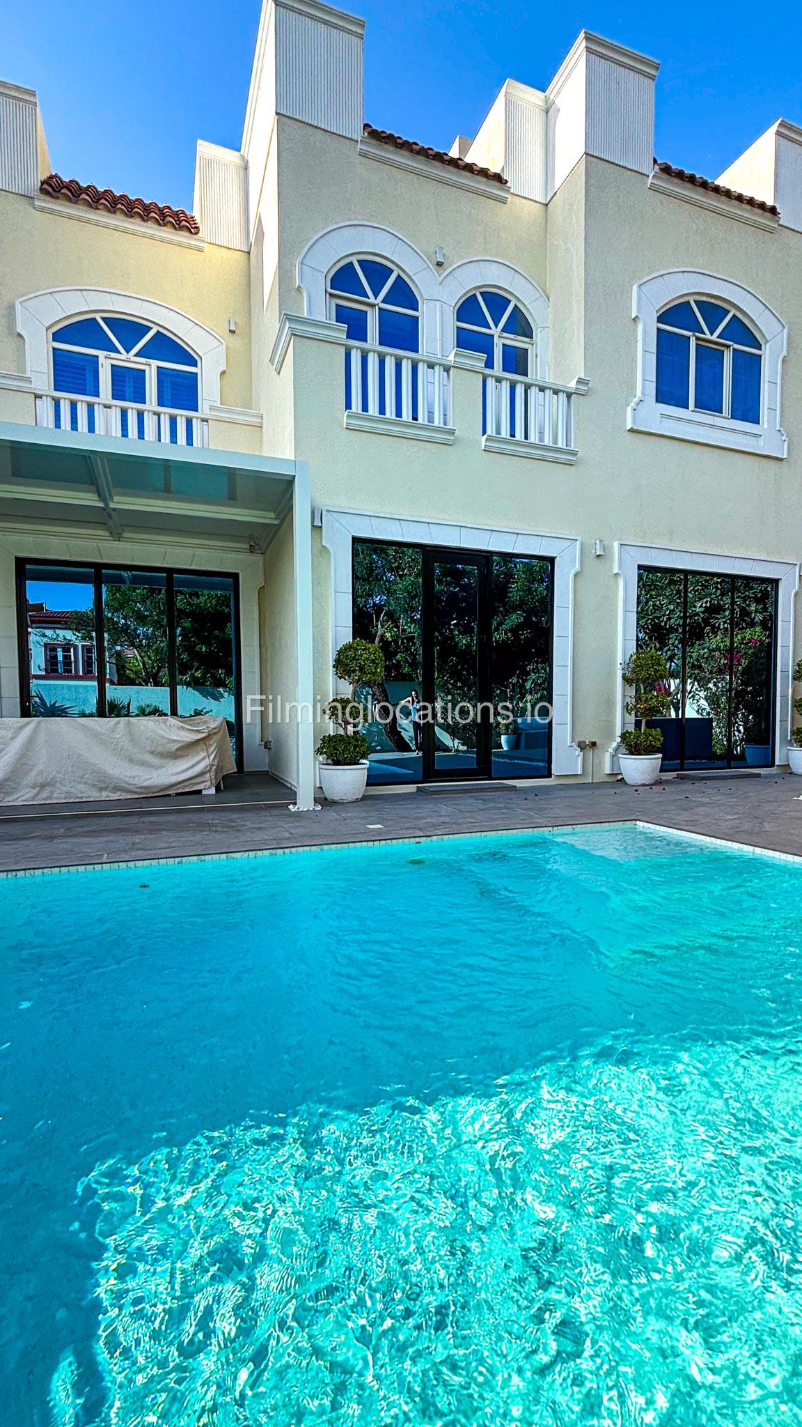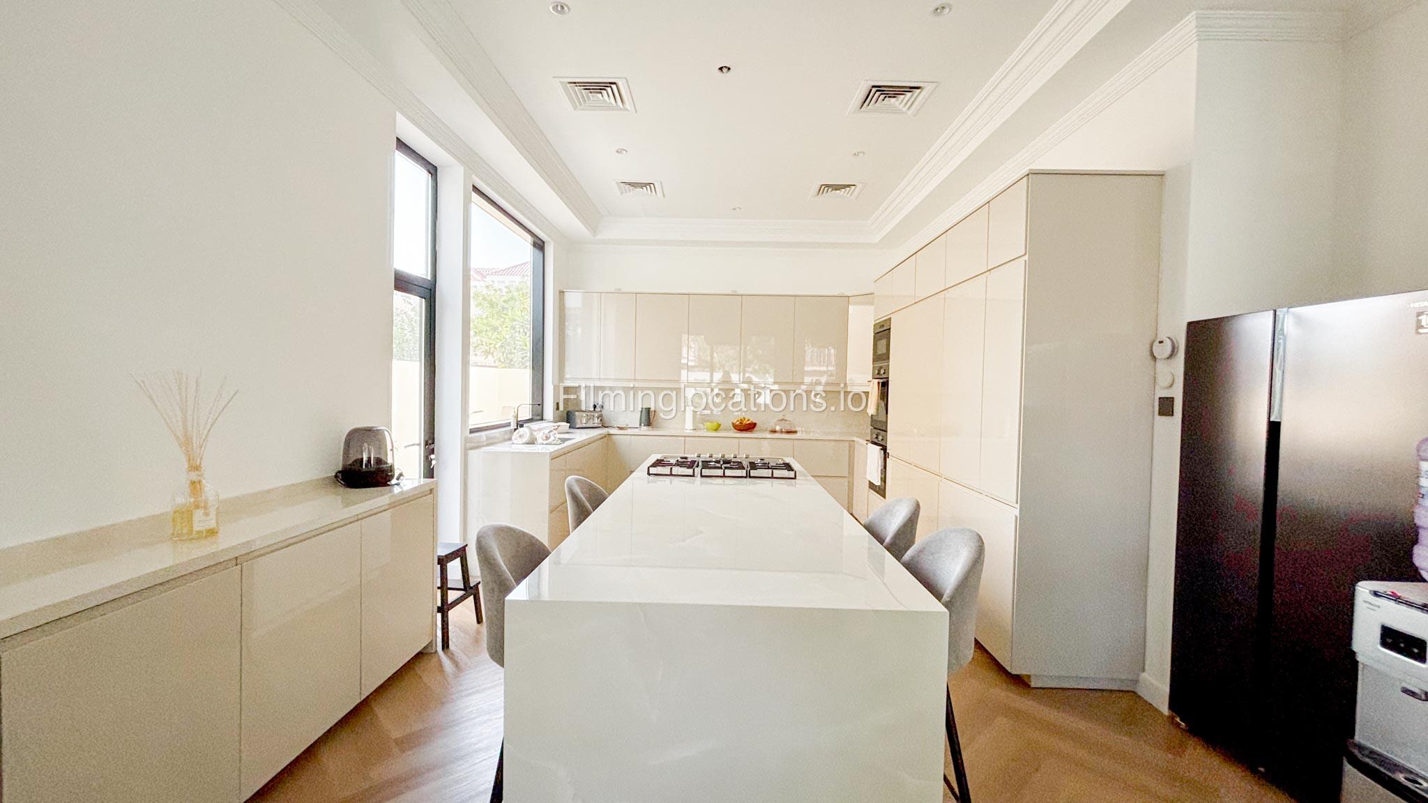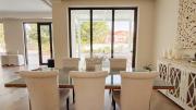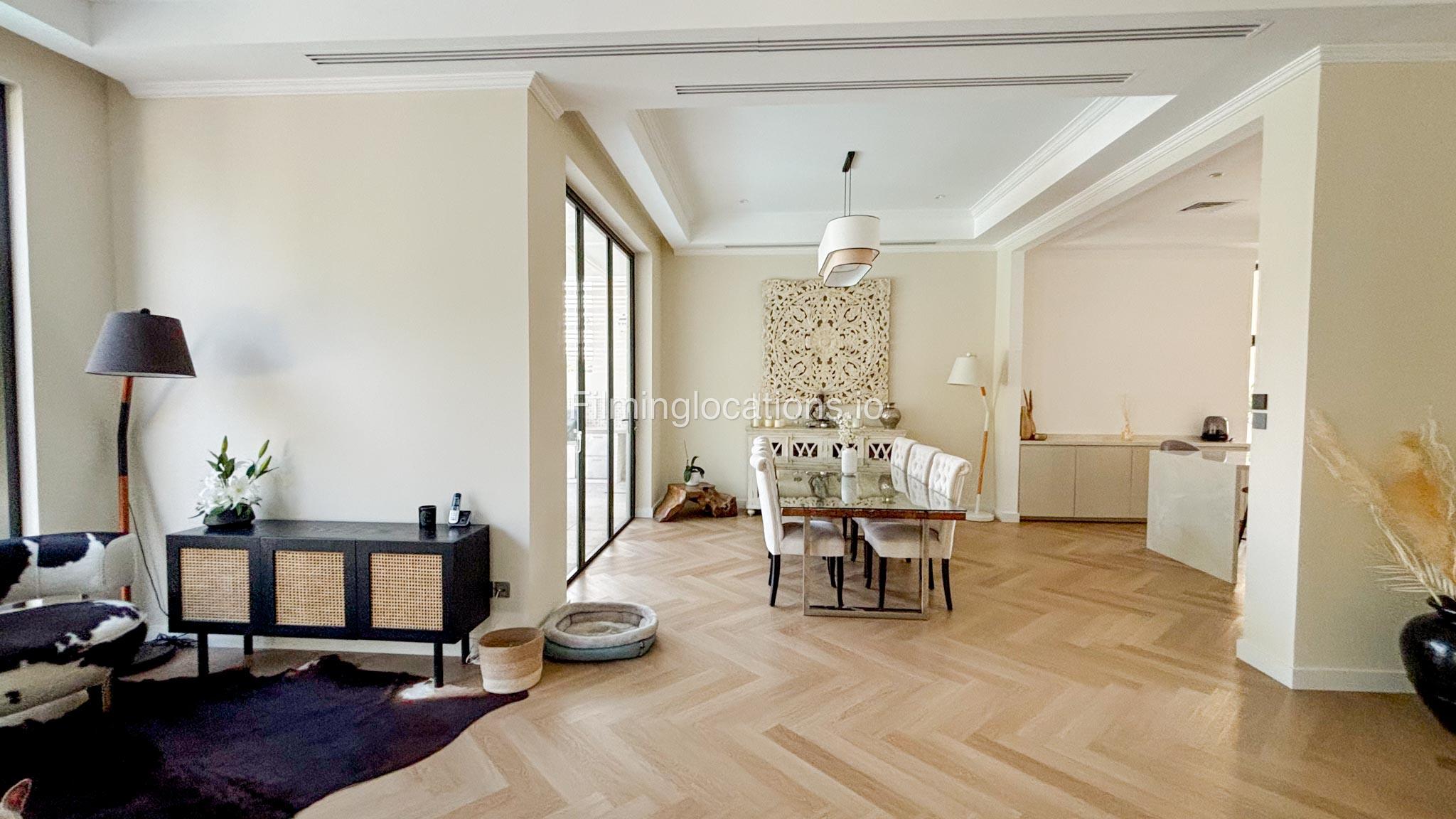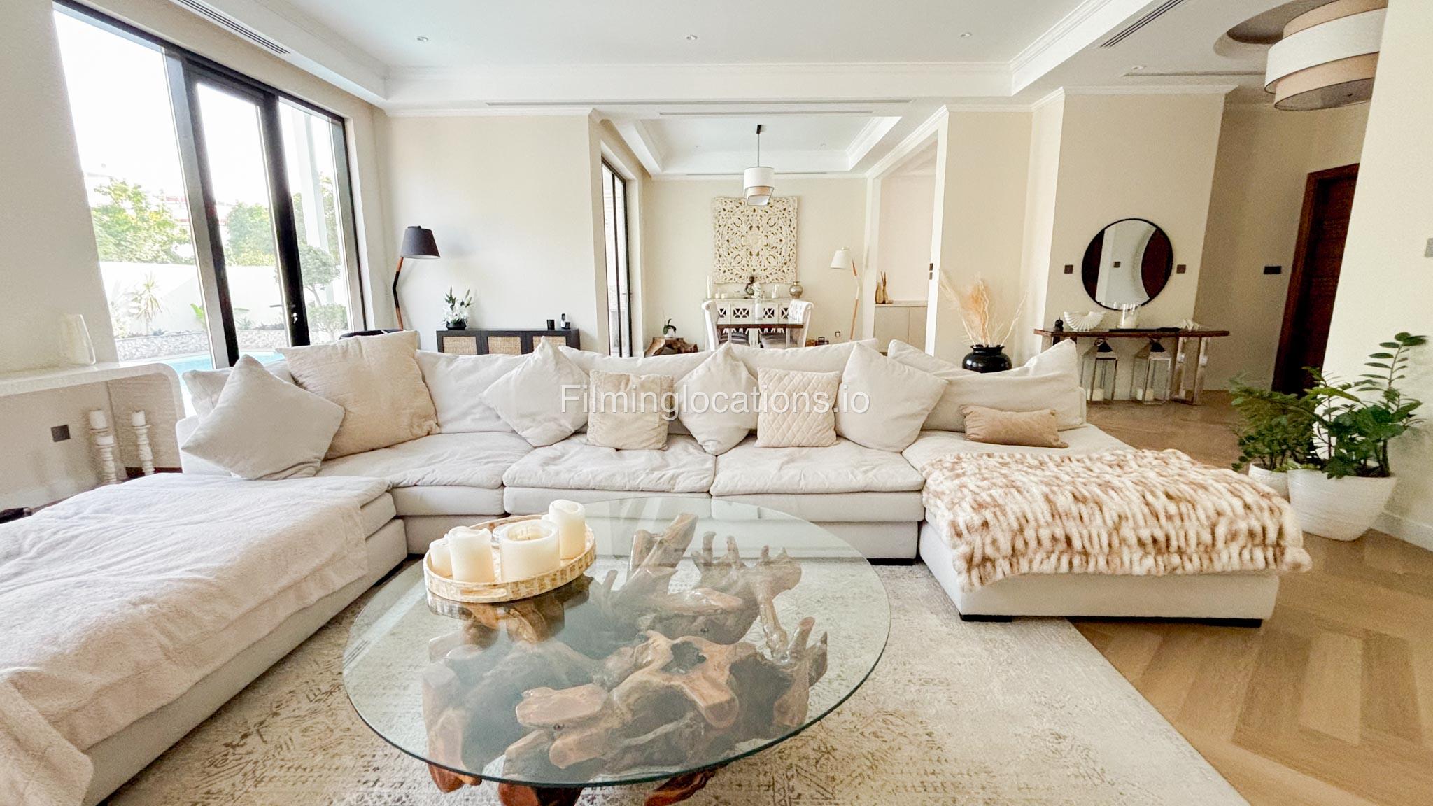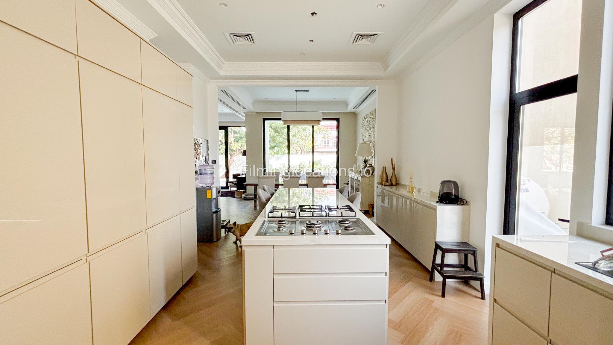 Our Villa features a contemporary design with a spacious living area, a cozy sofa, and a TV, all offering stunning pool views through window walls. There is an open dining area and kitchen with a unique island, stylish light fixtures, and wall decor add to the modern charm. The kitchen island also includes a small seating space.On the ground floor, there is a bedroom with a wardrobe and large windows. Upstairs, a study area with comfortable seating, a bookshelf, a TV, and a small balcony with window walls complete the space. Outside, there is a large seating area surrounded by a small garden, offering a perfect view of the swimming pool.