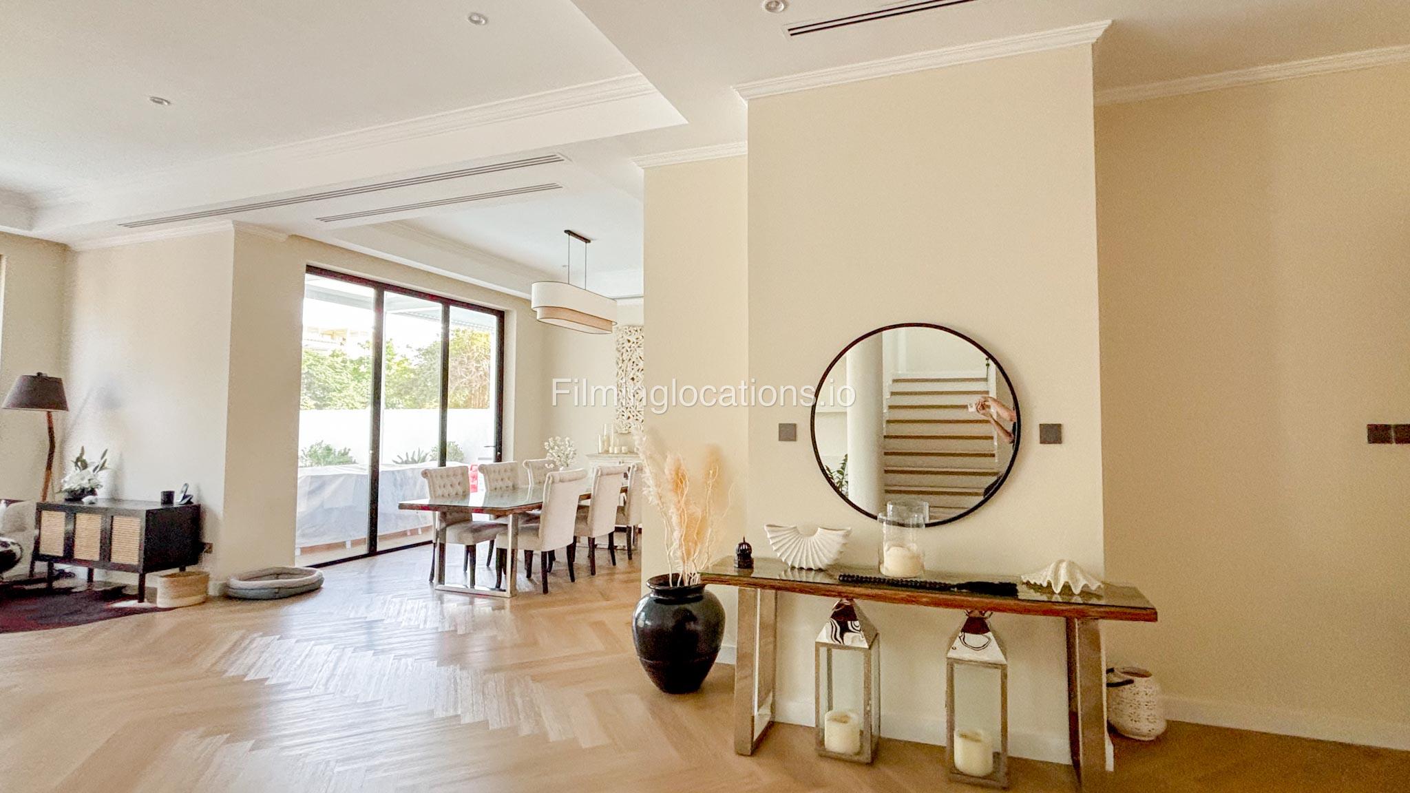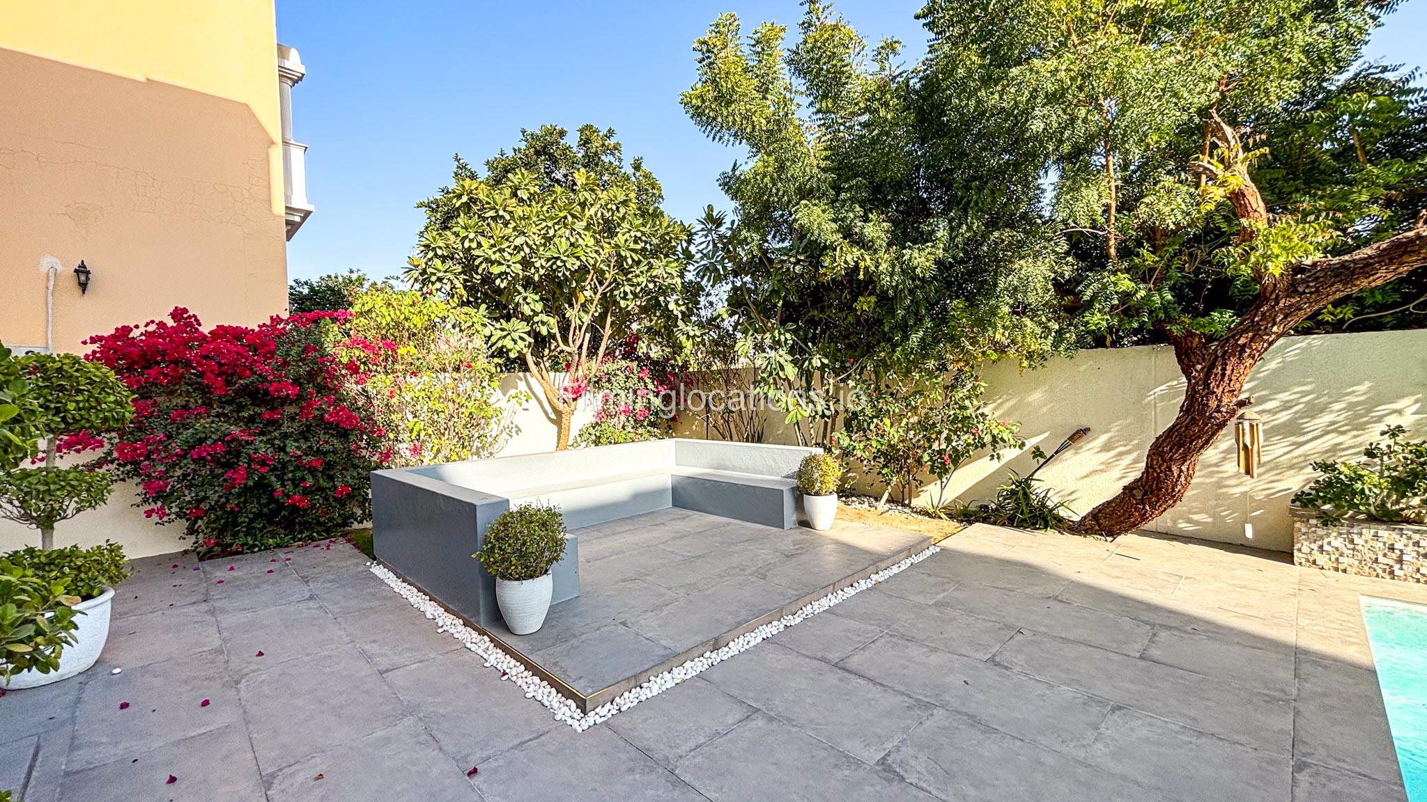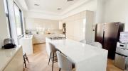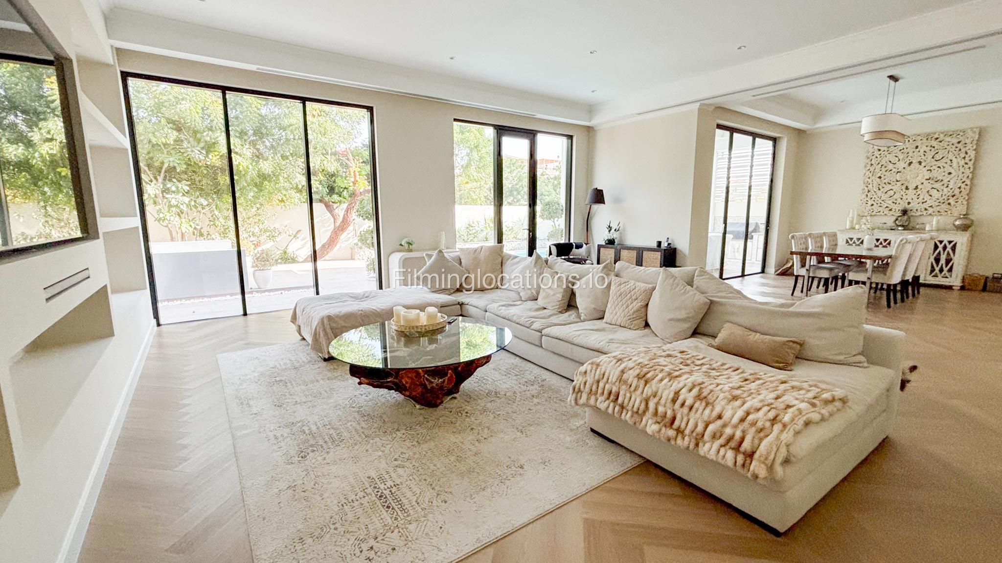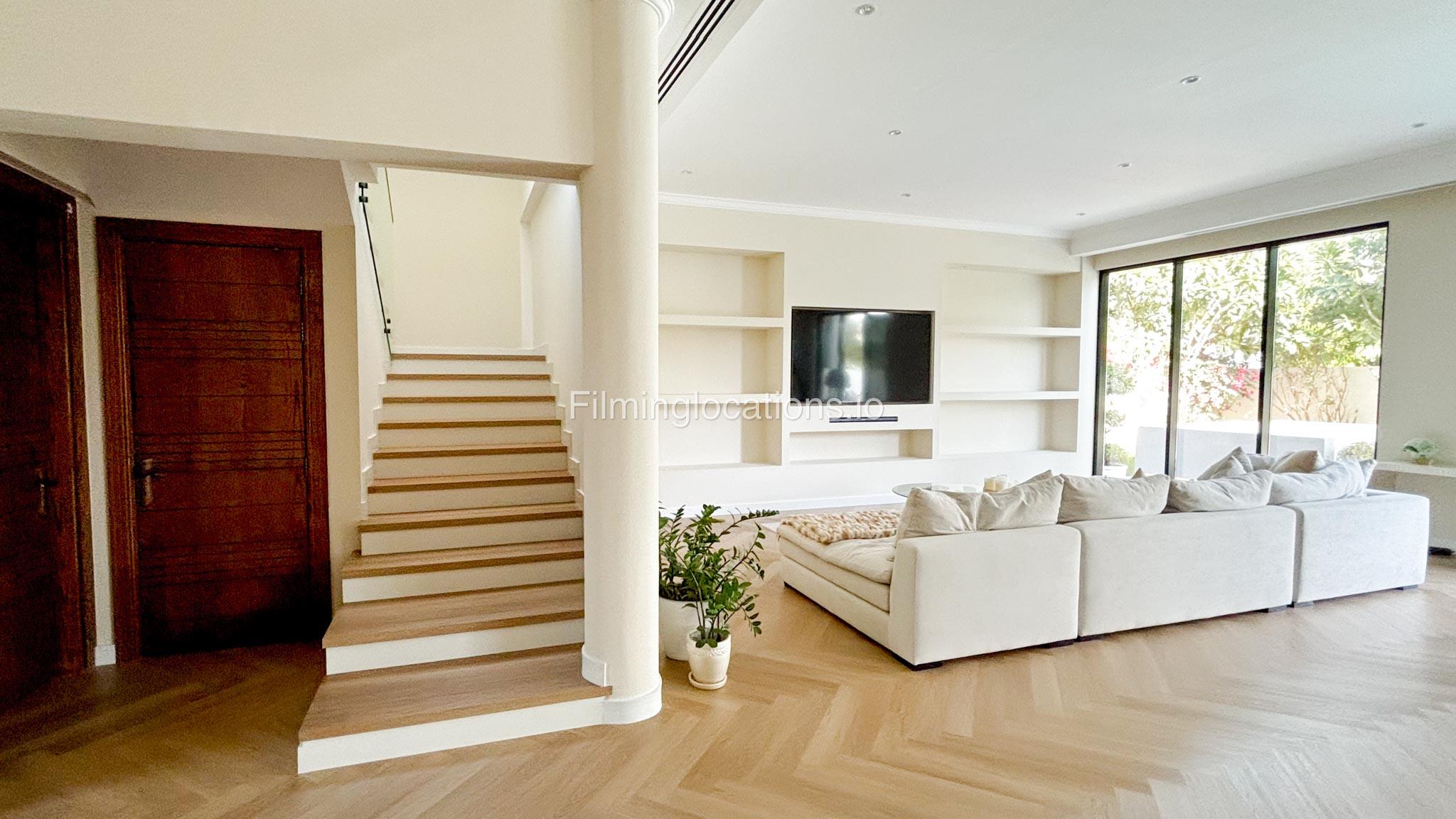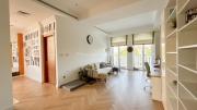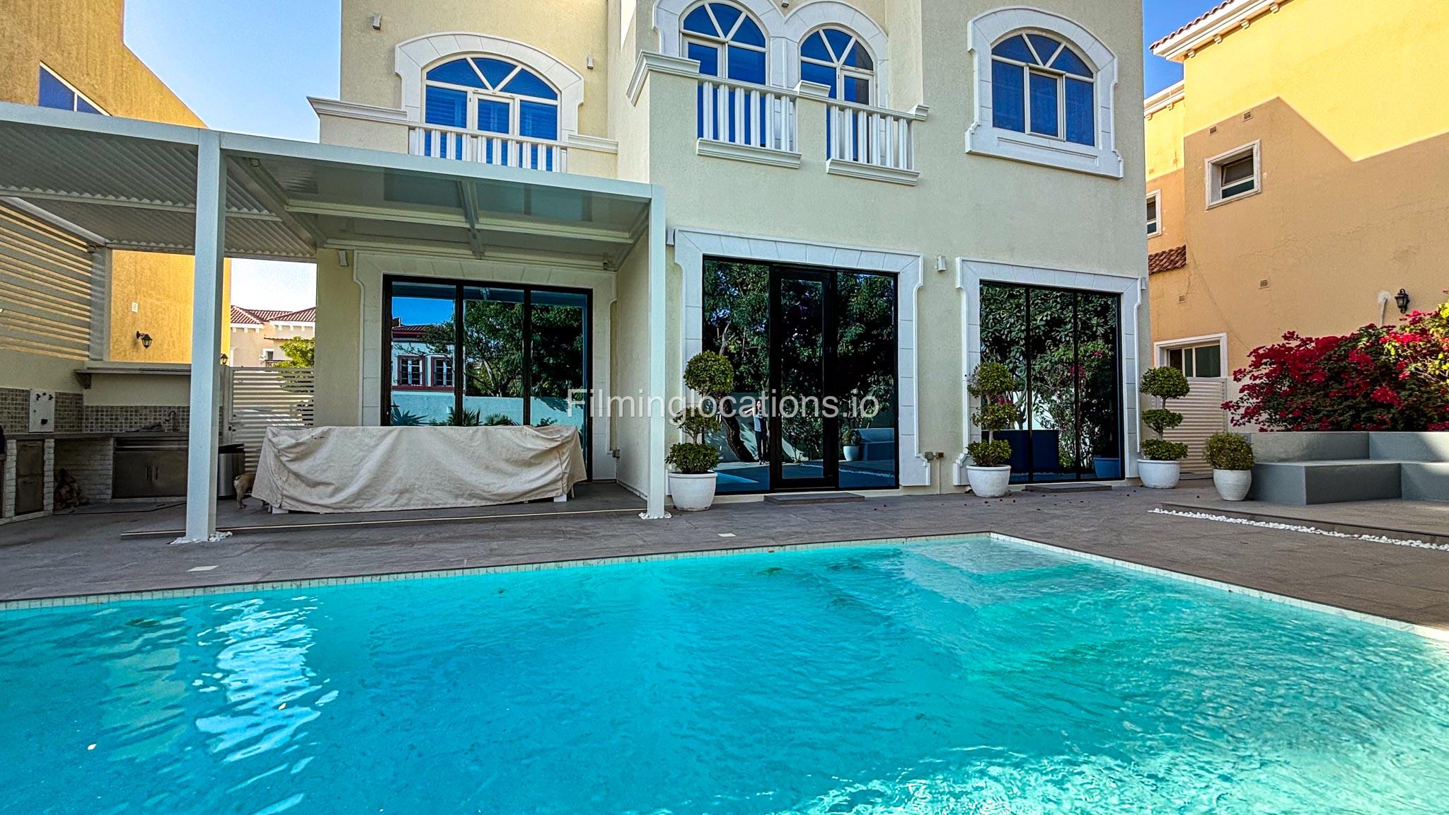 Our Villa features a contemporary design with a spacious living area, a cozy sofa, and a TV, all offering stunning pool views through window walls. There is an open dining area and kitchen with a unique island, stylish light fixtures, and wall decor add to the modern charm. The kitchen island also includes a small seating space.On the ground floor, there is a bedroom with a wardrobe and large windows. Upstairs, a study area with comfortable seating, a bookshelf, a TV, and a small balcony with window walls complete the space. Outside, there is a large seating area surrounded by a small garden, offering a perfect view of the swimming pool.
