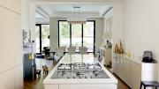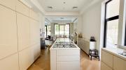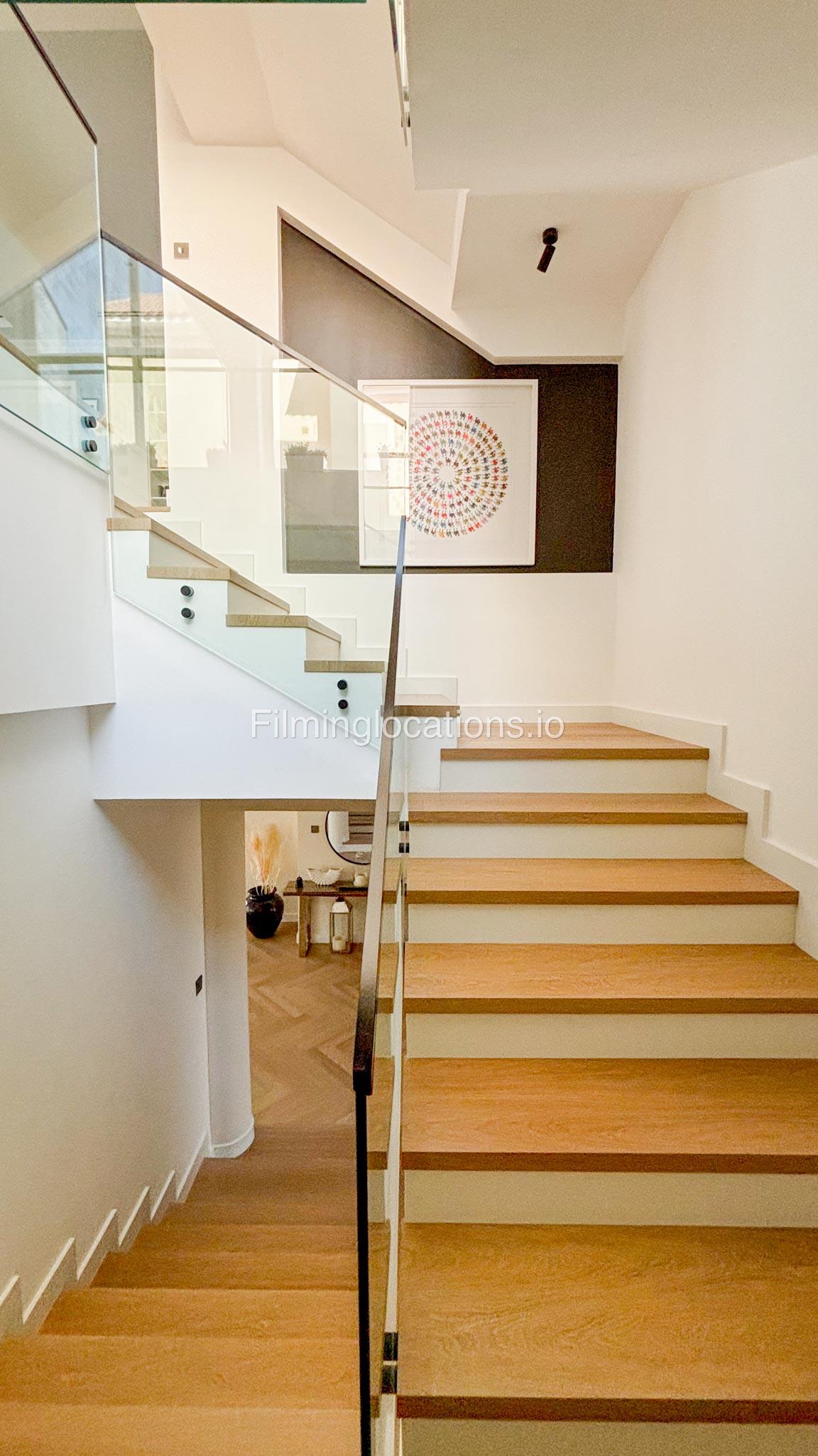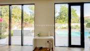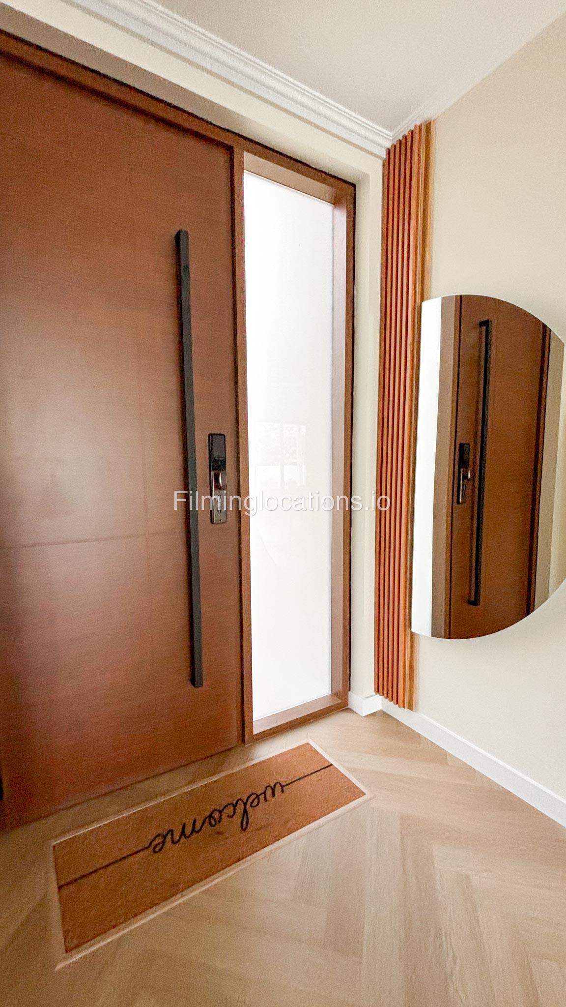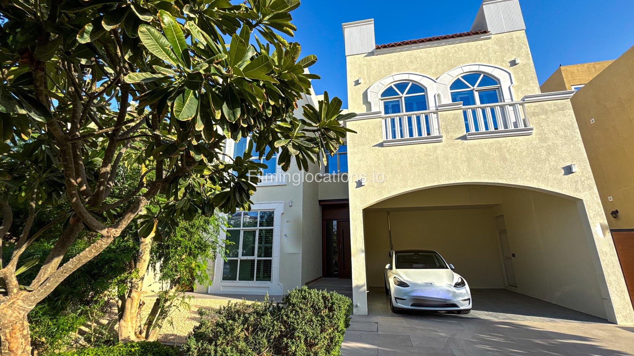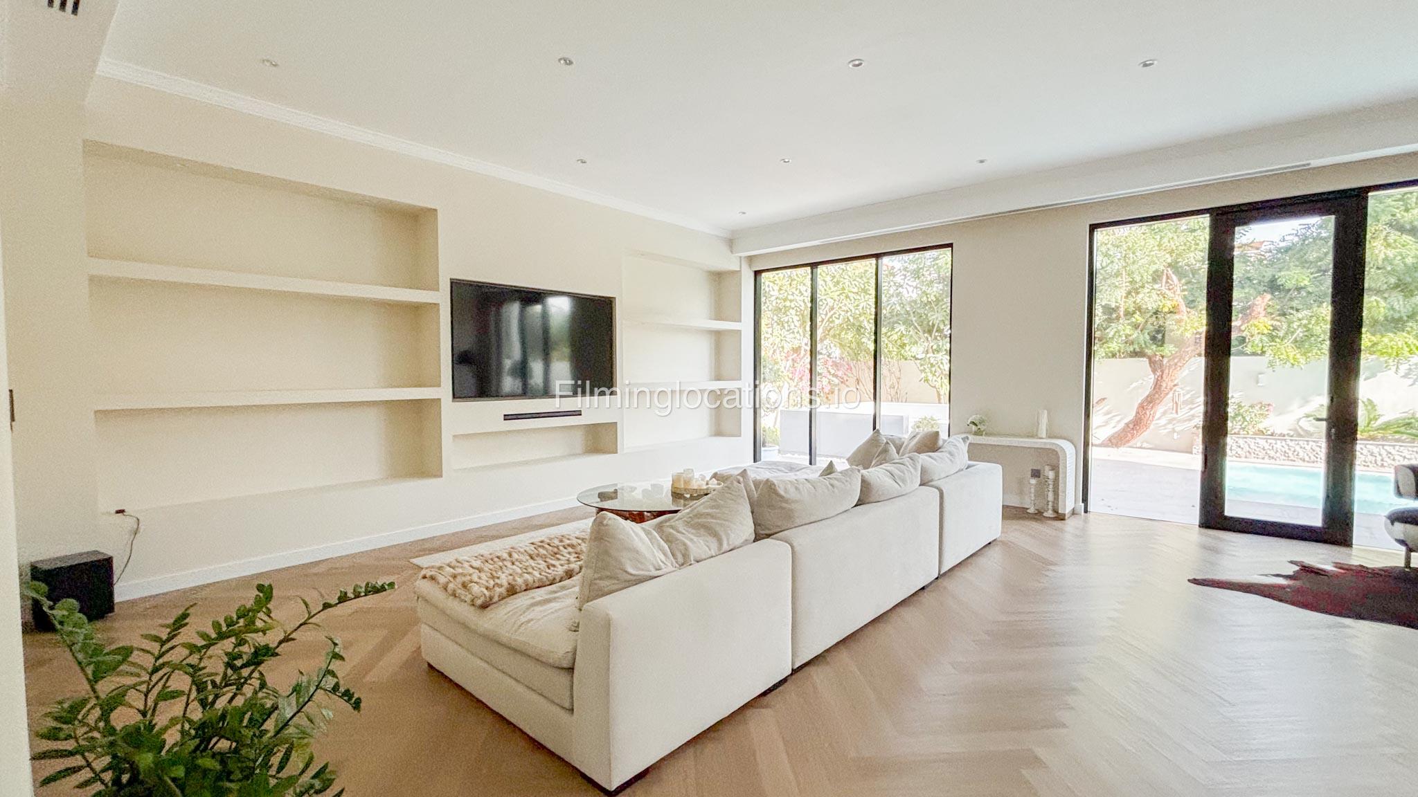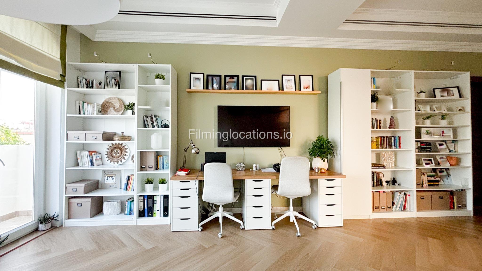 Our Villa features a contemporary design with a spacious living area, a cozy sofa, and a TV, all offering stunning pool views through window walls. There is an open dining area and kitchen with a unique island, stylish light fixtures, and wall decor add to the modern charm. The kitchen island also includes a small seating space.On the ground floor, there is a bedroom with a wardrobe and large windows. Upstairs, a study area with comfortable seating, a bookshelf, a TV, and a small balcony with window walls complete the space. Outside, there is a large seating area surrounded by a small garden, offering a perfect view of the swimming pool.