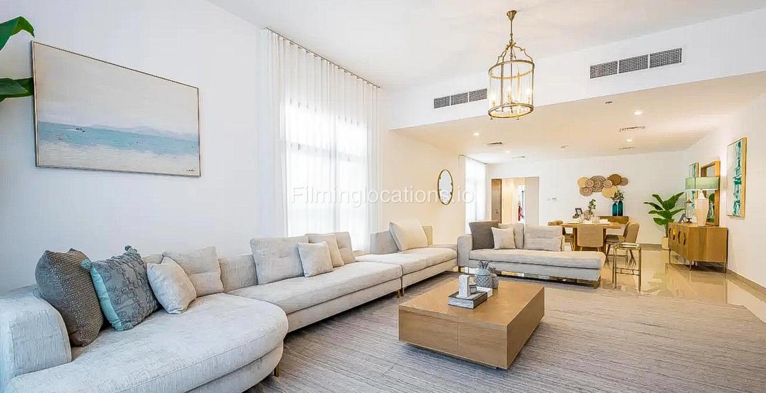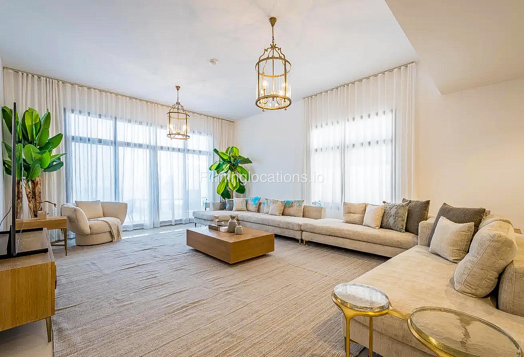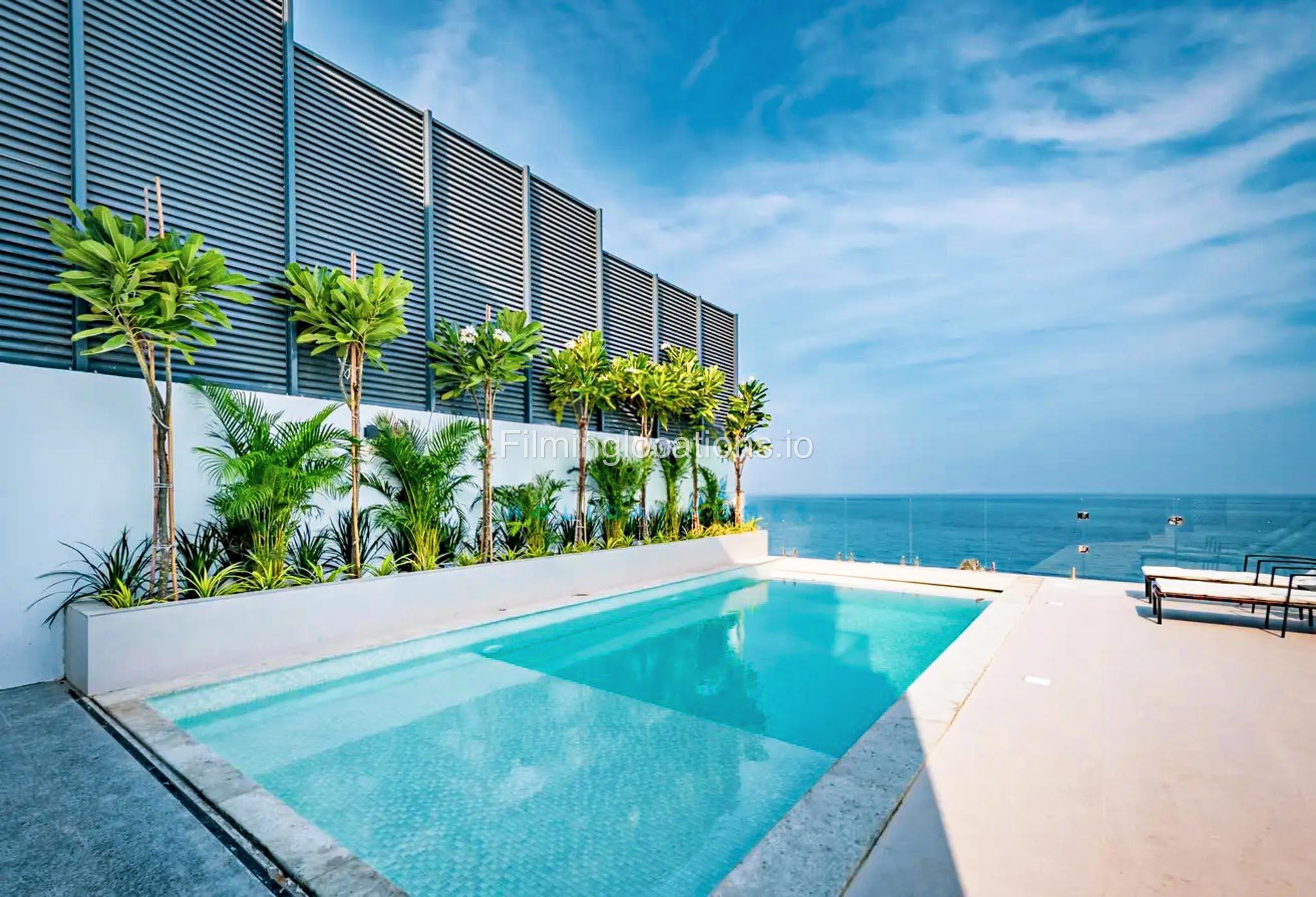 Our luxurious 2-Story villa offers a cozy yet spacious living room with modern lighting, window walls, elegant plant décor, and a stylish sofa setup facing the TV. The space flows into an attached dining area with scenic window views. A closed, well-equipped kitchen with a small laundry area adds convenience. Our villa also features 4 bedrooms, with the primary room boasting a balcony overlooking a spectacular pool and sea view, while another bedroom offers breathtaking mountain views. In total, the villa includes 2 balconies, 4 bathrooms, and a powder room. Outdoors, the villa has a stunning swimming pool surrounded by lush plant décor, sun-beds, and an uninterrupted sea view—making it a perfect setting for film productions.