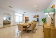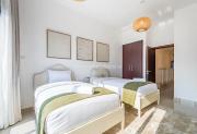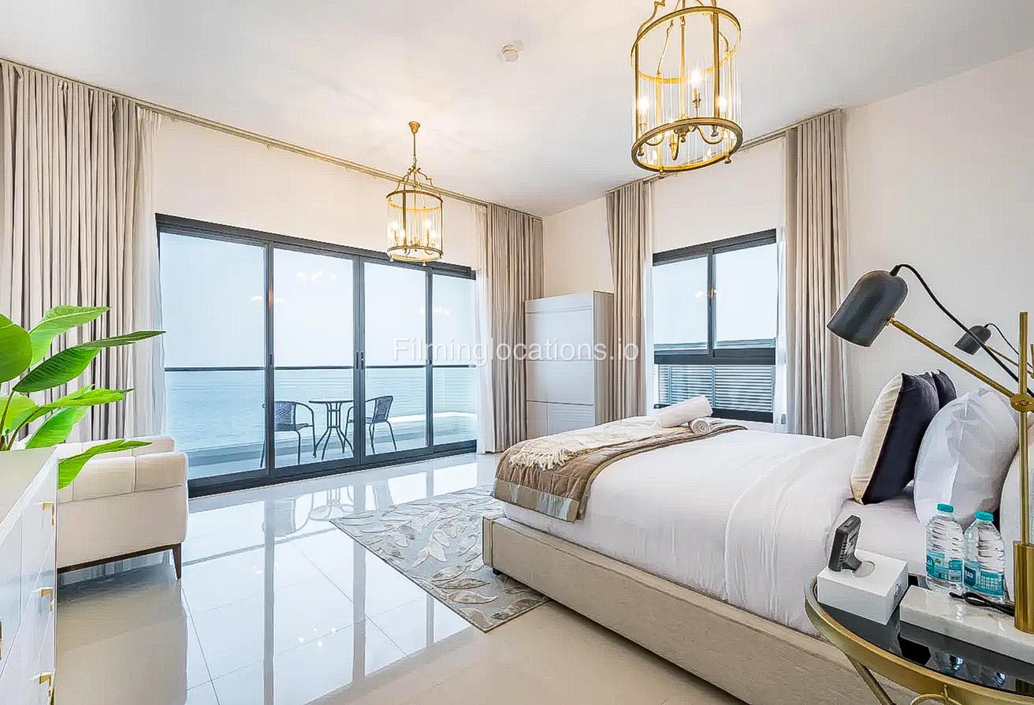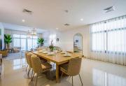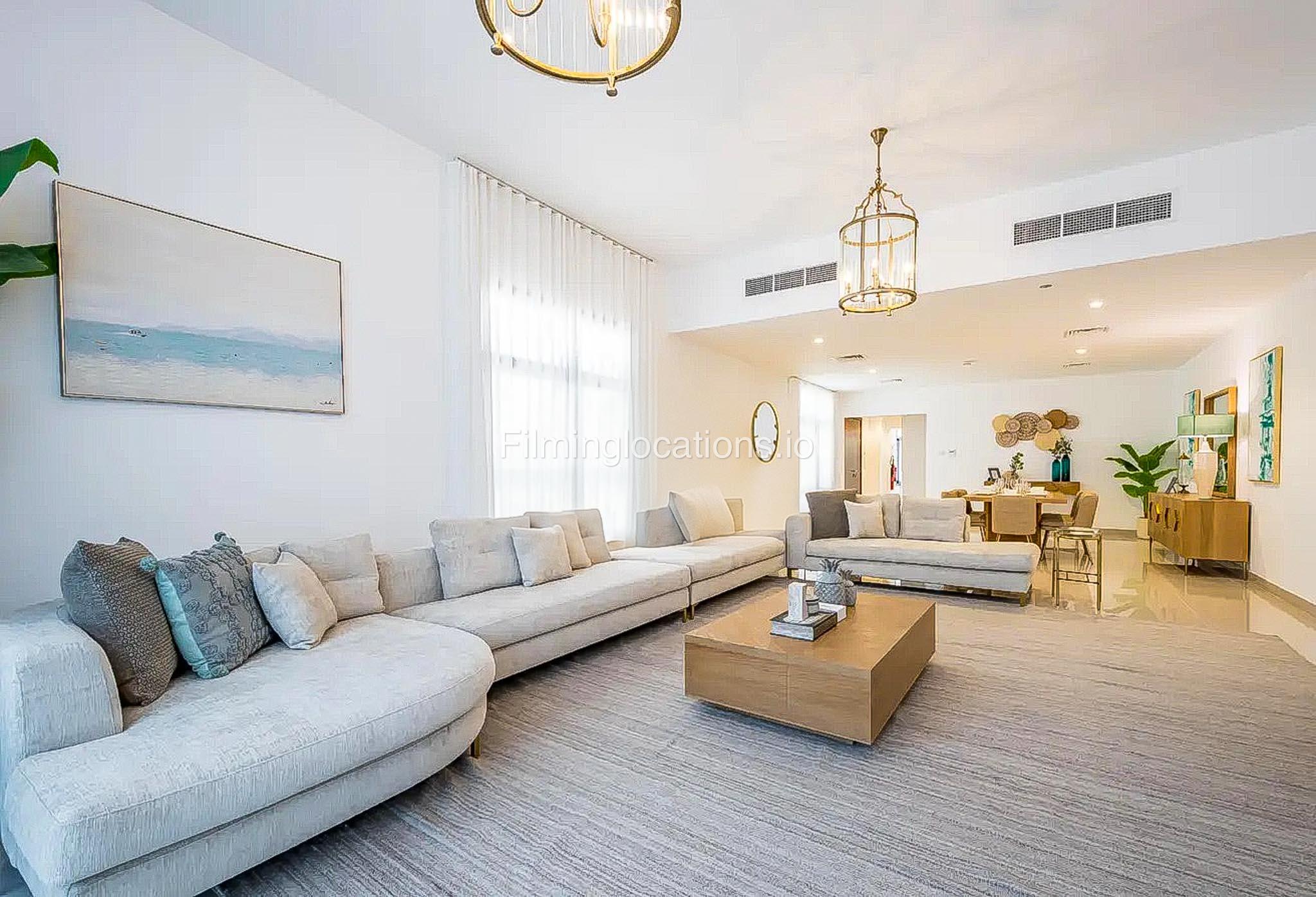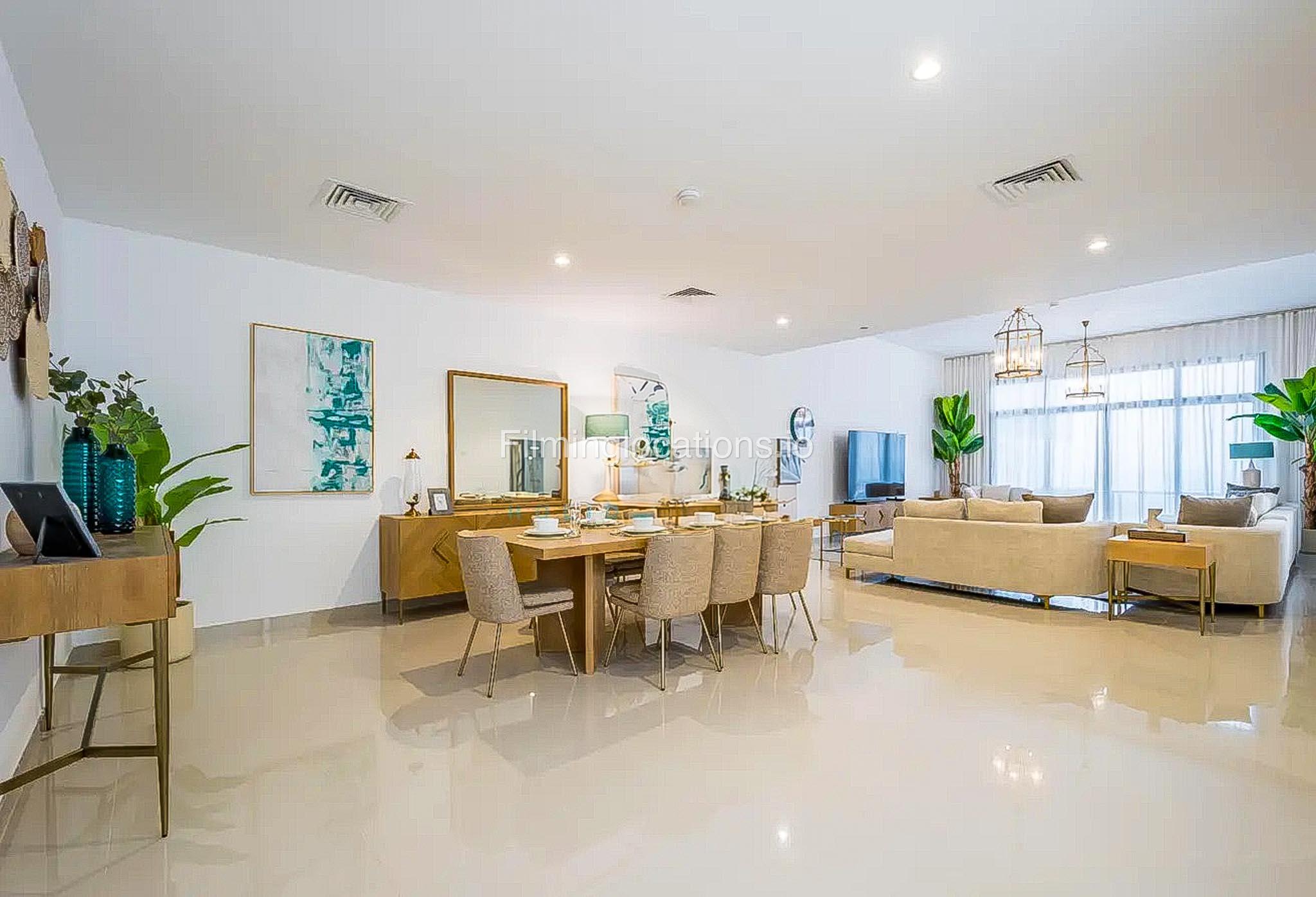 Our luxurious 2-Story villa offers a cozy yet spacious living room with modern lighting, window walls, elegant plant décor, and a stylish sofa setup facing the TV. The space flows into an attached dining area with scenic window views. A closed, well-equipped kitchen with a small laundry area adds convenience. Our villa also features 4 bedrooms, with the primary room boasting a balcony overlooking a spectacular pool and sea view, while another bedroom offers breathtaking mountain views. In total, the villa includes 2 balconies, 4 bathrooms, and a powder room. Outdoors, the villa has a stunning swimming pool surrounded by lush plant décor, sun-beds, and an uninterrupted sea view—making it a perfect setting for film productions.