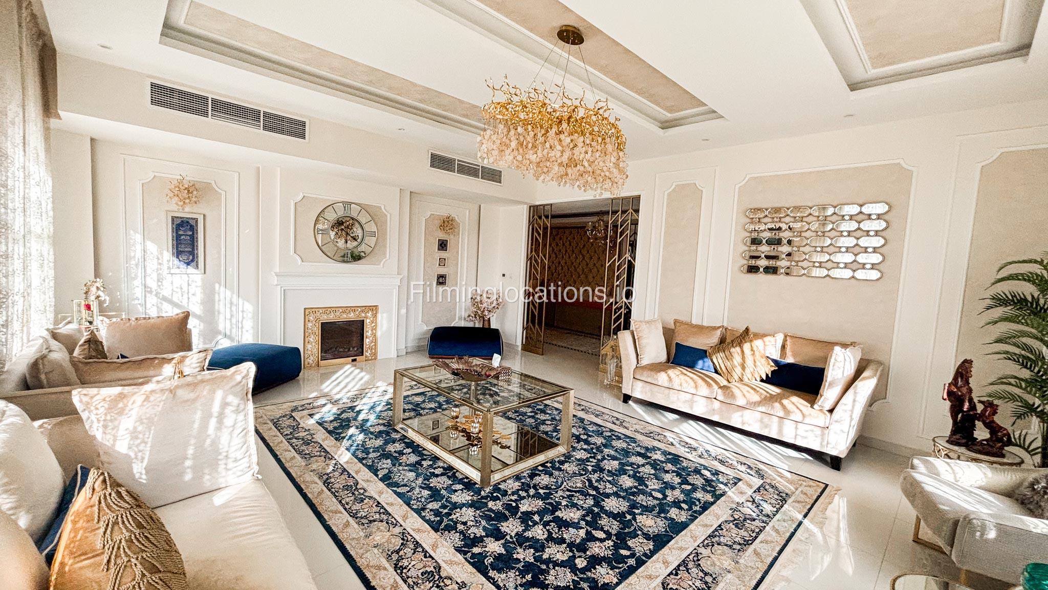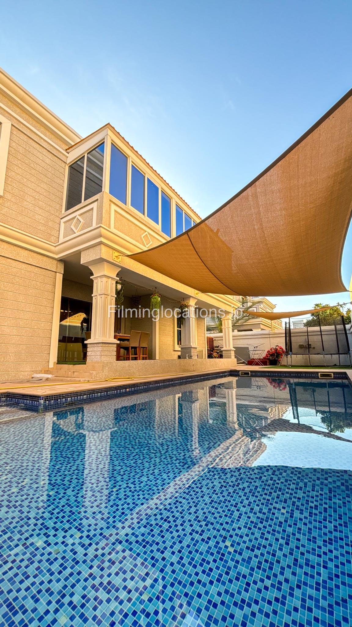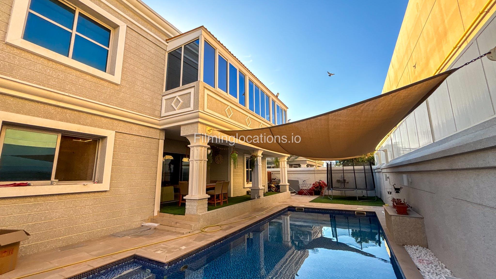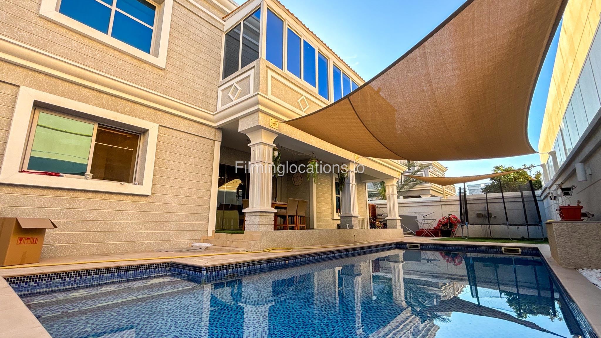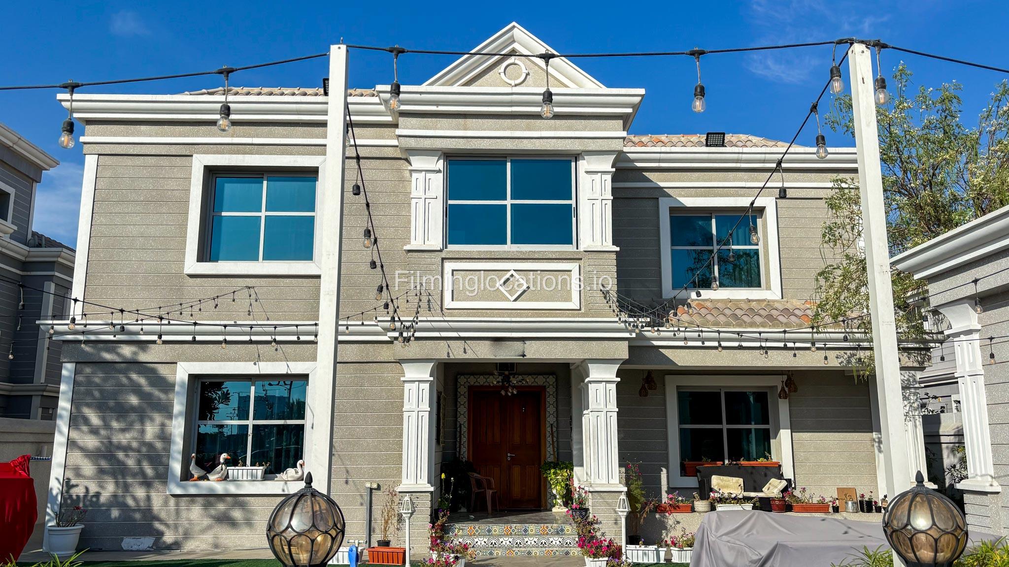 Our villa boasts a charming exterior with a white fence, a beautiful garden, a cozy seating area, and a small garage. Inside, the villa features 2 stunning living rooms with lavish royal interiors. The main living room is bright with large windows, elegant sofa seating, modern chandeliers, and sophisticated décor. The second living room offers a cozy yet stylish setup with a modern sofa facing the TV. The corridors are tastefully decorated with contemporary accents and include a small seating area. 1 bedroom with large windows is also available for filming. The villa also includes a closed, modern, fully equipped kitchen. The backyard has a shaded swimming pool area completing with a cozy table and chair seating for a refined outdoor setting. This villa offers a unique elegance, making it an ideal location for filming.