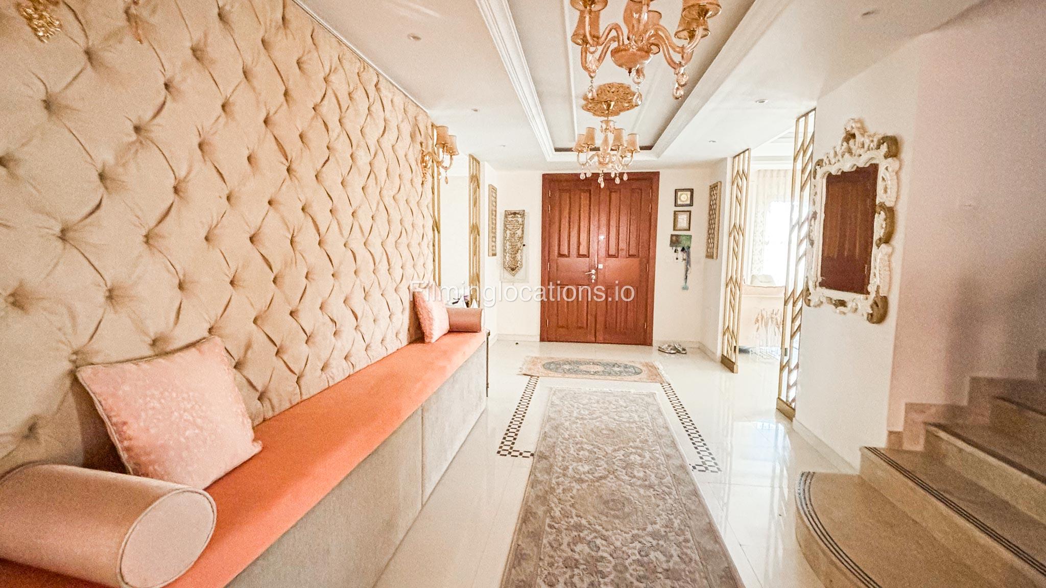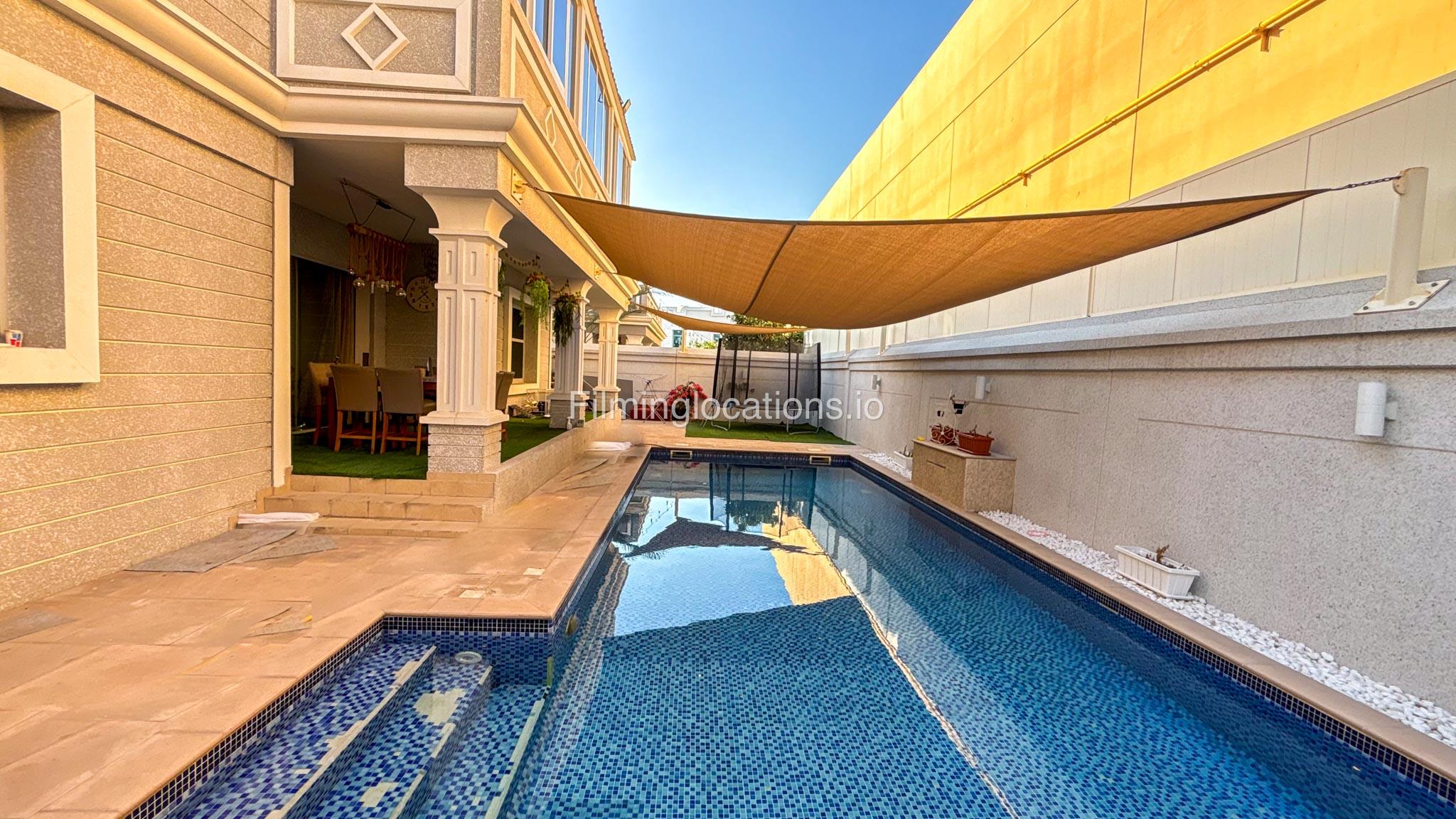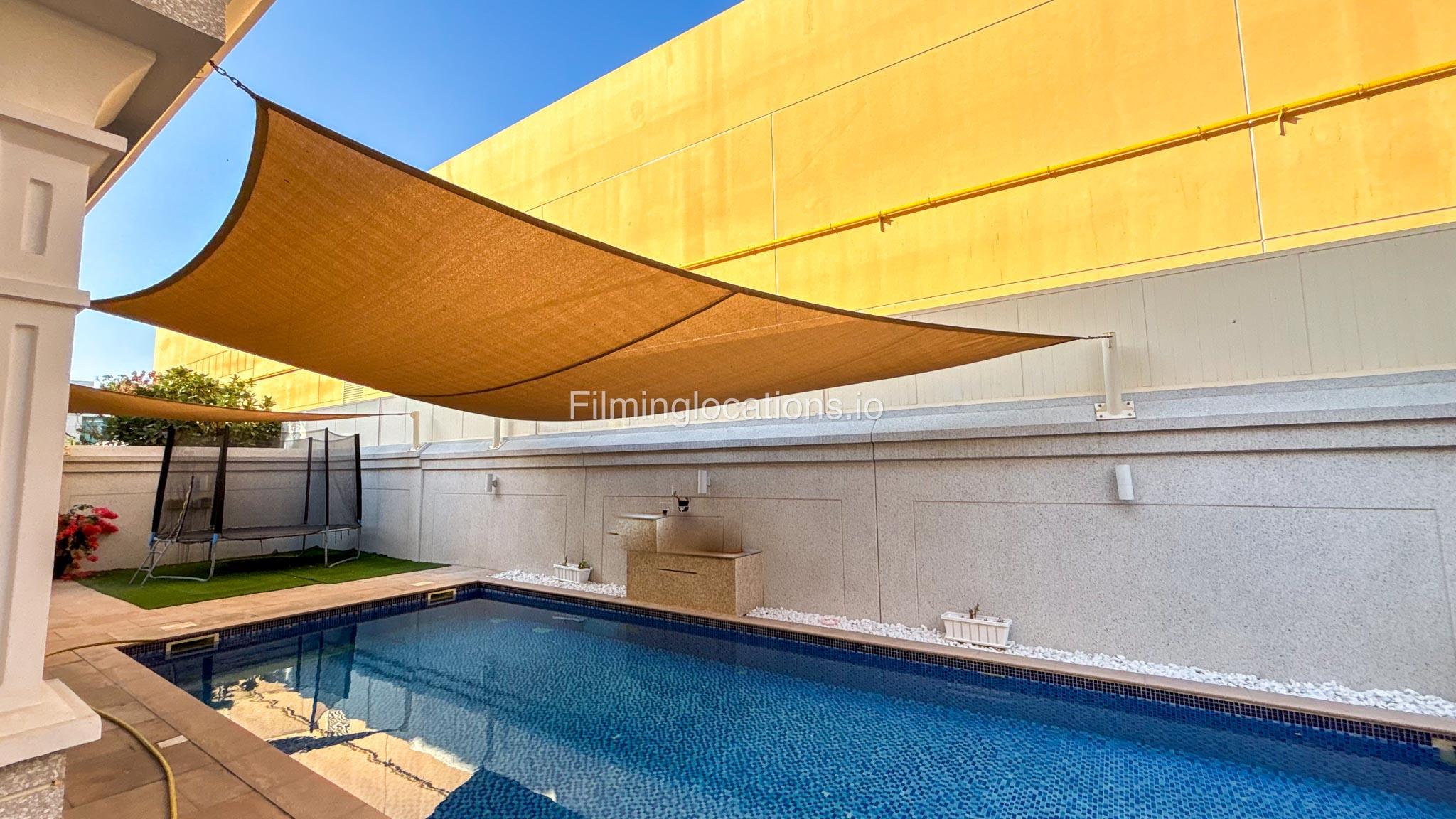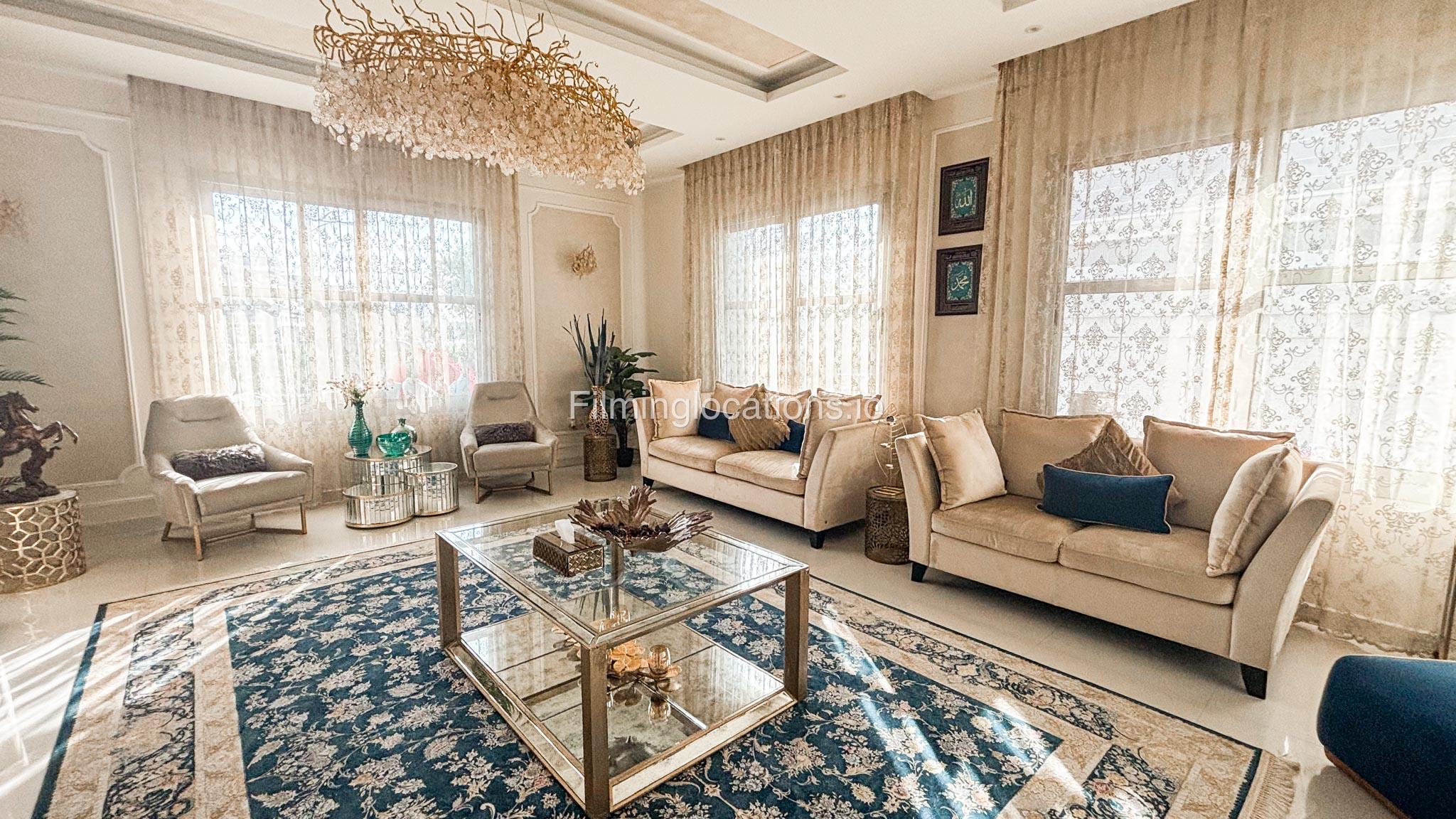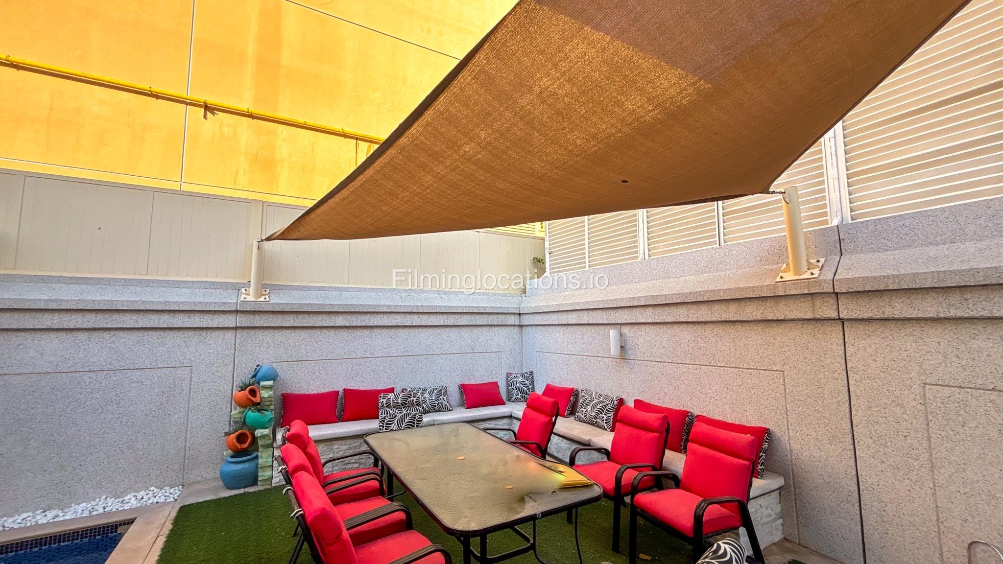 Our villa boasts a charming exterior with a white fence, a beautiful garden, a cozy seating area, and a small garage. Inside, the villa features 2 stunning living rooms with lavish royal interiors. The main living room is bright with large windows, elegant sofa seating, modern chandeliers, and sophisticated décor. The second living room offers a cozy yet stylish setup with a modern sofa facing the TV. The corridors are tastefully decorated with contemporary accents and include a small seating area. 1 bedroom with large windows is also available for filming. The villa also includes a closed, modern, fully equipped kitchen. The backyard has a shaded swimming pool area completing with a cozy table and chair seating for a refined outdoor setting. This villa offers a unique elegance, making it an ideal location for filming.