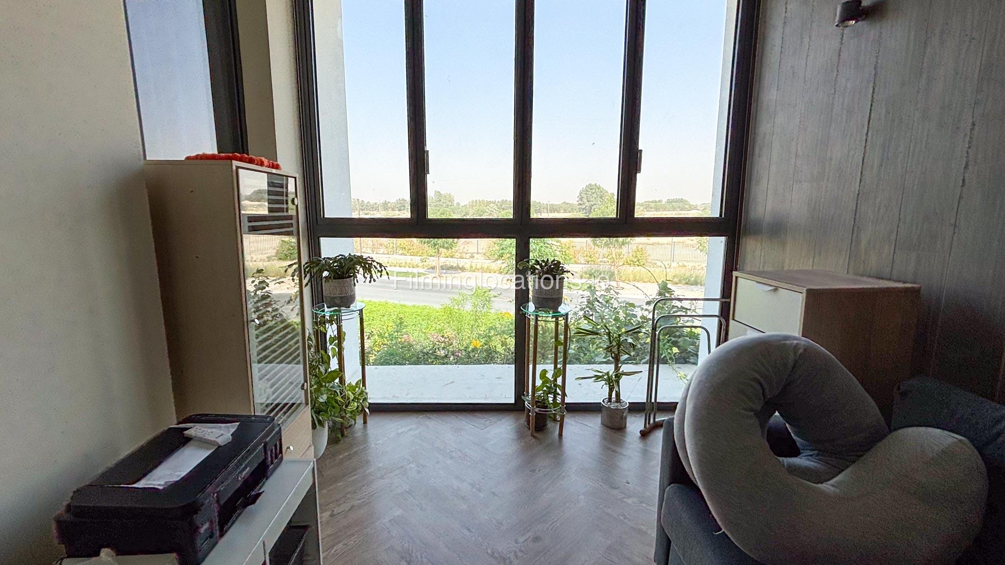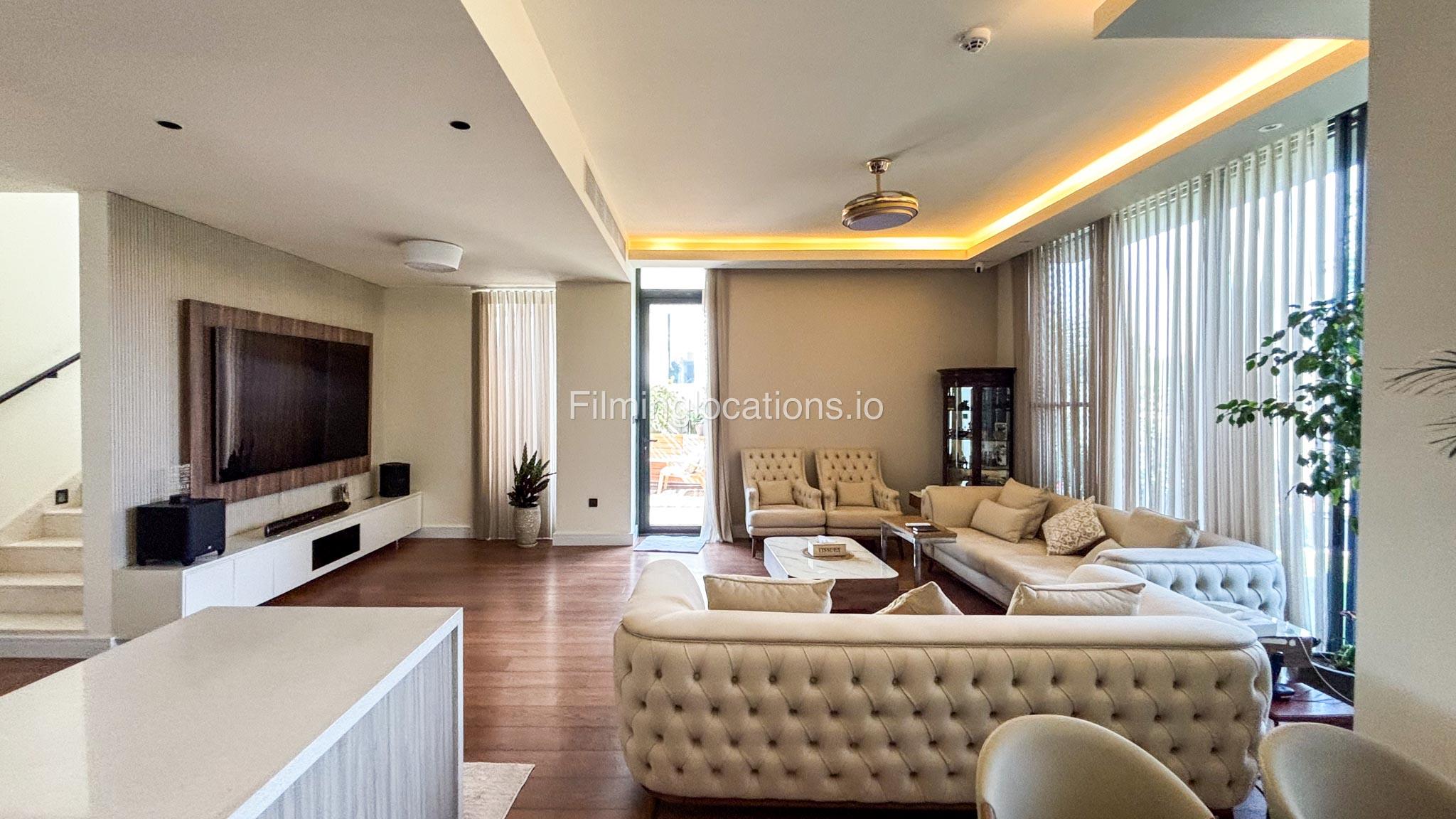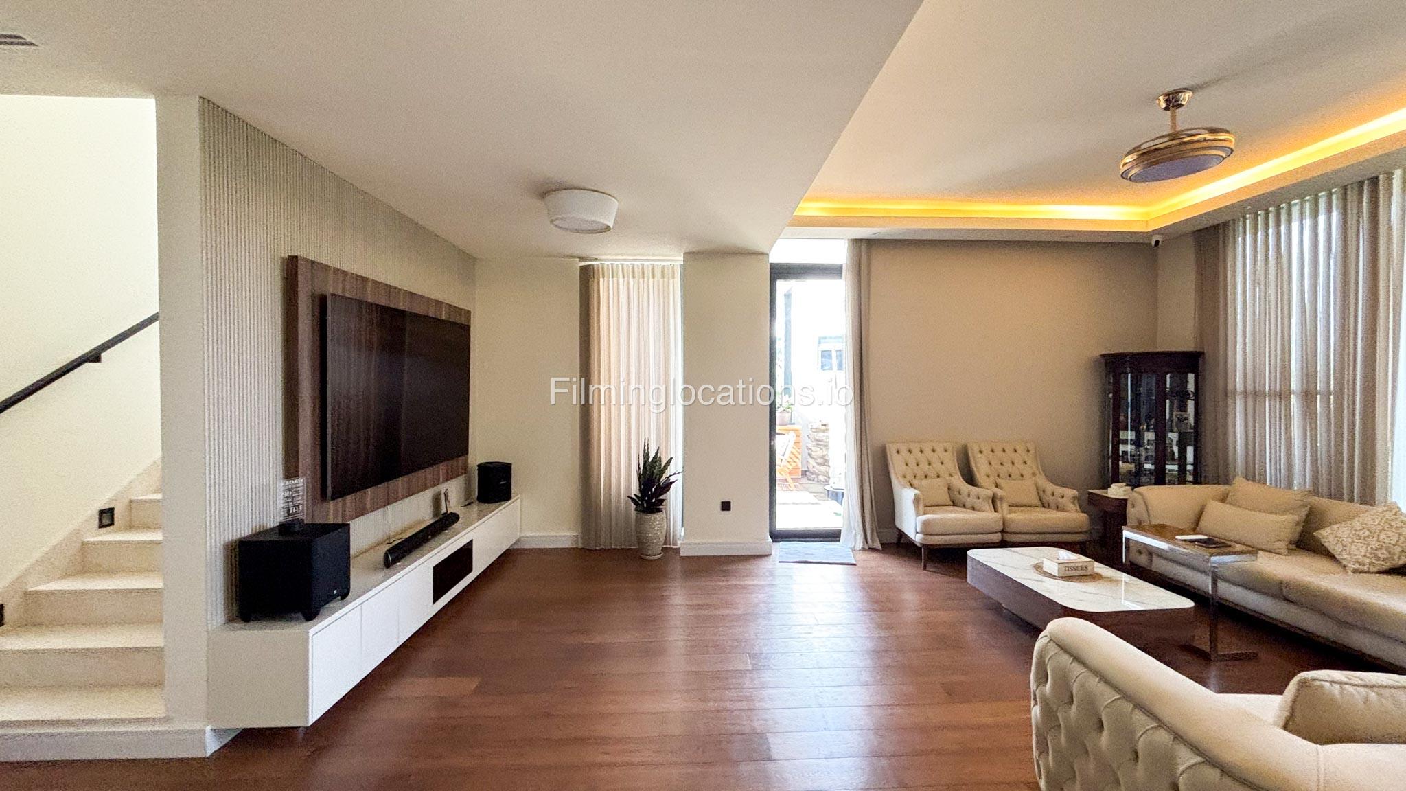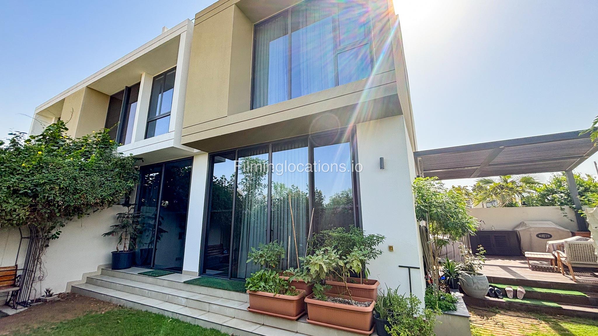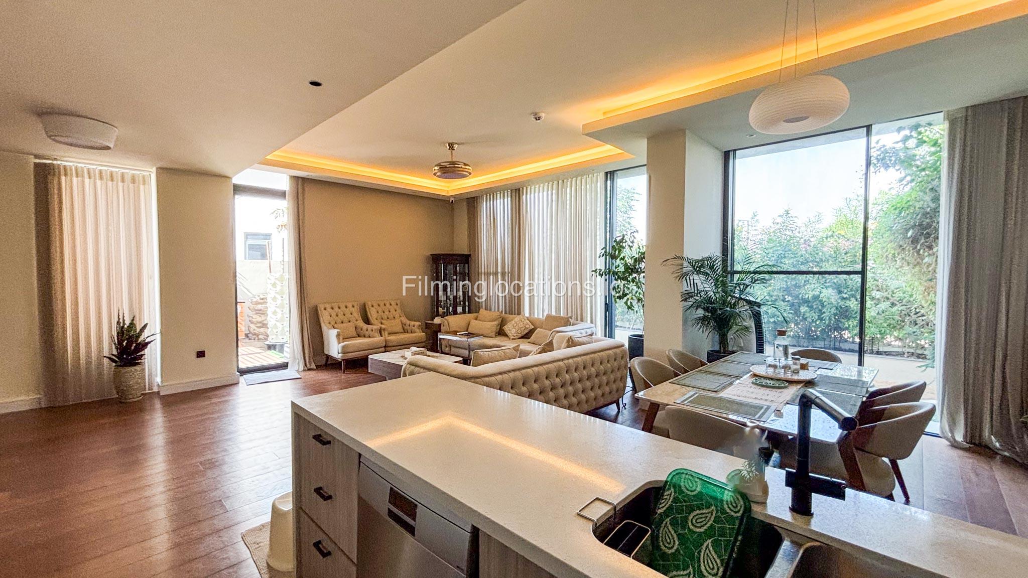 Our stylish 3-bedroom villa offers a sleek living room with wooden flooring, elegant couch seating facing the TV, and full window walls that bring in abundant natural light. The space includes a cozy dining area and an open kitchen with a central island and unique contemporary wall décor. Upstairs features 3 bedrooms and 1 small room with a large window, all accessible via a modern staircase. The maid's room is located on the ground floor. Outdoors, you’ll find a lush green landscaped garden with a cozy seating area and BBQ corner. The villa also includes access to the rooftop terrace for additional filming flexibility.