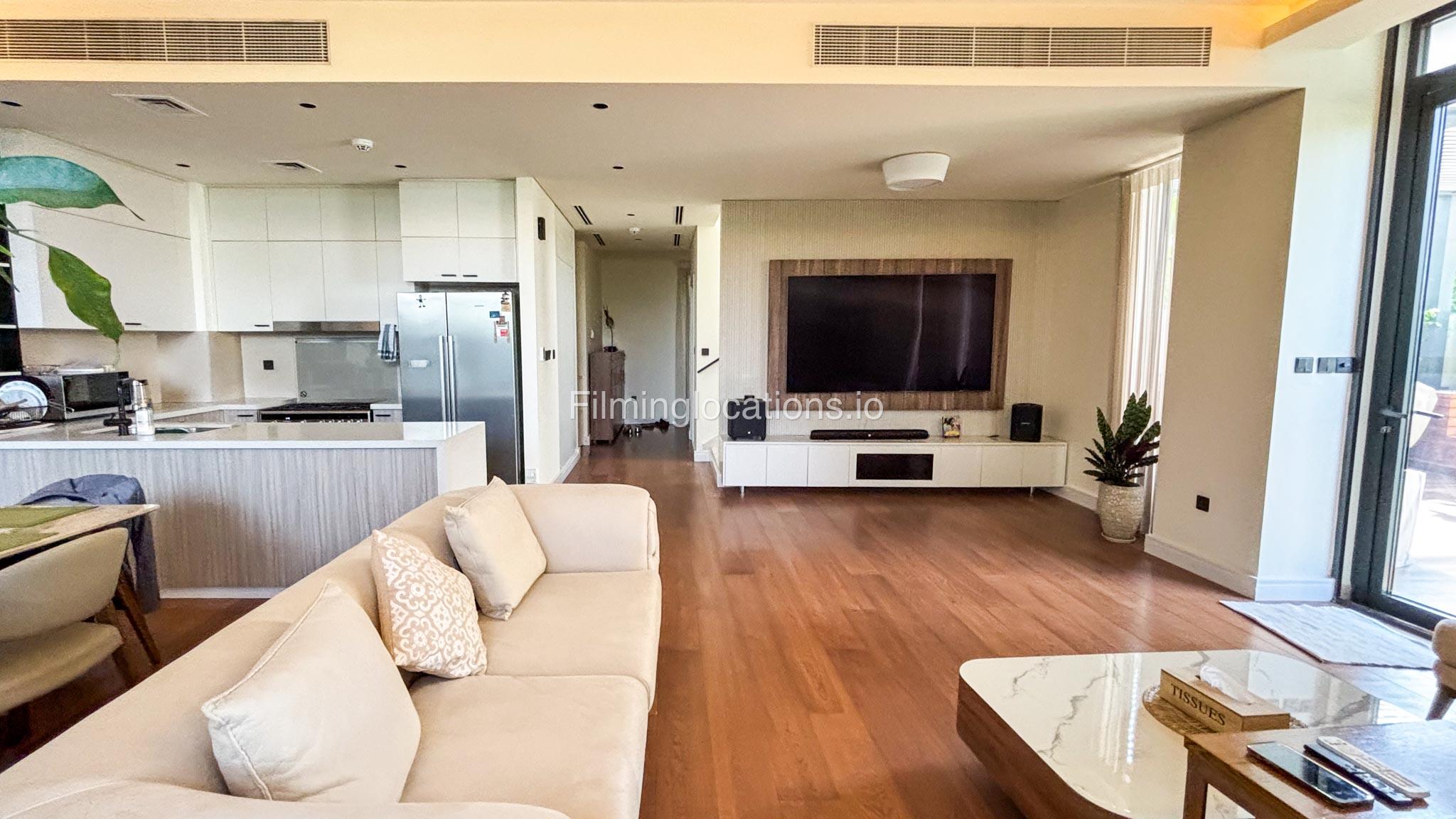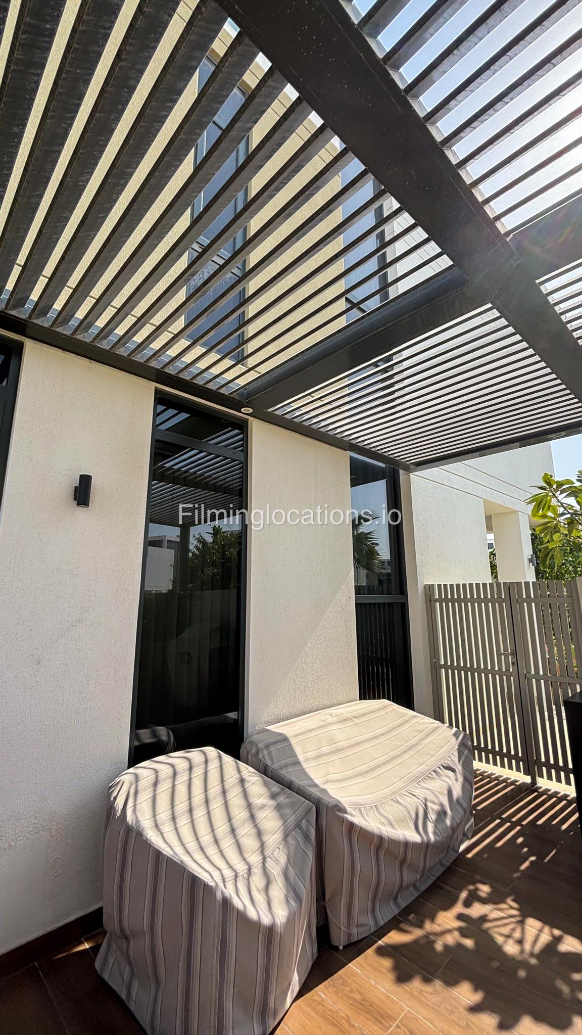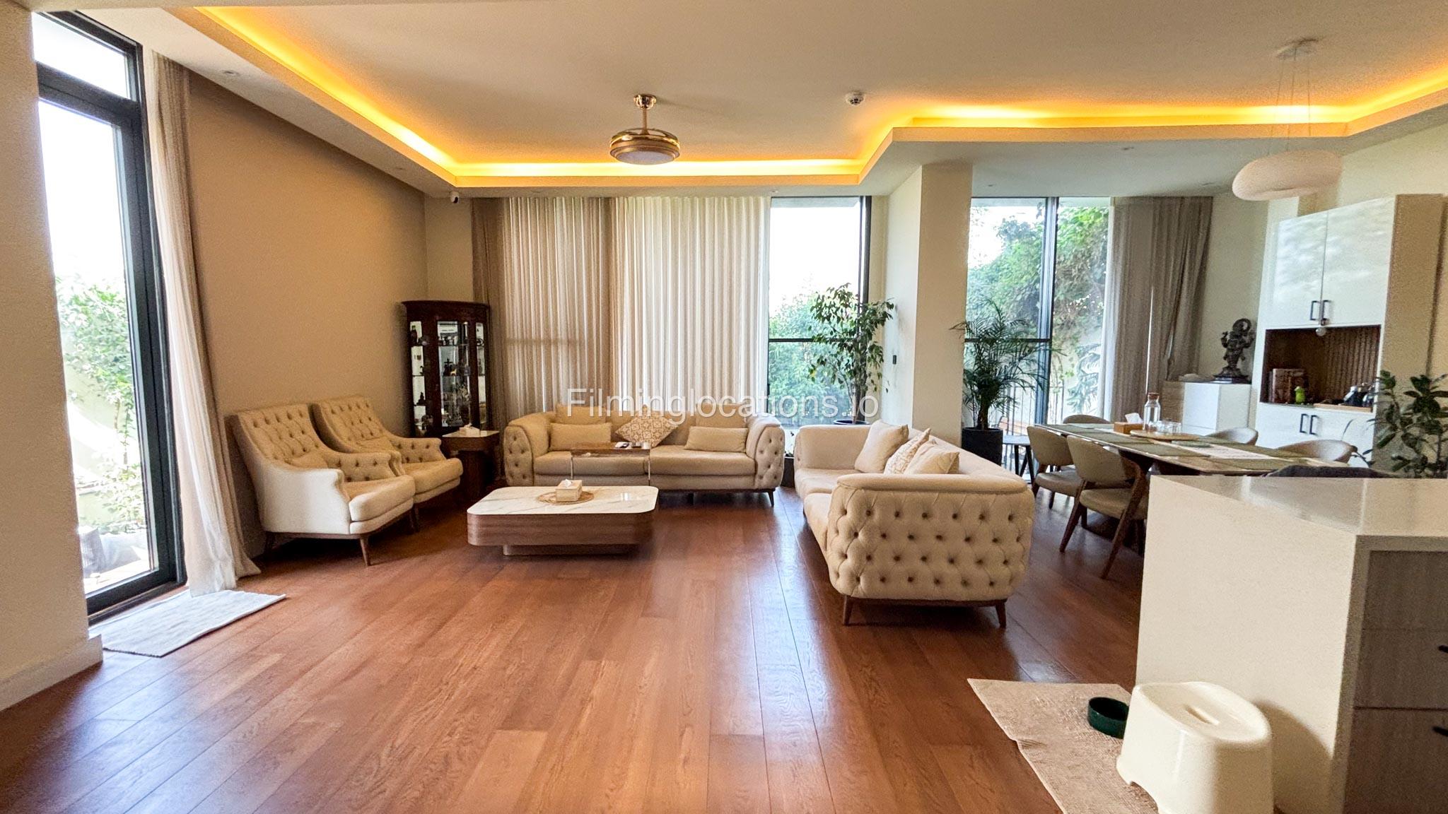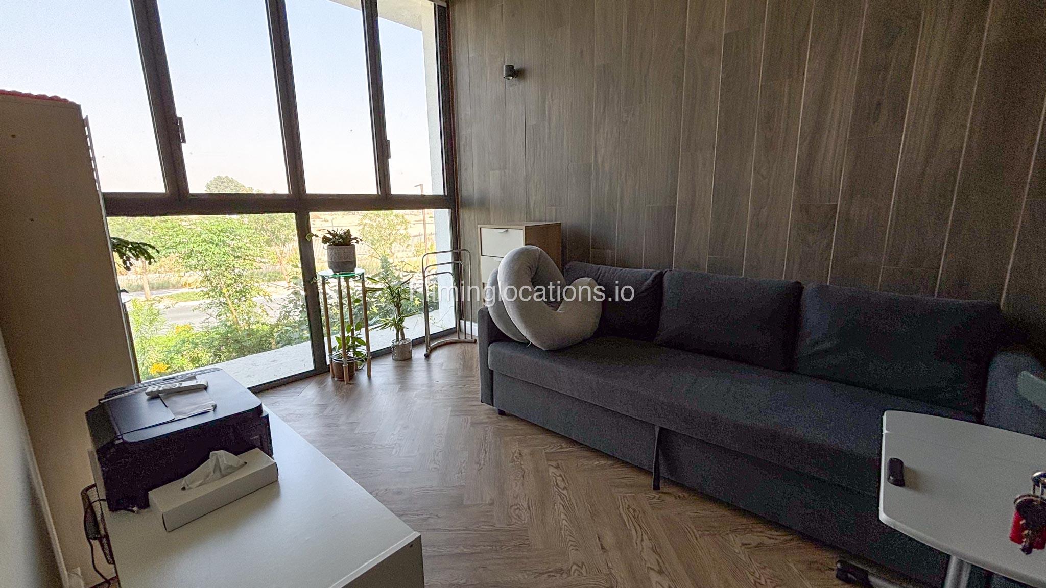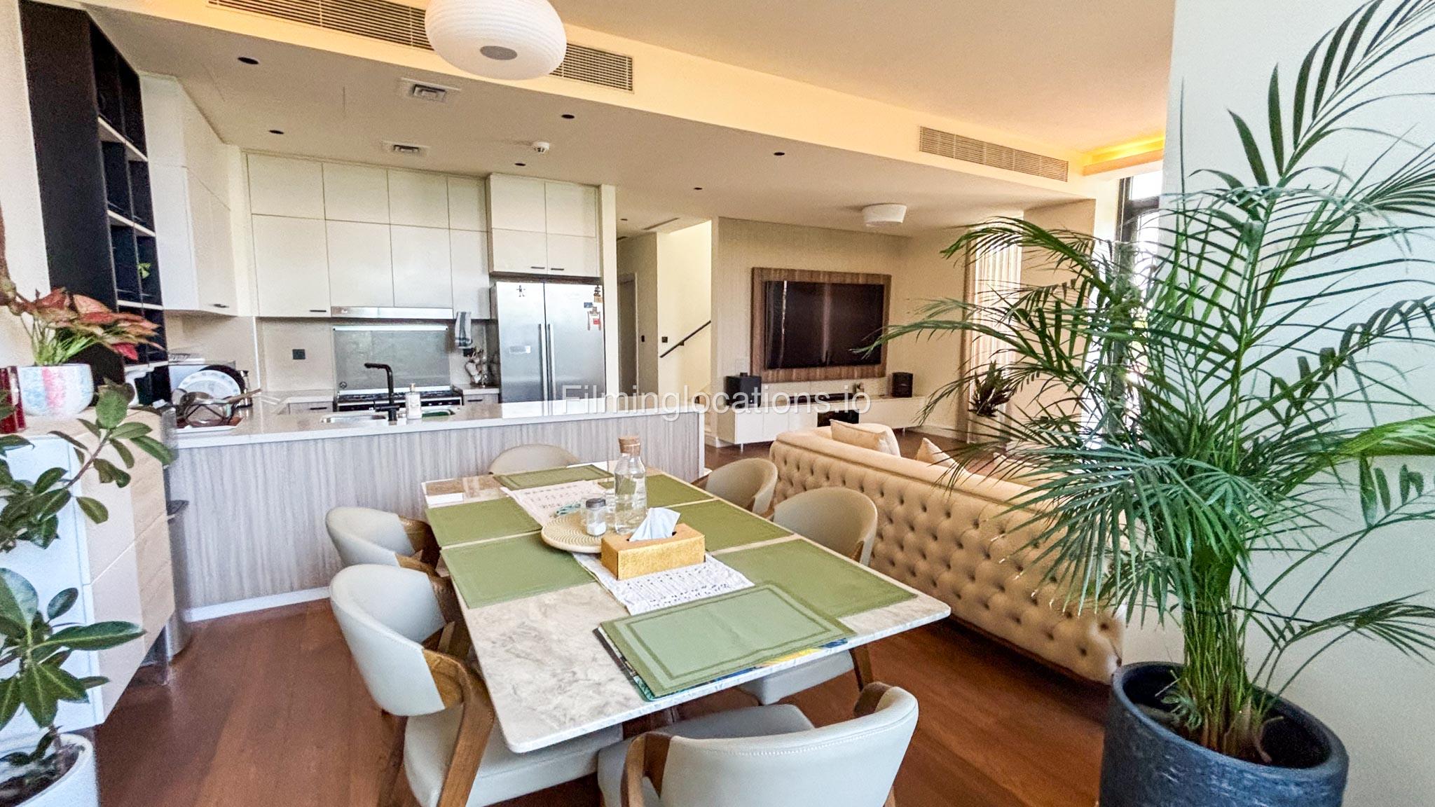 Our stylish 3-bedroom villa offers a sleek living room with wooden flooring, elegant couch seating facing the TV, and full window walls that bring in abundant natural light. The space includes a cozy dining area and an open kitchen with a central island and unique contemporary wall décor. Upstairs features 3 bedrooms and 1 small room with a large window, all accessible via a modern staircase. The maid's room is located on the ground floor. Outdoors, you’ll find a lush green landscaped garden with a cozy seating area and BBQ corner. The villa also includes access to the rooftop terrace for additional filming flexibility.