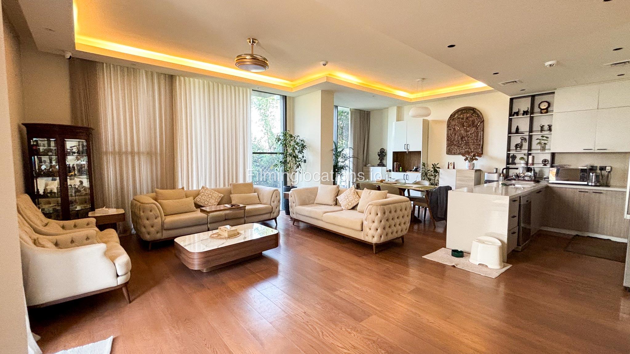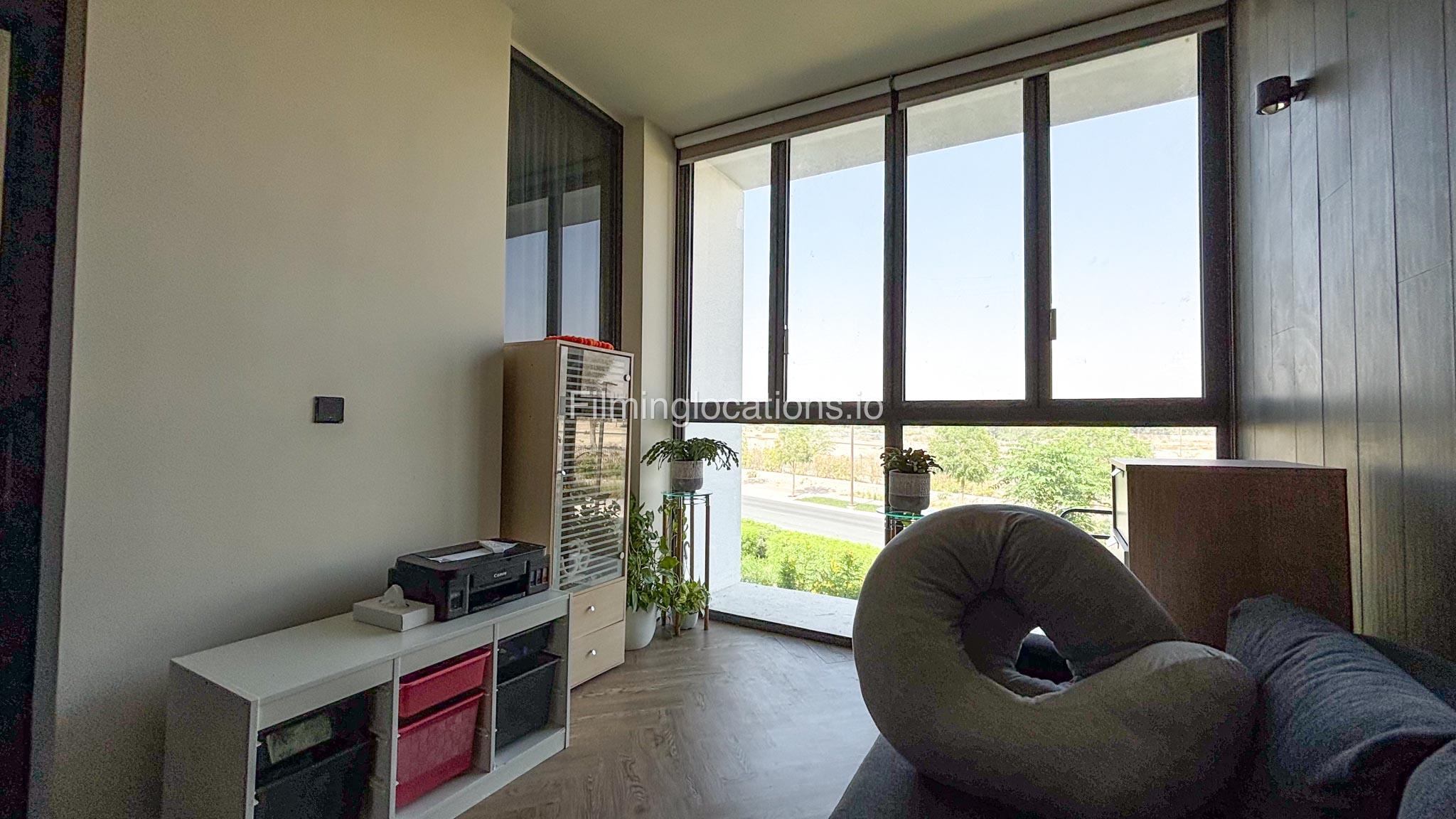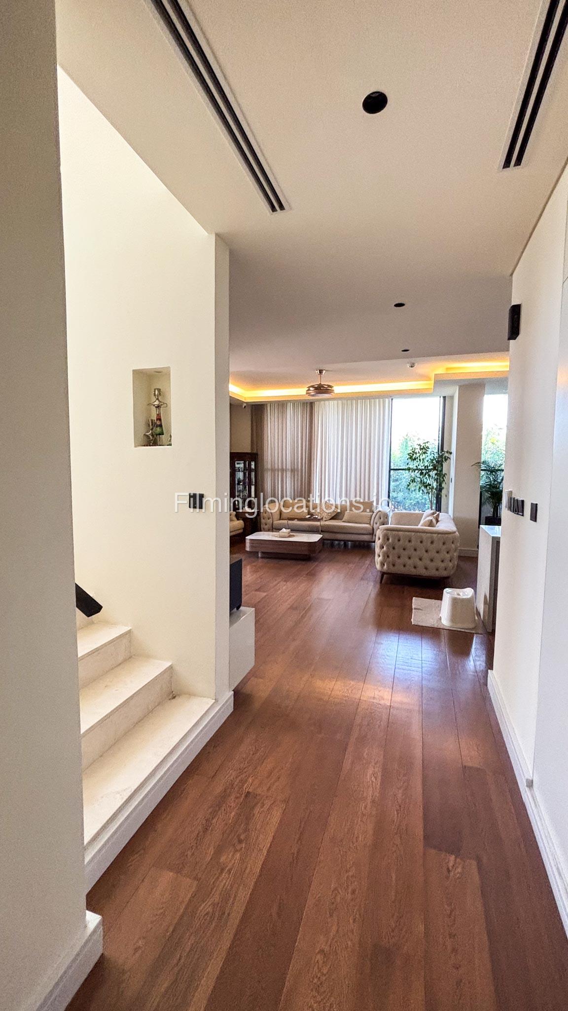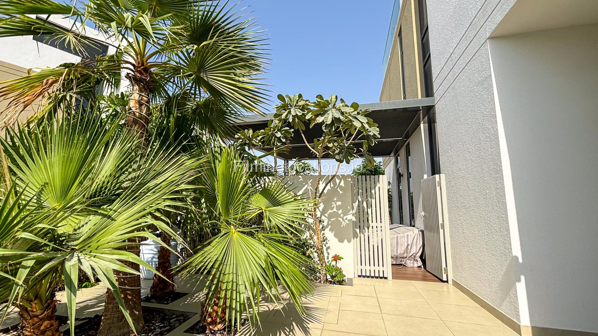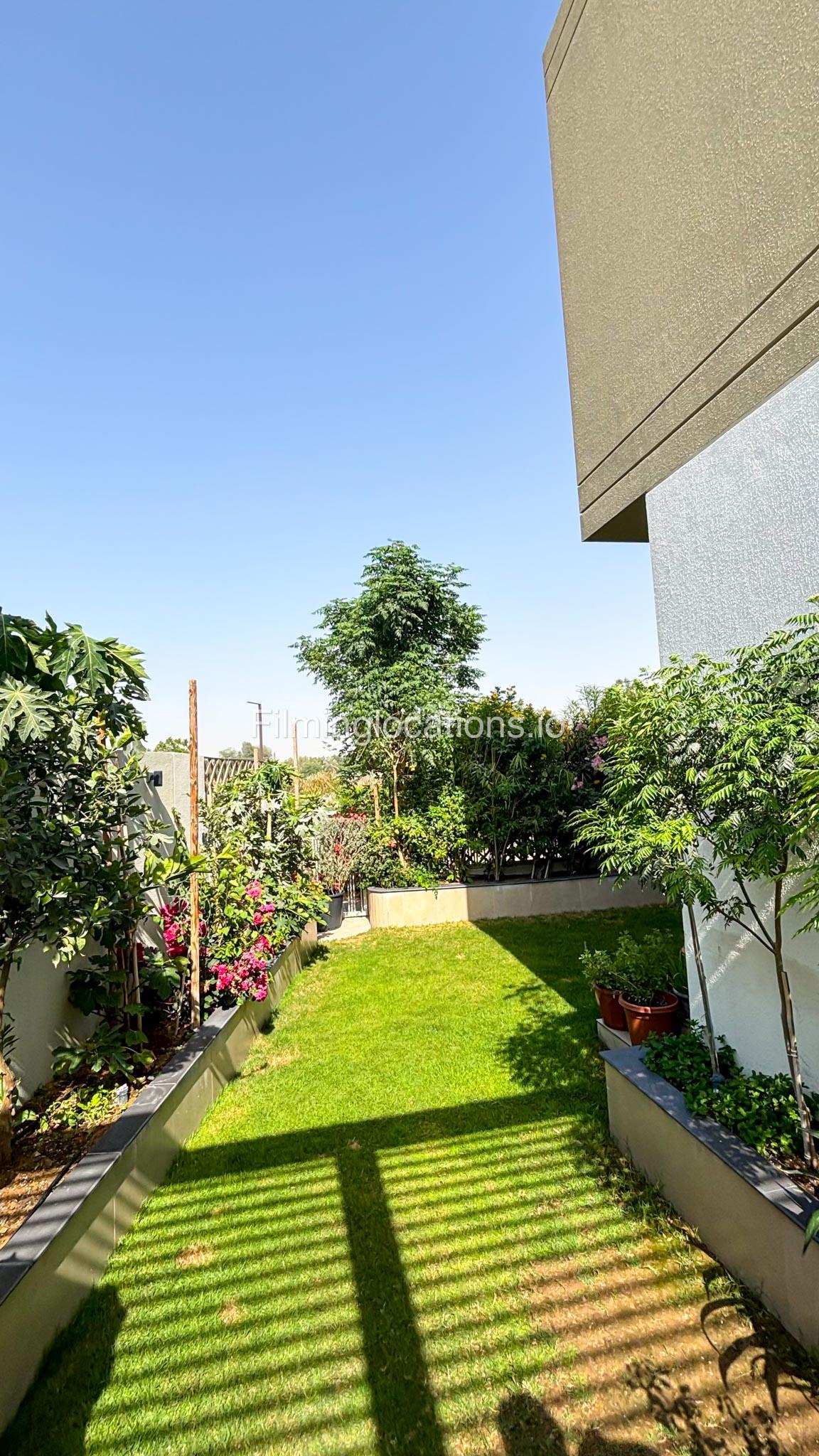 Our stylish 3-bedroom villa offers a sleek living room with wooden flooring, elegant couch seating facing the TV, and full window walls that bring in abundant natural light. The space includes a cozy dining area and an open kitchen with a central island and unique contemporary wall décor. Upstairs features 3 bedrooms and 1 small room with a large window, all accessible via a modern staircase. The maid's room is located on the ground floor. Outdoors, you’ll find a lush green landscaped garden with a cozy seating area and BBQ corner. The villa also includes access to the rooftop terrace for additional filming flexibility.
