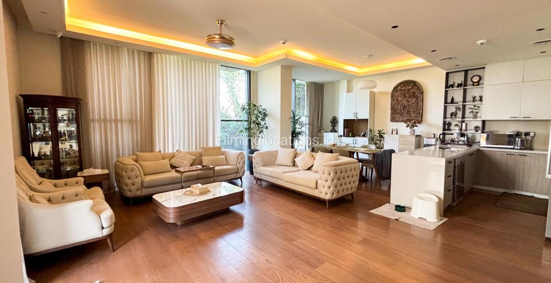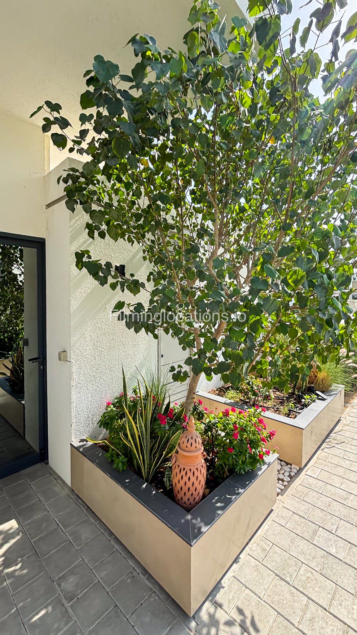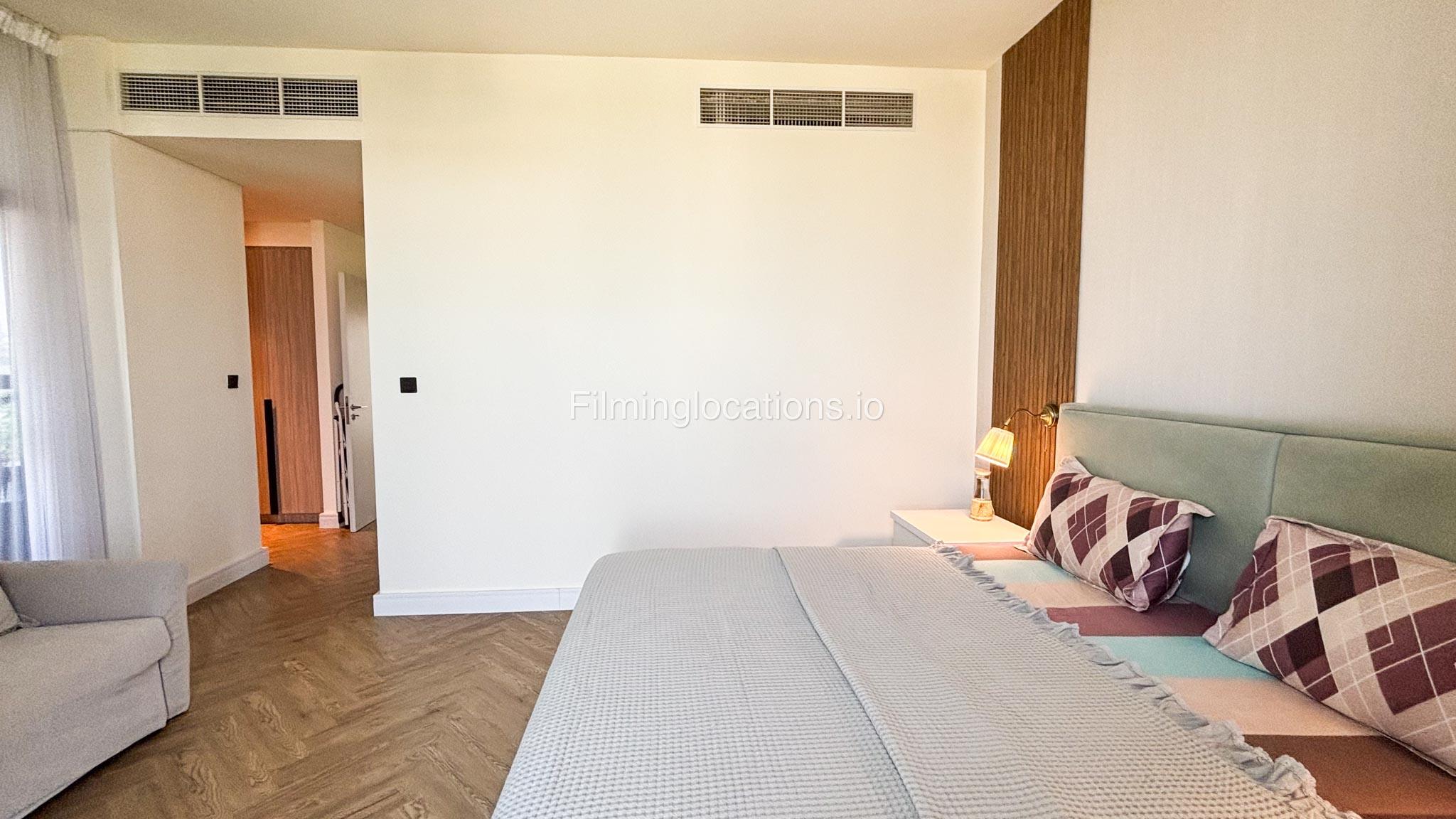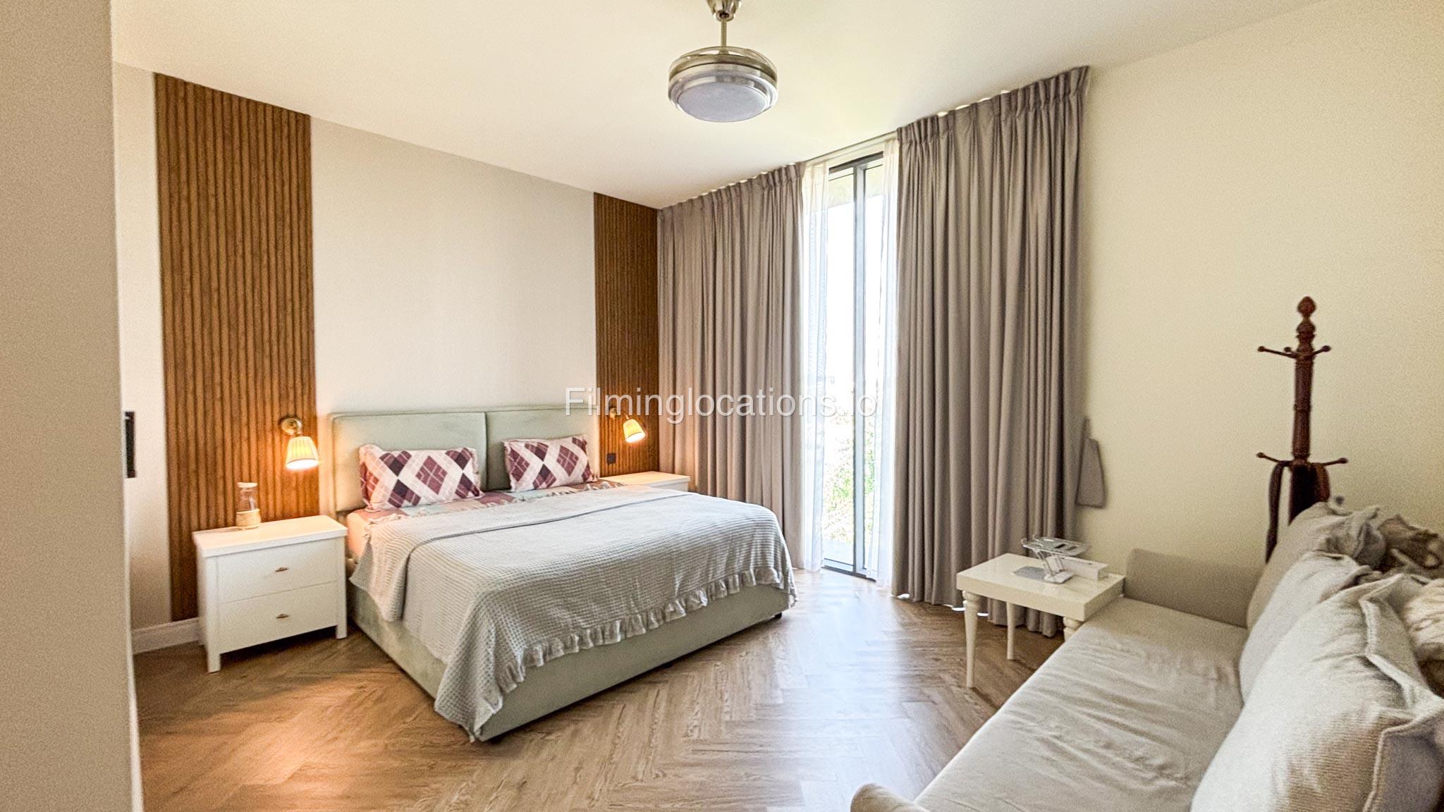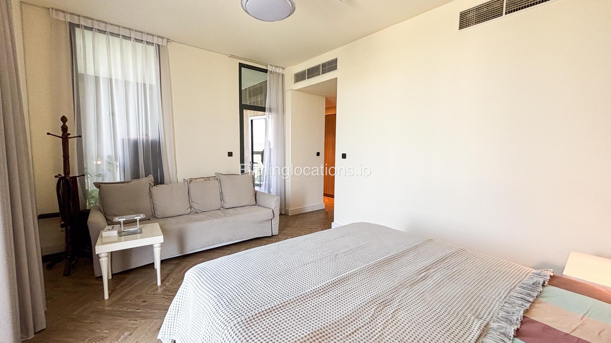 Our stylish 3-bedroom villa offers a sleek living room with wooden flooring, elegant couch seating facing the TV, and full window walls that bring in abundant natural light. The space includes a cozy dining area and an open kitchen with a central island and unique contemporary wall décor. Upstairs features 3 bedrooms and 1 small room with a large window, all accessible via a modern staircase. The maid's room is located on the ground floor. Outdoors, you’ll find a lush green landscaped garden with a cozy seating area and BBQ corner. The villa also includes access to the rooftop terrace for additional filming flexibility.