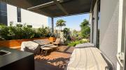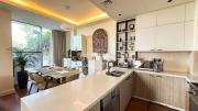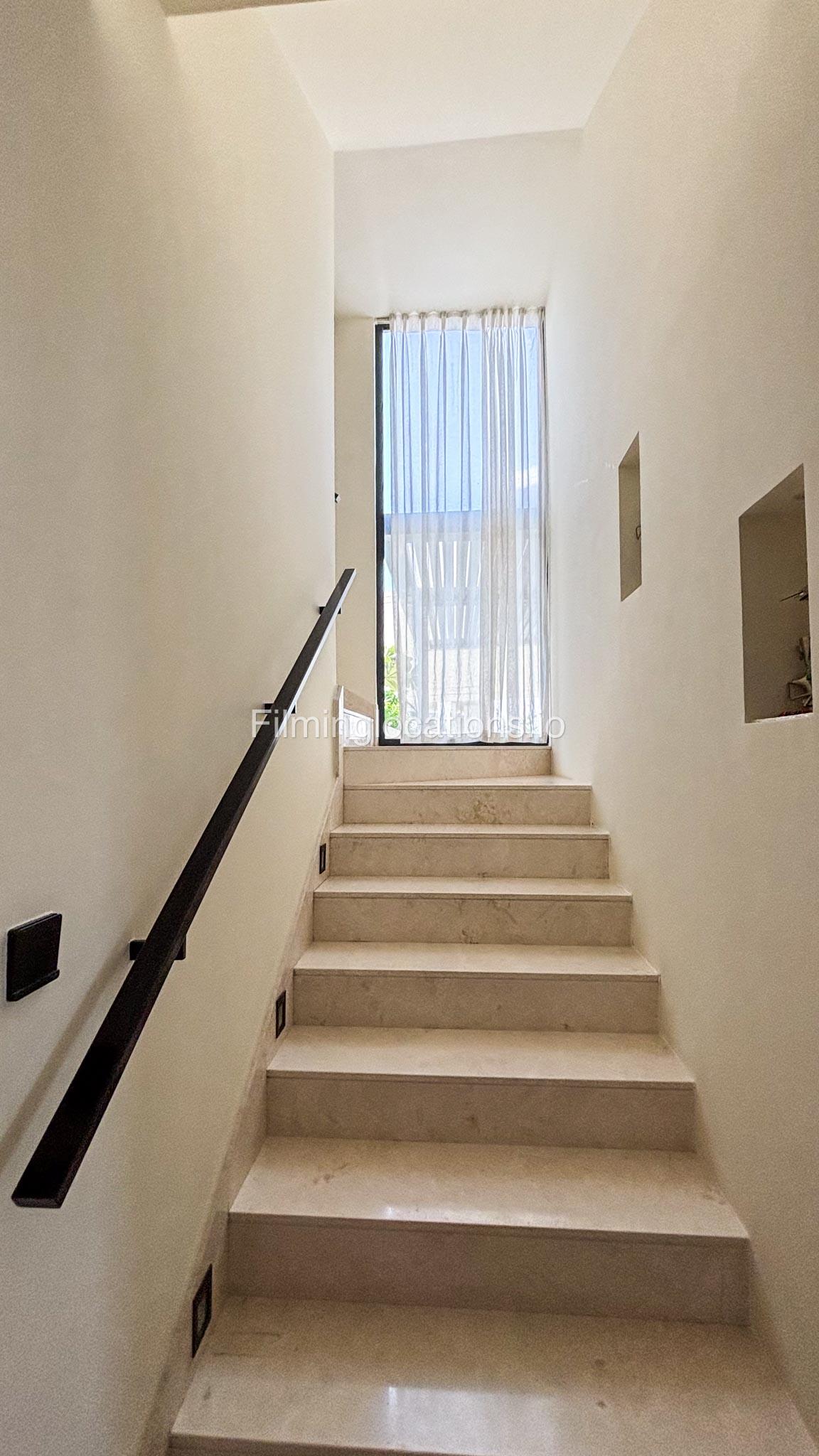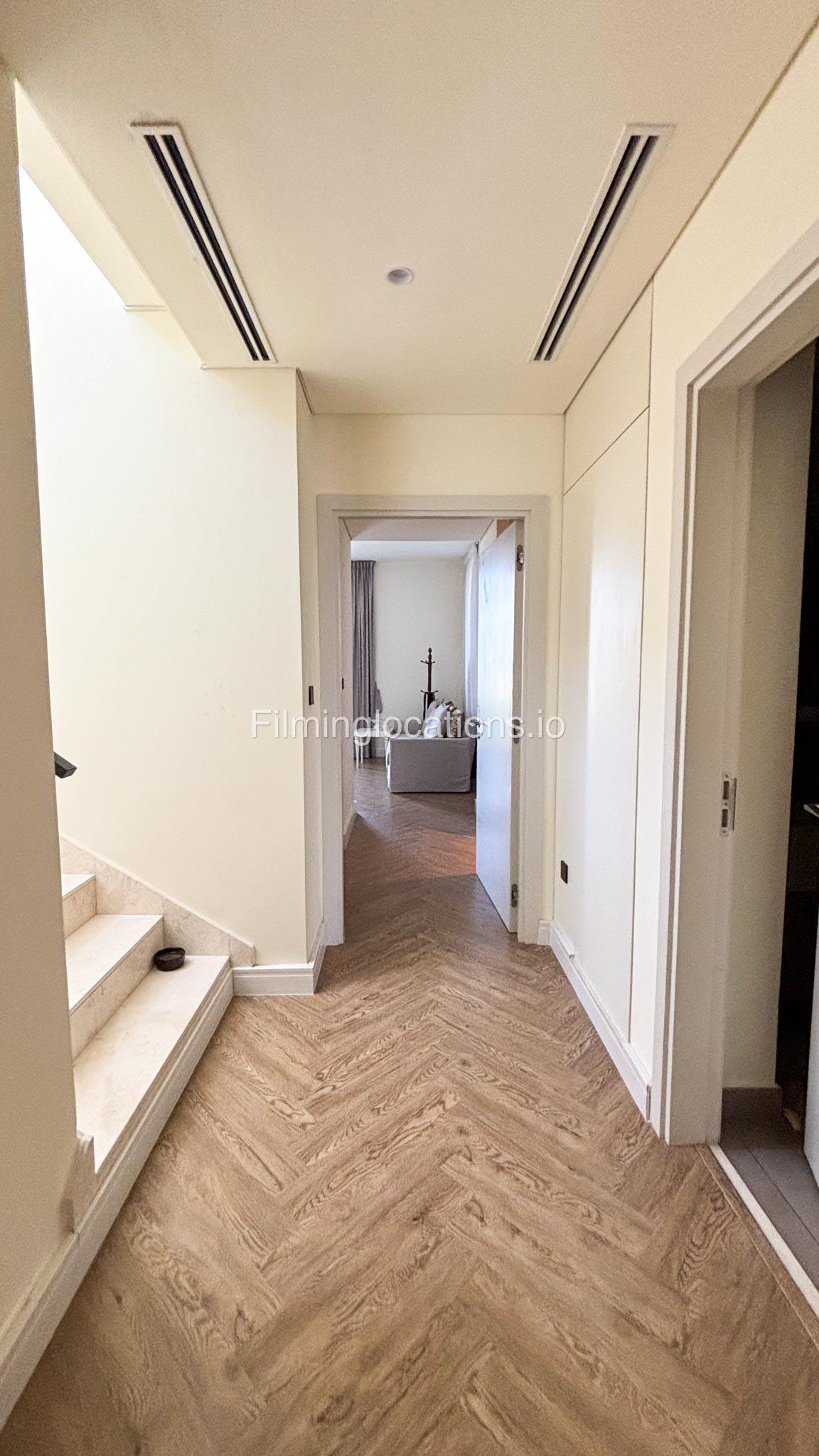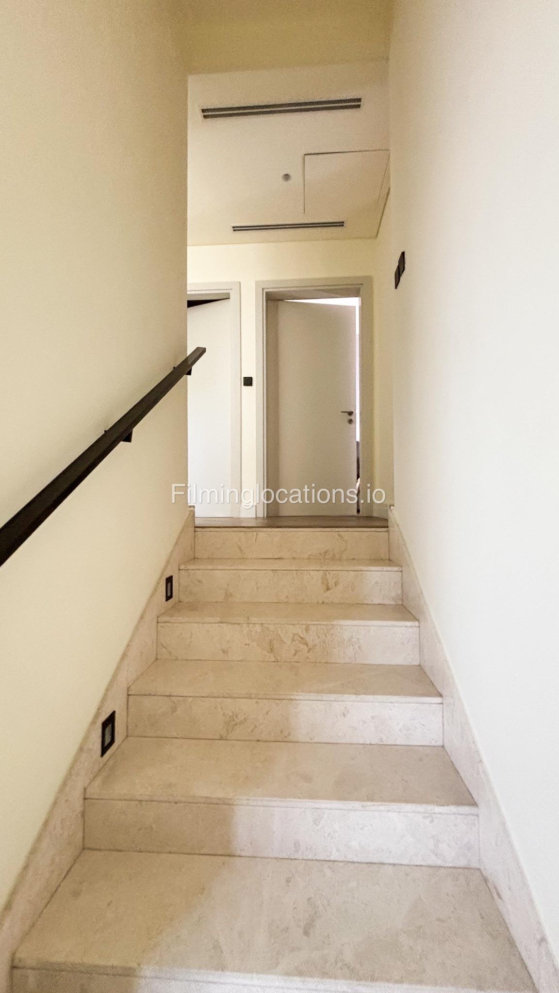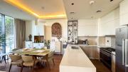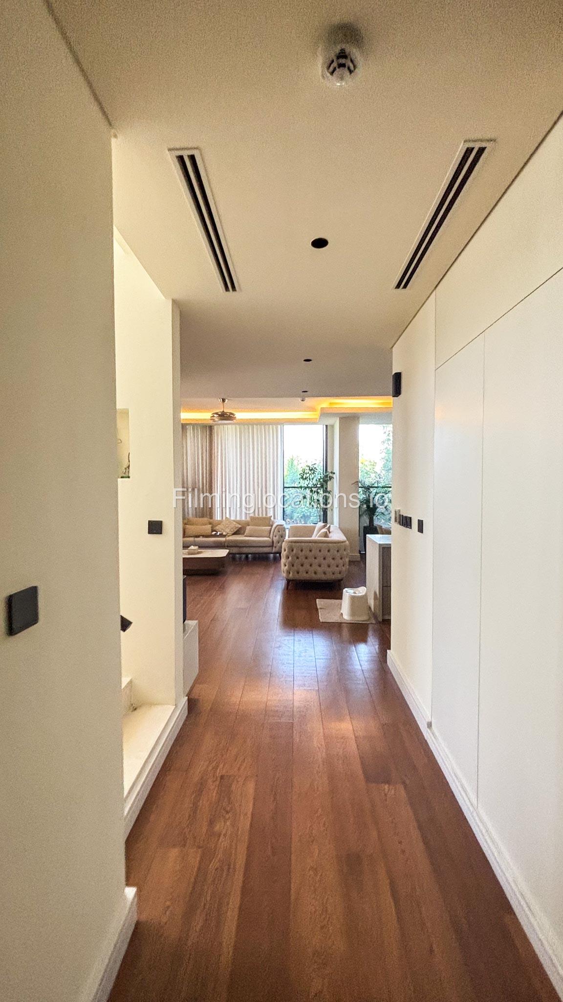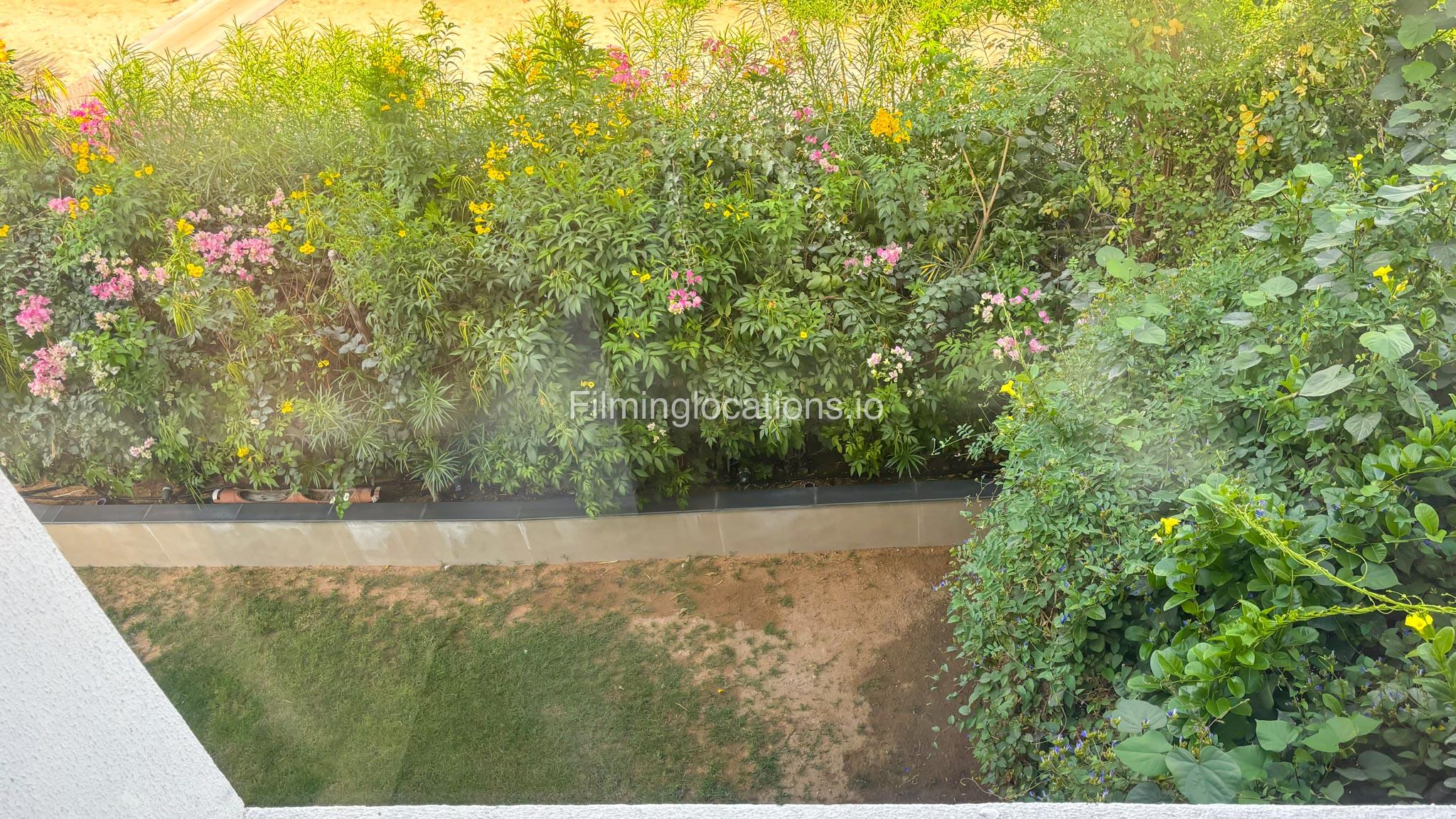 Our stylish 3-bedroom villa offers a sleek living room with wooden flooring, elegant couch seating facing the TV, and full window walls that bring in abundant natural light. The space includes a cozy dining area and an open kitchen with a central island and unique contemporary wall décor. Upstairs features 3 bedrooms and 1 small room with a large window, all accessible via a modern staircase. The maid's room is located on the ground floor. Outdoors, you’ll find a lush green landscaped garden with a cozy seating area and BBQ corner. The villa also includes access to the rooftop terrace for additional filming flexibility.