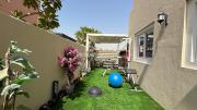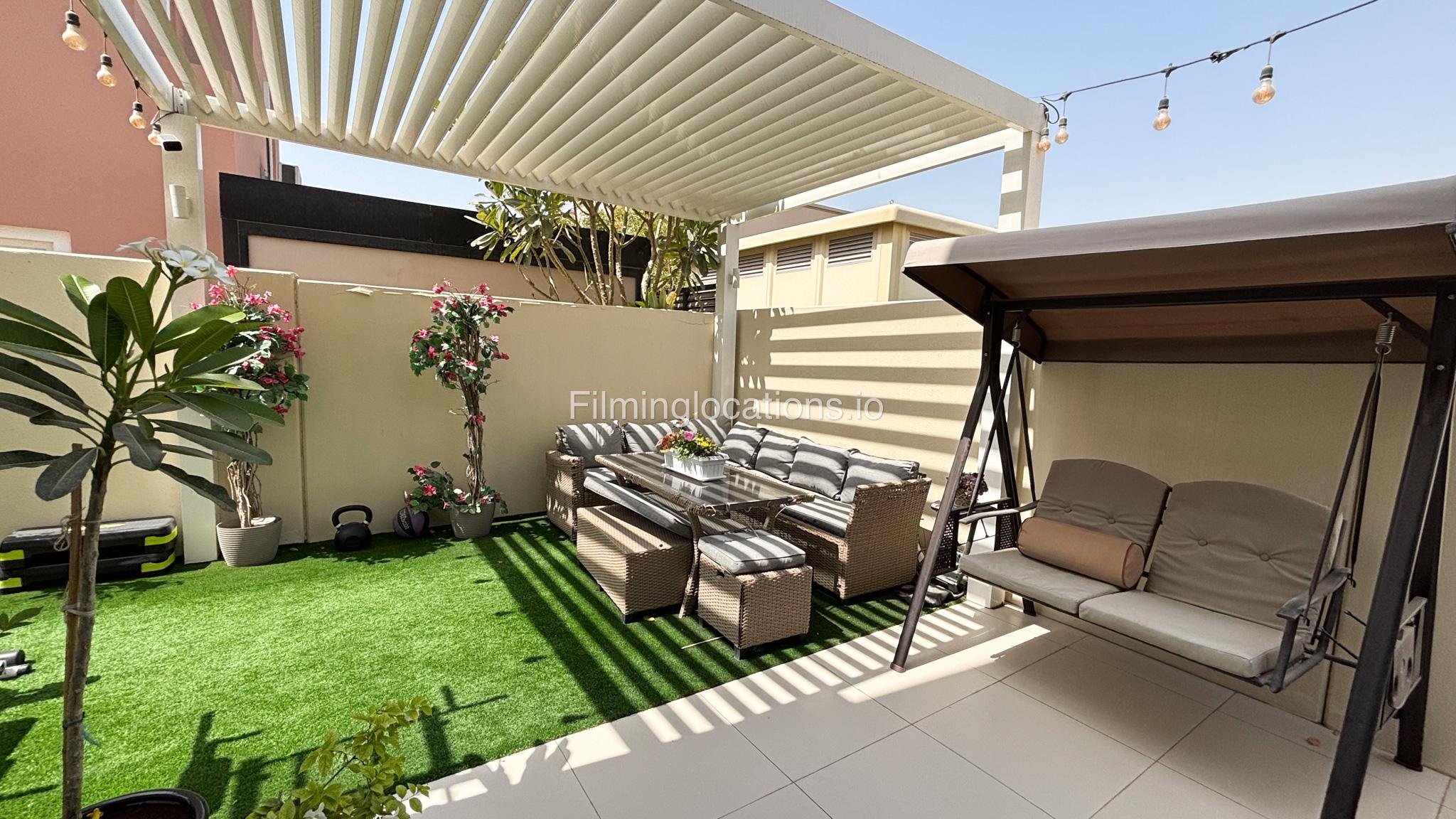 The outdoor space includes a shaded dining area overlooking a small garden with outdoor furniture. The property also includes a garage with parking space.