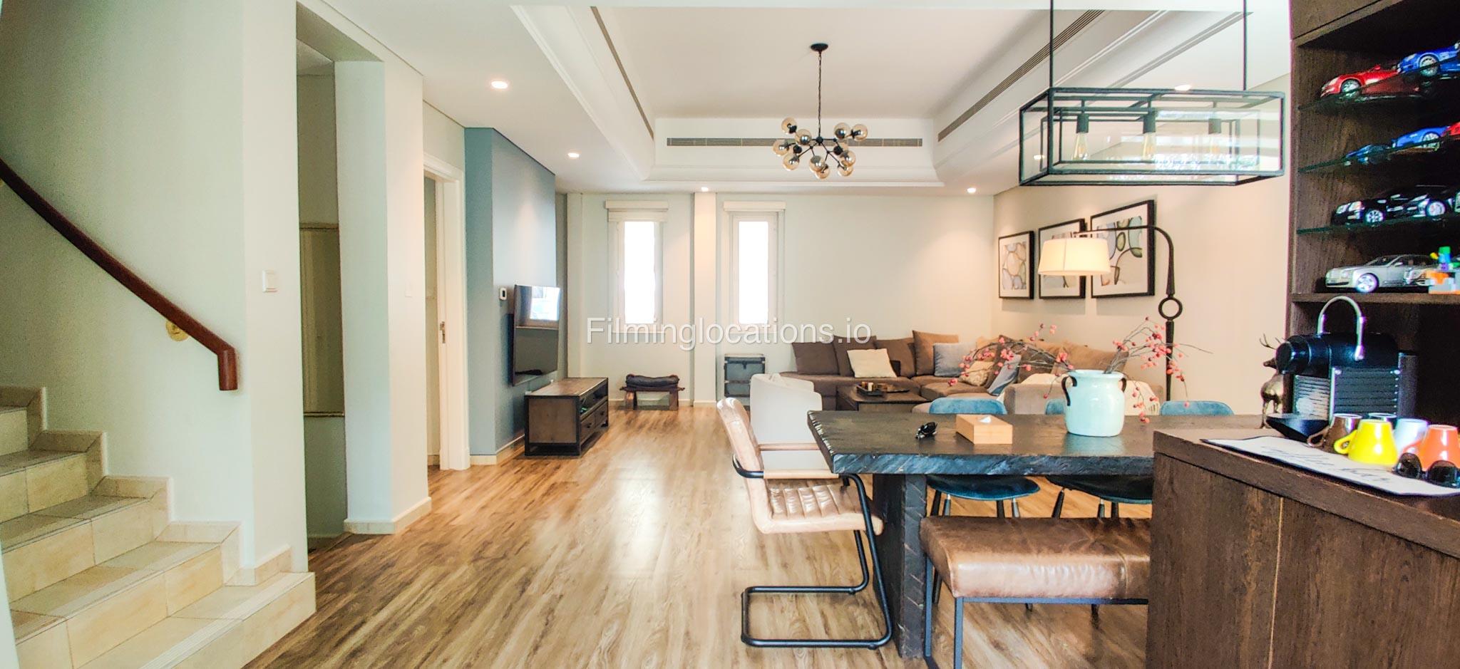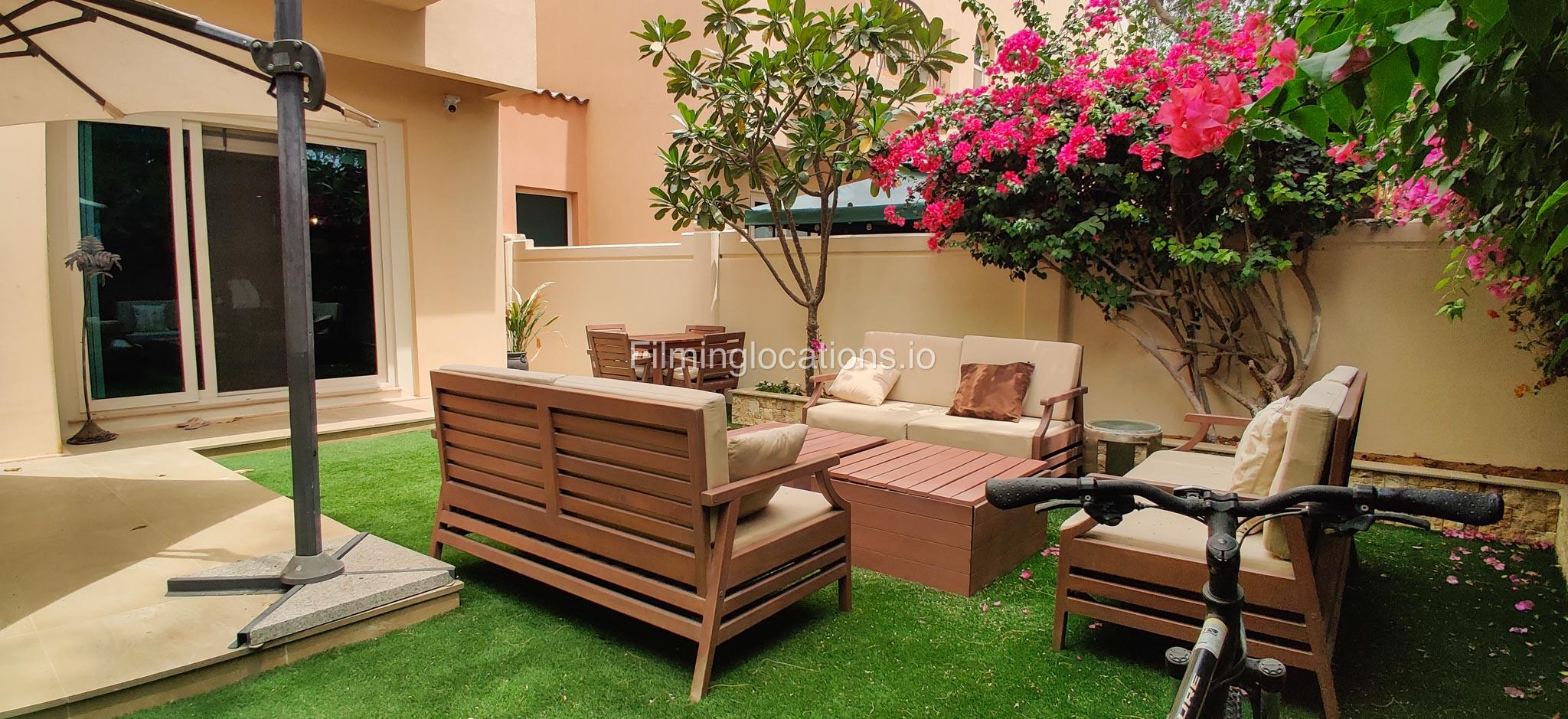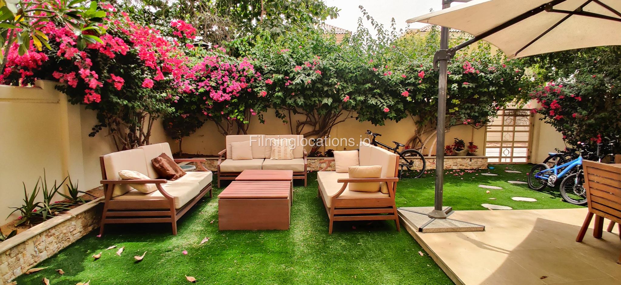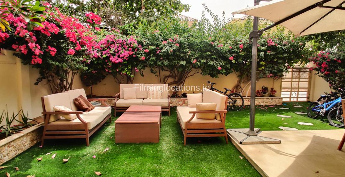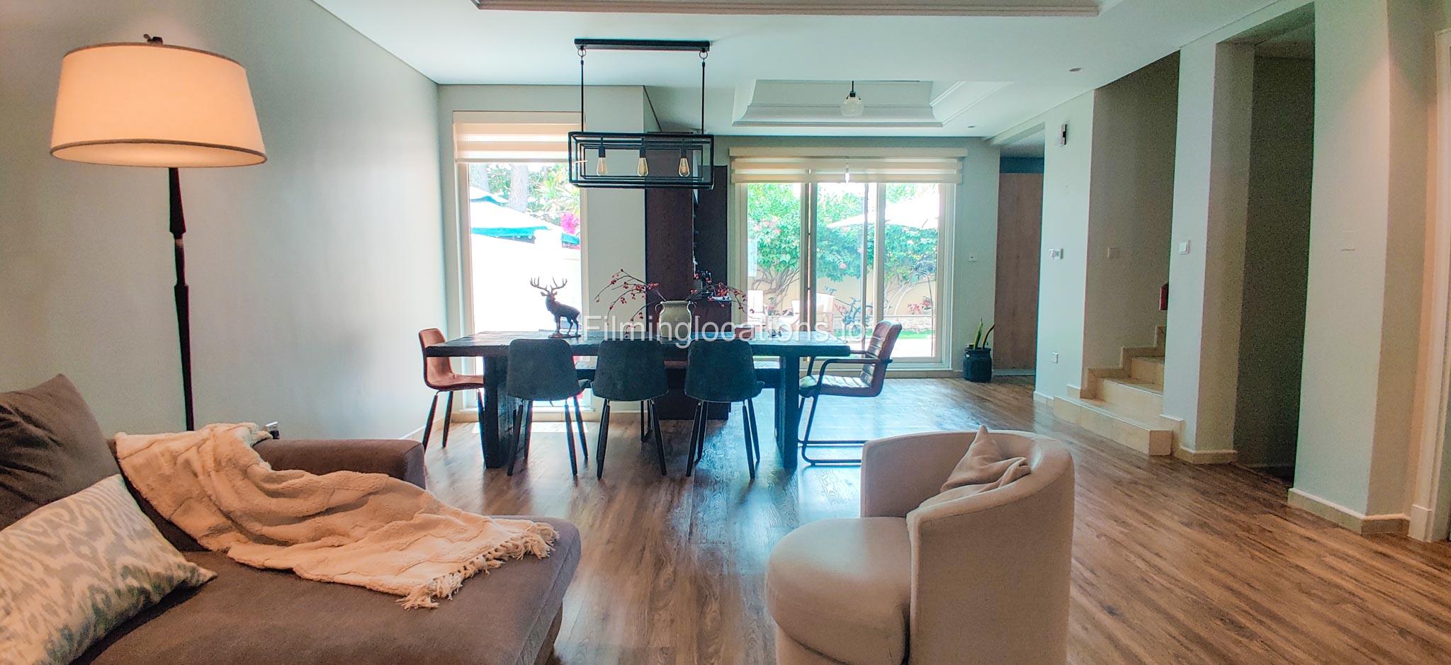 Our contemporary villa features 2 living rooms. The main one is a spacious living room with a cozy couch setup facing a wall-mounted TV, accented by window walls that bring in natural light. A modern dining area with minimalist décor sits within the same space. Adjacent to the living area, there is a compact coffee counter and a small kitchen opposite. The villa also includes a second, smaller room with a TV, sofa, and small windows. Outside, a vibrant garden with floral accents and seating provides a charming outdoor setting, with backside access for easy movement and varied shooting angles.