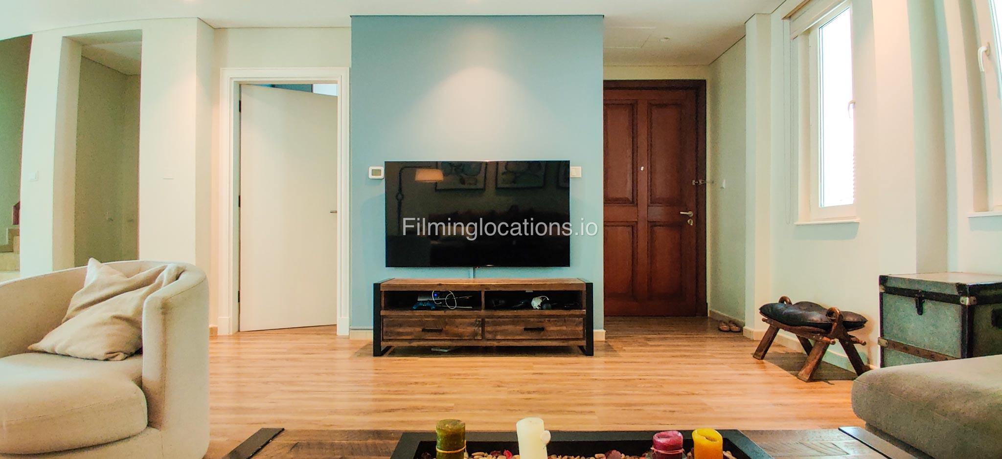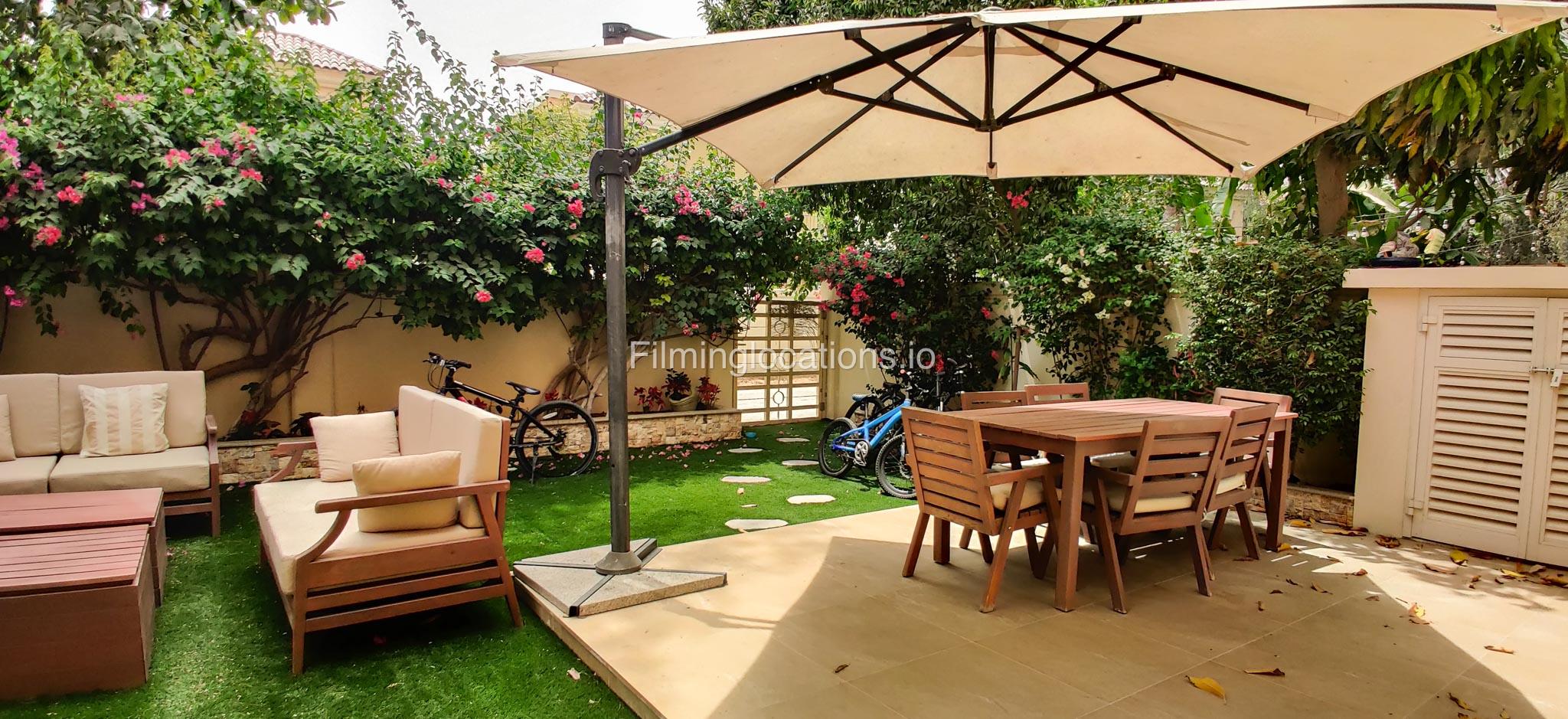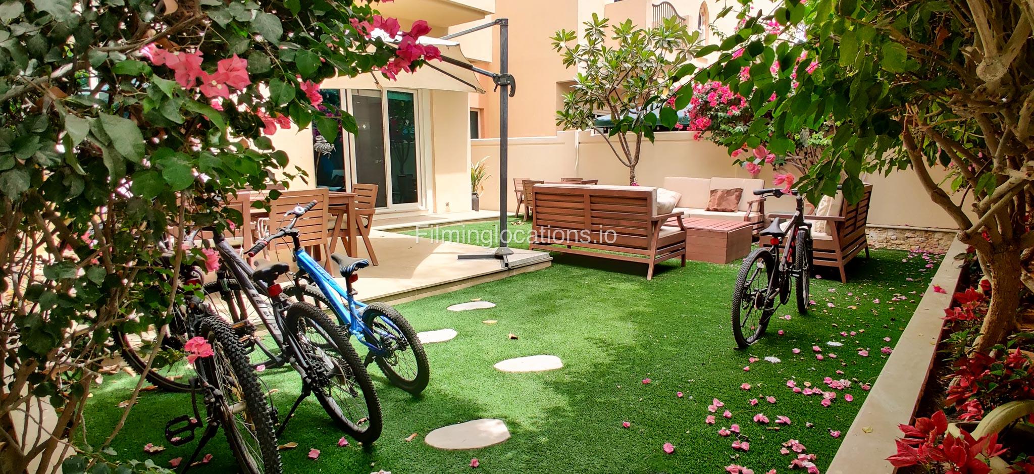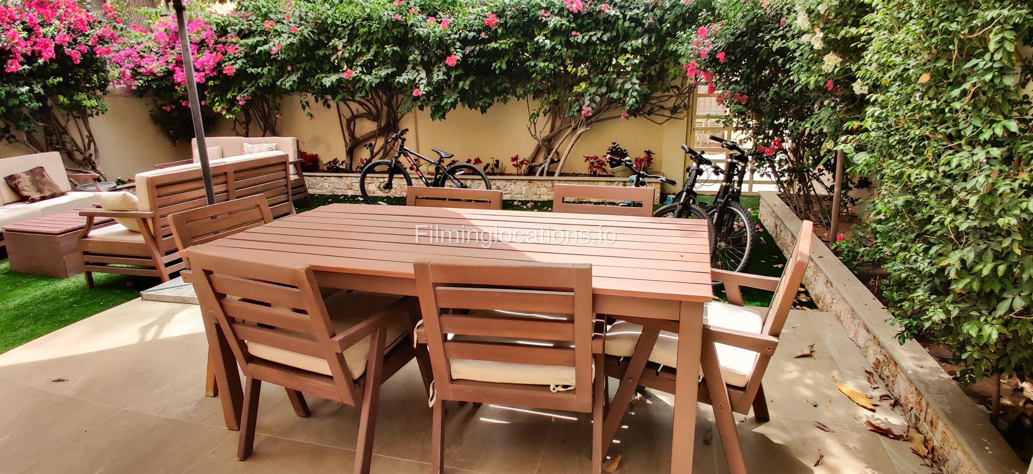 Our contemporary villa features 2 living rooms. The main one is a spacious living room with a cozy couch setup facing a wall-mounted TV, accented by window walls that bring in natural light. A modern dining area with minimalist décor sits within the same space. Adjacent to the living area, there is a compact coffee counter and a small kitchen opposite. The villa also includes a second, smaller room with a TV, sofa, and small windows. Outside, a vibrant garden with floral accents and seating provides a charming outdoor setting, with backside access for easy movement and varied shooting angles.
