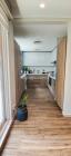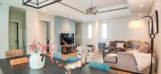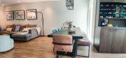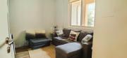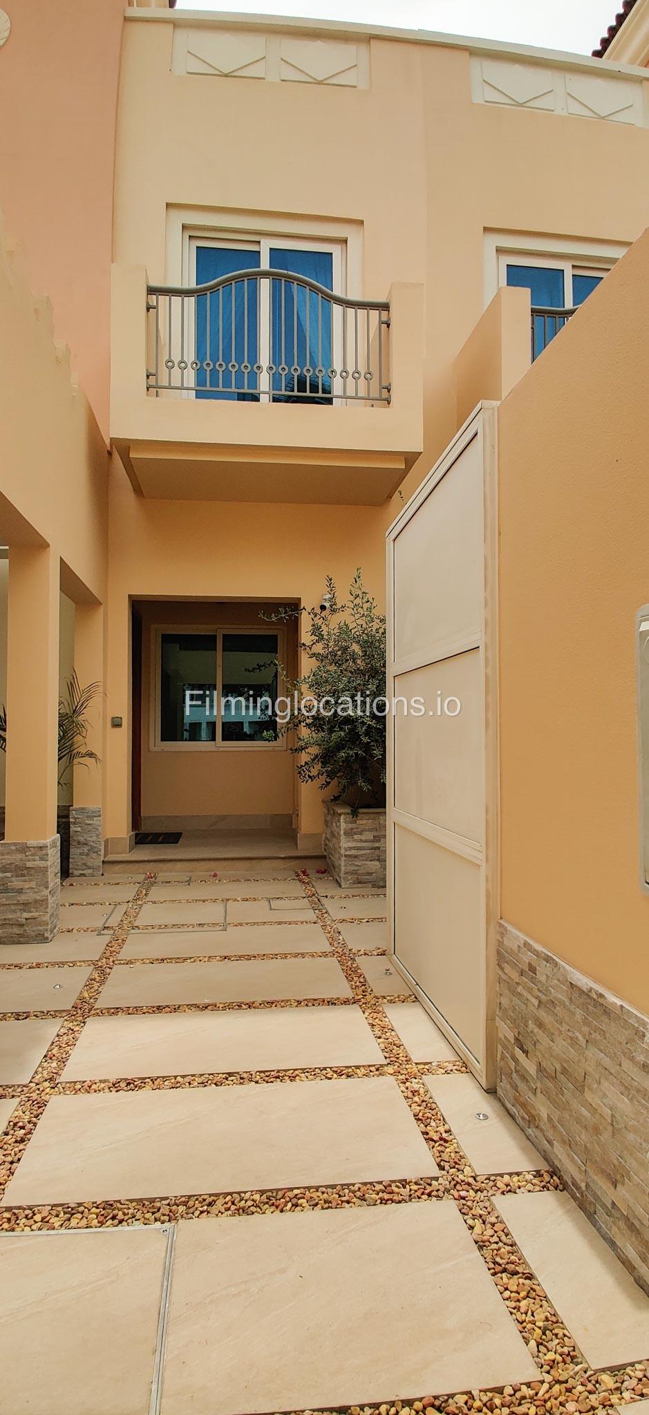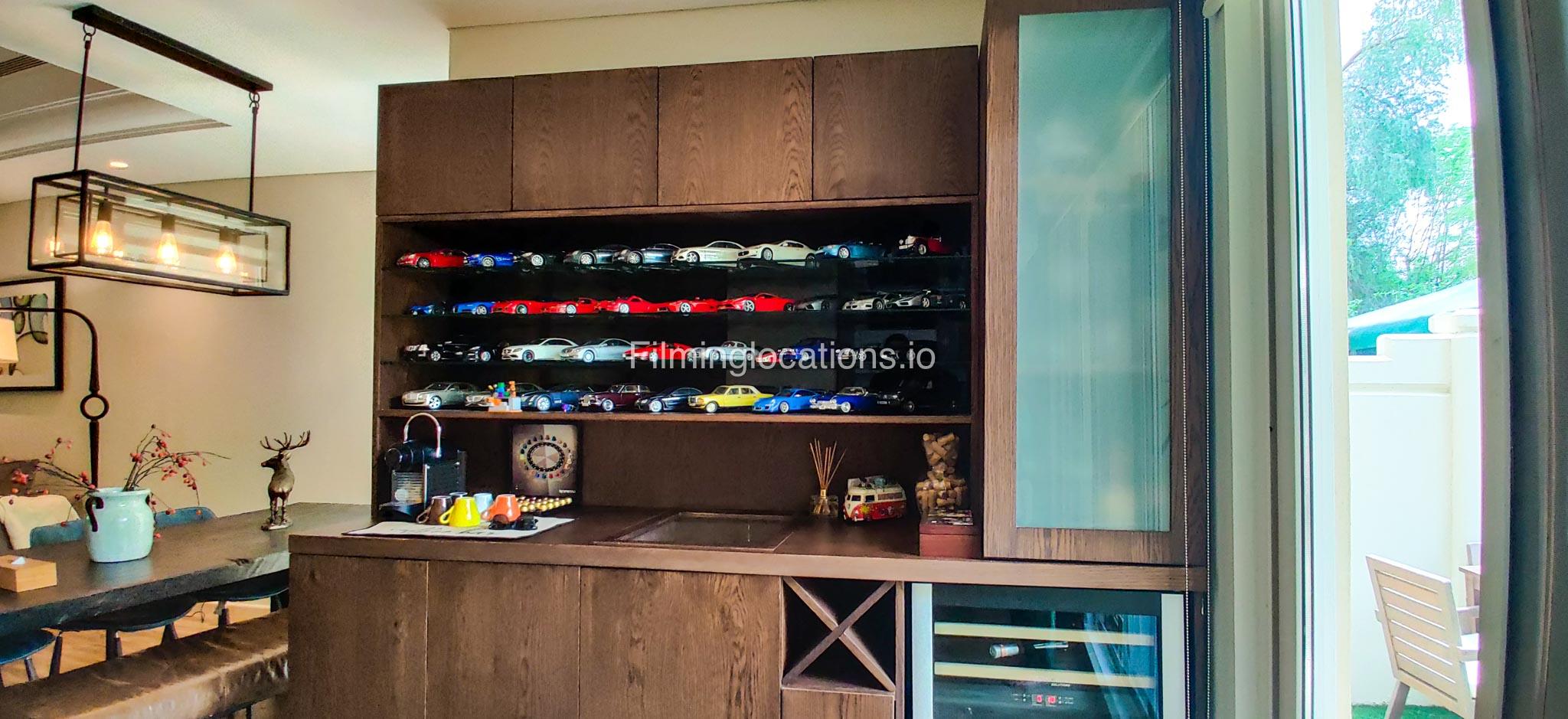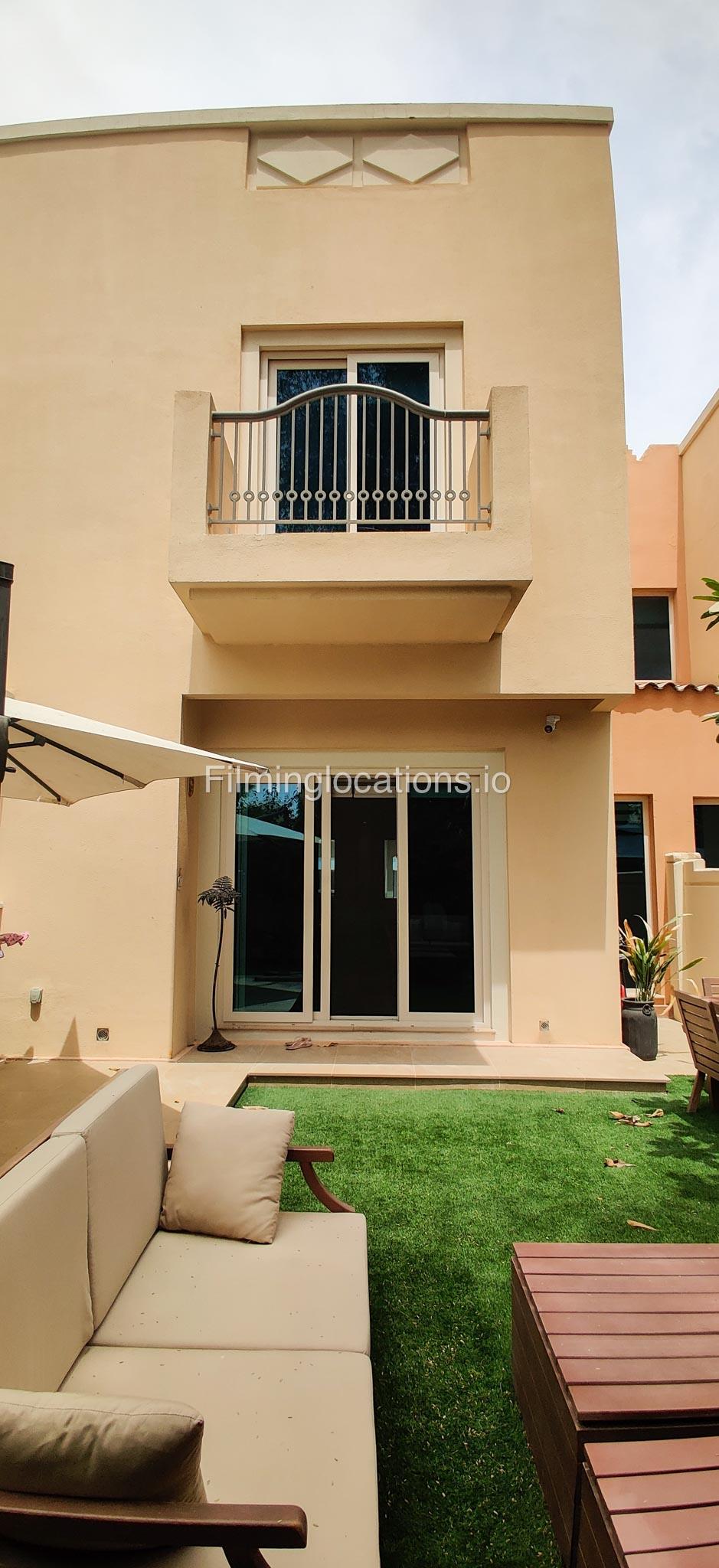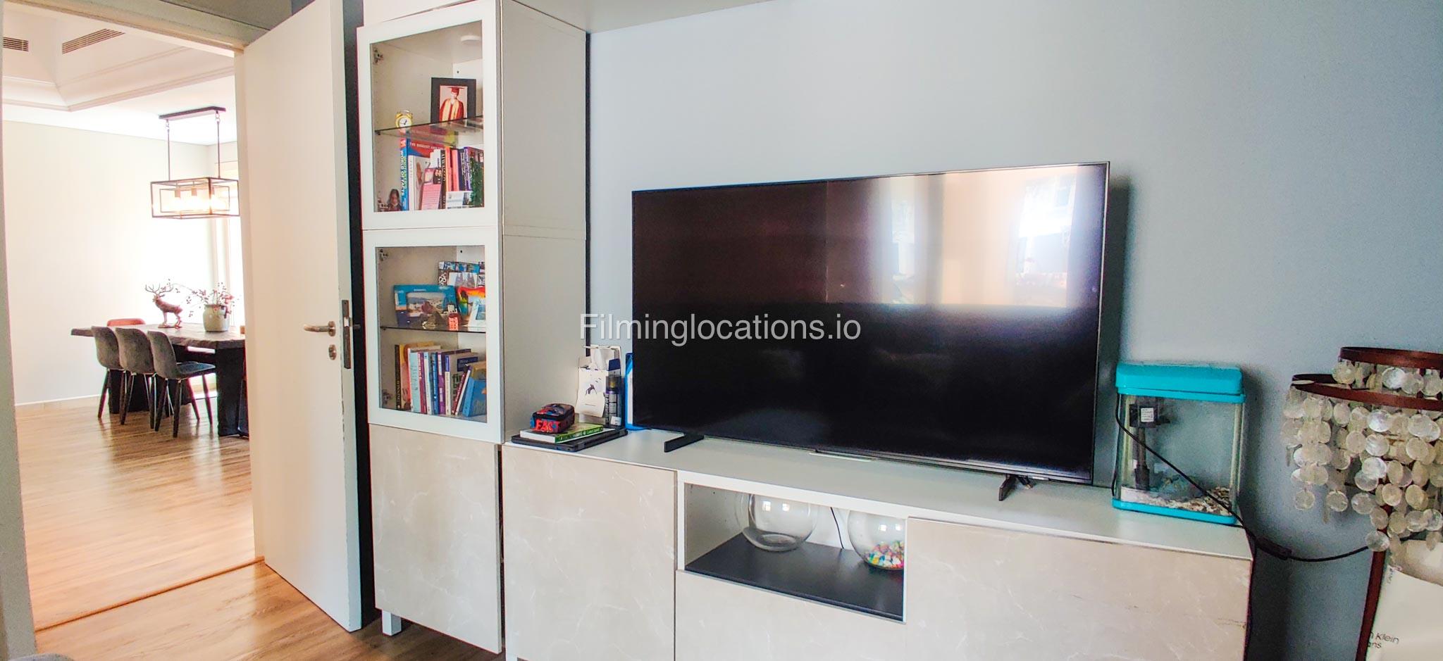 Our contemporary villa features 2 living rooms. The main one is a spacious living room with a cozy couch setup facing a wall-mounted TV, accented by window walls that bring in natural light. A modern dining area with minimalist décor sits within the same space. Adjacent to the living area, there is a compact coffee counter and a small kitchen opposite. The villa also includes a second, smaller room with a TV, sofa, and small windows. Outside, a vibrant garden with floral accents and seating provides a charming outdoor setting, with backside access for easy movement and varied shooting angles.