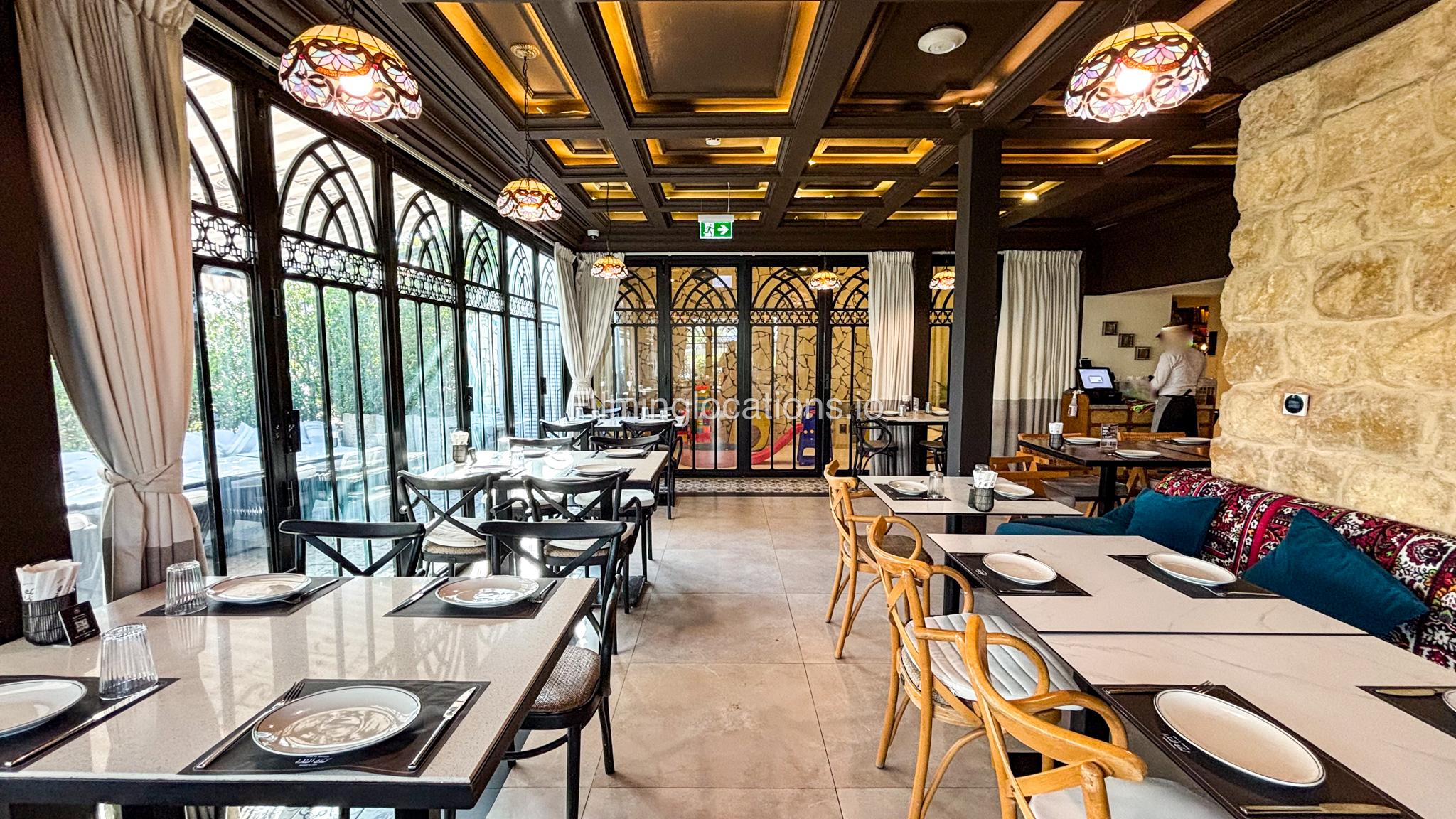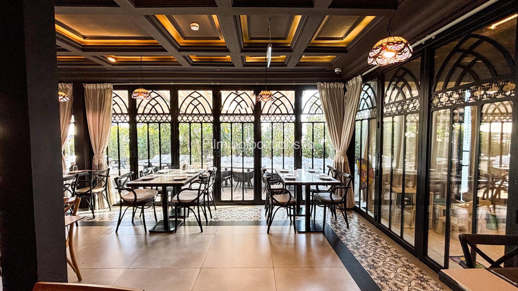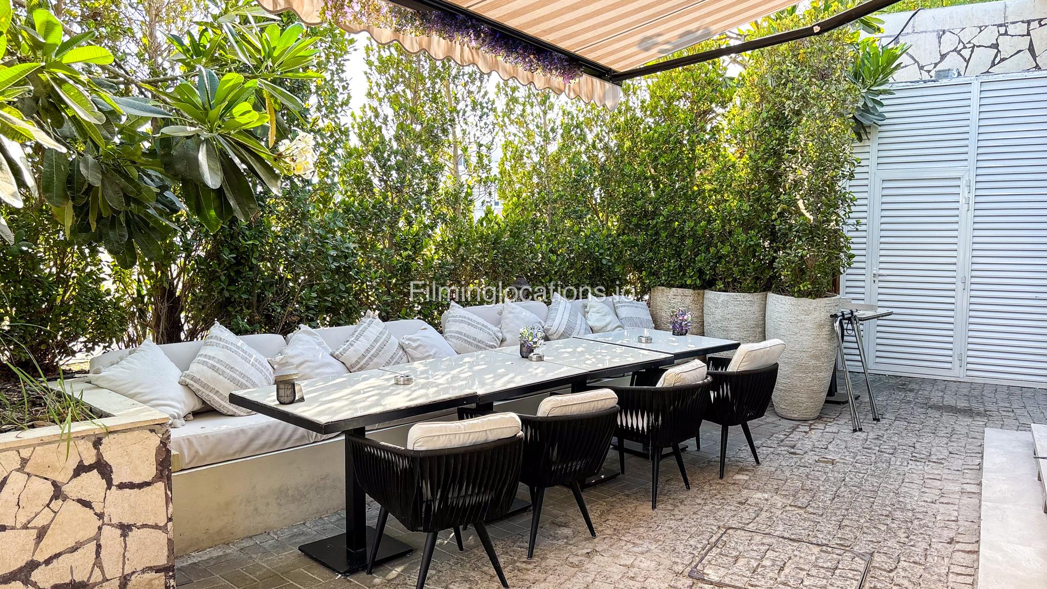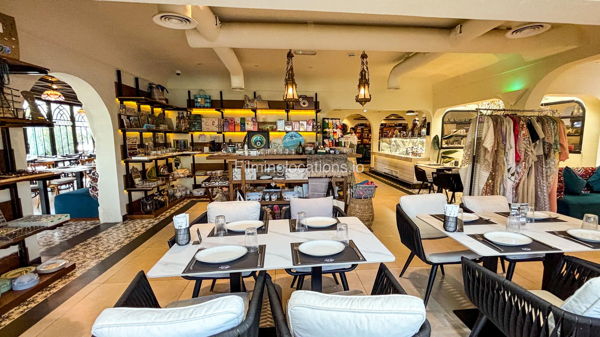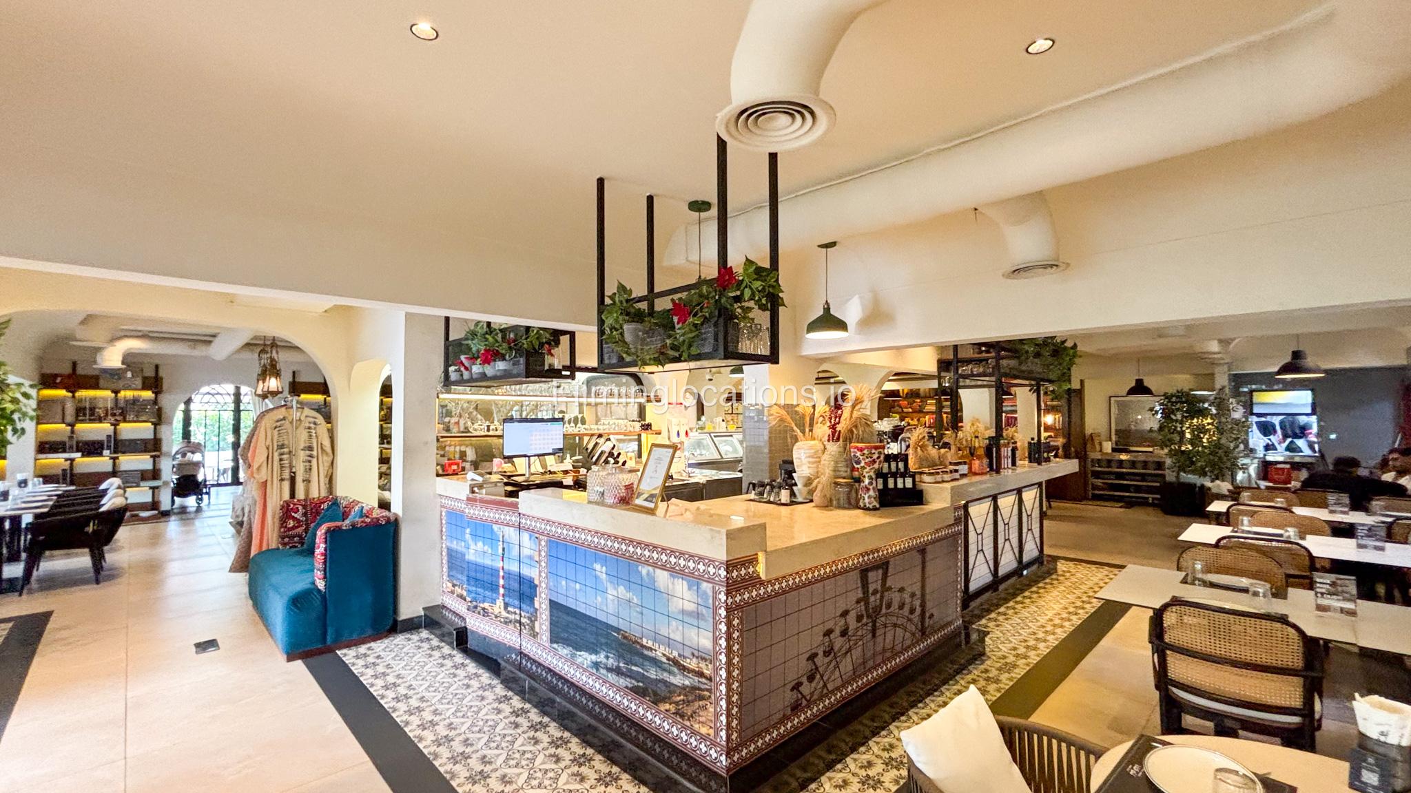 Our restaurant blends traditional charm with contemporary design featuring an expansive indoor seating area with window walls featuring intricate, artistic designs, allowing for an abundance of natural light. The interiors flow into a stylish glasshouse café section and a boutique-style retail space. It also has a small kid's play area. Outdoors, a lush garden terrace provides a serene setting ideal for exterior shots.