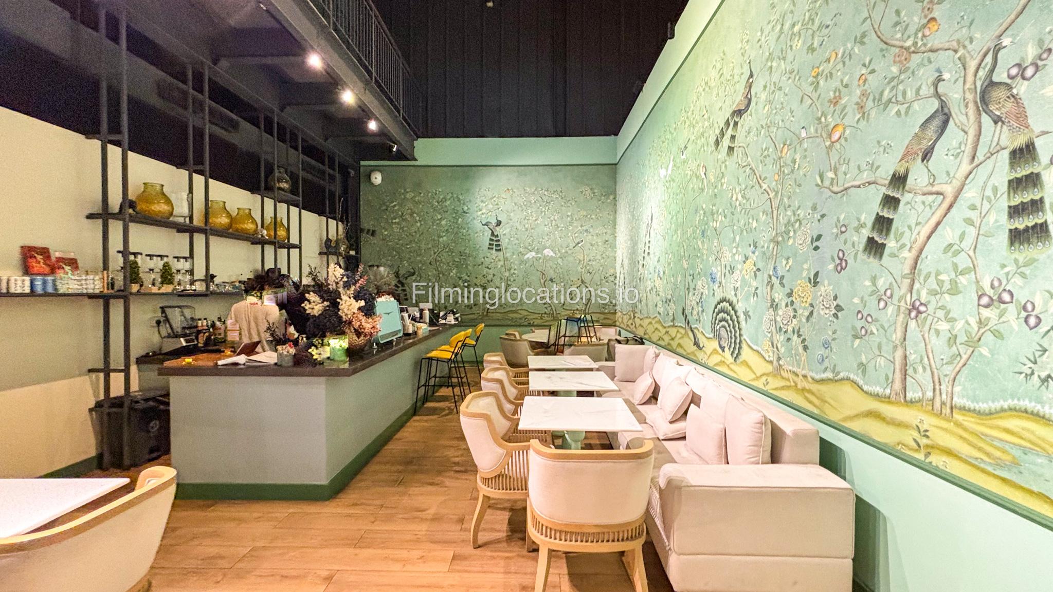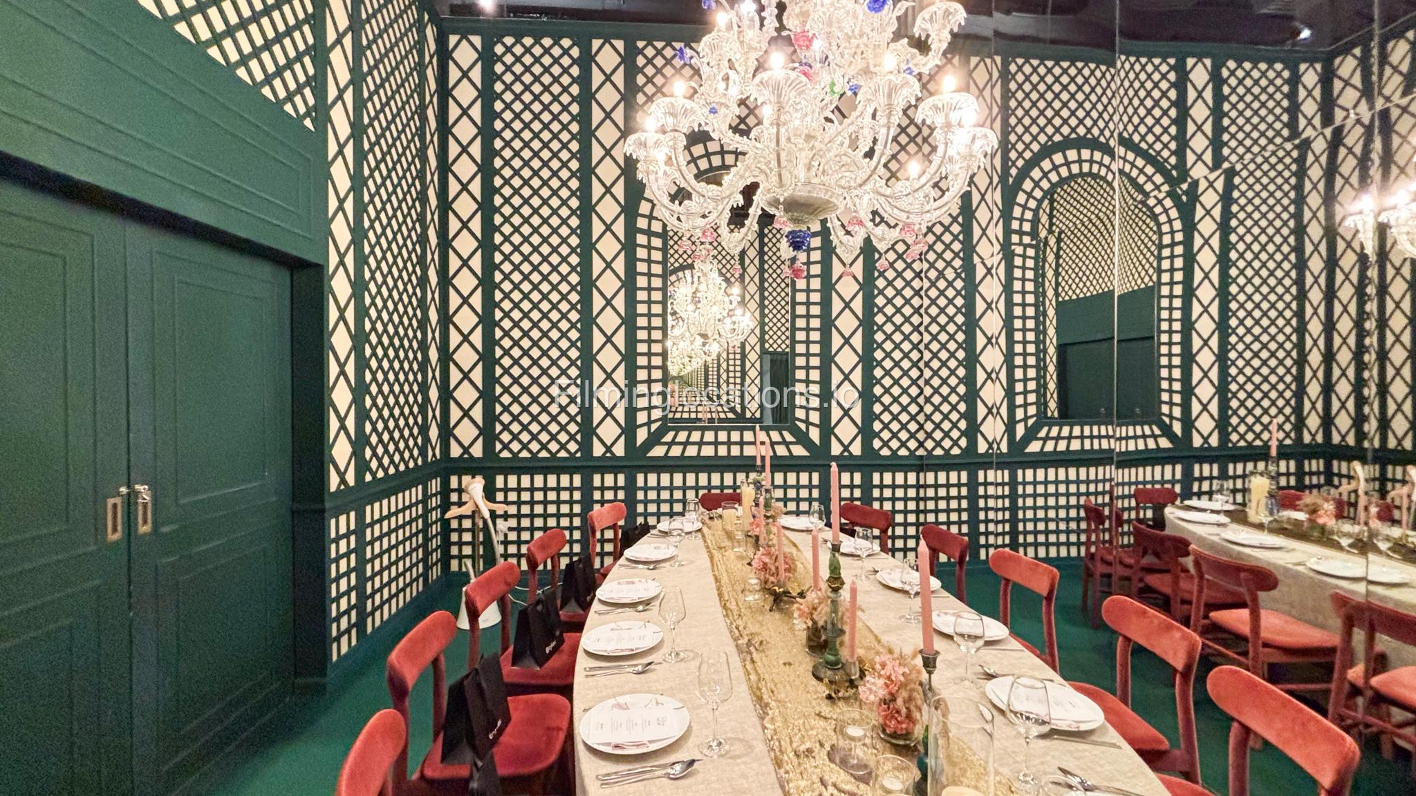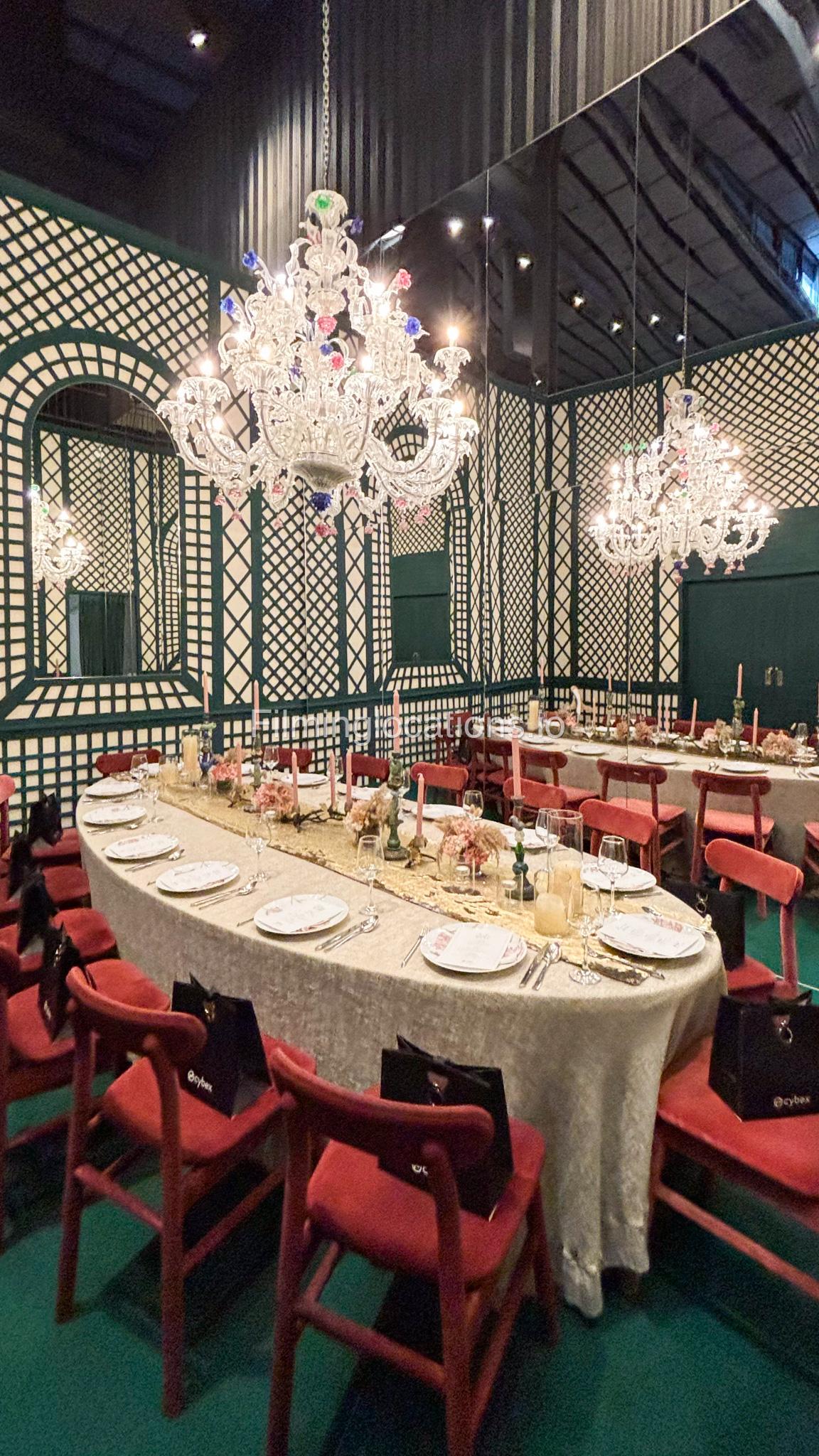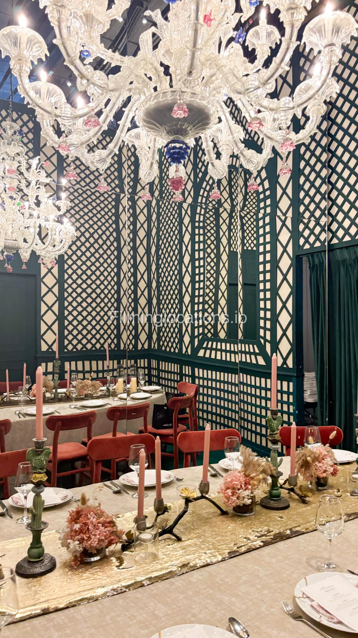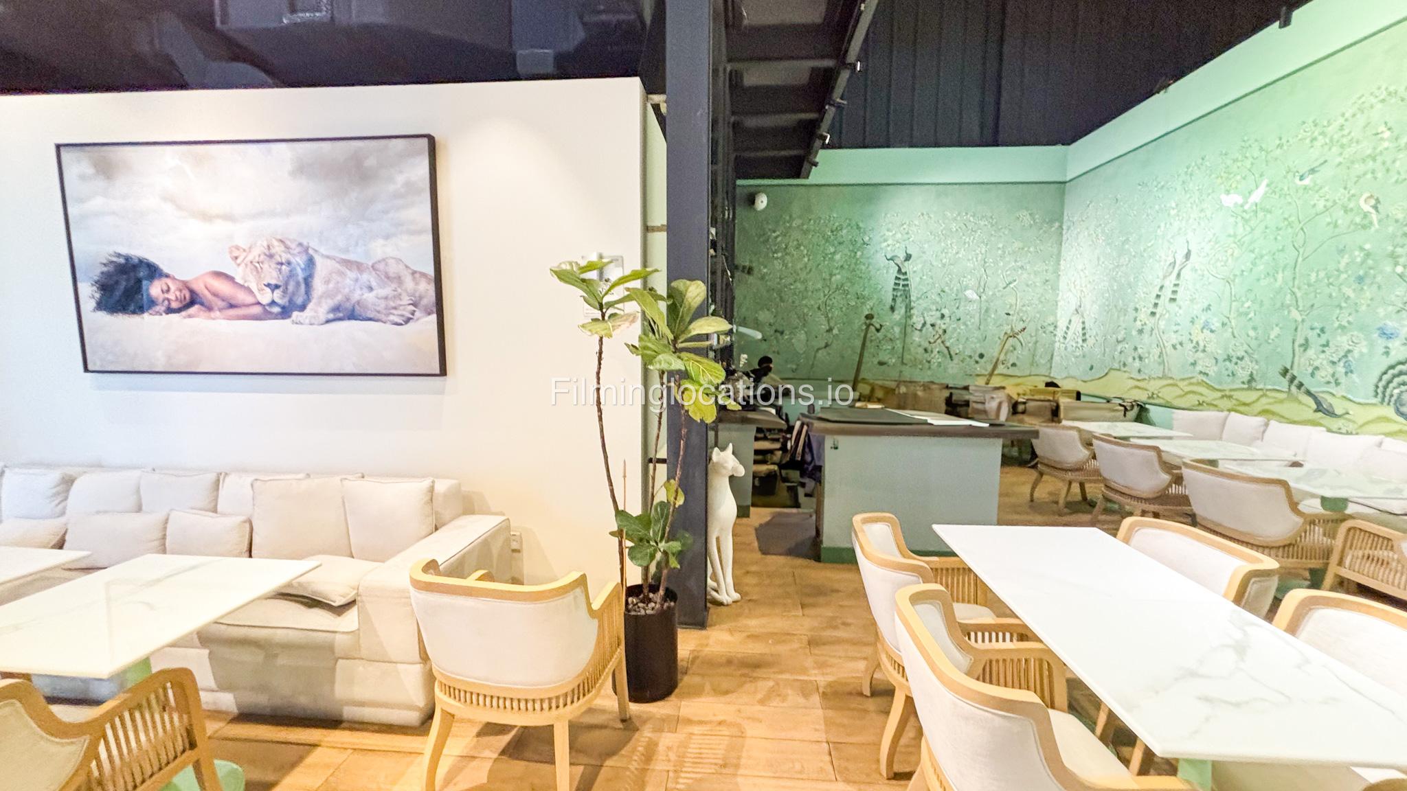 Our space offers a vibrant and artistic setting ideal for creative productions. As you enter, you're welcomed by a cozy seating area and an in-house café, setting a warm and inviting tone. The venue features 3 distinct event rooms, each with its own unique character. One space showcases soft pastel interiors. Another room is designed with classic green walls, a striking mirror, vibrant red chair seating, and ornate chandeliers—offering a bold and dramatic backdrop. The third is a spacious room with grand, elegant seating, perfect for larger setups or more formal scenes.