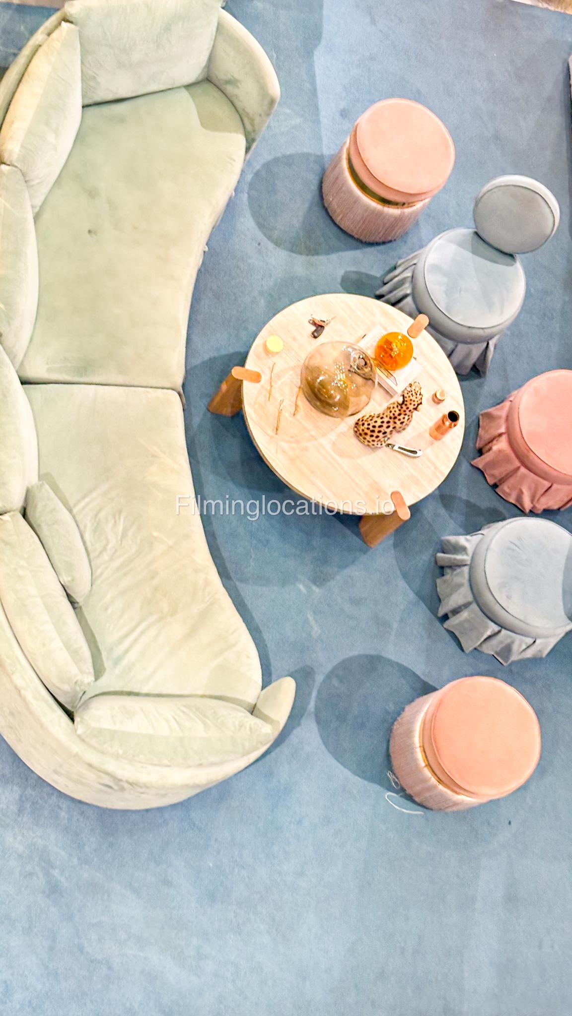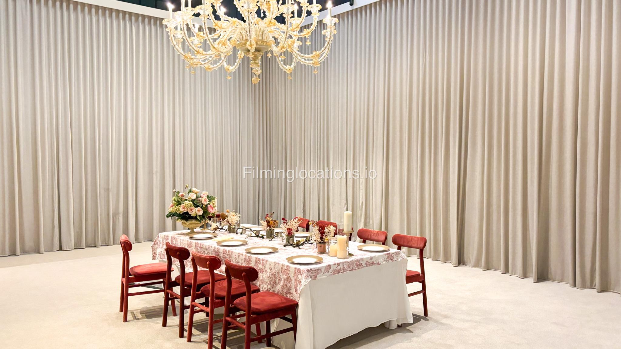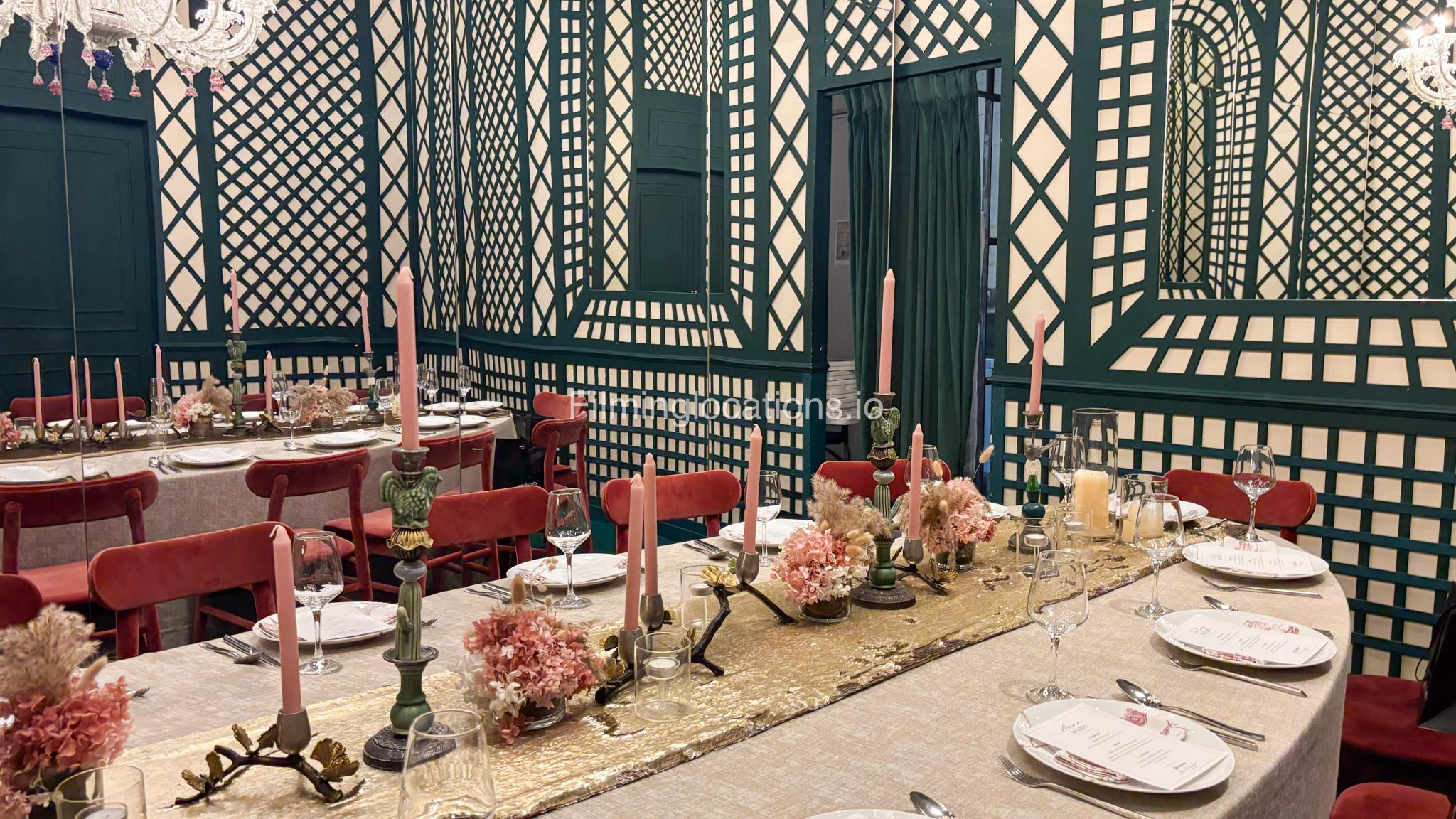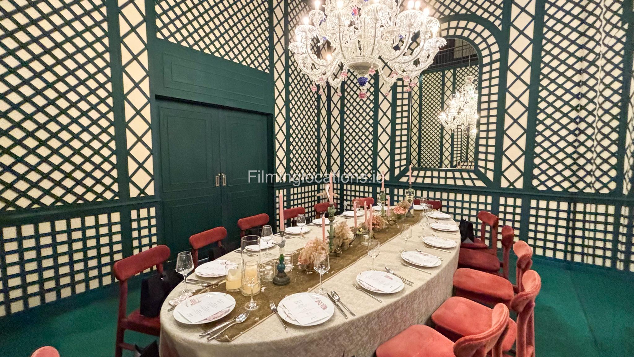Our space offers a vibrant and artistic setting ideal for creative productions. As you enter, you're welcomed by a cozy seating area and an in-house café, setting a warm and inviting tone. The venue features 3 distinct event rooms, each with its own unique character. One space showcases soft pastel interiors. Another room is designed with classic green walls, a striking mirror, vibrant red chair seating, and ornate chandeliers—offering a bold and dramatic backdrop. The third is a spacious room with grand, elegant seating, perfect for larger setups or more formal scenes.