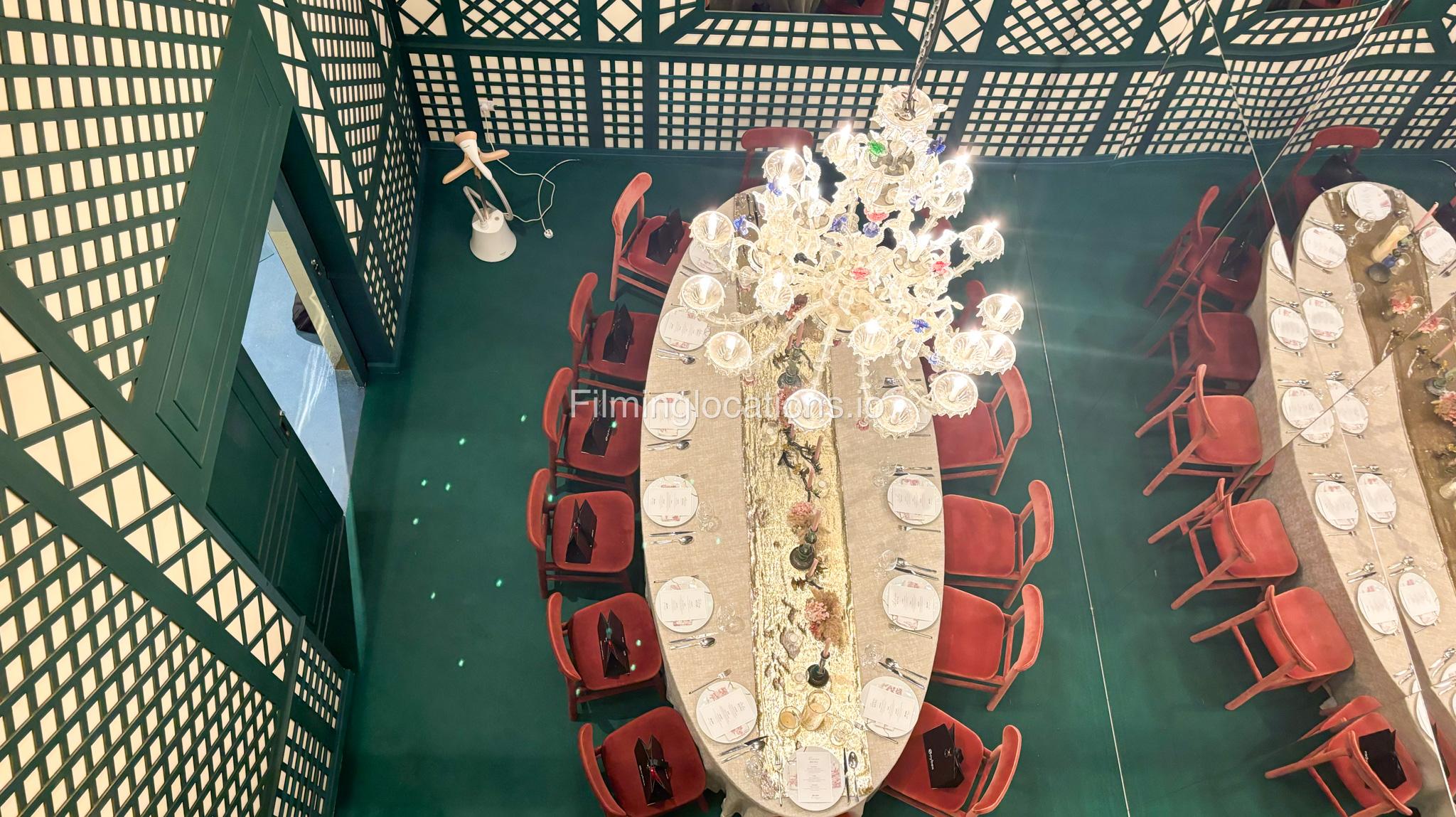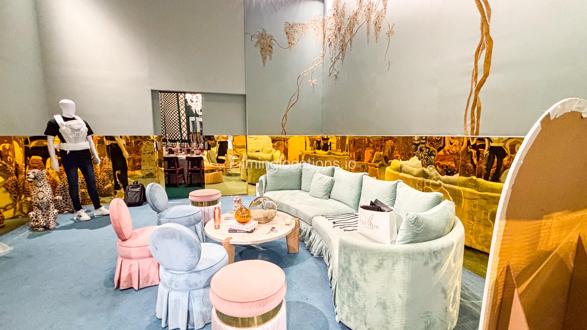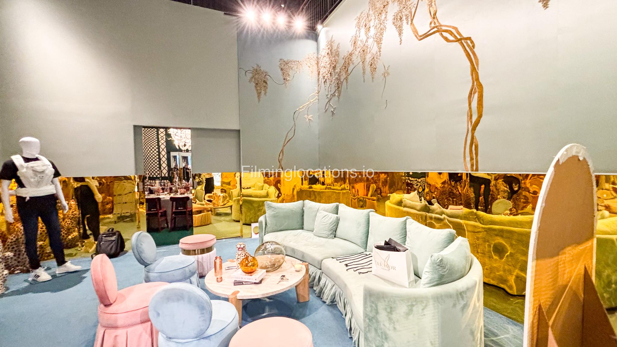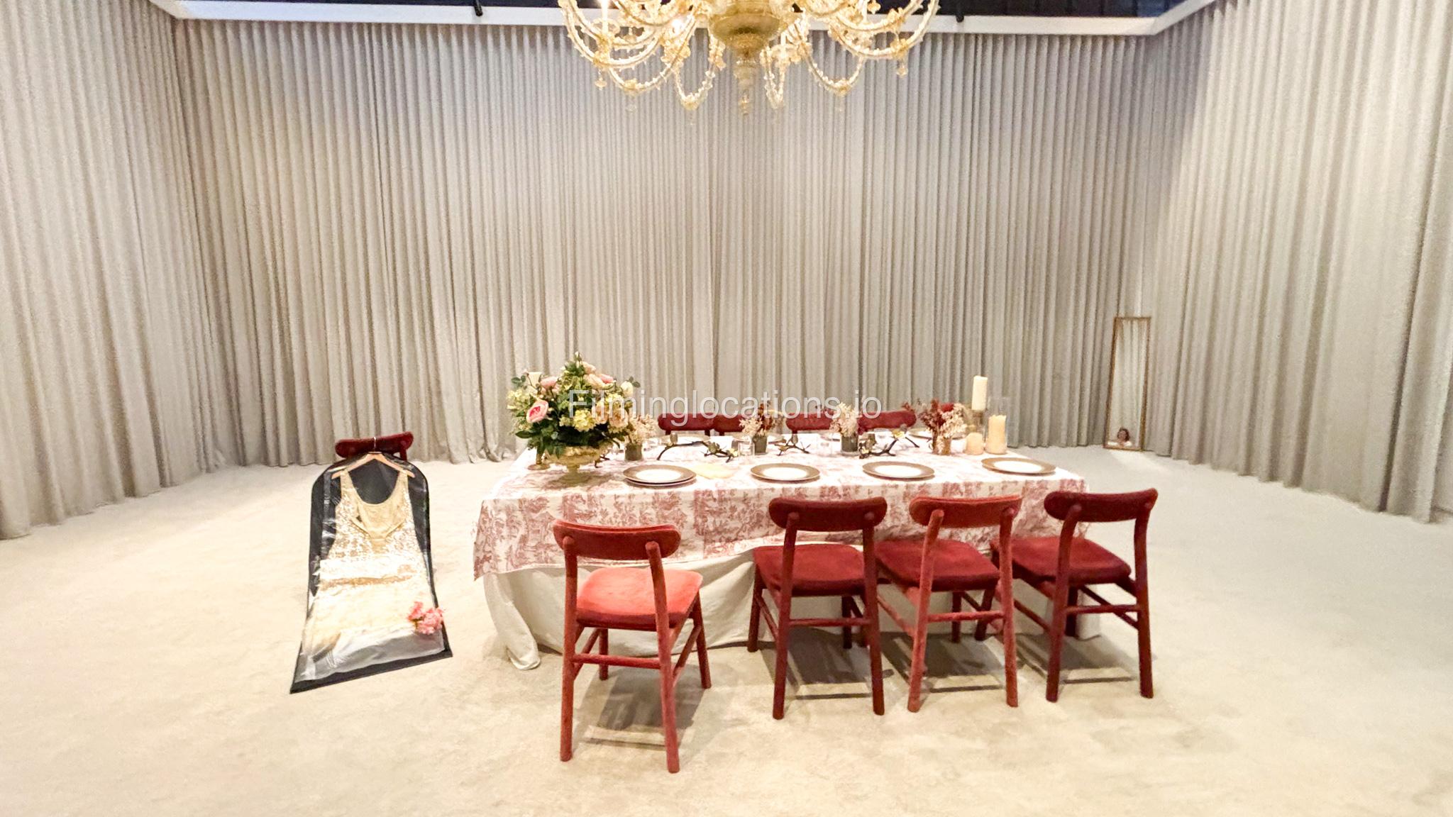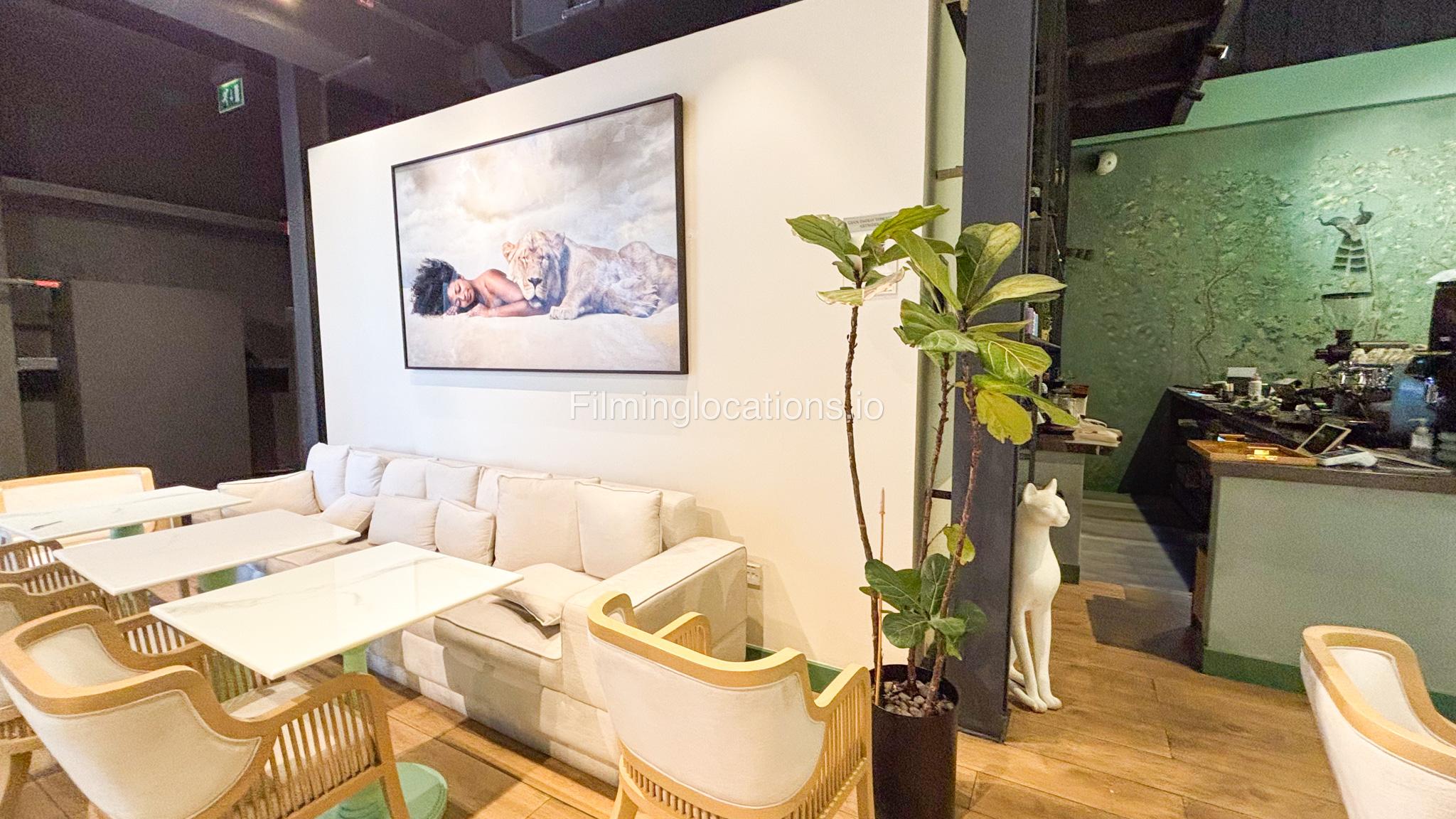 Our space offers a vibrant and artistic setting ideal for creative productions. As you enter, you're welcomed by a cozy seating area and an in-house café, setting a warm and inviting tone. The venue features 3 distinct event rooms, each with its own unique character. One space showcases soft pastel interiors. Another room is designed with classic green walls, a striking mirror, vibrant red chair seating, and ornate chandeliers—offering a bold and dramatic backdrop. The third is a spacious room with grand, elegant seating, perfect for larger setups or more formal scenes.