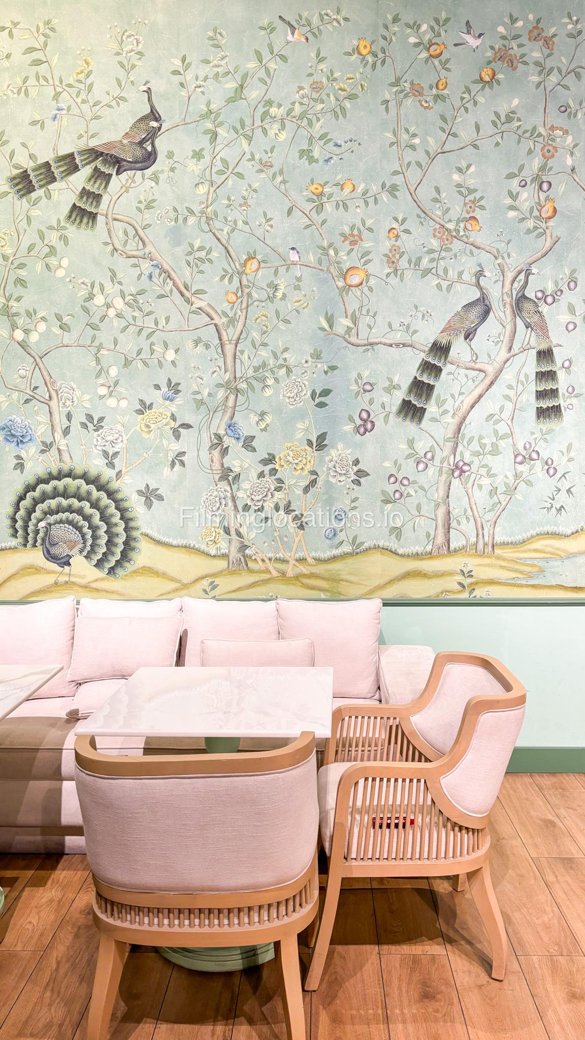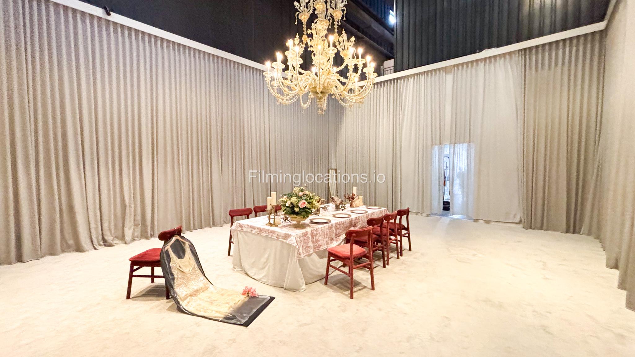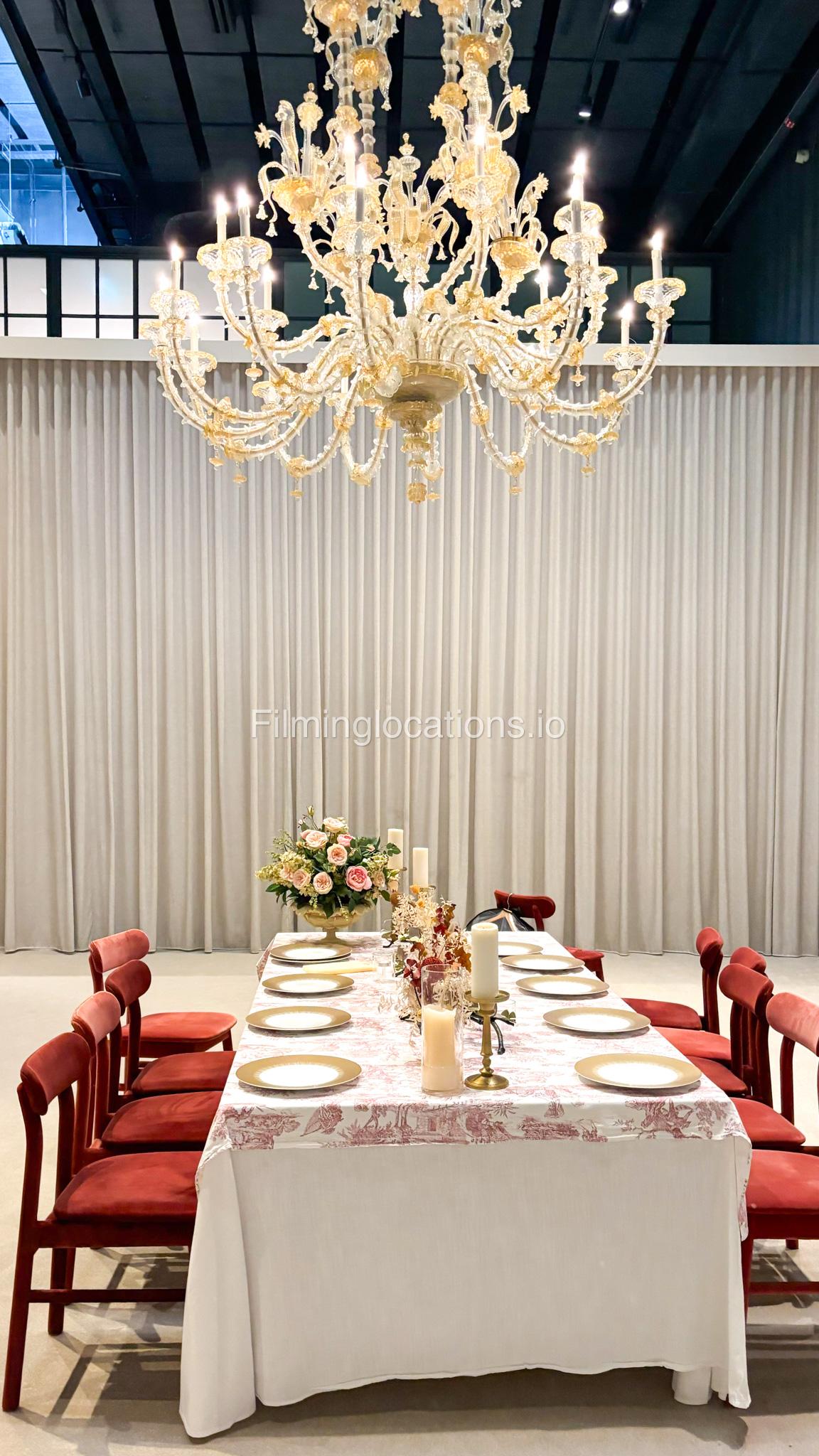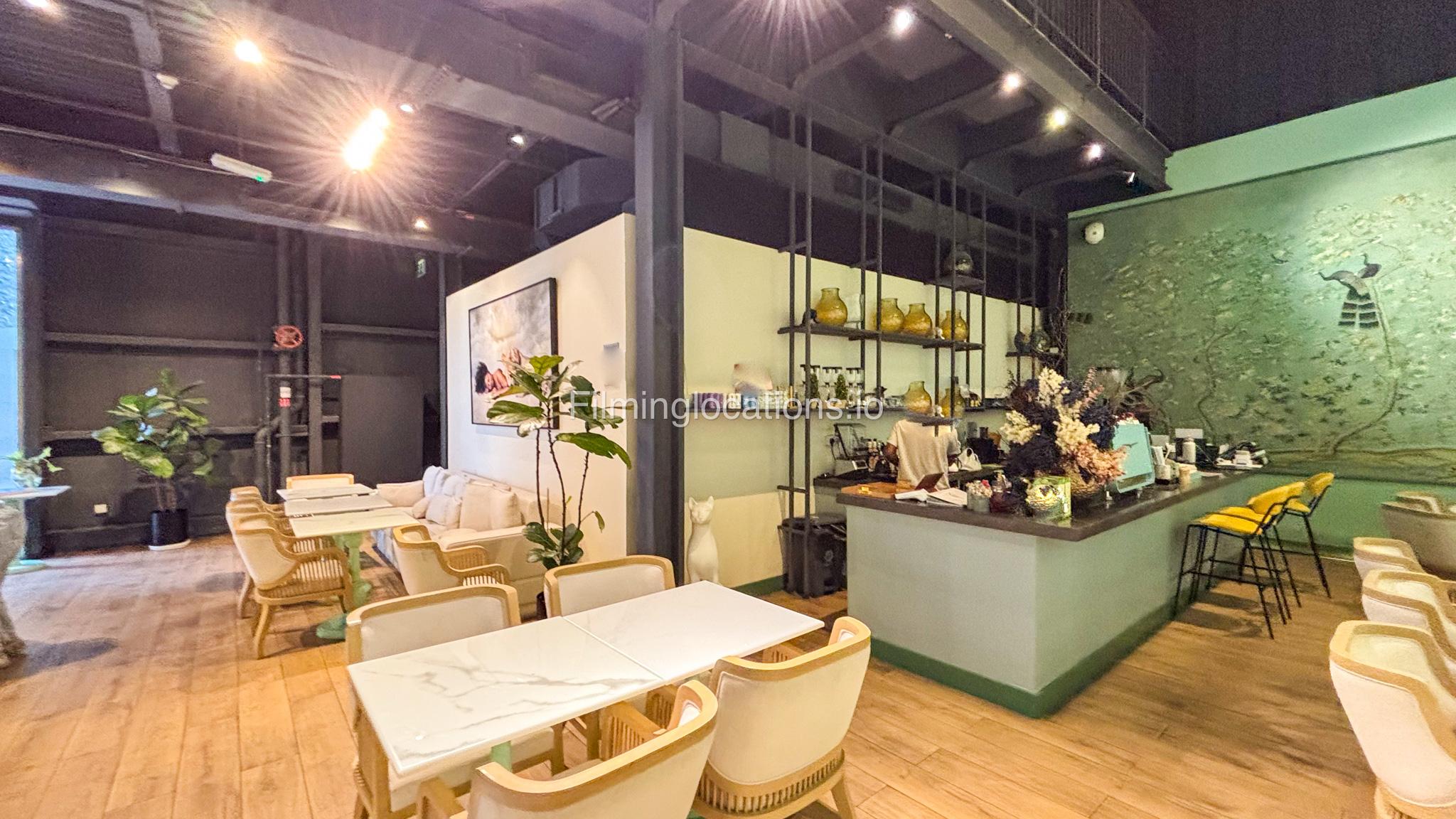 Our space offers a vibrant and artistic setting ideal for creative productions. As you enter, you're welcomed by a cozy seating area and an in-house café, setting a warm and inviting tone. The venue features 3 distinct event rooms, each with its own unique character. One space showcases soft pastel interiors. Another room is designed with classic green walls, a striking mirror, vibrant red chair seating, and ornate chandeliers—offering a bold and dramatic backdrop. The third is a spacious room with grand, elegant seating, perfect for larger setups or more formal scenes.